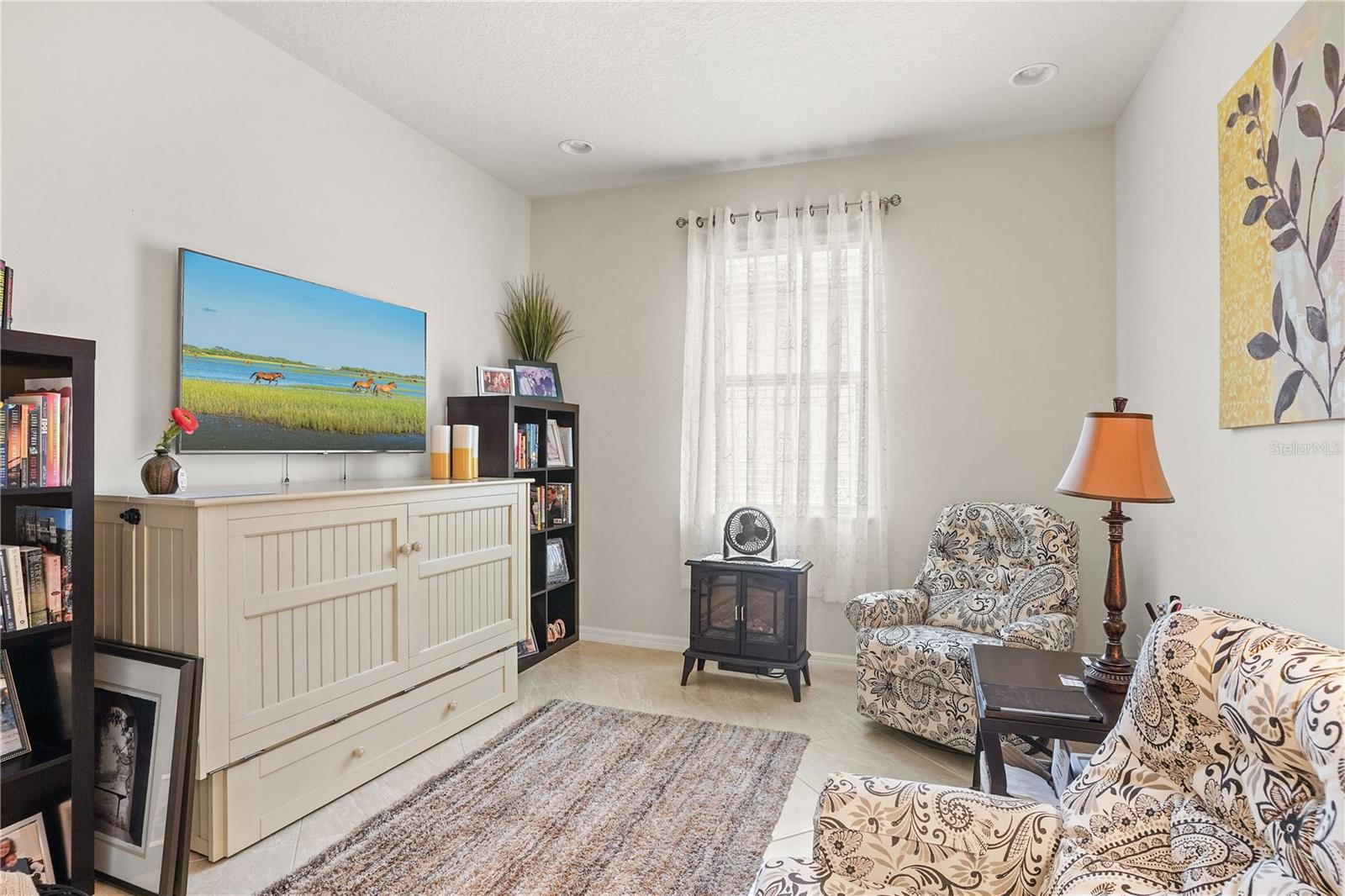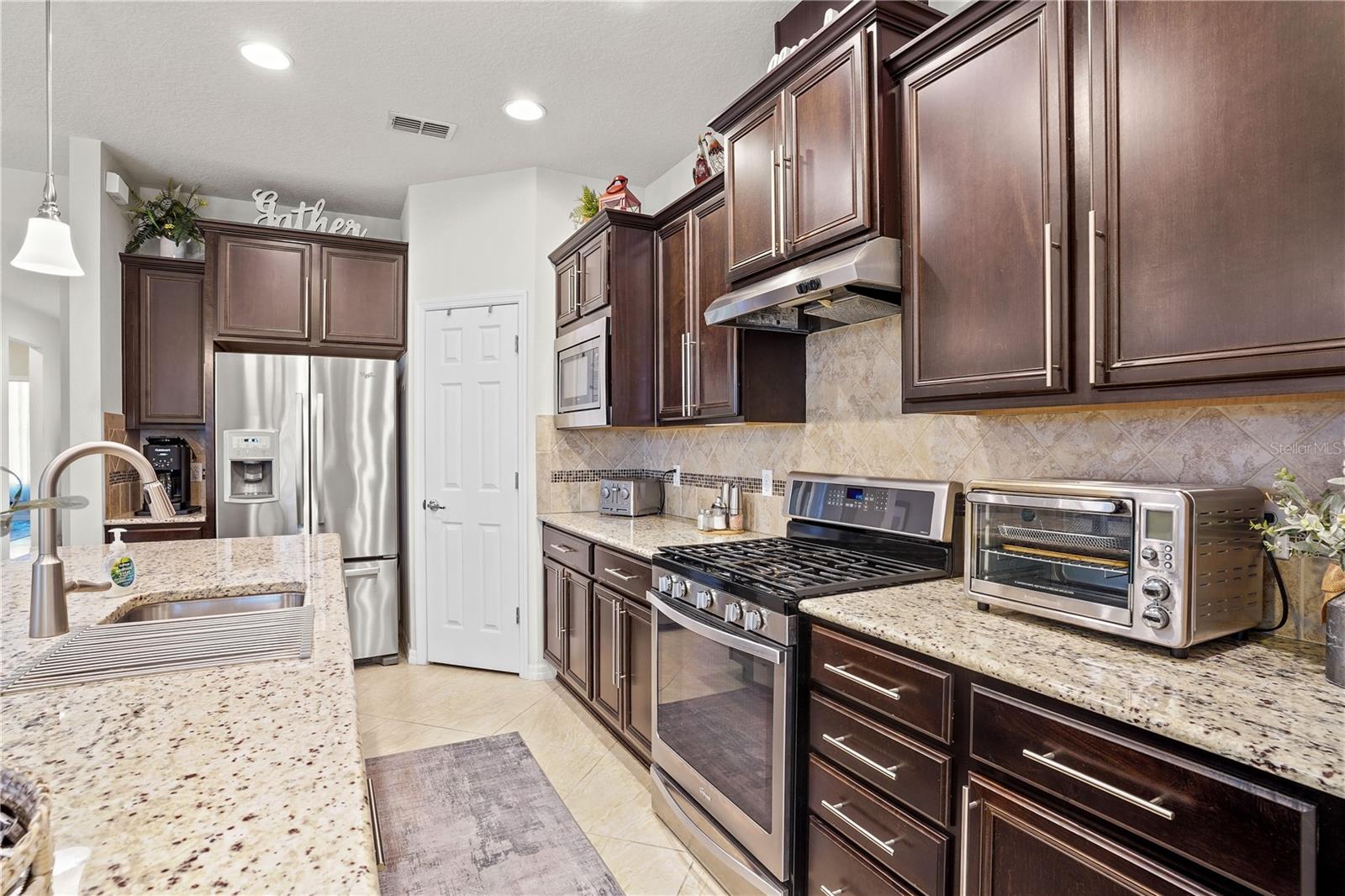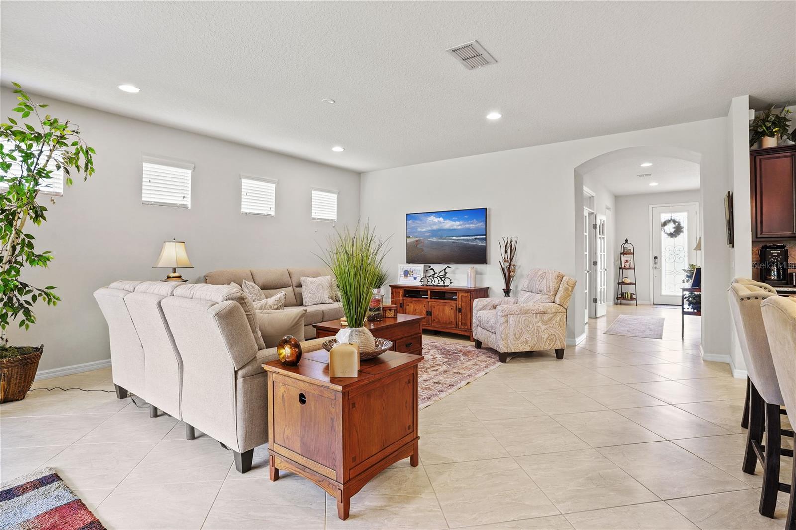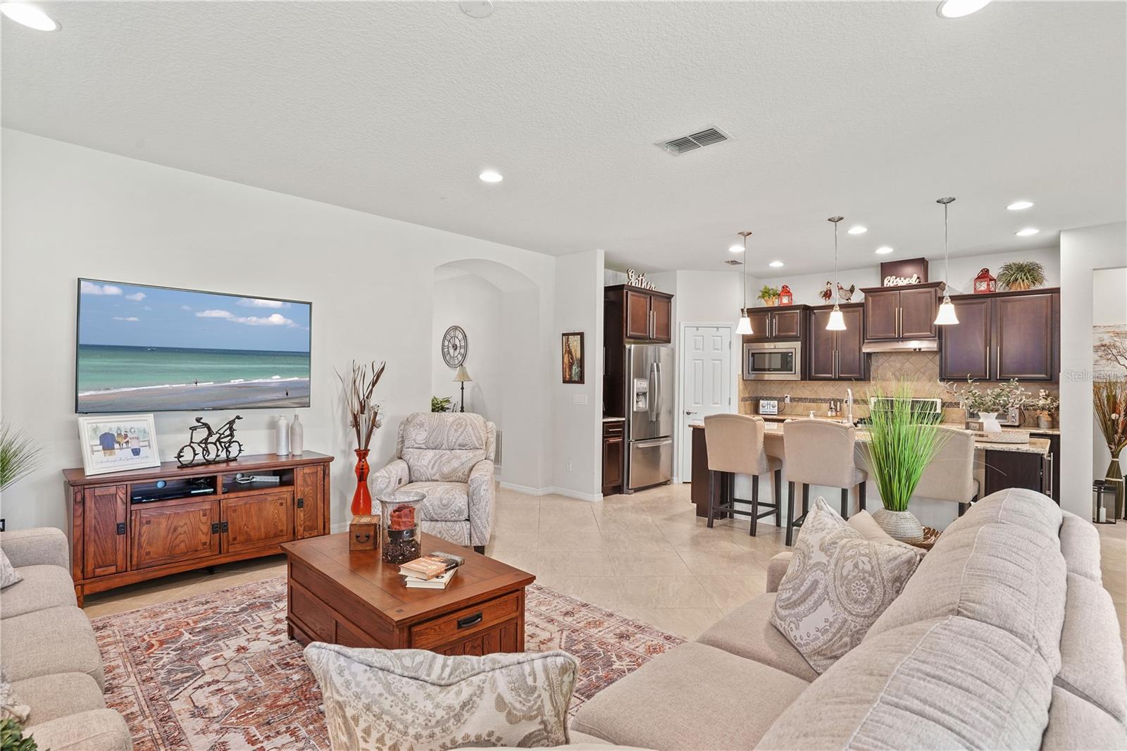 Come tour the 55+ community of Del Webb Orlando and explore this exceptional 3BR plus Den & 2 BA FULLY FURNISHED home w/ SCREENED LANAI! This traditional home features seamless TILE flooring on the diagonal with modern lighting throughout. Oversized family room opens to a spacious kitchen boasting rich WOOD cabinetry, stainless steel appliances, tiled backsplash, oversized island , granite countertops, and a spacious walk-in pantry! Large dining area offers views of a private wooded back yard. The PRIMARY bedroom includes a walk-in closet and an en suite bathroom that features a luxurious oversized walk-in shower, tiled flooring, dual sinks w/ granite countertops. This 3 way bedroom plan has 2 additional bedrooms off the front entryway with walk-in closets and tile floors. OFFICE/DEN w/french glass doors offers a cozy place to read a good book. The sizable laundry room is equipped with a washer and dryer and additional cabinets for added convenience. Home includes a two-car garage and a tropical lush landscape! Relax and ENJOY the paver screened lanai that overlooks your private wooded backyard. This home is in the perfect location and just a short walk or golf cart ride all amenities. The grounds and residences in the Del Webb Orlando area are meticulously maintained. Del Webb Orlando offers a wealth of exceptional amenities, including an outdoor pool with a jacuzzi, an indoor pool, a fitness center, an indoor track, a charming tavern, tennis courts, bocce ball, shuffleboard, and pickleball. The community is conveniently located near major highways, restaurants, hospitals, and popular theme parks, Del Webb/Orlando offers a desirable lifestyle. All you need is your toothbrush and suitcase to move into this BEAUTIFUL, fully equipped HOME!!