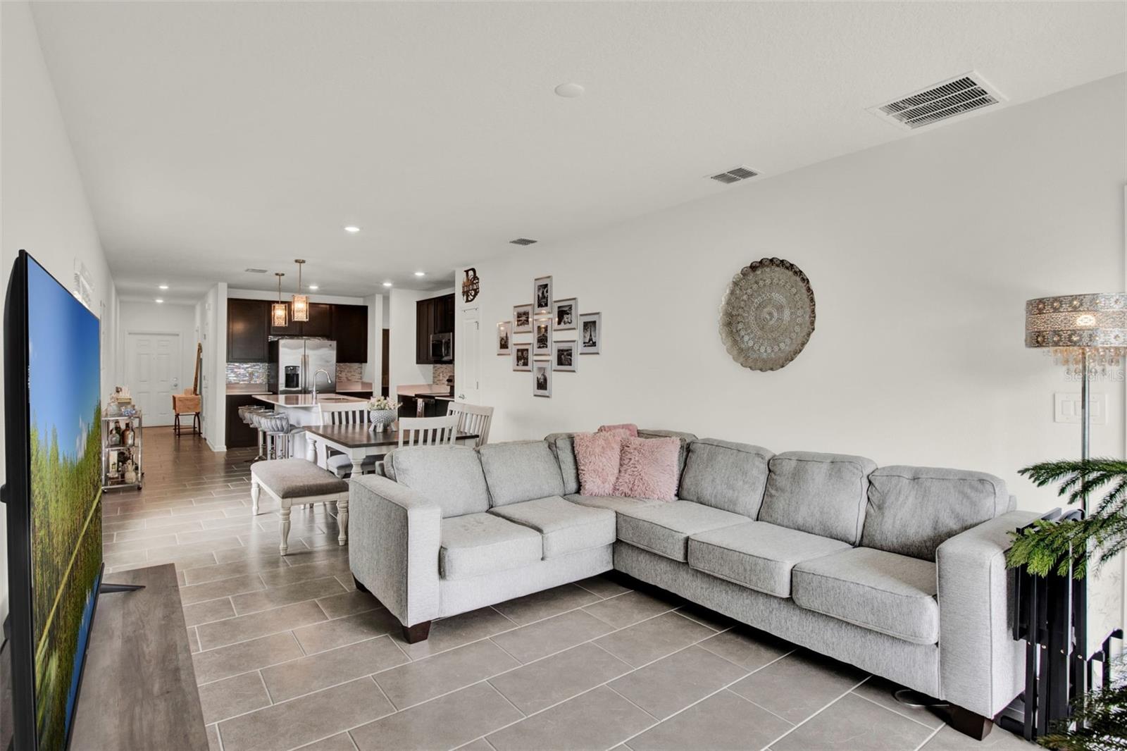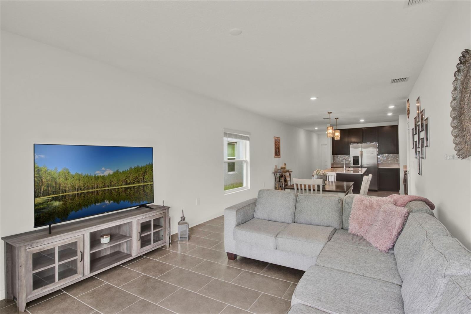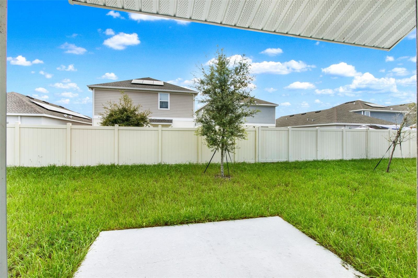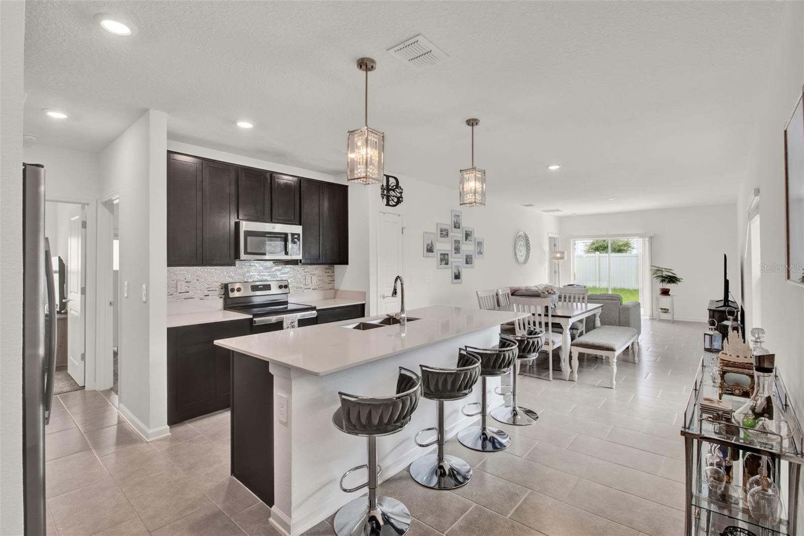 Welcome to 439 Cool Summer Lane in Davenport—a beautifully upgraded, nearly new home that blends comfort, convenience, and smart living. Only 3 years old, this open-concept design features a spacious kitchen with an oversized island, quartz countertops, updated backsplash, espresso-colored cabinets, GE stainless steel appliances, and ceramic tile floors throughout the main living areas. The family room and dining area flow seamlessly from the kitchen, creating an ideal space for entertaining. All bedrooms are carpeted and include ceiling fans and blinds, while the primary suite boasts a large walk-in closet with new built-in shelves, dual vanities, and a brand-new shower. Modern touches include a Ring doorbell and motion sensors, a SMART garage door opener with app connectivity, NEW LED exterior lighting, and solar panels for energy efficiency. The garage provides ample storage, extra ceramic tiles, and attic space. Outside, a fenced backyard offers privacy, while newly laid sod and an irrigation system enhance curb appeal. Washer and dryer are included, and internal pest control is simplified with a pest defense feed system. Adding to its appeal is the low HOA fee, along with easy access to community amenities and proximity to major shopping destinations like Posner Park, ensuring that entertainment, dining, and retail options are just minutes away. This move-in-ready home is packed with features to support a connected, comfortable lifestyle.