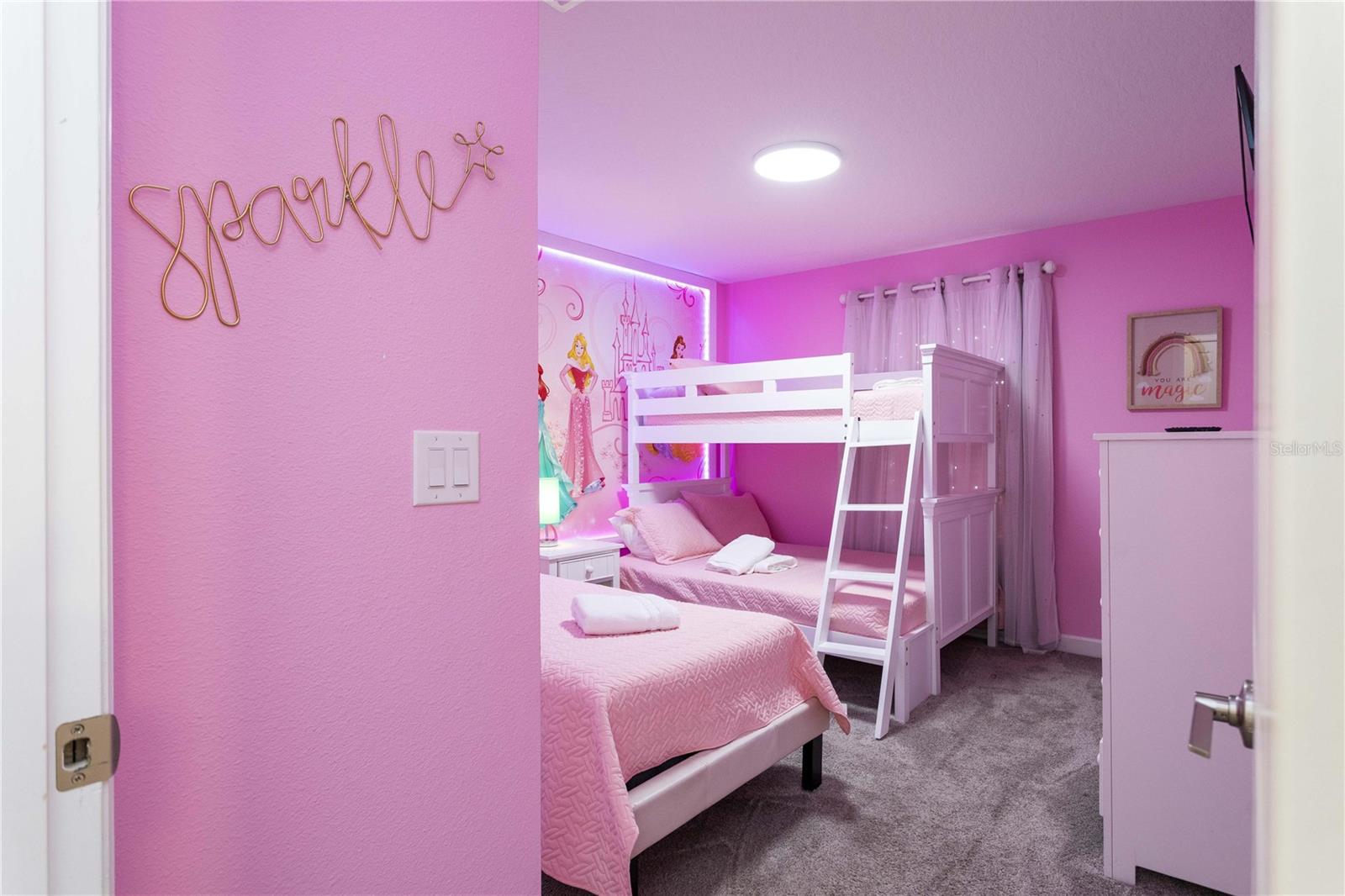 Beautifully furnished 4-bedroom townhome in the sought-after ChampionsGate resort community! No rear neighbours, This two-story layout features a convenient downstairs bedroom and full bath, along with a spacious upstairs master suite and two additional bedrooms. The open-concept design includes a modern kitchen that flows into the bright and airy living room, leading out to a private screened-in patio with a pool — ideal for relaxing or entertaining guests. Upstairs, two themed bedrooms create a fun and immersive experience for guests — one inspired by Mickey Mouse and another with a The Princess motif. The generously sized master suite includes a well-appointed bathroom with double sinks and plenty of natural light. As part of ChampionsGate, residents enjoy access to a world-class clubhouse with a restaurant, bar, fitness center, movie theater, and more. Outdoor amenities include a resort-style pool, splash pad, water slides, and a lazy river. Just under 7 miles from Disney, this home is perfect for short-term rentals, family vacations, or a second home in the heart of Orlando’s entertainment corridor.