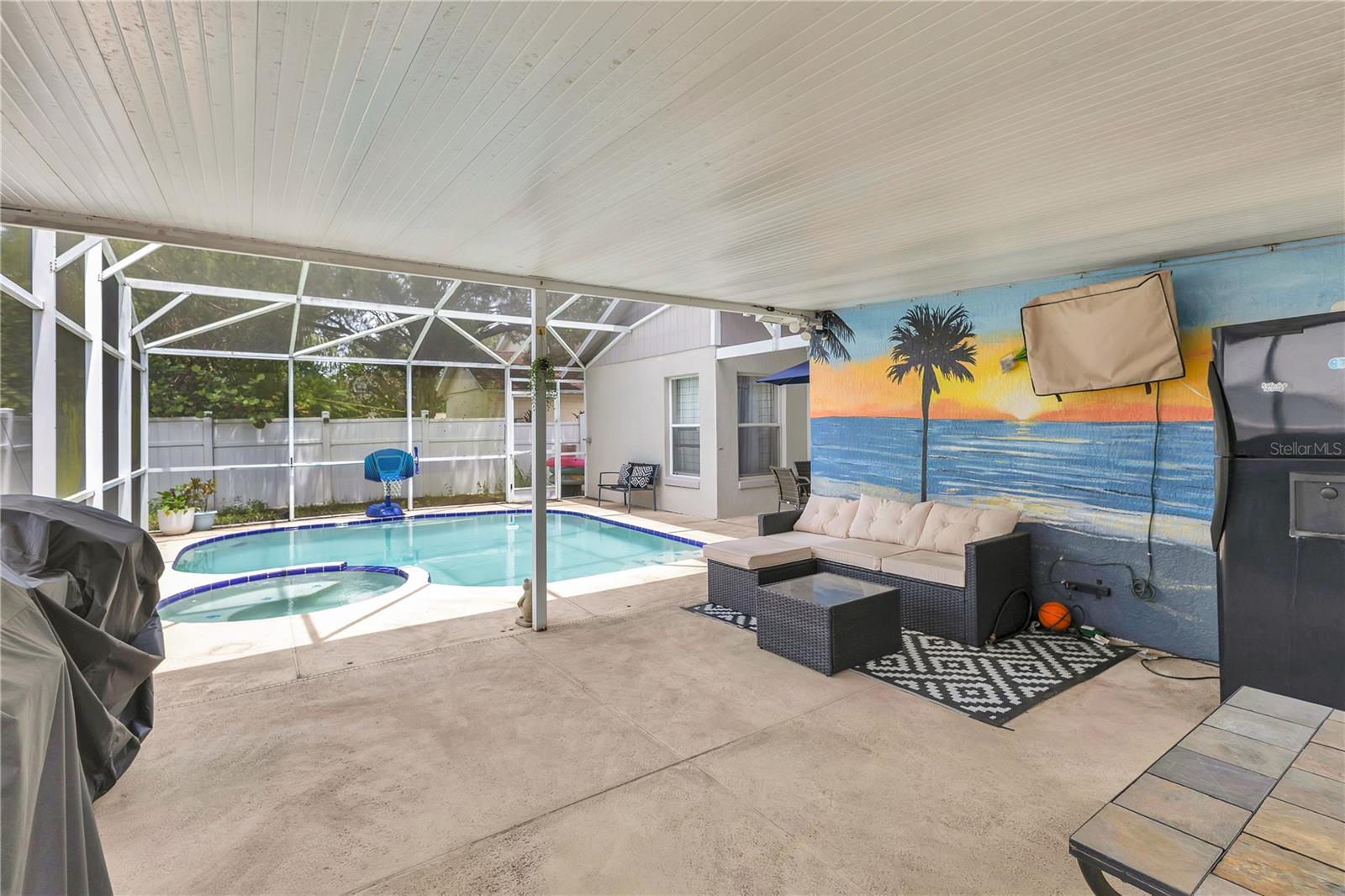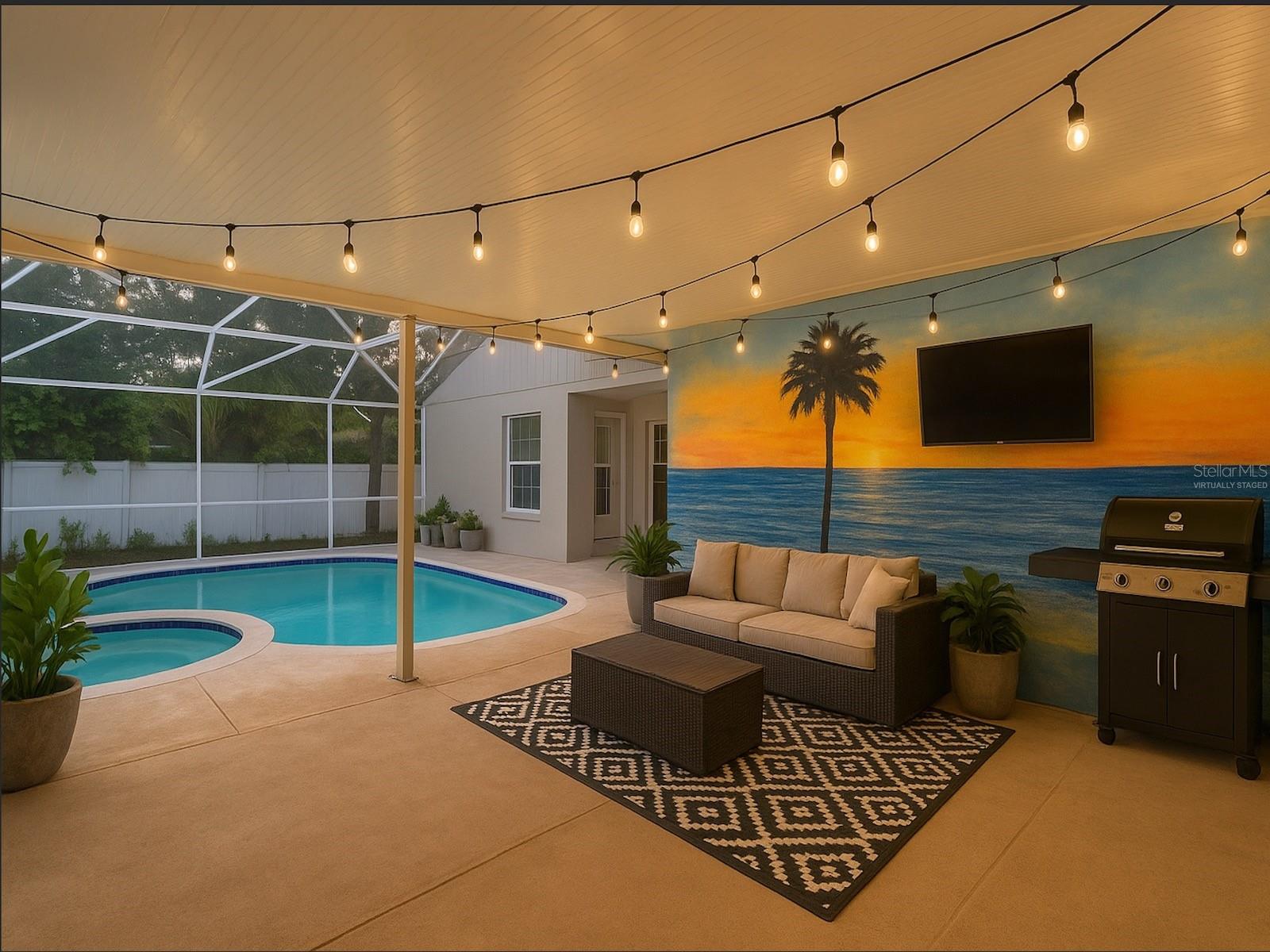 One or more photo(s) has been virtually staged. Attention AIRBNB investors—this turnkey 3-bedroom, 2-bathroom pool home with a massive bonus room in Davenport, FL is cash-flow ready with close proximity to Disney, Universal, and Orlando’s top attractions. Operating expenses stay ultra-low thanks to solar panels averaging just $33.88/month in electric costs and a $38.33 HOA fee, while the no-carpet design makes turnovers quick and cost-efficient.Designed for strong guest appeal, it features a private, screened-in pool and jacuzzi—the #1 booking driver in the market—along with an extended patio, outdoor fridge, TV, and a unique sunset mural that creates an unforgettable, instagrammable experience. $660 generator plug was installed for peace of mind. The spacious open floor plan, fully fenced corner lot, and versatile bonus room (game room, lounge, or extra sleeping area) maximize rental potential, while upgrades like a resurfaced pool (2020), water heater (2024), Solar 2021 (Leased), HVAC (2019), roof (2016), smart thermostat, and storm door ensure low-maintenance ownership. Guests also enjoy access to the Davenport Lakes community amenities, including a 300-acre fishing lake, pool, tennis courts, and playground. With proven demand, proximity to world-class attractions, and furniture negotiable for a seamless launch, this isn’t just a home—it’s a high-performing, ready-to-run Airbnb investment with a clear path to profitability. take a 3D TOUR: https://my.matterport.com/show/?m=JNTnNUBcDYQ&mls=1