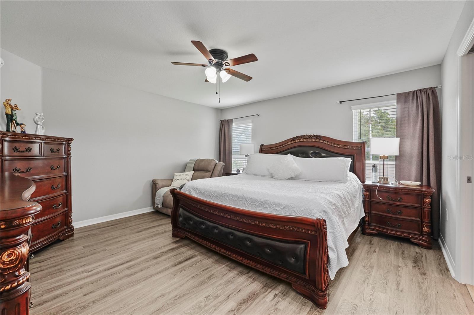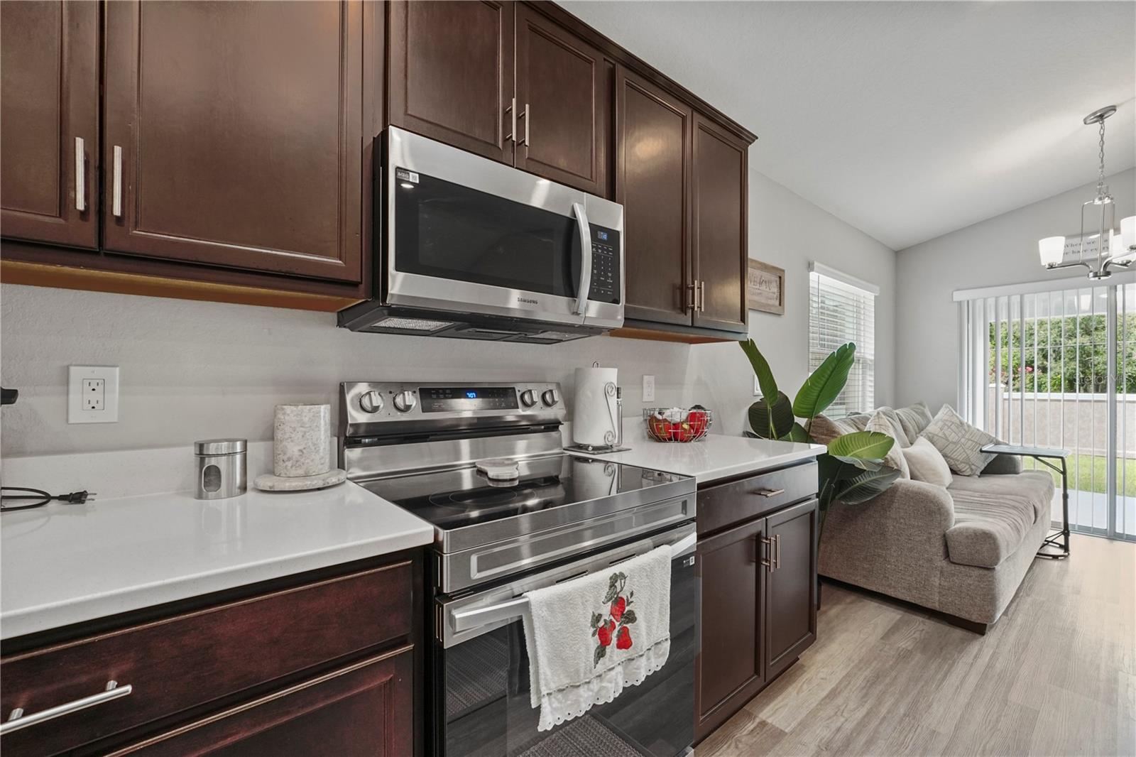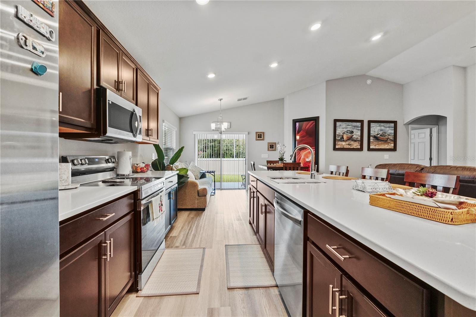 Welcome Home! This move-in ready, single-story home offers the perfect blend of style, comfort, and functionality with 3 spacious bedrooms, 2 full baths, and an open-concept living area designed for modern living. The chef-inspired kitchen is a showstopper with quartz countertops, stainless steel appliances, a walk-in pantry, and a large counter-height island—ideal for entertaining and everyday dining. Throughout the home, enjoy the beauty and durability of luxury wood vinyl plank flooring—even in the bedrooms! Your private owner’s suite features a walk-in closet, dual vanities, a tiled shower. Step outside to relax under the covered lanai, and take advantage of the 2-car garage. Additional upgrades include custom-fit window blinds, energy-efficient windows, architectural shingles, and epoxy-coated lanai and garage floors for easy maintenance and long-lasting style. With its modern upgrades, open layout, and thoughtful design, this home checks all the boxes for today’s buyer—don’t miss your chance to make it yours! Property is also available for RENT (O6345635)