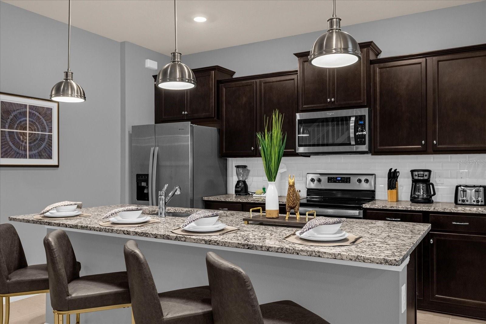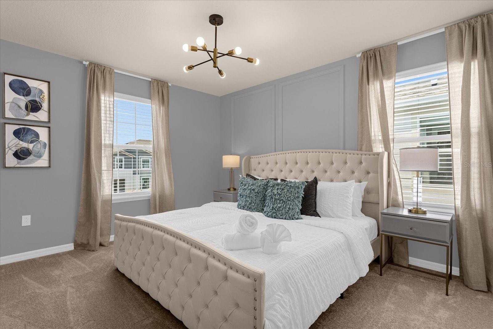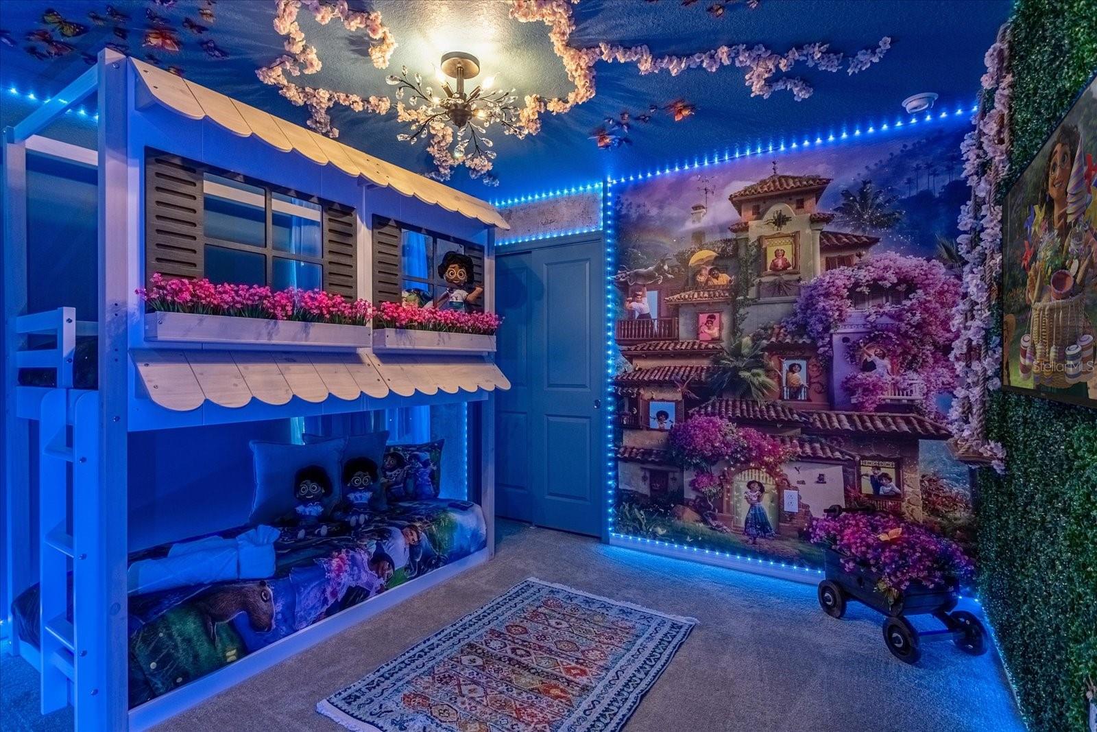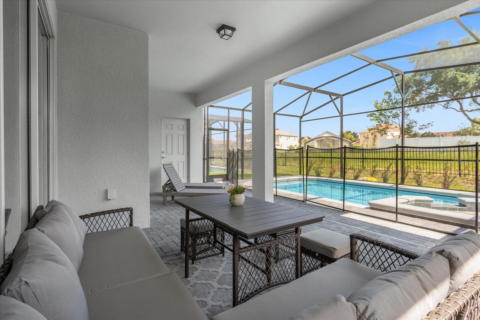 This professionally designed, fully furnished 7-bedroom, 5.5-bath vacation retreat offering over 3,200 square feet of upgraded living space in one of Central Florida’s most sought-after resort communities. This turnkey property blends upscale finishes with functional design, ideal for investors and vacationers alike. Step inside to discover a spacious open-concept layout perfect for large groups. The gourmet kitchen features rich espresso cabinetry, granite countertops, stainless steel appliances, and a generous center island with seating that's ideal for casual dining and entertaining. The main-level primary suite offers direct pool access and a spa-inspired en suite bath with dual sinks, a garden tub, and walk-in shower. Upstairs, a sprawling loft has been transformed into a private game and movie room, surrounded by six additional bedrooms and four full baths, providing ample space for guests and family. Outside, enjoy your own private oasis with a heated pool and spa, covered lanai, and plenty of seating for sun-soaked relaxation or evening gatherings. Located in Windsor Island Resort, just minutes from Disney, this community is packed with world-class amenities: a zero-entry resort pool, lazy river, water slide, splash pad, clubhouse with concierge and arcade, fitness center, mini golf, playground, firepit with Disney fireworks views, and the Blue Marlin Grille restaurant. With short-term rentals allowed and high demand year-round, this property offers both lifestyle and income potential.