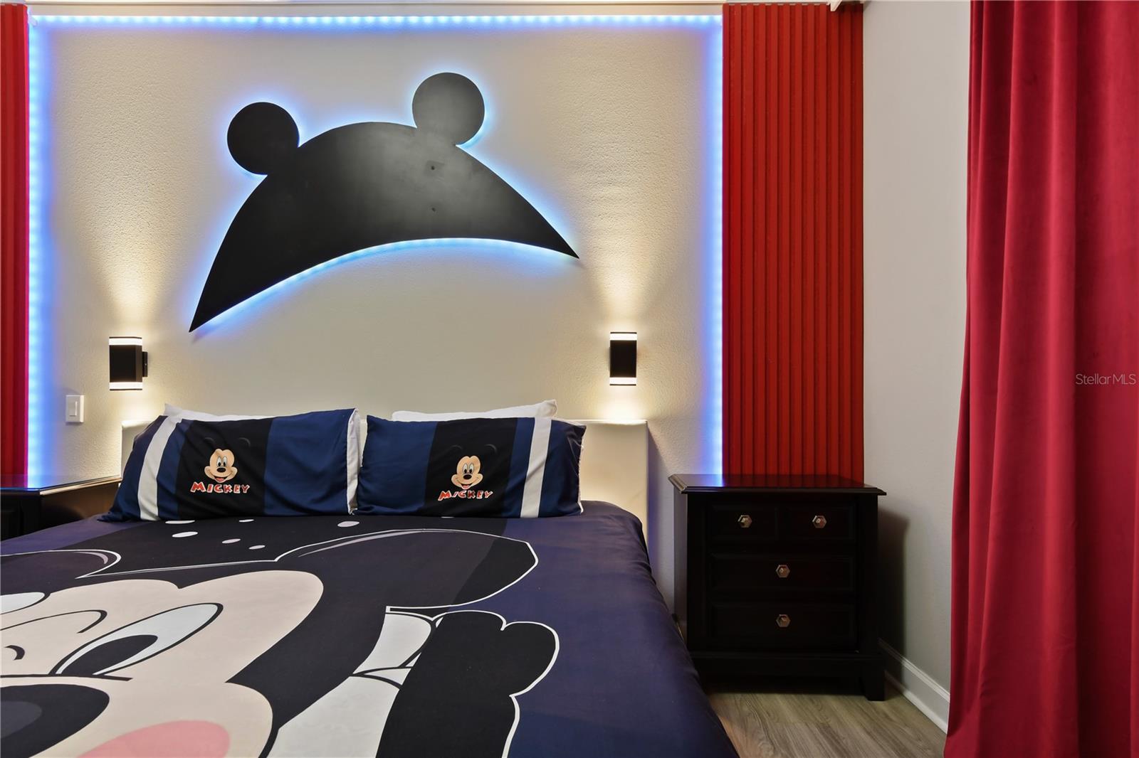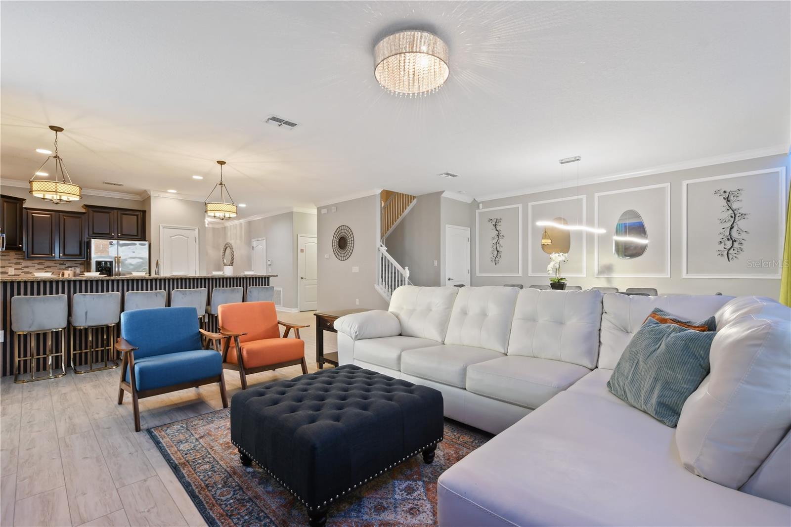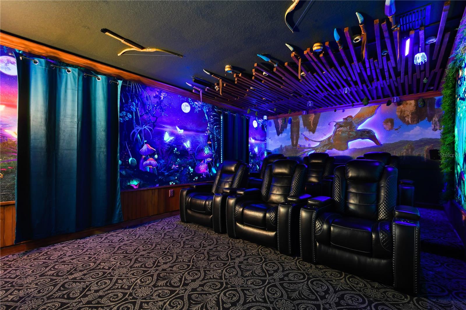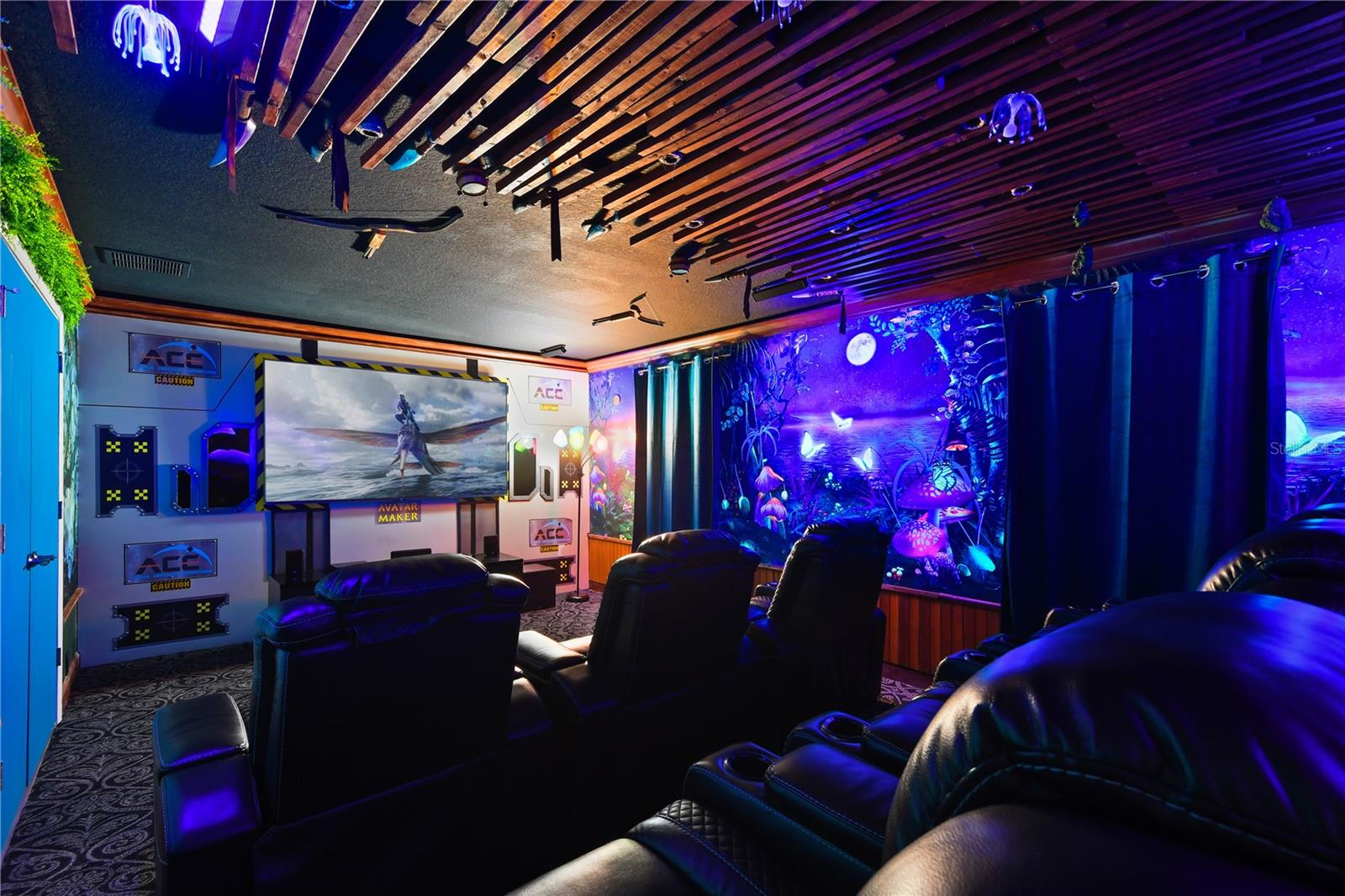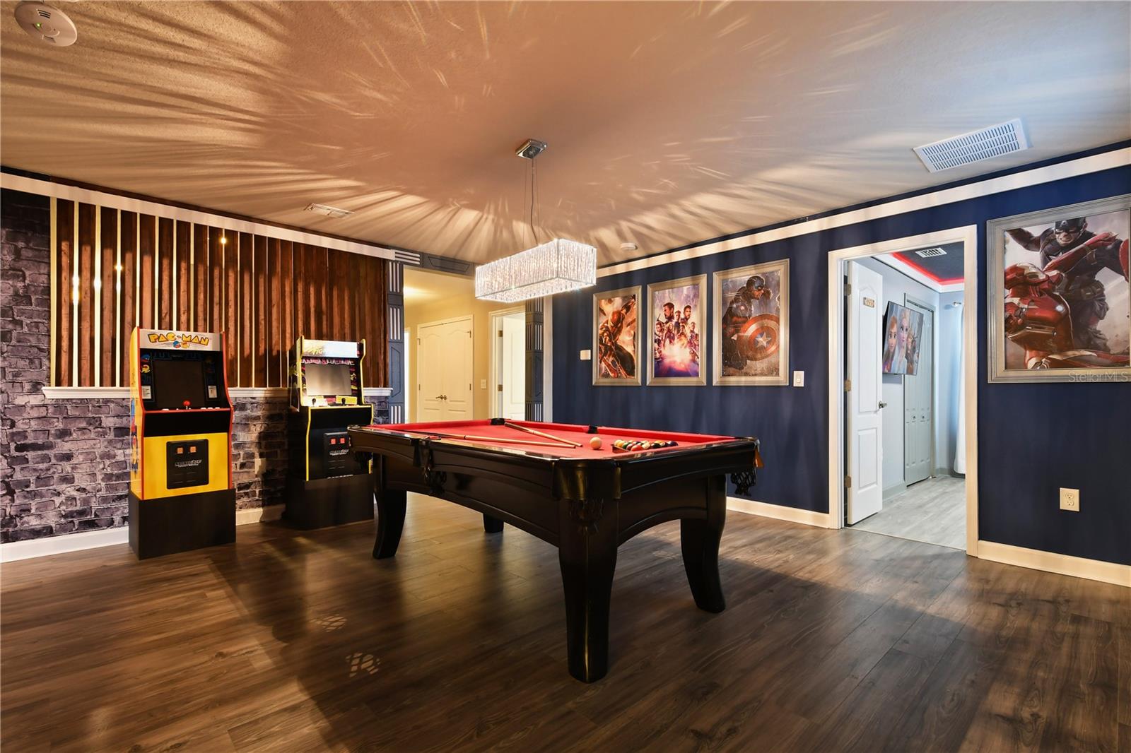Welcome to your dream vacation home in ChampionsGate Resort—one of Central Florida’s most sought-after gated communities. This luxurious 8-bedroom, 5-bath villa was fully renovated in November 2022 and shines with elegant finishes, modern comforts, and an unbeatable location—just a short walk to the Oasis Clubhouse, yet offering complete backyard privacy with no rear neighbors. Step inside to discover brand-new luxury vinyl flooring (installed in 2024) throughout (except in the bathrooms which feature tile, and carpet in the theater room) , two new AC systems installed in 2022, and a custom Avatar-themed theatre room that turns every movie night into an unforgettable experience. On the main floor, you’ll find a spacious primary suite and an additional guest bedroom, perfect for multi-generational stays. Upstairs, a large loft has been converted into a vibrant game room, while each bedroom is generously sized and uniquely themed to delight guests of all ages—featuring Star Wars, Frozen, Harry Potter and Mickey Mouse designs. Designed for both comfort and performance, this property is being offered fully furnished and turn-key ready, making it an excellent choice for a second home or successful short-term rental investment. The open-concept floor plan seamlessly connects the expansive living area to a chef-inspired kitchen with stainless steel appliances, quartz countertops, and direct access to the screened-in private pool and spa overlooking peaceful open views. Residents and guests enjoy access to the world-class ChampionsGate Oasis Clubhouse, featuring a lazy river, water slides, fitness center, restaurant & bar, movie theatre, and golf course access—all just minutes from your door. Whether you’re searching for a profitable investment or a personal luxury retreat near Disney, this home checks every box.
