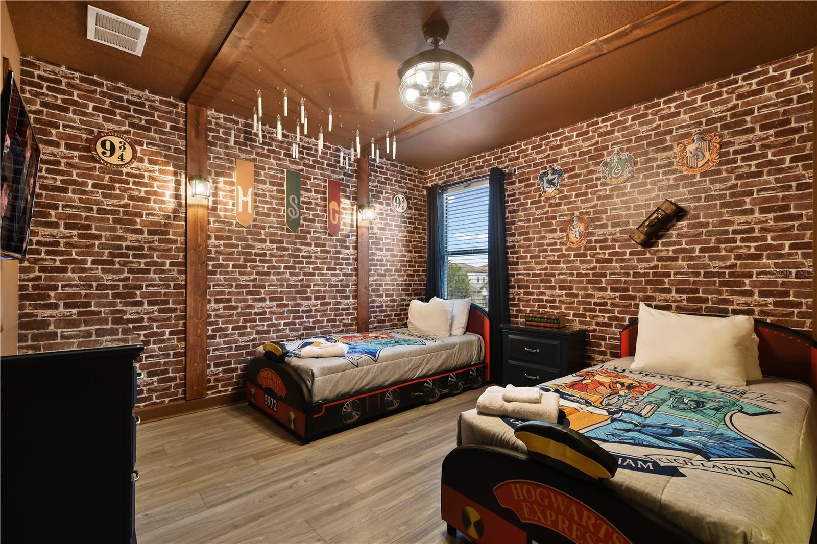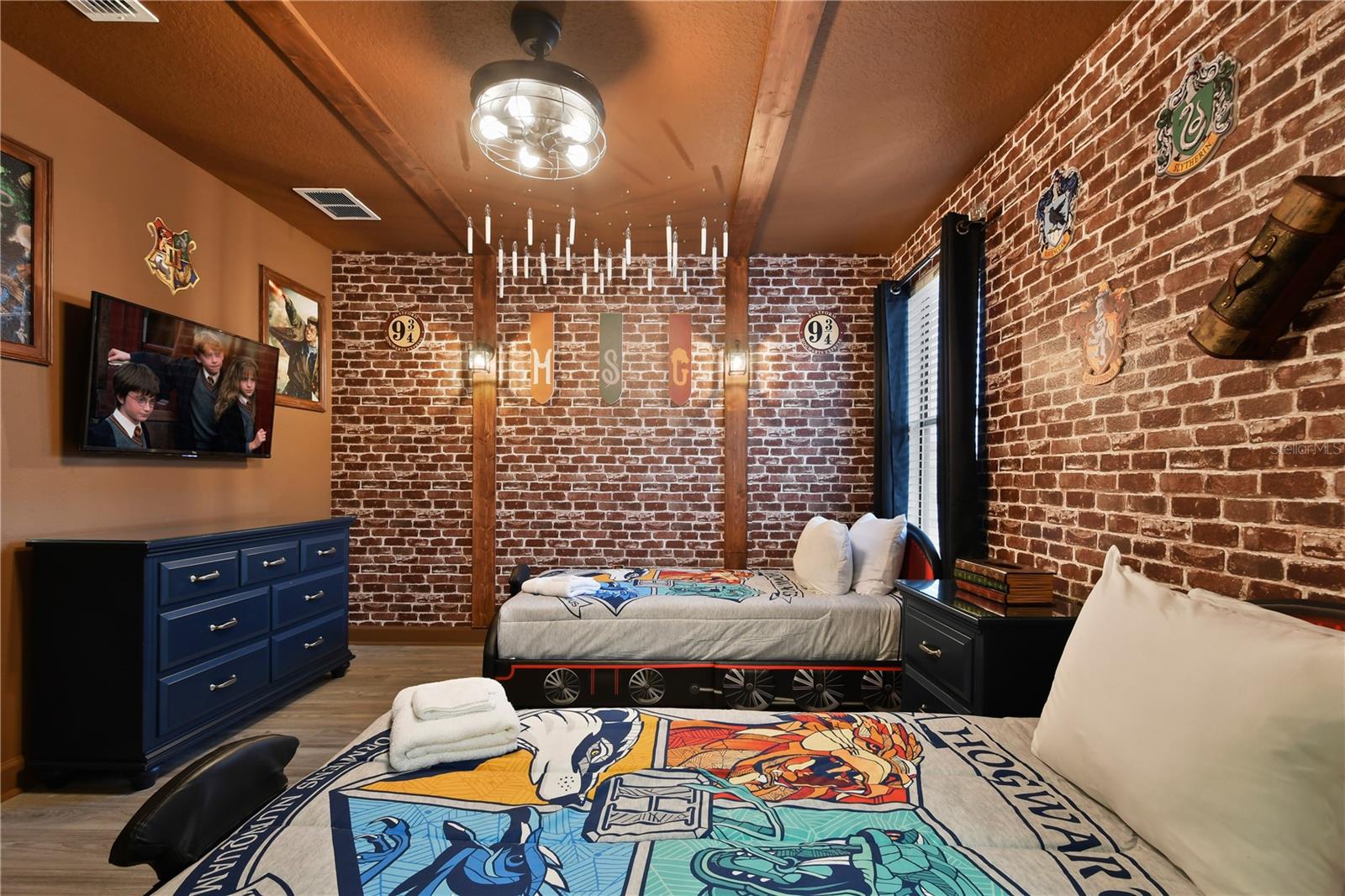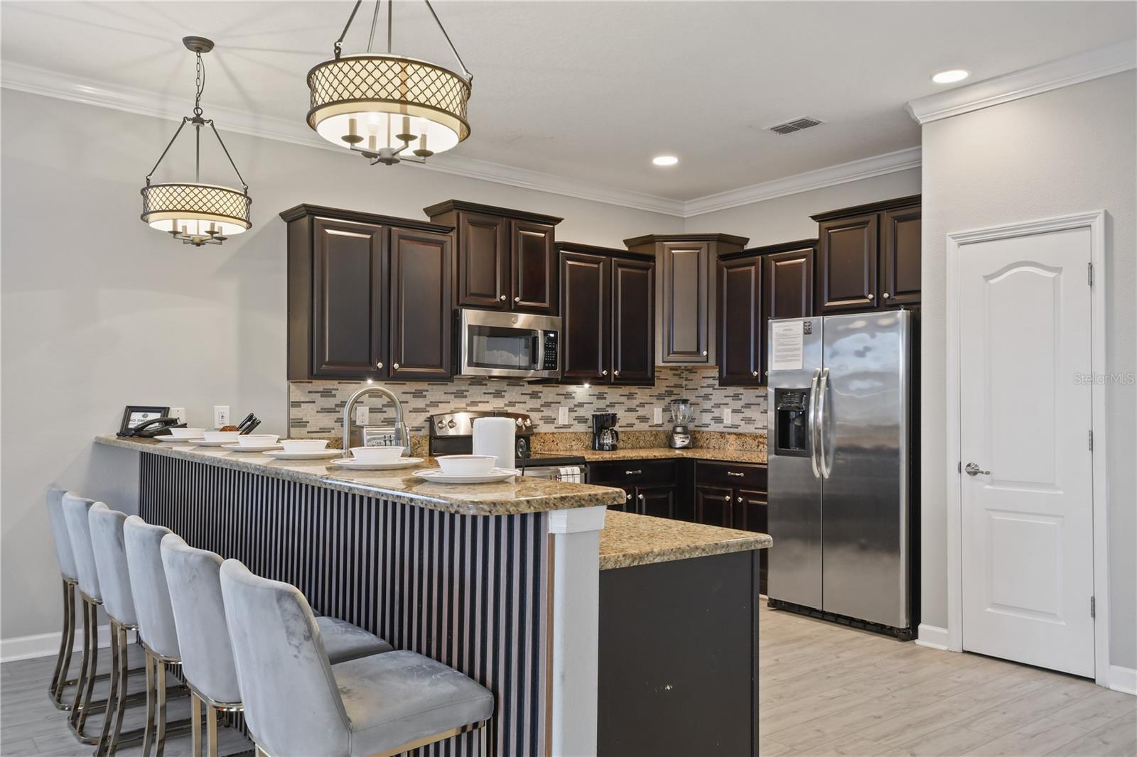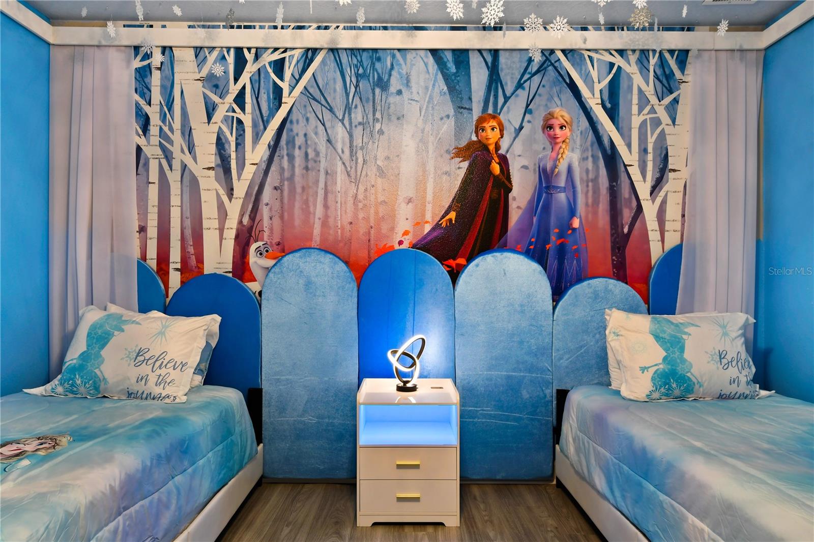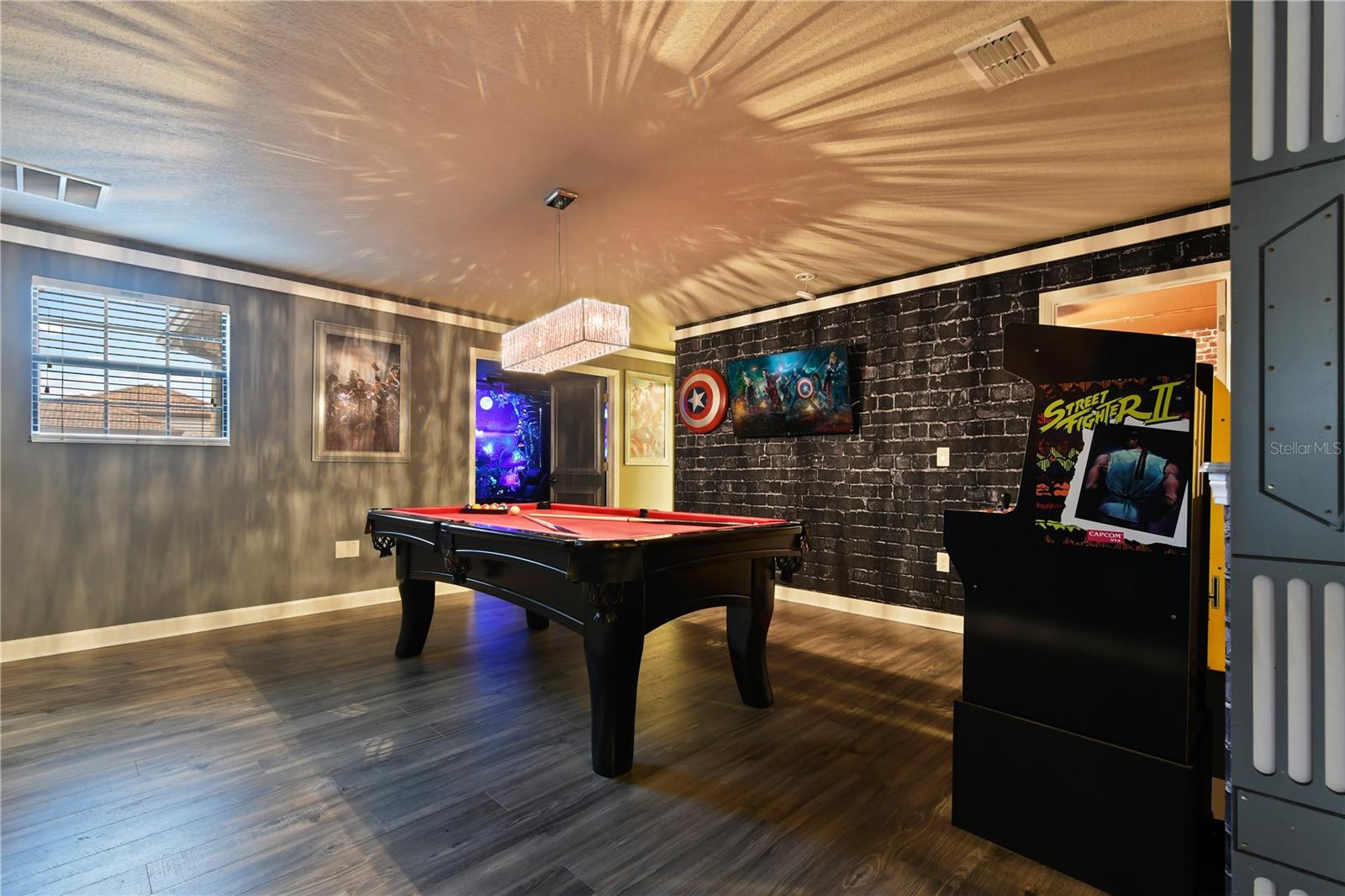 Welcome to your dream vacation home in ChampionsGate Resort—one of Central Florida’s most sought-after gated communities. This luxurious 8-bedroom, 5-bath villa was fully renovated in November 2022 and shines with elegant finishes, modern comforts, and an unbeatable location—just a short walk to the Oasis Clubhouse, yet offering complete backyard privacy with no rear neighbors. Step inside to discover brand-new luxury vinyl flooring (installed in 2024) throughout (except in the bathrooms which feature tile, and carpet in the theater room) , two new AC systems installed in 2022, and a custom Avatar-themed theatre room that turns every movie night into an unforgettable experience. On the main floor, you’ll find a spacious primary suite and an additional guest bedroom, perfect for multi-generational stays. Upstairs, a large loft has been converted into a vibrant game room, while each bedroom is generously sized and uniquely themed to delight guests of all ages—featuring Star Wars, Frozen, Harry Potter and Mickey Mouse designs. Designed for both comfort and performance, this property is being offered fully furnished and turn-key ready, making it an excellent choice for a second home or successful short-term rental investment. The open-concept floor plan seamlessly connects the expansive living area to a chef-inspired kitchen with stainless steel appliances, quartz countertops, and direct access to the screened-in private pool and spa overlooking peaceful open views. Residents and guests enjoy access to the world-class ChampionsGate Oasis Clubhouse, featuring a lazy river, water slides, fitness center, restaurant & bar, movie theatre, and golf course access—all just minutes from your door. Whether you’re searching for a profitable investment or a personal luxury retreat near Disney, this home checks every box.