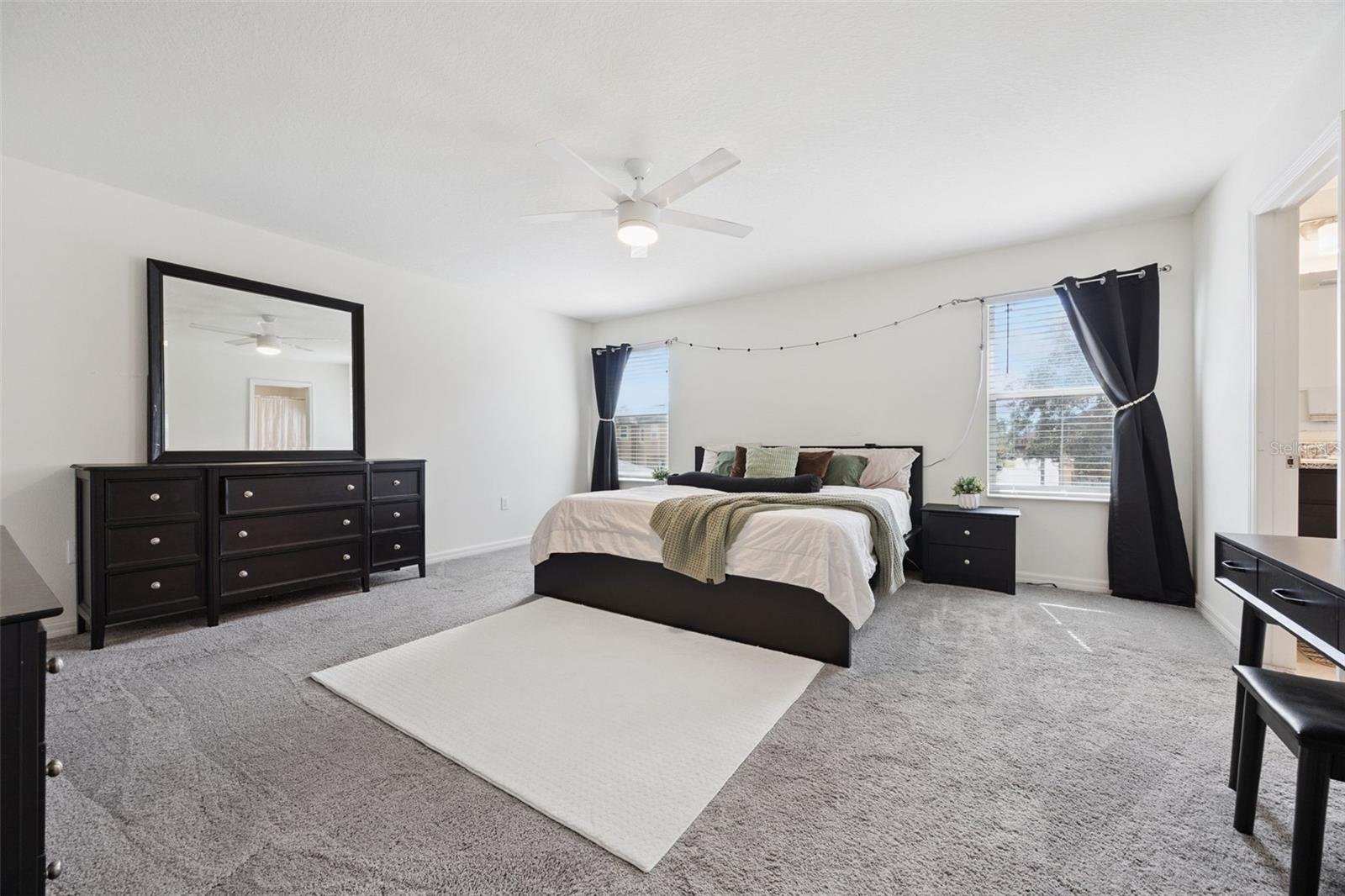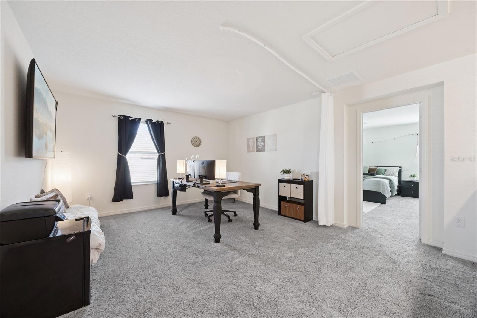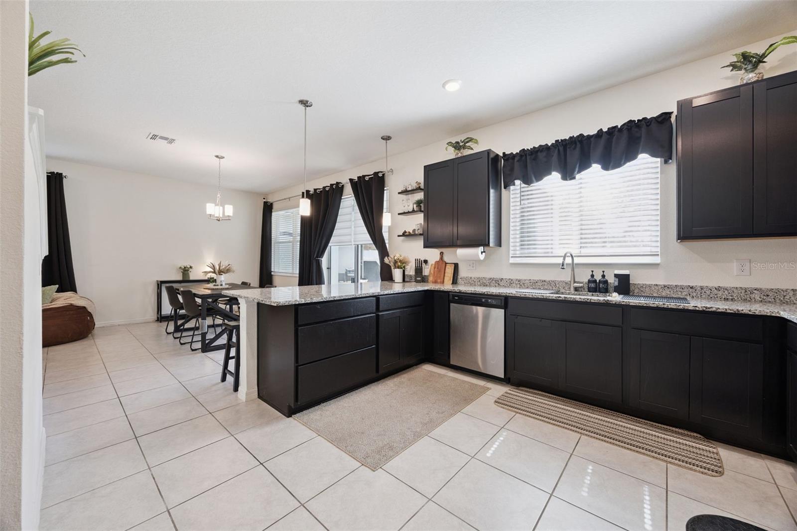 UPDATED AND MODERN HOME WITH HUGE BACKYARD! LIKE-NEW WITH NO CDD! Built in 2022, this Mirabella home features a highly functional, open floorplan layout and is loaded with sophisticated finishings. As you enter, you are greeted with a spacious open concept living and dining space that is ideal for entertaining. The dining area has a sliding glass door with views out to the patio and backyard, and also leads you over into the kitchen. The large kitchen features sleek espresso cabinetry, granite countertops, stainless steel appliances, and huge peninsula with counter seating that is perfect for prep, hosting, or easy dining. There is also a half bathroom downstairs for you and your guest’s convenience. Upstairs, you are met with a large loft space that can be used for an office, game room, movie room and more – make this space your own! There is also an installed privacy shade that can be used to separate the space. The huge primary suite features a walk-in closet, double-sink vanity with granite countertop, large walk-in glass and tile shower, and extra space for a makeup vanity or storage. The two guest bedrooms are located across from the loft, allowing for added privacy, and share their own guest bathroom with long granite vanity and shower/tub with built-in storage. Other features of the home include a large laundry room with sink and under-stair storage space. Stepping out back, you have a large, covered and screened patio with views of your huge backyard! With no immediate rear neighbors, this space can be transformed into your own Florida oasis. The Mirabella community has a low HOA and no CDD, and features a community pool, playground, and green space. The location is prime, with direct access to US-27 providing a short drive to Walt Disney World, I-4, ChampionsGate, Sunset Walk at Margaritaville and several more new restaurants, shops, and entertainment destinations. Come see this home before it is gone!