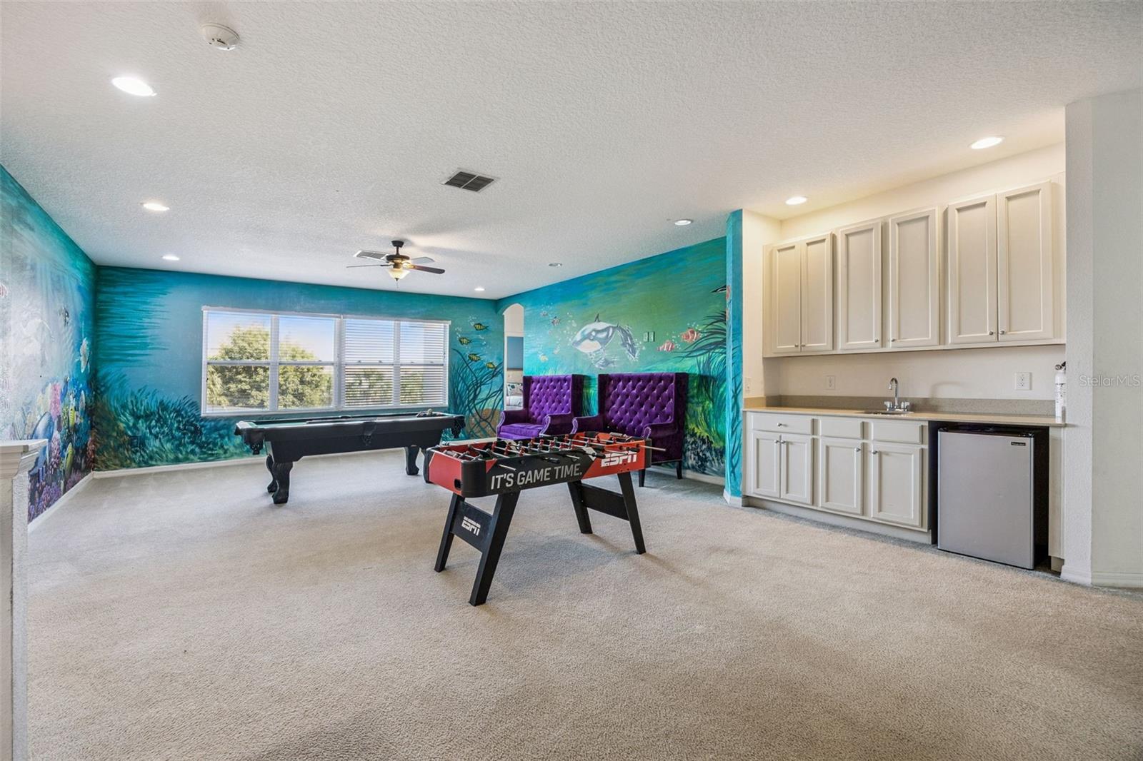 TURNKEY 13-Bedroom LUXURY POOL HOME in Solterra Resort – FULLY FURNISHED and THEMED! Situated on a CORNER LOT, just minutes from Disney and Orlando’s world-famous theme parks, this home comfortably sleeps up to 18 GUESTS, making it ideal for large families or vacation groups. Projected REVENUE is $185,961 with an AVERAGE NIGHTLY RATE of $1,054 and an OCCUPANCY RATE of 48%. Step inside to discover an OPEN-CONCEPT LAYOUT WITH SOARING HIGH CEILINGS and a SPACIOUS CHEF’S KITCHEN featuring quartz countertops, two refrigerators, two dishwashers, and an oversized island—perfect for entertaining. The bright, comfortable living area flows seamlessly for large gatherings. Tile flooring throughout main areas of the lower level offers low maintenance style and everyday convenience. This stunning home offers 5 bedrooms on the main level, including two primary suites with full ensuites, and 8 additional bedrooms upstairs, with a third primary suite for added convenience. Each space is thoughtfully themed with HAND-PAINTED MURALS inspired by AVATAR, AVENGERS, FROZEN, MINIONS, MICKEY & MINNIE and STAR WARS, creating a unique and immersive guest experience. Upstairs, a large loft area invites guests to relax and unwind, complete with a WET BAR W/REFRIGERATOR, POOL TABLE, and FOOSEBALL. Step outside to the PRIVATE, SCREENED LANAI, where you’ll find a HEATED POOL and SPA—perfect for enjoying Florida’s sunshine in comfort and privacy. Guests can venture out to enjoy the many amenities that Solterra Resort has to offer: pool, spa, fitness center, tennis, lazy river, snack/drink bar and volleyball courts. A short drive will have guests at any of Orlando’s many attractions like Sea World, Disney World, Universal Studios, plenty of shopping and restaurants! Call today for a private showing.