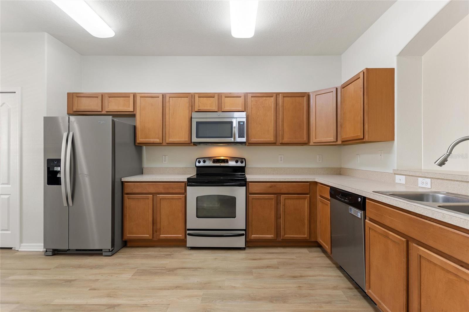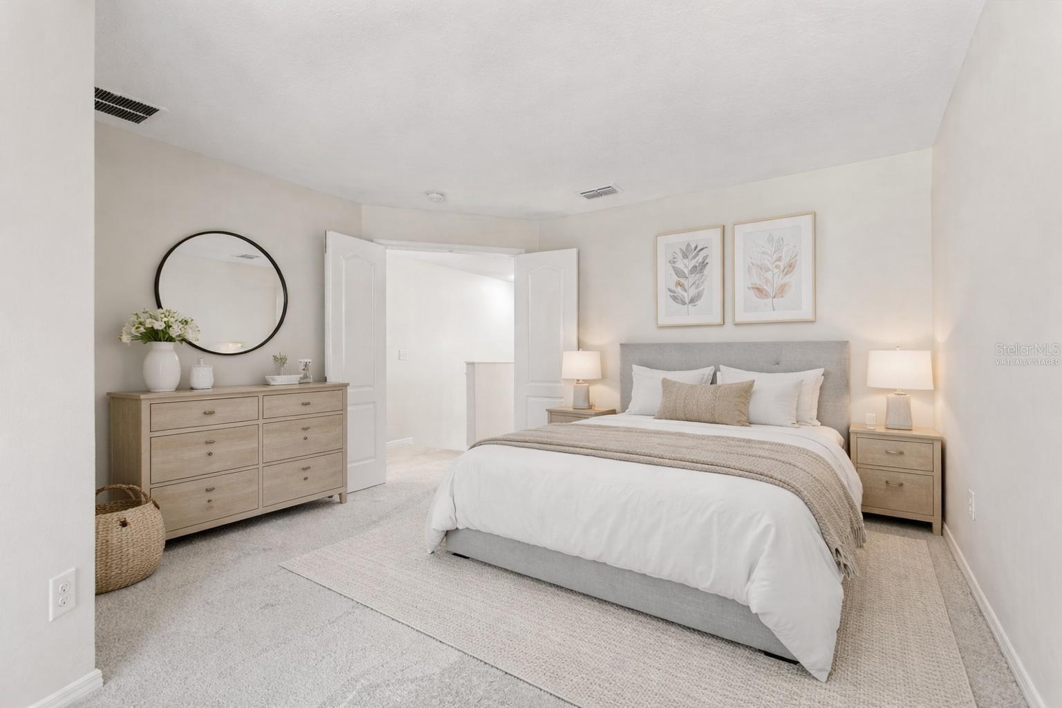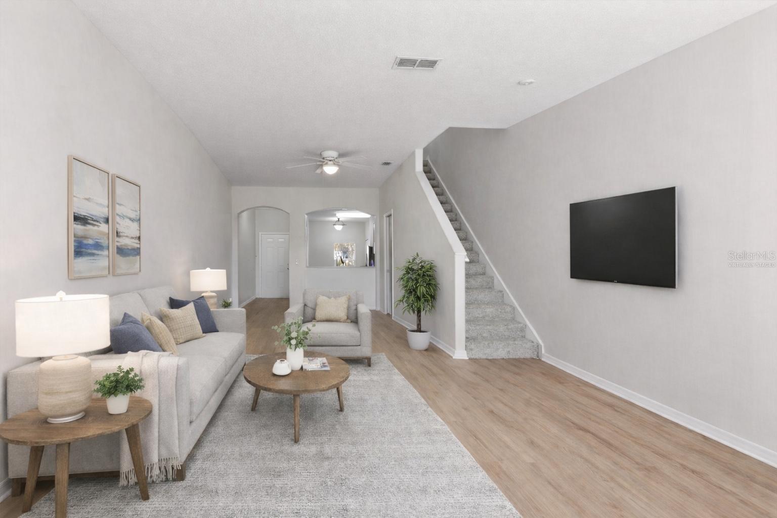 Welcome to this charming townhome in Towns Legacy Park, featuring fresh neutral paint and a newly installed roof, offering peace of mind and modern appeal from the moment you arrive. The bright and open first-floor layout is designed for everyday living and effortless entertaining. The spacious kitchen offers abundant cabinetry, an eat-in area, and a convenient breakfast bar, making meal prep and gatherings a breeze. The living area opens to a private screened patio, where you can enjoy tranquil open-space views with no rear neighbors, perfect for morning coffee, evening relaxation, or hosting friends outdoors. Upstairs, the primary suite provides a peaceful retreat with a large walk-in shower, while two additional guest bedrooms share a full bathroom, offering flexibility for family, guests, or a home office. Laundry is conveniently located on the second floor for added comfort and convenience. This home is ideal as a primary residence and is also zoned for both short and long-term rentals, presenting excellent investment potential. Residents of Towns Legacy Park enjoy access to community amenities including a pool and spa, ideal for relaxing after a long day or enjoying weekends with family and friends. Located just minutes from Disney World, shopping, dining, and the vibrant attractions of the 4 Corners area, this home offers the perfect balance of peaceful living and convenient access to everything Central Florida. Don’t miss your chance to make this exceptional property your new home.