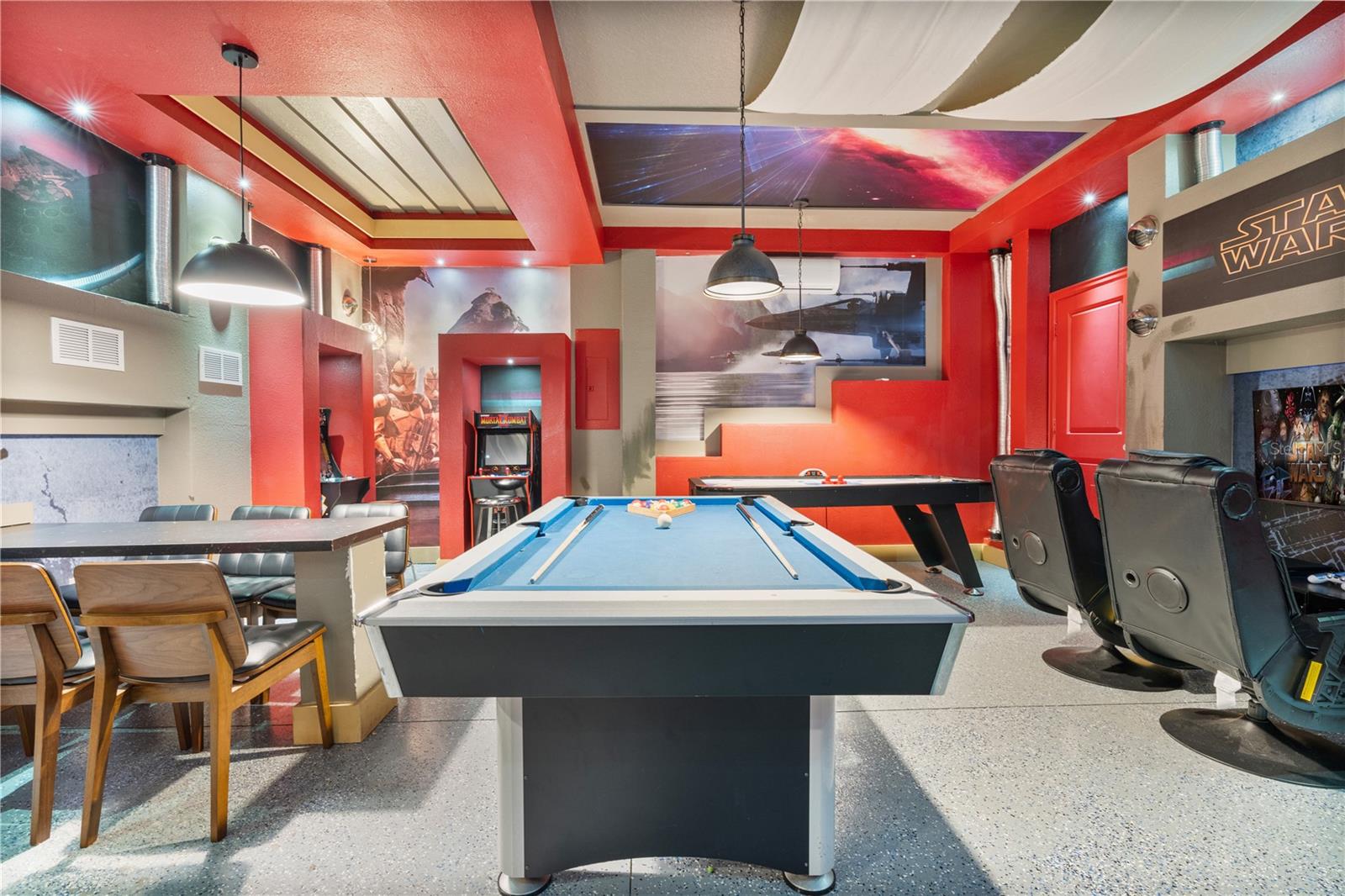 This 8 bedrooms plus a bonus room currently utilized as a 9th BEDROOM (formerly a game room). Beautifully and professionally decorated vacation property located in one of Davenport’s most desirable resort-style communities. Enjoy views of the GOLF COURSE AREA from the private pool. Designed for both relaxation and rental potential, this home offers an ideal blend of comfort, privacy, and convenience. The themed rooms are a standout feature, creating a memorable experience that guests love. Enjoy bright, open living spaces perfect for entertaining after a day at the parks, along with access to community amenities that enhance every stay. The prime location places the home just minutes from world-famous attractions, championship golf courses, shopping, dining, and major highways—supporting strong year-round demand. Situated on a quiet court, the property provides a peaceful retreat while remaining close to everything Central Florida provide. Fully suited for vacation use, it presents an excellent opportunity to enjoy a slice of Florida paradise or leverage it as a proven income-producing vacation rental. Turn the key and enjoy the Florida lifestyle—or let it work for you.