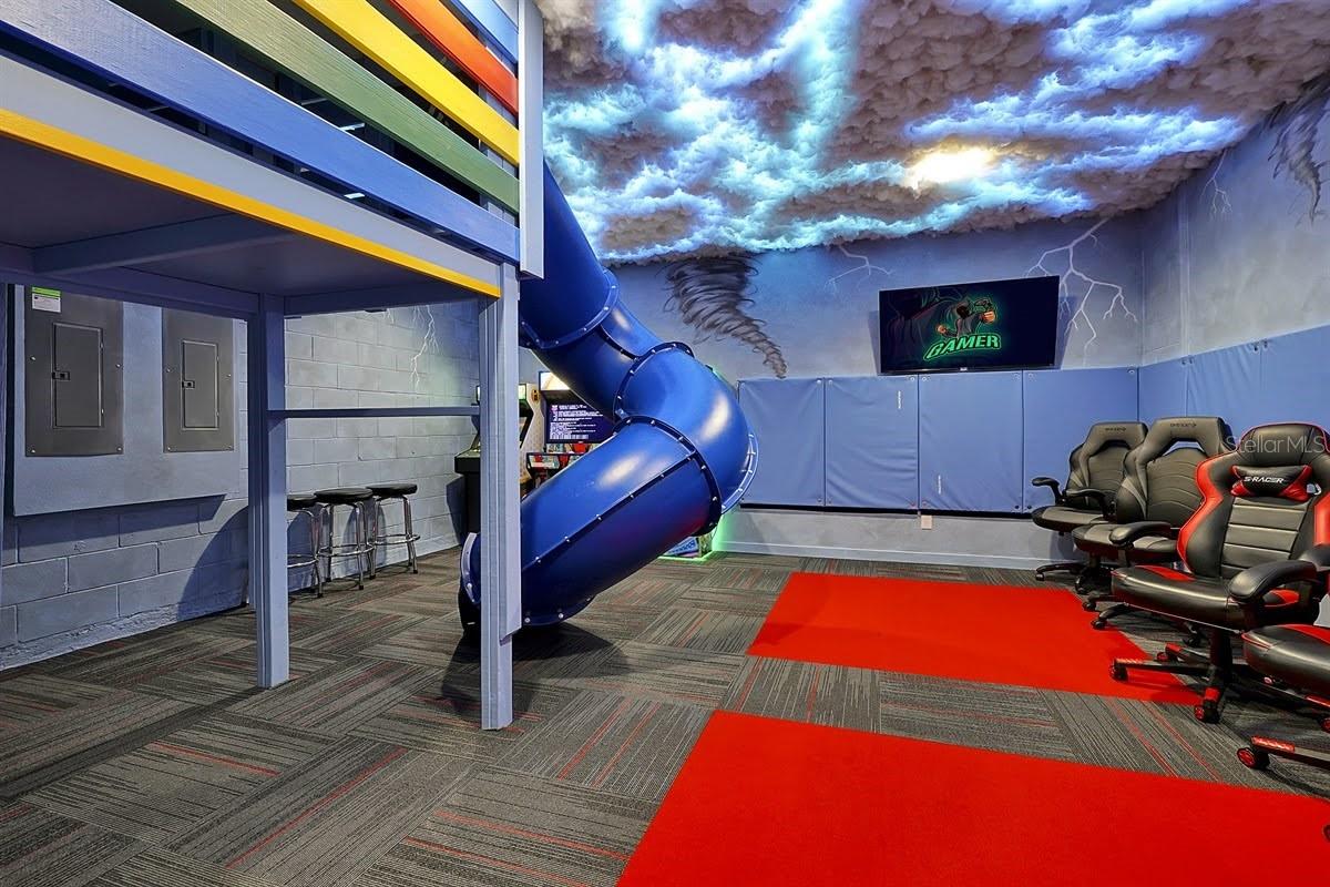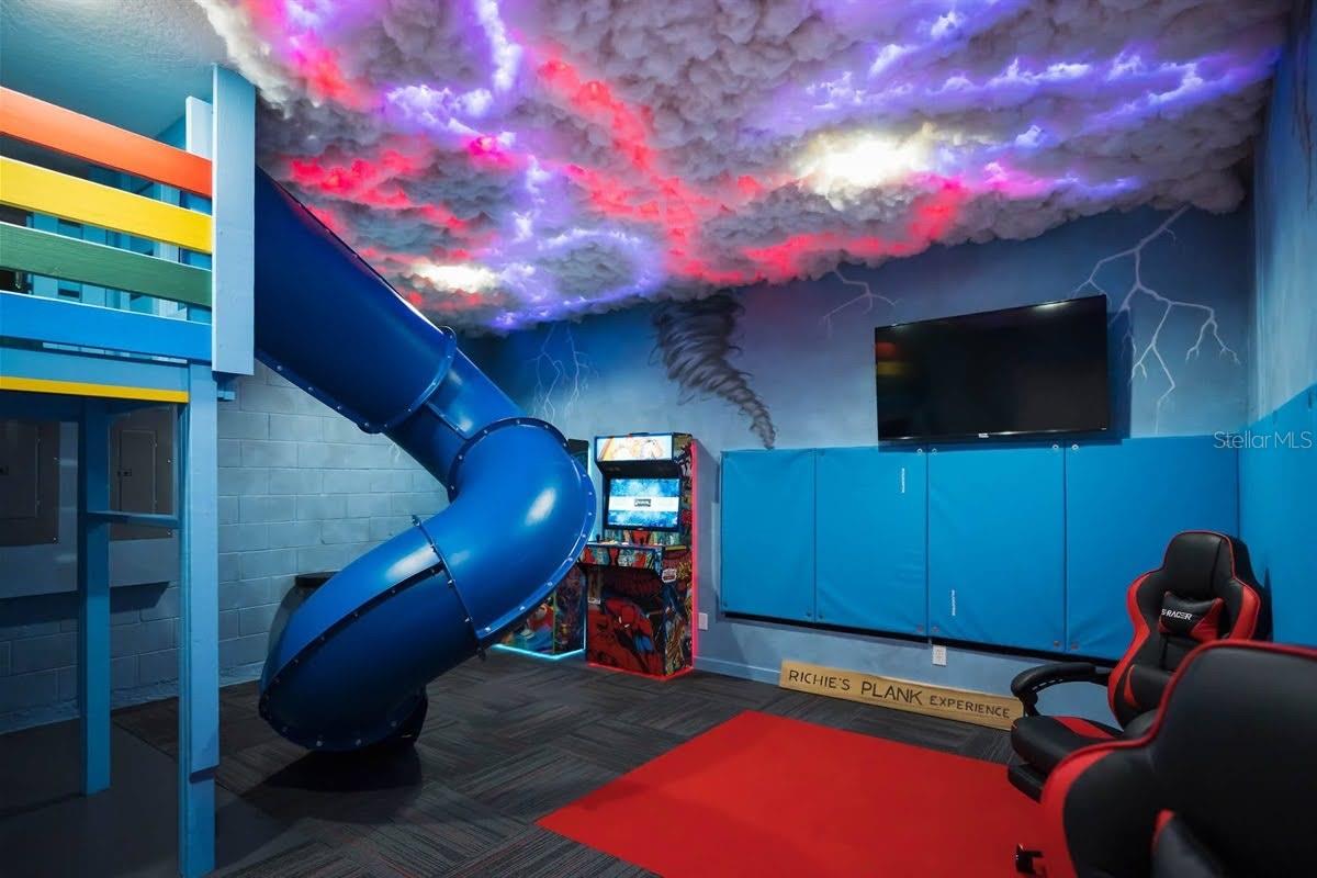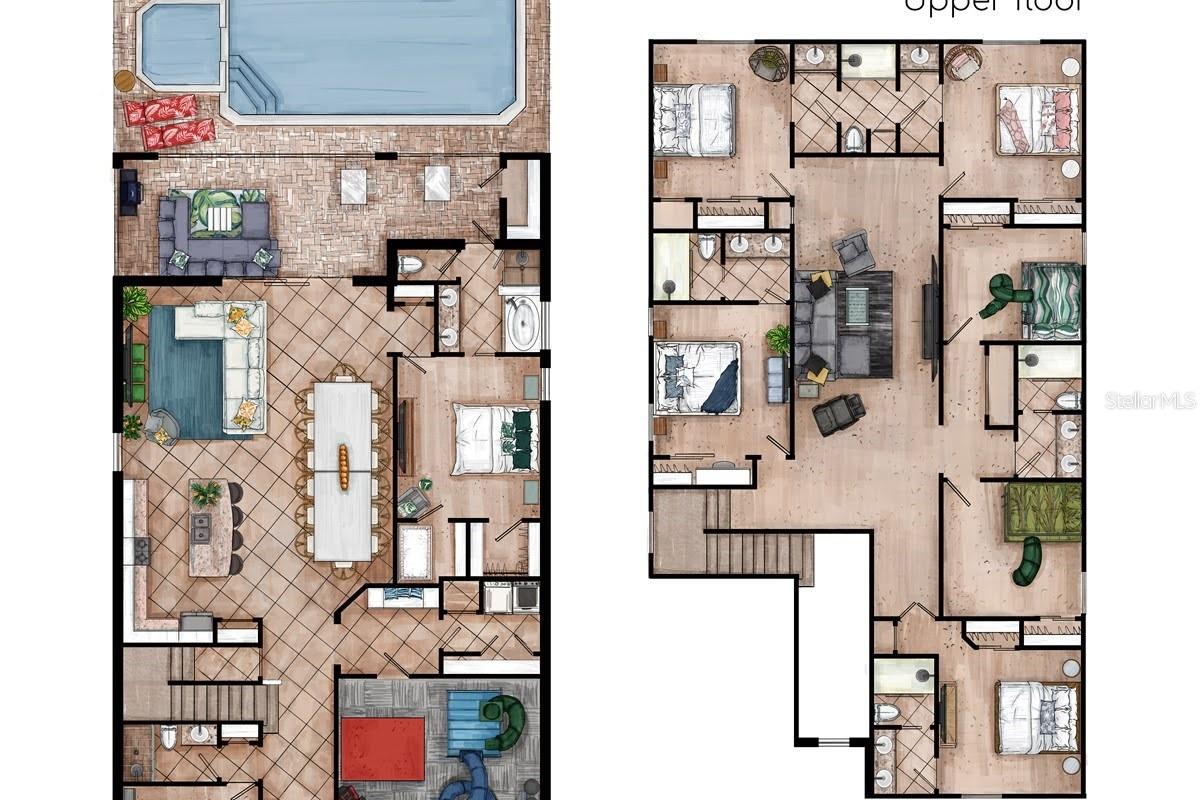 This exceptional 8-bedroom, 6-bath luxury home is located in the highly sought-after Windsor Island Resort, just minutes from Walt Disney World and Orlando’s top attractions. Designed with both comfort and income potential in mind, this spacious residence offers over 4,100 square feet of thoughtfully planned living space, making it ideal as a primary residence, second home, or high-performing vacation rental. The home features a bright, open-concept layout that seamlessly connects the living, dining, and kitchen areas—perfect for entertaining large groups. The gourmet kitchen is fully equipped with modern appliances, ample cabinetry, and an oversized island, offering both style and functionality. Multiple king suites provide hotel-level comfort, privacy, and upscale finishes, creating a true luxury experience for guests and owners alike. What truly sets this home apart is its thoughtful design inspired by the natural beauty and relaxed lifestyle of Central Florida. The home features a show-stopping slide from the second floor to the first, creating a fun and memorable experience for guests of all ages. Comfort was a top priority, with over $10,000 invested in an upgraded high-efficiency AC system and additional attic insulation to ensure consistent, energy-efficient cooling and heating throughout the entire home. Major improvements include a replaced dishwasher and refrigerator, as well as added plumbing and venting to accommodate a convenient double washer and dryer setup. All carpet is removed except in the room with the slide through the floor. Outdoors, enjoy the private saltwater pool—Ideal for unwinding after a full day enjoying Central Florida’s world-class attractions. For movie nights, the home features a private theater experience where guests can enjoy films indoors or watch a movie under the stars, blending luxury with unforgettable resort-style living. Outdoor theming continues around the pool area, creating a cohesive and visually stunning environment that enhances the overall guest experience. Step outside to your private outdoor oasis featuring a resort-style pool and spillover spa, perfect for unwinding after a day at the parks. The covered lanai and expansive deck provide ample space for lounging, dining, and enjoying Florida’s sunshine, all surrounded by thoughtfully designed poolside theming. The home is fully vacation-rental ready and has been meticulously maintained with exceptional attention to detail throughout. As part of Windsor Island Resort, owners and guests enjoy world-class amenities including a zero-entry pool, lazy river, water slides, splash pad, mini golf, fitness center, clubhouse, on-site dining, and more. With its prime location, luxury finishes, highly desirable Disney theming, and unmatched entertainment features, this home represents a rare opportunity to own a truly standout property in one of Central Florida’s premier resort communities.