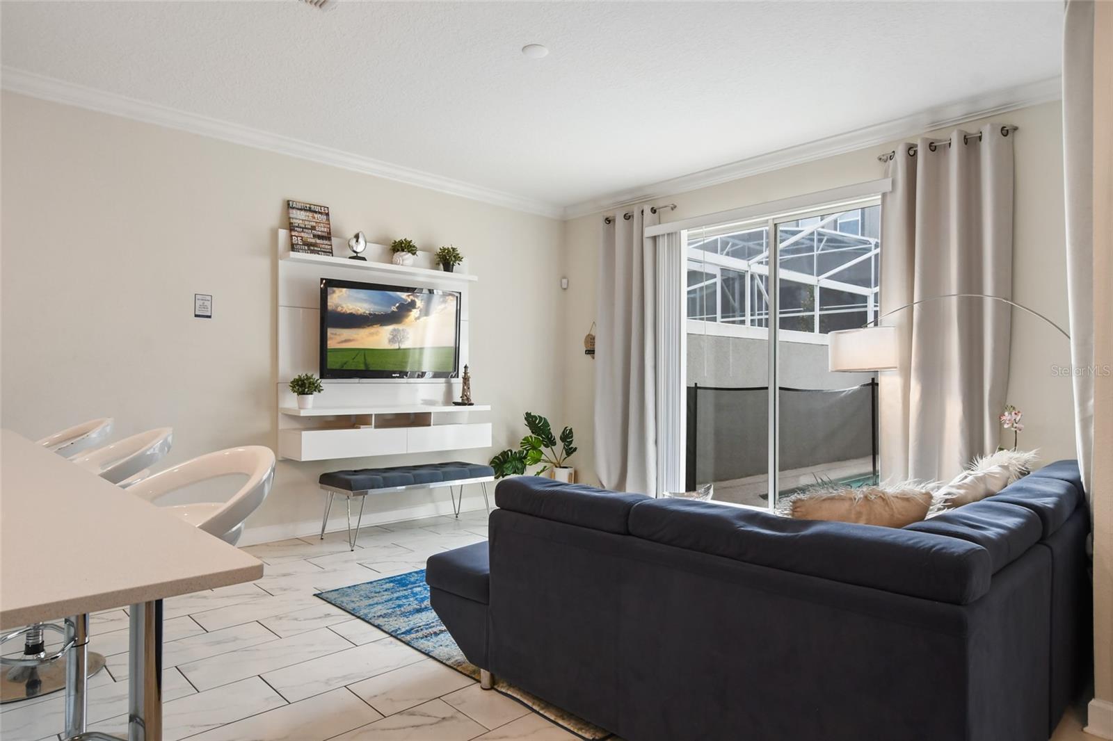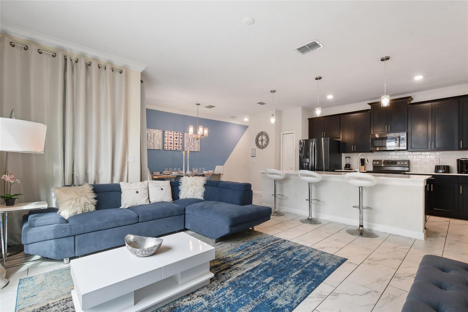 Discover exceptional resort-style living in this beautifully maintained 4-bedroom, 3-bathroom townhome, ideally located just minutes from Orlando’s world-famous theme parks. Thoughtfully designed for comfort, functionality, and strong investment potential, this home is perfect as avacation getaway, or income-producing property. The main level features a bright, open-concept layout with a modern kitchen showcasing sleek countertops, a spacious center island, and abundant cabinetry. The kitchen flows seamlessly into the living and dining areas, creating an inviting space for entertaining and everyday living. A convenient first-floor bedroom with a full en-suite bathroom offers added flexibility for guests or multi-generational living. Upstairs, the private primary suite provides a peaceful retreat with a walk-in closet and a well-appointed en-suite bathroom. Two additional bedrooms and a shared bathroom complete the second level, offering comfort and privacy for family and guests. Step outside to your own private heated pool within a screened lanai—perfect for relaxing after a day of adventure or enjoying Florida’s year-round sunshine. Residents enjoy exclusive access to the spectacular Oasis Clubhouse, featuring a full-service restaurant, tiki bar, fitness center, movie theater, game room, lazy river, private cabanas, and more. A future phase is underway, including a water park and sports complex, further enhancing the resort lifestyle. The HOA provides outstanding value, covering access to amenities, lawn care, trash service, security monitoring, cable, internet, and gated community entry. Conveniently located near major highways, shopping, medical facilities, and dining, this home offers easy access to Disney, Universal, and other top Central Florida attractions.