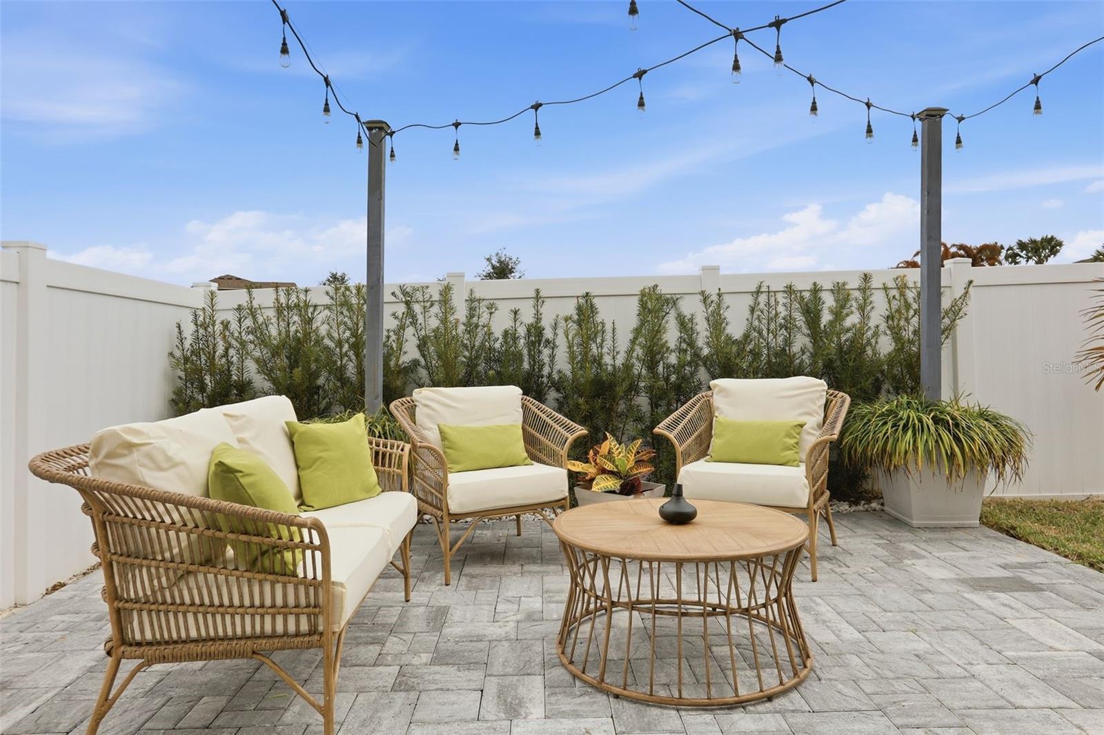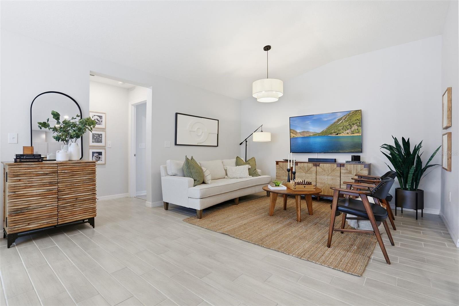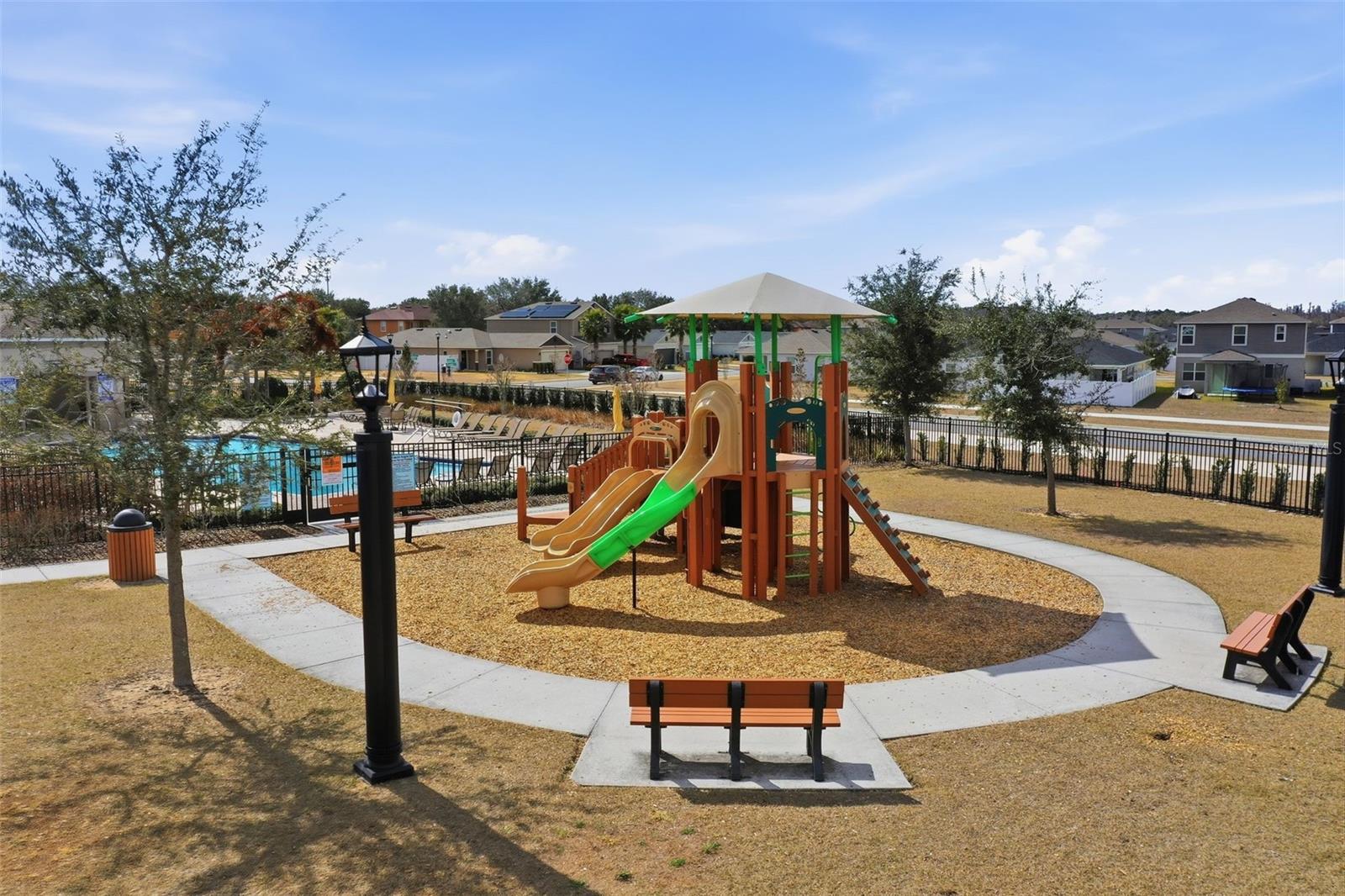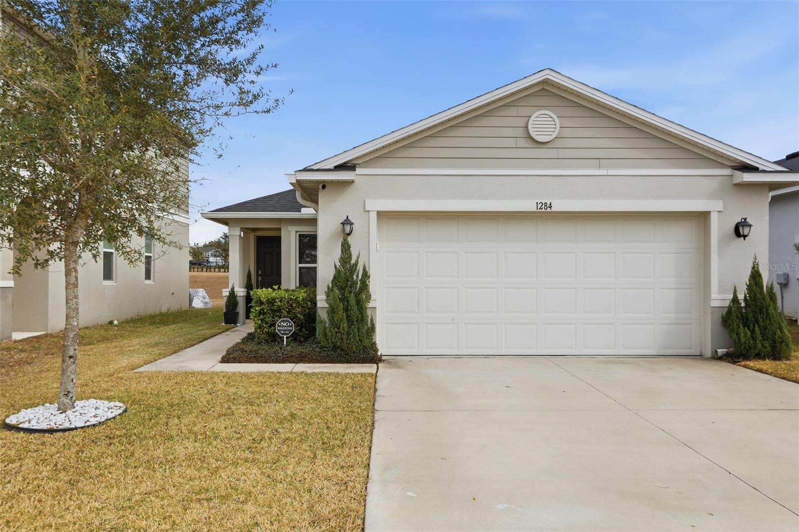Built in 2022, this contemporary home offers the comfort and efficiency of newer construction along with thoughtful upgrades throughout and no rear neighbors! The open concept layout features a spacious kitchen with 42 inch cabinets, granite countertops, and a large island that is ideal for gathering and everyday living. Ceramic tile runs through the main living areas and bathrooms, with LAMINATE FLOORING upgraded in all bedrooms, including the primary suite, which offers a spacious walk-in closet and a well designed bathroom. Large windows and sliding glass doors provide abundant natural light and lead to a covered lanai, creating a comfortable space to relax outdoors. ADDITIONAL FEATURES include a water softener and treatment system, smart controlled air conditioning, hurricane impact windows, and gutters. The two car garage and extended driveway provides convenient parking, while the VINYL FENCE installed in 2023 and the PAVED PATIO completed in 2024 create a private backyard setting that is perfect for entertaining or enjoying quiet evenings. Conveniently located near US 27 and US 192, this home offers easy access to shopping, dining, medical facilities, and Central Florida attractions.