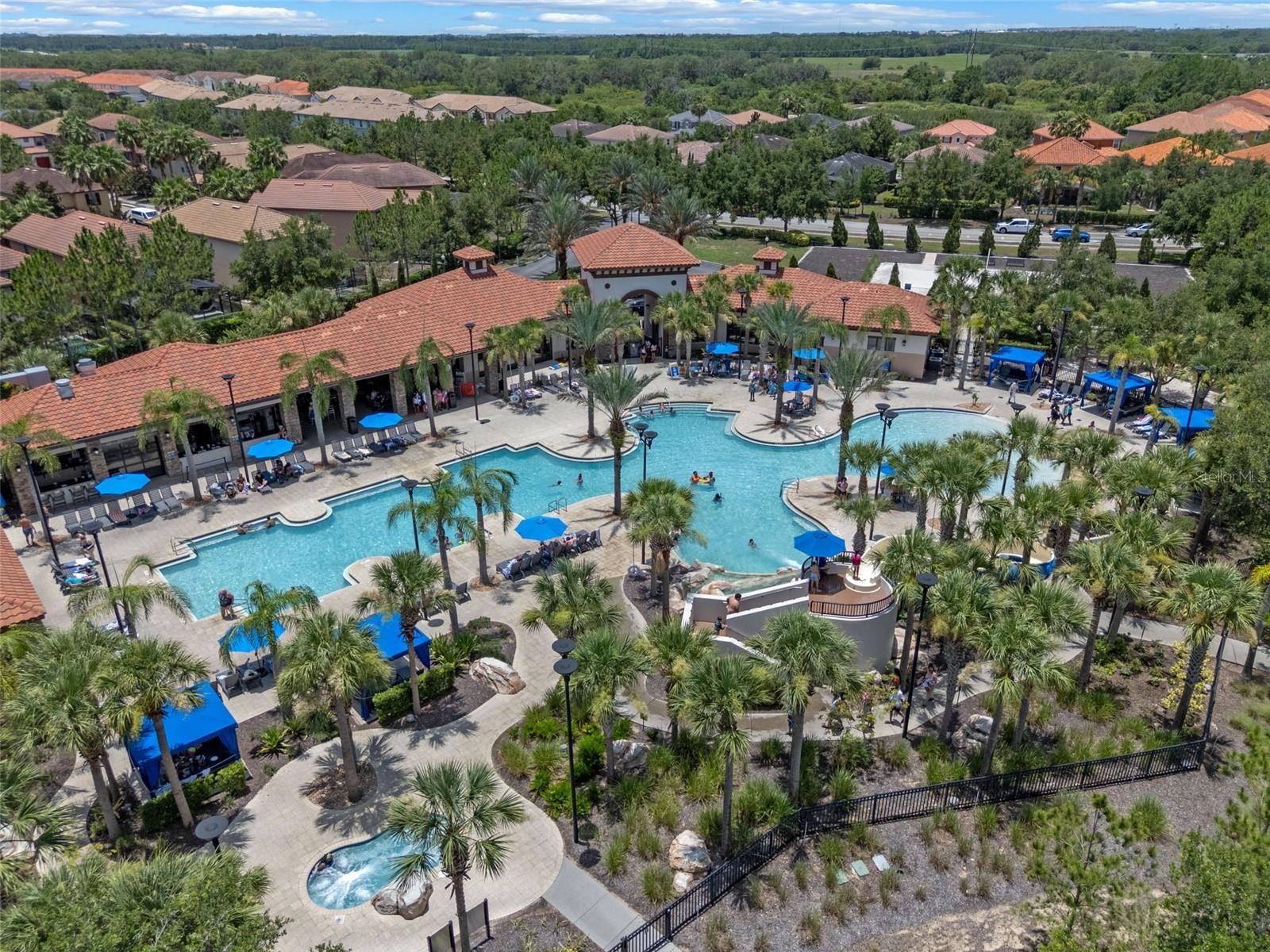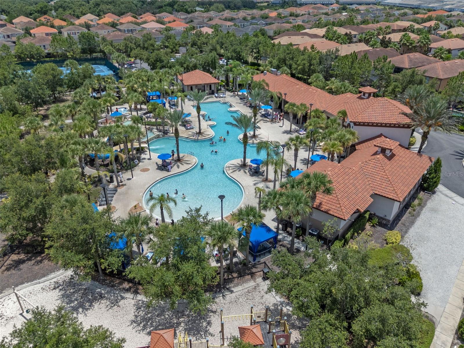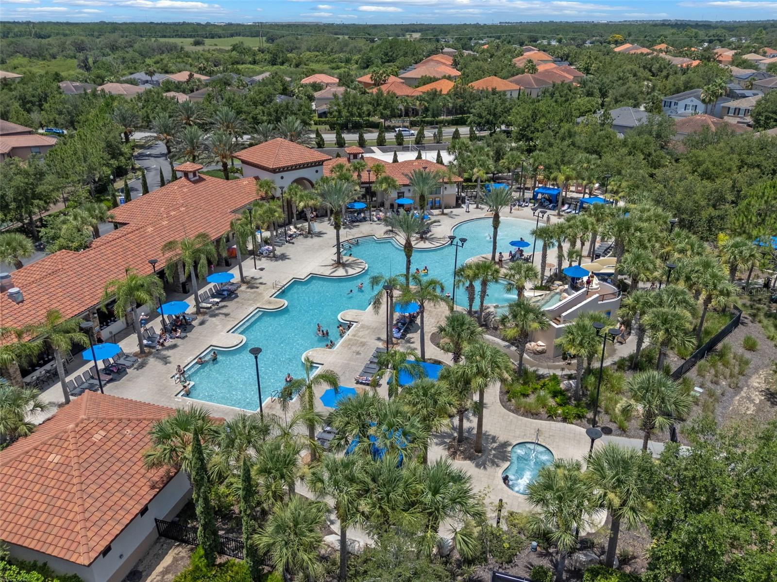 Welcome to Your Dream Home in Solterra Resort! Nestled within the prestigious, guard-gated community of Solterra Resort, this exceptional house offers a rare gem on a nearly 1/3 acre lot, ensuring unmatched privacy with no rear neighbors. This stunning property serves as both an exquisite primary residence and a lucrative short-term rental investment opportunity. As you step into the expansive backyard, prepare to be captivated by one of the largest outdoor spaces in the community, designed for your ultimate enjoyment. The magnificent oversized pool glistens under the sun, while the raised heated spa with its tranquil spillover water feature beckons you to unwind. The generously sized pool deck is amazing, and the luxurious lanai, adorned with two Sunsetter brand remote-controlled retractable awnings is your personal oasis for relaxation and entertaining. Inside, the home exudes elegance with its beautifully recent remodeled kitchen that boasts a harmonious blend of new cabinets and a chic combination of granite, quartz, and marble countertops. The oversized island makes it an entertainer's paradise, where culinary creativity comes alive. With spacious rooms designed for leisure, two downstairs bedrooms provide flexibility for family or guests, while an additional lounge area adds to the home's versatility. Venture upstairs to discover the serene primary bedroom, featuring a spacious east-facing balcony. The upstairs living room, flanked by three additional en suite bedrooms, offers a perfect sanctuary for family and friends. Living in Solterra Resort means embracing a vibrant lifestyle enriched with amenities. The spectacular clubhouse features a heated resort pool with a thrilling slide and beach entry, a lazy river pool, and well-maintained tennis and pickleball courts. Enjoy a workout in the fitness center or dine leisurely at the on-site café with both dine-in and take-out options. For sun-lovers, furnished rental cabanas and a sand volleyball court enhances the community's allure. When you're ready to explore beyond the community, you're just 20 minutes from Disney and a mere 7 minutes from an array of dining and shopping choices. This impeccably maintained property invites you to experience a luxurious lifestyle in one of the most sought-after locations in Central Florida. Experience the Solterra Lifestyle Today! Don’t miss your chance to own one of the most beautiful and well-cared-for homes in Solterra Resort. Schedule your private showing and embrace the unparalleled charm and comfort this exceptional property has to offer!