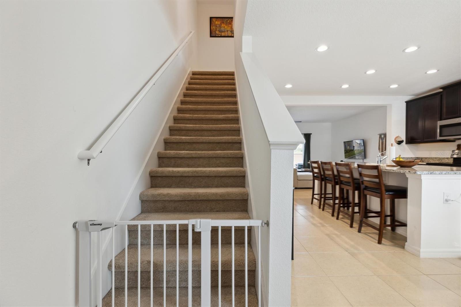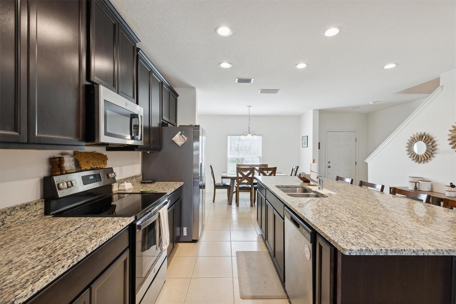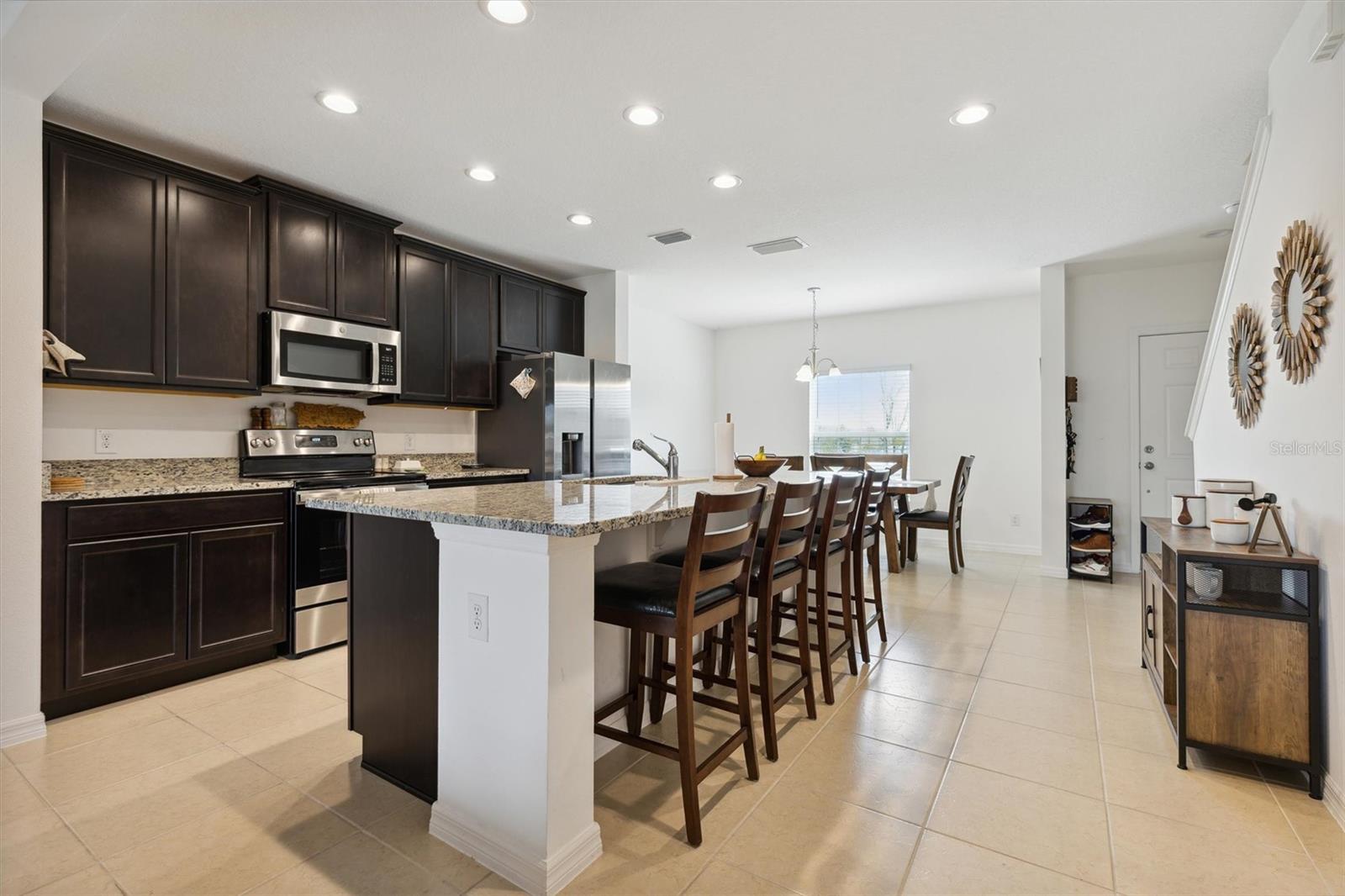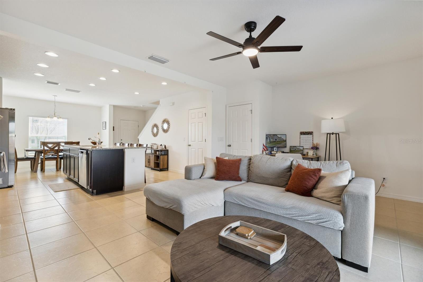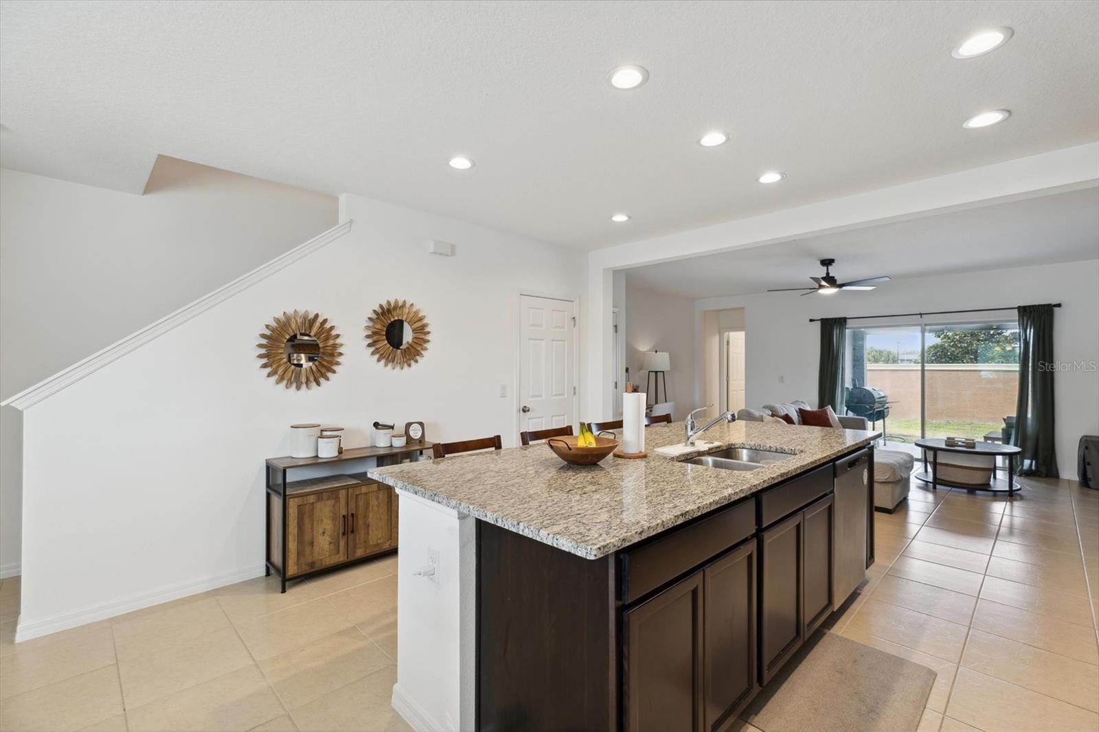 Step into this stunning townhome nestled within the popular Williams Preserve gated community in Davenport, built in 2022! Revel in the seamless flow of the open floor plan, adorned with tile flooring throughout the first floor, featuring sleek espresso cabinets, granite countertops, stainless steel appliances, and stylish lighting fixtures. The inviting living room showcases sliding glass doors, with no rear neighbors. Ascend the carpeted stairs to discover three bedrooms on the second floor, including a luxurious master suite complete with an en-suite bathroom and a spacious walk-in closet. The en-suite bathroom features a walk-in shower with sliding doors for added elegance. Additional highlights include generously sized bedrooms, a guest bathroom with a shower and tub combination, ceiling fans, a convenient laundry closet, open parking, and a half bath on the main level. Ideal for both residential living and investment purposes, this property promises versatility. Residents of this community enjoy access to walking trails, a picturesque community pool, and a playground. Conveniently located across from Davenport School of the Arts, this home offers easy access to Hwy 27, I-4, and US 192, as well as excellent shopping and dining options. Don't miss the opportunity to make this exceptional townhome yours—schedule your appointment today