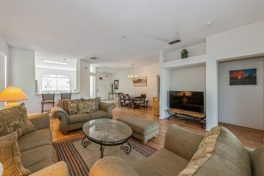 *NEW PRICE IMPROVEMENT* - Imagine picturesque sunsets from your private lanai at this delightful 3-bed/2-bath pool home, ideally situated on the fourth fairway of the Fairways Lake Estates golf community. Over 1600 square feet of well-designed living space awaits in this tranquil Four Corners neighborhood. Enjoy unparalleled convenience, with Disney, Margaritaville, water parks, shopping, and dining just a quick 15-minute drive away. Whether you're seeking a dream vacation escape or a permanent haven, this move-in ready property perfectly meets your needs. Zoned for short-term rentals, it also offers an excellent opportunity for investment income. Community amenities, including the pool, tennis courts, basketball hoops, and lake access, are a short stroll away. Rest easy knowing the home features a new roof (2023), new pool heater and pump (2023), and a newly resurfaced pool (2022). Fully furnished and ready for you to create lasting memories. Don't miss this one!
