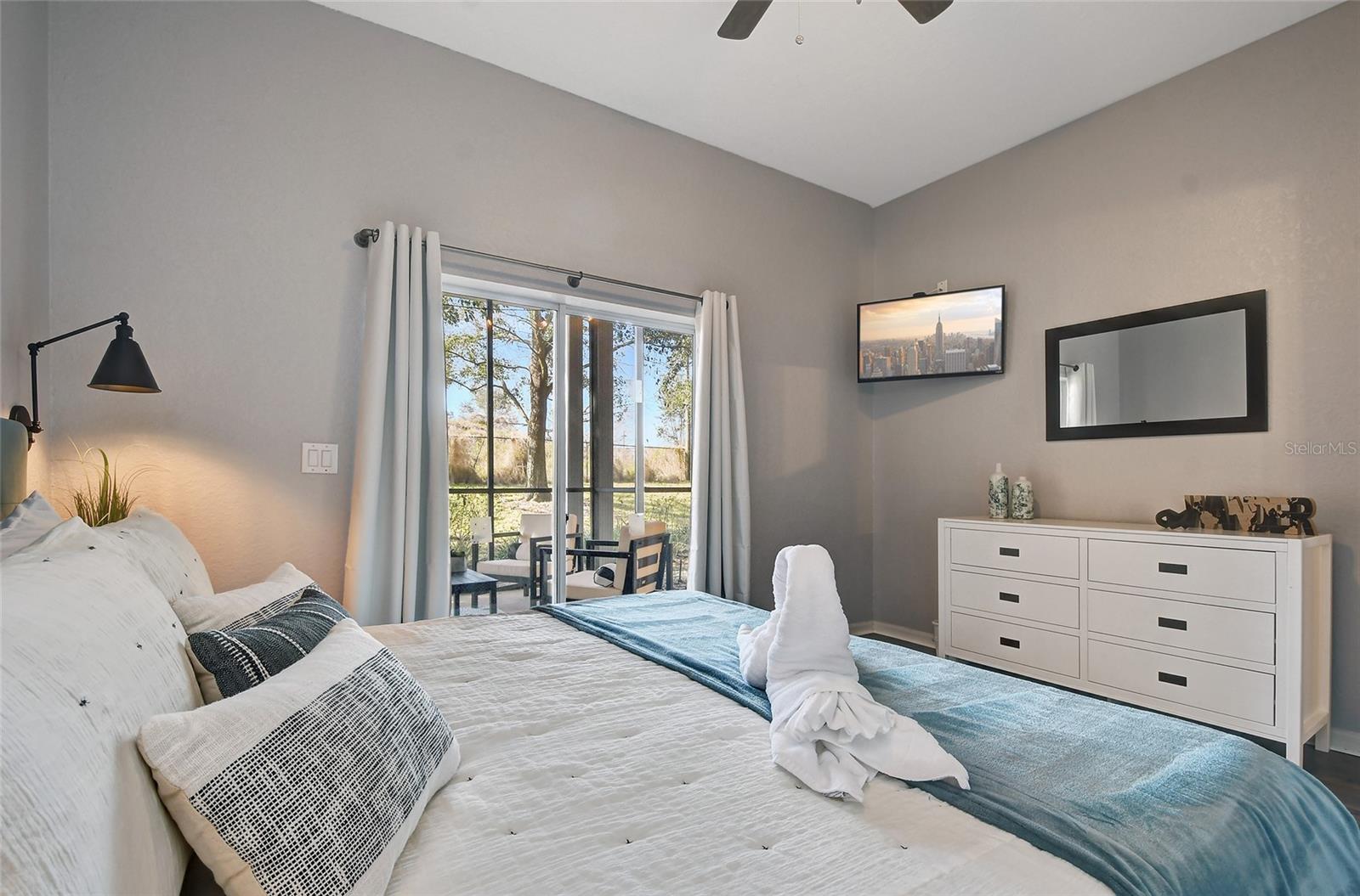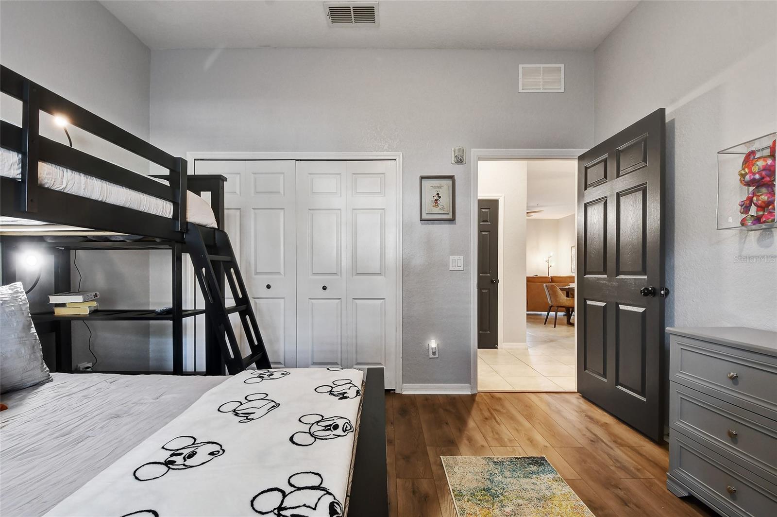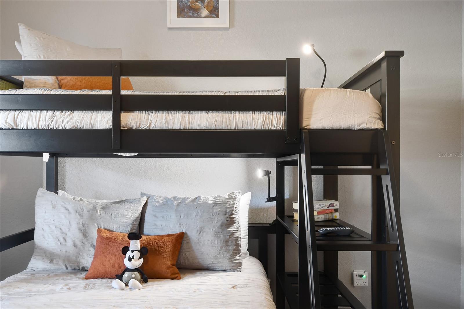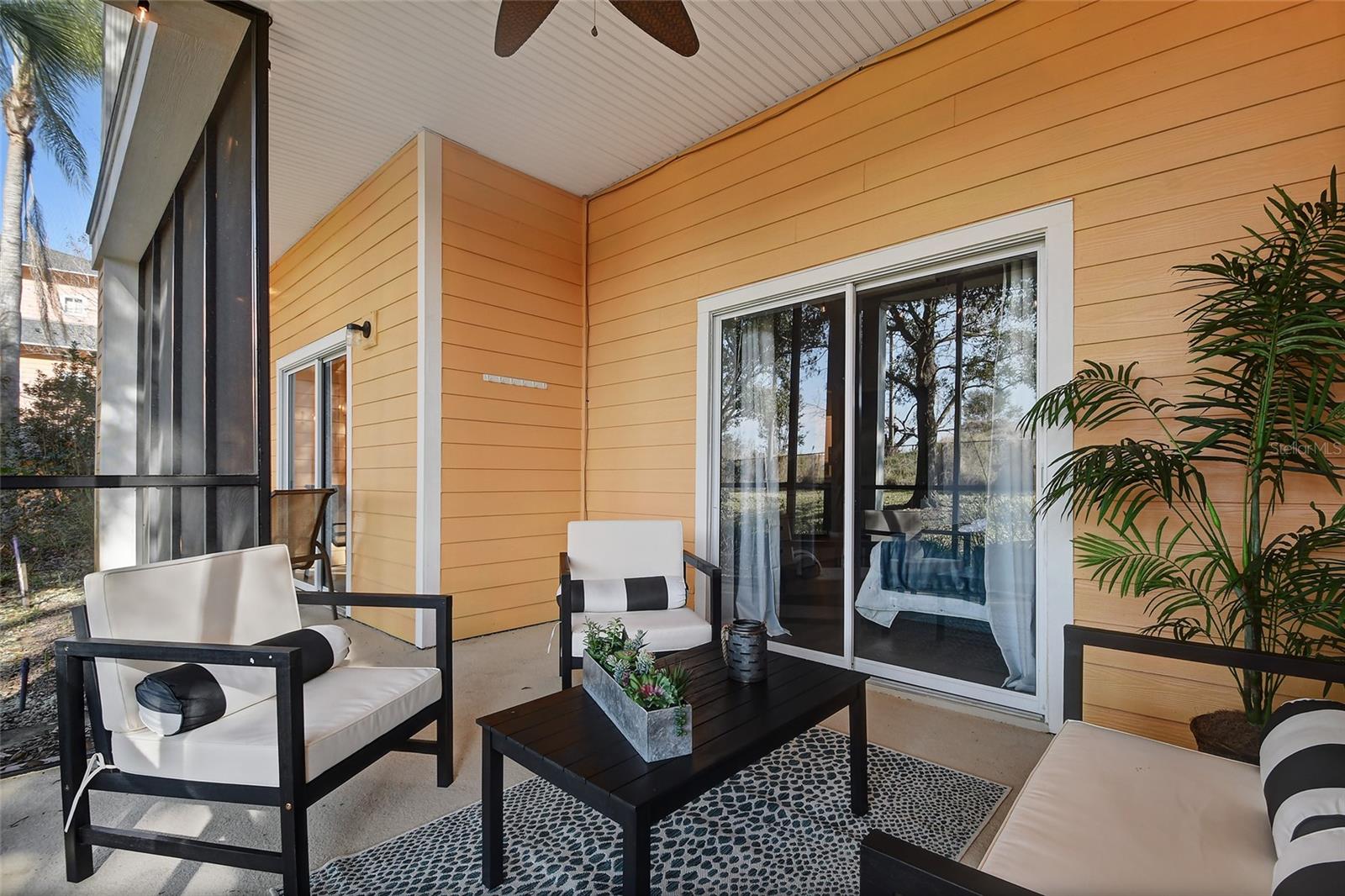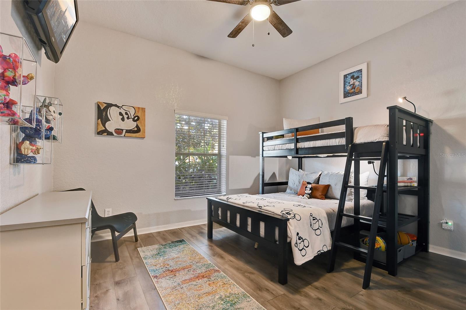 Reduced price! Discover this unique floorplan in Building 10, a rare ground floor unit in a two-story building—one of only two in the entire resort, housing just six exclusive units. This beautifully decorated 2-bedroom condo features a spacious lanai and a large great room with dining and living areas that open to the patio through sliding doors. Inside, you'll find no carpets—just laminate flooring in the bedrooms and tile throughout the rest of the unit. The kitchen boasts stainless steel appliances installed in 2021. The master bedroom, with its en suite bathroom, offers direct access to the patio, complete with outdoor furniture and no rear neighbors, ensuring privacy and tranquility. The second bedroom is charmingly decorated with a bunk bed and a unique collection of limited edition Mickey Mouse figures adorning the wall. The second bathroom is updated with a new vanity, and both bathrooms feature bathtubs. Additionally, the unit includes a convenient laundry room equipped with a washer and dryer. Don't miss the chance to own this exceptional condo in a prime location!
