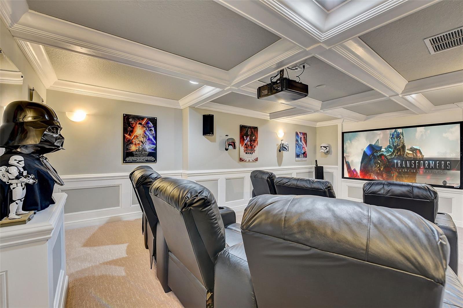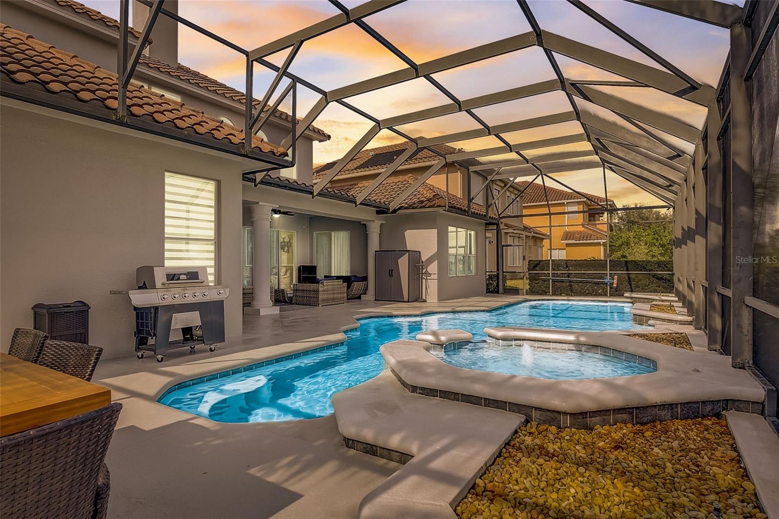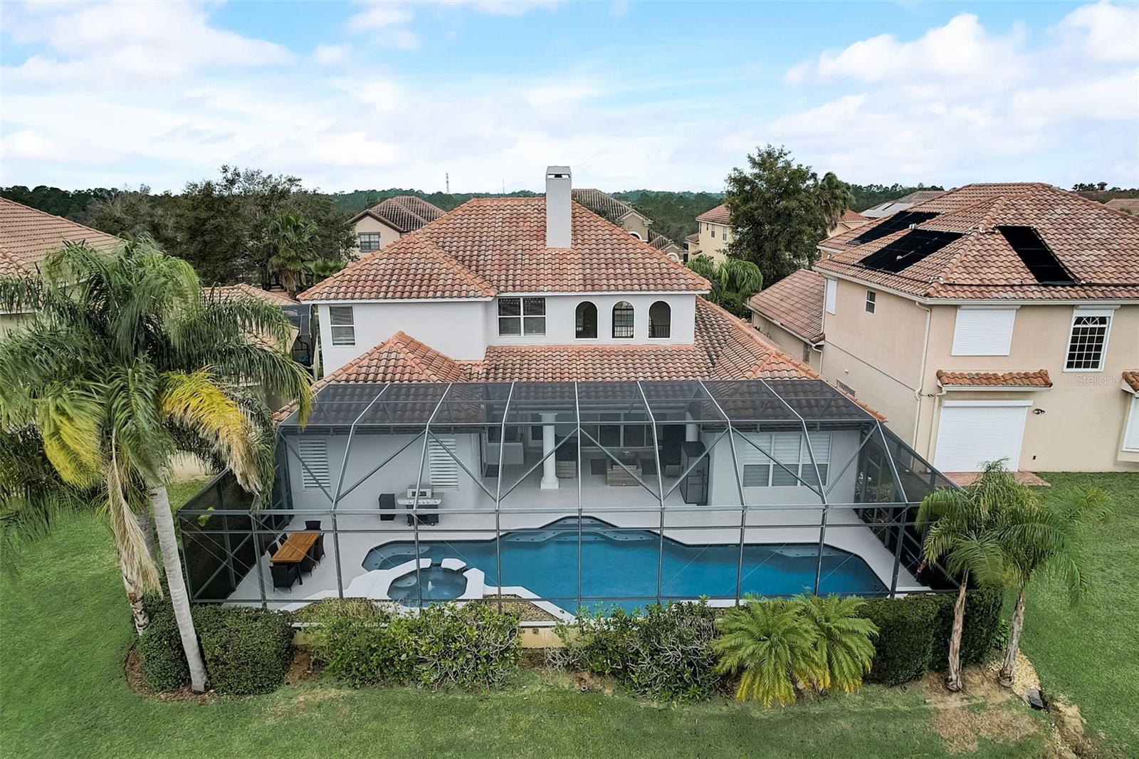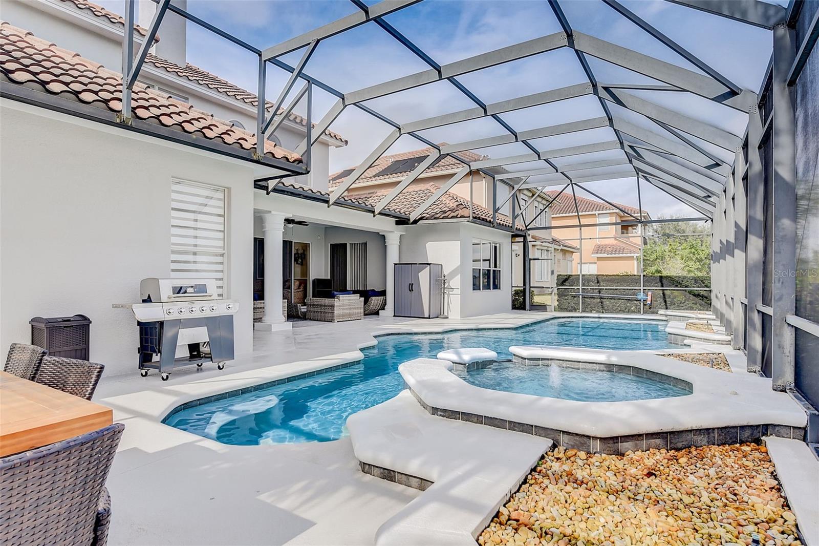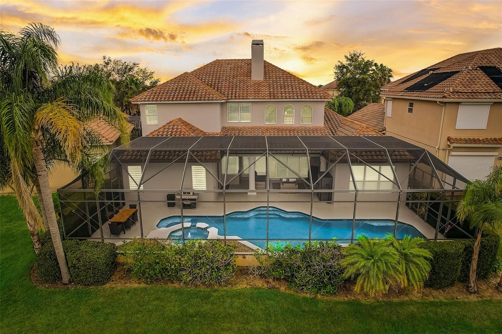 Welcome to this stunning home in the award-winning community of Providence in Davenport, Florida. This impeccably renovated 5-bedroom residence offers a luxurious living experience and an array of impressive features. Upon entering, you are greeted by new front doors and fresh interior & exterior paint, setting the tone for the elegance that awaits inside. The home boasts a spacious layout, with a theatre room and a downstairs office that can also serve as a 5th bedroom. The primary bedroom is located on the main level and occupies its own private wing, complete with double custom closets and a completely renovated bathroom featuring an oversized walk-in shower, stand-alone tub, and double vanities with beautiful waterfall countertops. Tray ceilings and LVP flooring add to the allure of the primary bedroom. The interior of the home has been thoughtfully enhanced with a host of upgrades, including new flooring throughout the first floor and stairs, new carpet in the theatre room, full interior paint, and upgraded lighting. The kitchen has been transformed with all-new quartz waterfall countertops, a farm sink, and updated appliances. It is truly a show piece of the home and adds a great place to entertain. Upstairs, there is a flex space loft that welcomes you at the top of the stairs. There are two additional bedrooms and two full bathrooms. The theatre room features tiered theatre seating and comes fully equipped for your viewing pleasure. Outside, the property offers a 3-car garage with an EV plug and new exterior paint. The landscaping and curbing have been meticulously updated, adding to the home's exceptional curb appeal. Additionally, a new pool heater has been installed, enhancing the allure of the outdoor living space. The pool area offers it's own private oasis complete with spa, oversized covered patio, and massive screen enclosure. Situated in the sought-after community of Providence, residents enjoy access to a wealth of amenities, including a 24-hour guarded gate, a zero-entry pool, a junior Olympic pool, sidewalks throughout, a clubhouse, golf course, dog park, fitness center, and tennis courts. This home represents an unparalleled opportunity to experience luxurious living in a prestigious community. Don't miss your chance to make this exquisite property your own. Schedule a showing today and prepare to be captivated by everything this home has to offer.