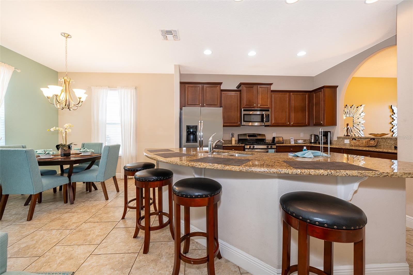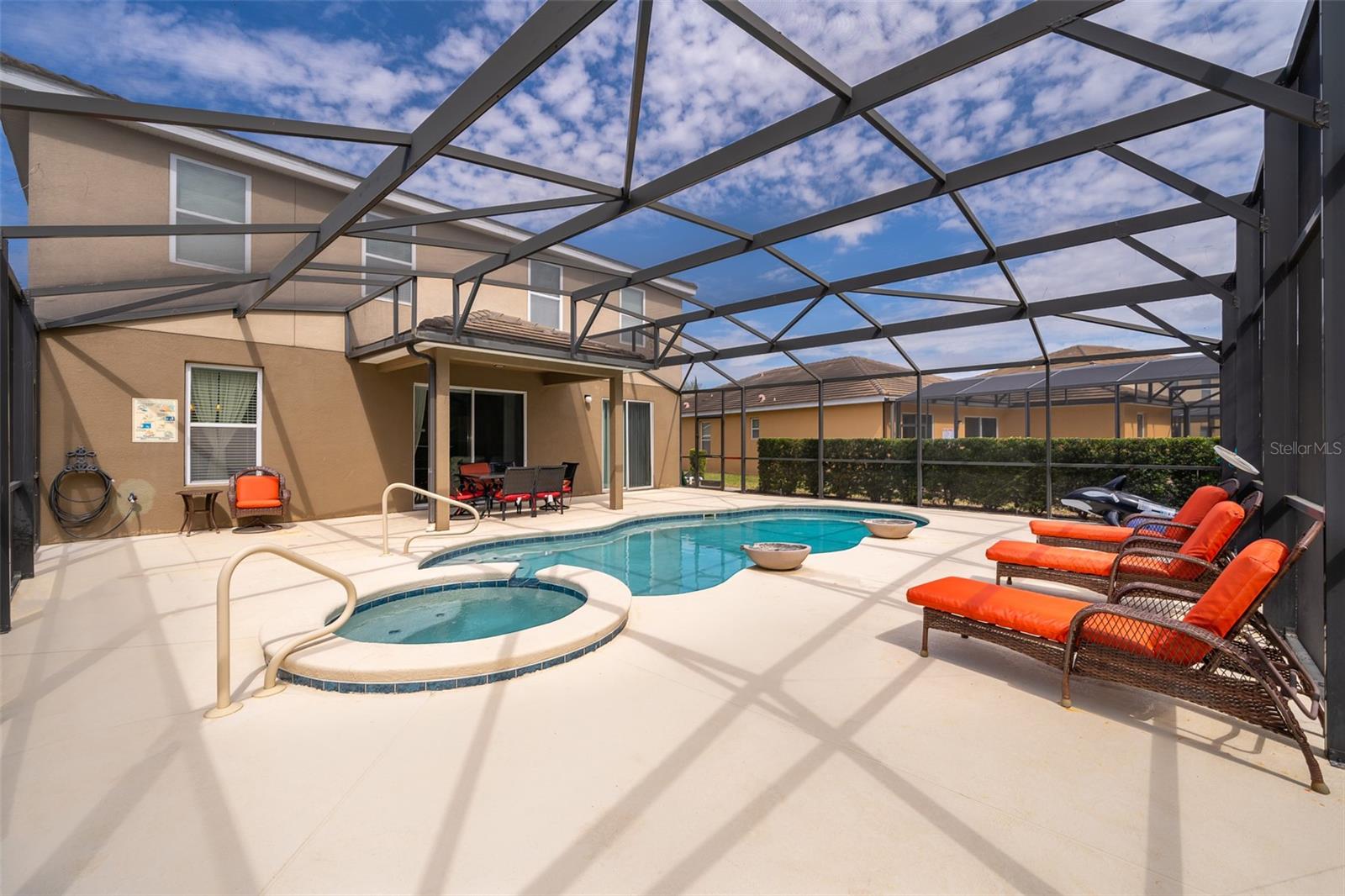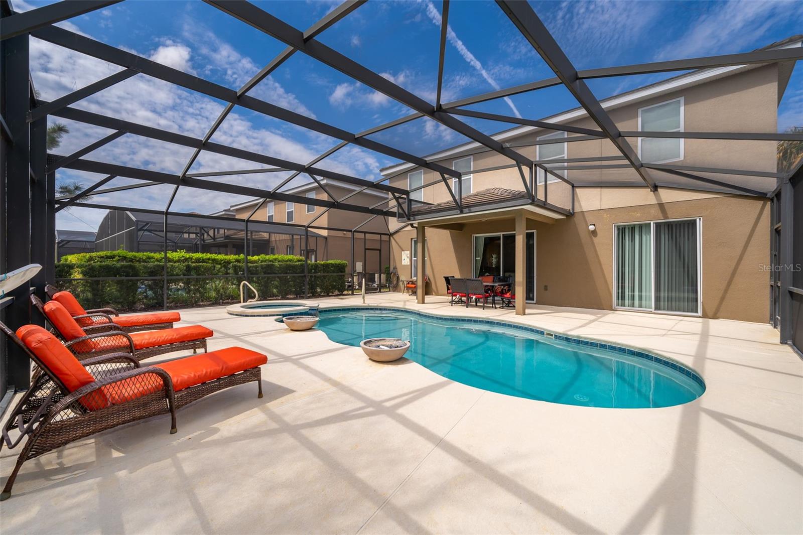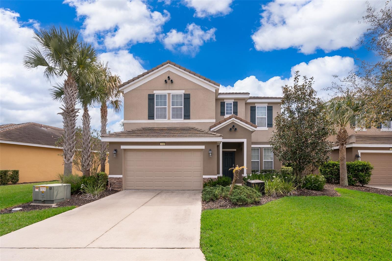 Welcome to Solterra Resort, one of Central Florida's premier vacation home communities! This fully furnished property boasts 6 bedrooms and 4.5 bathrooms, making it ideal for renters or as your own personal vacation retreat. Conveniently located within a short distance to the clubhouse and offering a private setting with no rear neighbors, this home offers the epitome of luxury living. Featuring two master suites, including one with direct pool access on the main floor, this home offers unparalleled convenience and comfort. The spacious kitchen is equipped with beautiful granite countertops, stainless steel appliances, a large island, and a pantry, perfect for entertaining guests. The open-plan living area, complete with sliding glass doors leading to the pool area, provides a welcoming space for gatherings. Upstairs, a loft serves as a second family room, while the remaining five bedrooms offer ample accommodation for guests. A second master suite with an ensuite bathroom and walk-in closet is ideal if you have two sets of adults. Solterra Resort offers a wealth of community amenities, including a clubhouse, resort-style pool, hot tub, fitness room, lazy river, tennis and volleyball courts, playground, and recreational areas. Residents can also enjoy a poolside café and various walking, jogging, and running trails. Don't miss out on the opportunity to make this stunning property your next home or investment!