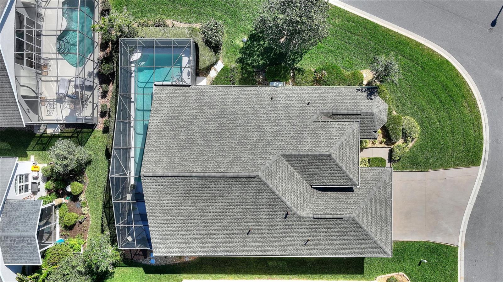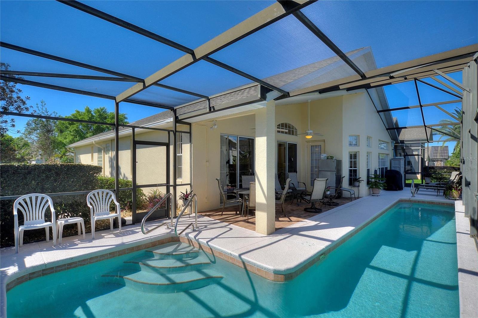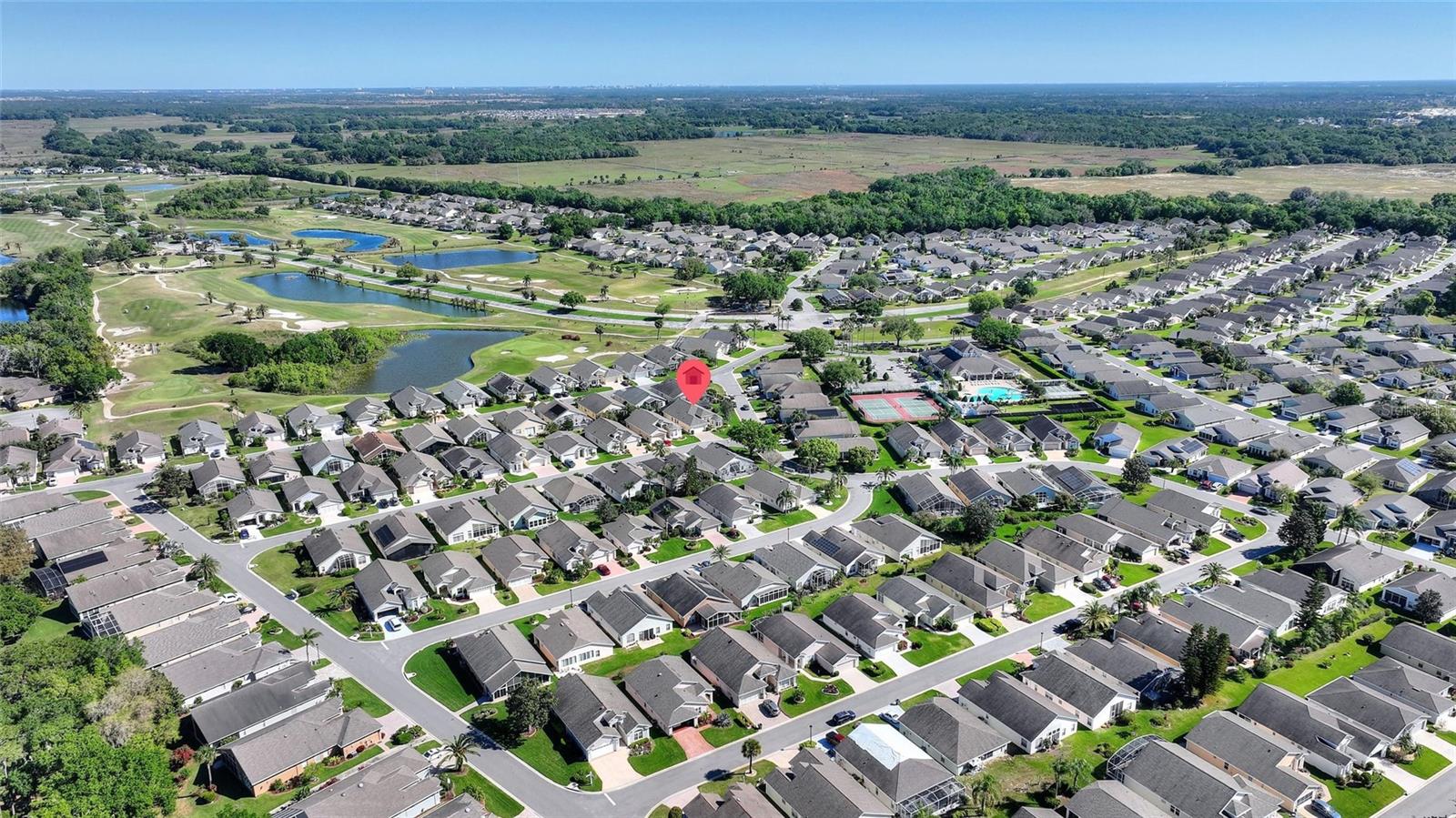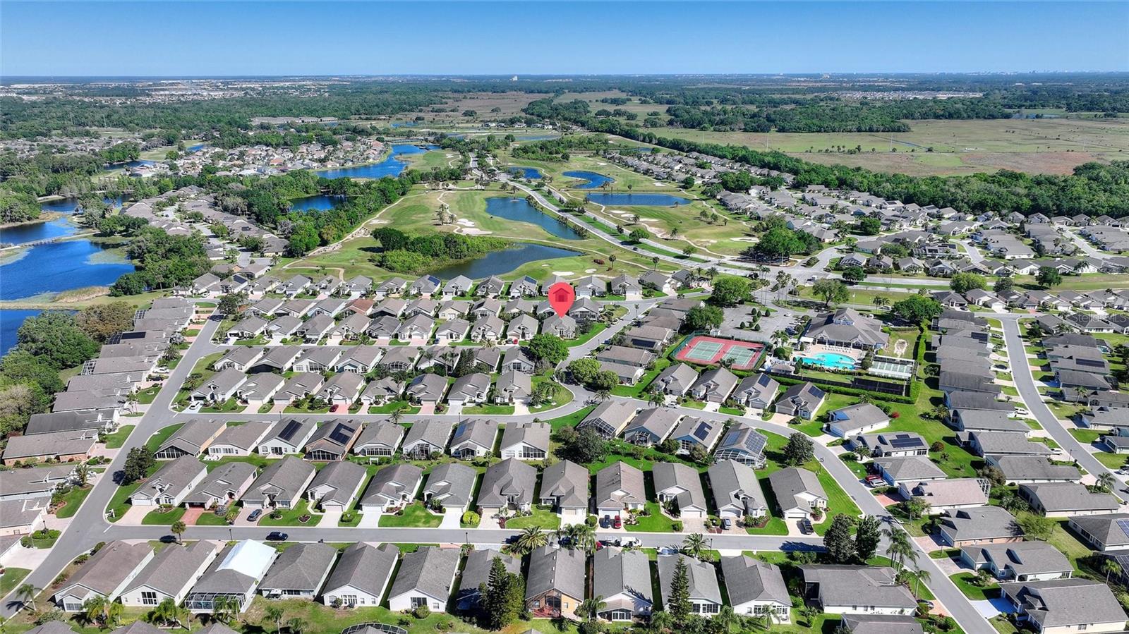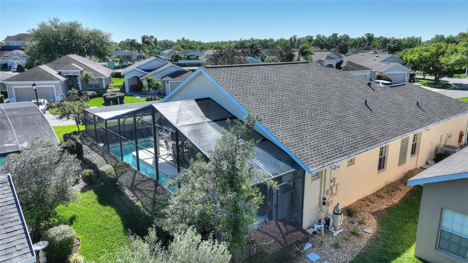 RidgeBrook 3/2/Den model on Corner Lot with New Roof in 2024, 22kW Generac Whole-House Generator, Solid Surface Floors, Tankless Hot Water Heater and a 950+ SF North-Facing Screened Lanai with Saltwater Pool, located 0.1 miles from High Vista's private clubhouse and amenity center. Expanded driveway and walkway to an under-roof front entry with 8 FT Pella double front doors. Central great room with 12 FT ceilings and triple patio doors to pool deck. Cozy family room with custom California Closets built-in entertainment center and extended tray ceiling over dinette area. Galley kitchen has 42” cabinets upper cabinets with end-caps and under-lighting, Corian countertops, dovetailed drawers, ceramic tile backsplash, rollout out drawers in lower cabinets and stainless-steel appliances. Primary en suite bedroom has custom California Closets in the bathroom and the 6x4 lighted walk-in closet, patio door to pool deck, tray ceiling, built-in closet and an expansive bathroom with updated level-entry shower. Split bedroom design offers privacy to guests with a full bath and linen closet between 2 guest bedrooms with extra storage shelves in both closets. Bay window in front Den. California Closets custom built-in cabinets in laundry. Lighted L-shaped exercise pool with depths of 3-5 FT has corner waterfall. Garage has electric rolling screen door, utility sink, 5 installed overhead racks for storage and pull-down ladder access to attic with some flooring. 500 gallon buried propane tank for generator. Roof replaced 2024. Exterior painted 2023. Tankless hot water heater (2020), generator (2015), HVAC (2013) serviced annually. 3 wall-mounted TVs are included in sale. Select furnishings available for sale separately. Sold As-Is. Ridgewood Lakes is a golf cart friendly community. $230 monthly High Vista HOA fee includes Spectrum internet and basic cable TV with 2 cable boxes, lawn mowing and exclusive access to resident-owned 12,000 SF private clubhouse and amenities. $425 semi-annual Ridgewood Lakes HOA fee provides 24x7 staffed security gate and master association-owned private road maintenance. Adjacent to 18-hole White Heron Golf Club with restaurant, privately owned and open to the public. High Vista is a 55+ community with outdoor heated pool and spa, fitness center, library, pub & many organized activities. Pickle ball, tennis, bocce and shuffleboard courts. Miles of biking and walking trails within Ridgewood Lakes gated community. Shopping, Disney, Universal, Orlando & Central FL entertainment nearby, easy access to I-4, medical facilities, airports & Sunrail Station. Advent Health hospital is 3 miles away.