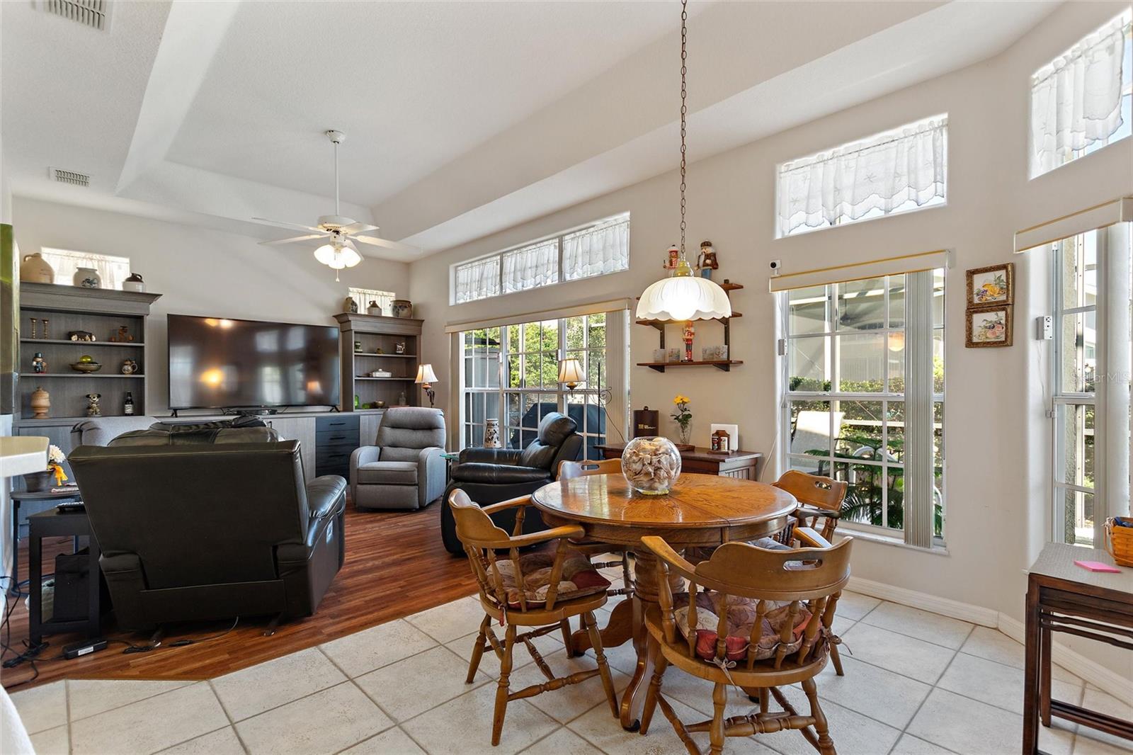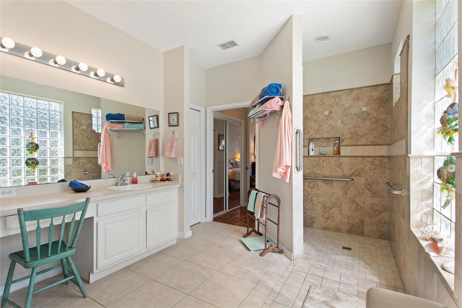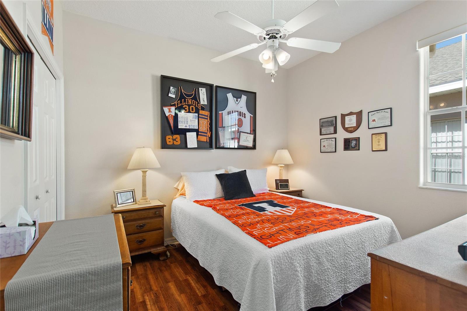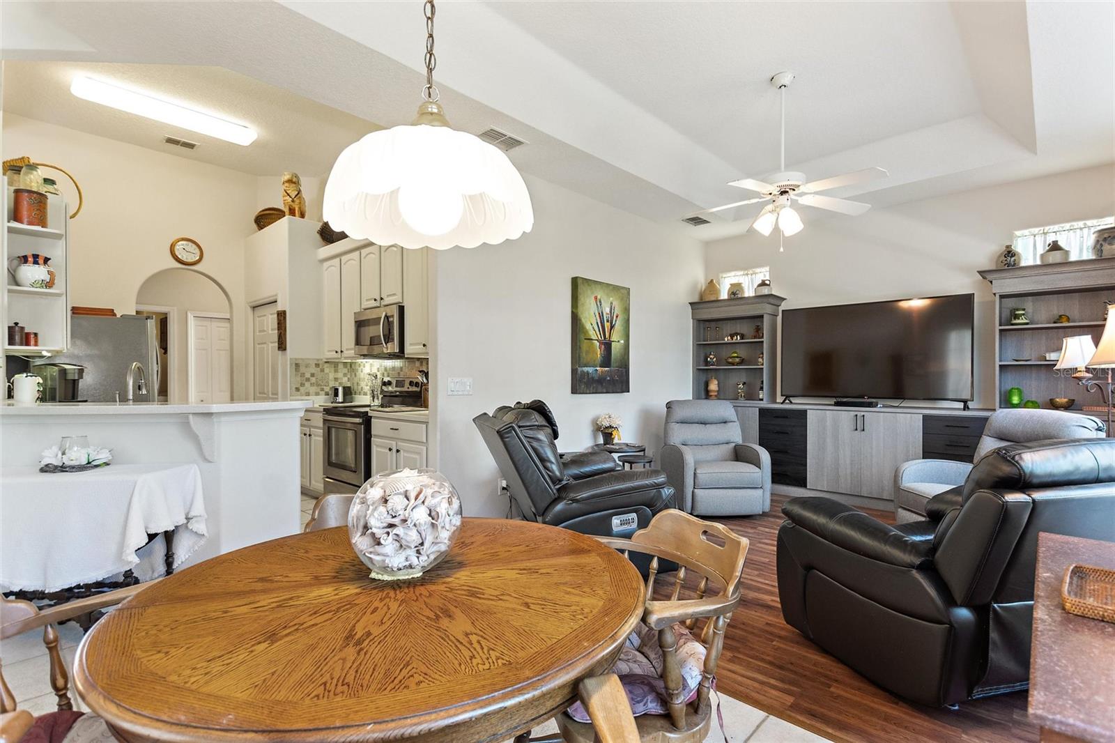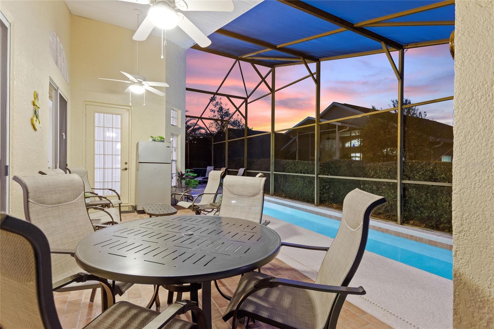 RidgeBrook 3/2/Den model on Corner Lot with New Roof in 2024, 22kW Generac Whole-House Generator, Solid Surface Floors, Tankless Hot Water Heater and a 950+ SF North-Facing Screened Lanai with Saltwater Pool, located 0.1 miles from High Vista's private clubhouse and amenity center. Expanded driveway and walkway to an under-roof front entry with 8 FT Pella double front doors. Central great room with 12 FT ceilings and triple patio doors to pool deck. Cozy family room with custom California Closets built-in entertainment center and extended tray ceiling over dinette area. Galley kitchen has 42” cabinets upper cabinets with end-caps and under-lighting, Corian countertops, dovetailed drawers, ceramic tile backsplash, rollout out drawers in lower cabinets and stainless-steel appliances. Primary en suite bedroom has custom California Closets in the bathroom and the 6x4 lighted walk-in closet, patio door to pool deck, tray ceiling, built-in closet and an expansive bathroom with updated level-entry shower. Split bedroom design offers privacy to guests with a full bath and linen closet between 2 guest bedrooms with extra storage shelves in both closets. Bay window in front Den. California Closets custom built-in cabinets in laundry. Lighted L-shaped exercise pool with depths of 3-5 FT has corner waterfall. Garage has electric rolling screen door, utility sink, 5 installed overhead racks for storage and pull-down ladder access to attic with some flooring. 500 gallon buried propane tank for generator. Roof replaced 2024. Exterior painted 2023. Tankless hot water heater (2020), generator (2015), HVAC (2013) serviced annually. 3 wall-mounted TVs are included in sale. Select furnishings available for sale separately. Sold As-Is. Ridgewood Lakes is a golf cart friendly community. $230 monthly High Vista HOA fee includes Spectrum internet and basic cable TV with 2 cable boxes, lawn mowing and exclusive access to resident-owned 12,000 SF private clubhouse and amenities. $425 semi-annual Ridgewood Lakes HOA fee provides 24x7 staffed security gate and master association-owned private road maintenance. Adjacent to 18-hole White Heron Golf Club with restaurant, privately owned and open to the public. High Vista is a 55+ community with outdoor heated pool and spa, fitness center, library, pub & many organized activities. Pickle ball, tennis, bocce and shuffleboard courts. Miles of biking and walking trails within Ridgewood Lakes gated community. Shopping, Disney, Universal, Orlando & Central FL entertainment nearby, easy access to I-4, medical facilities, airports & Sunrail Station. Advent Health hospital is 3 miles away.