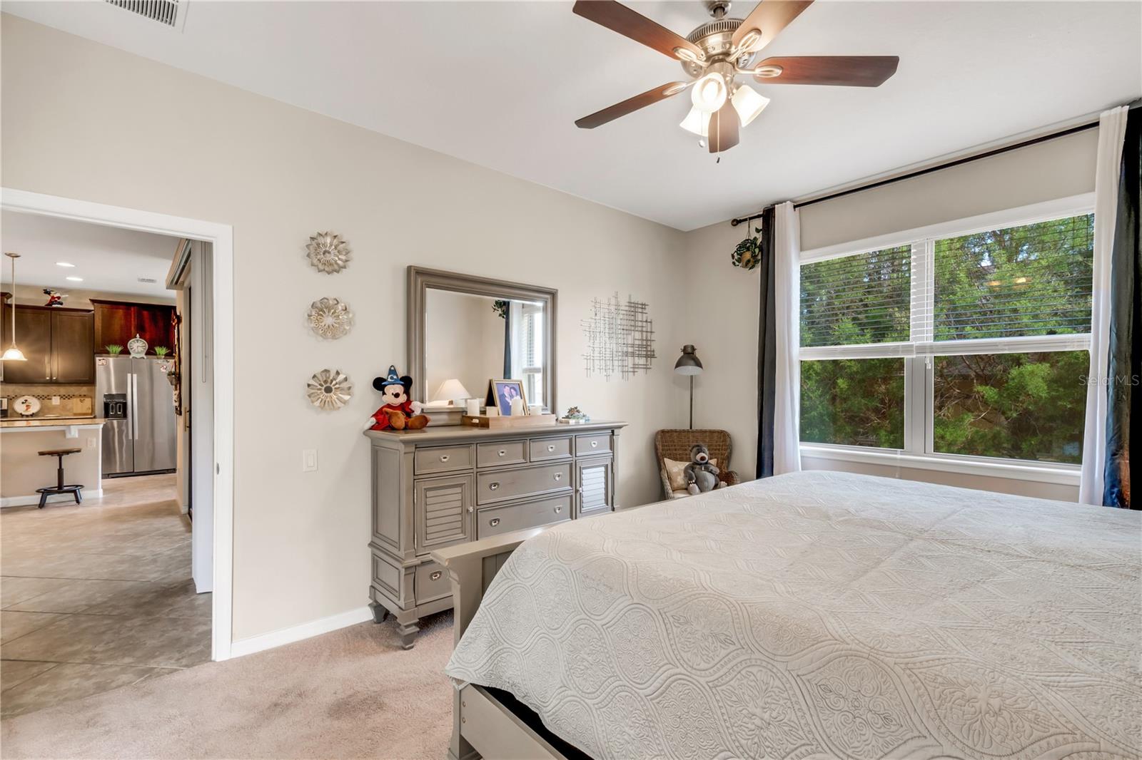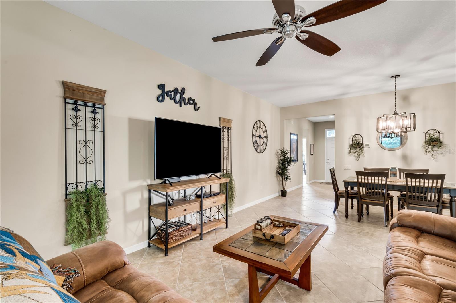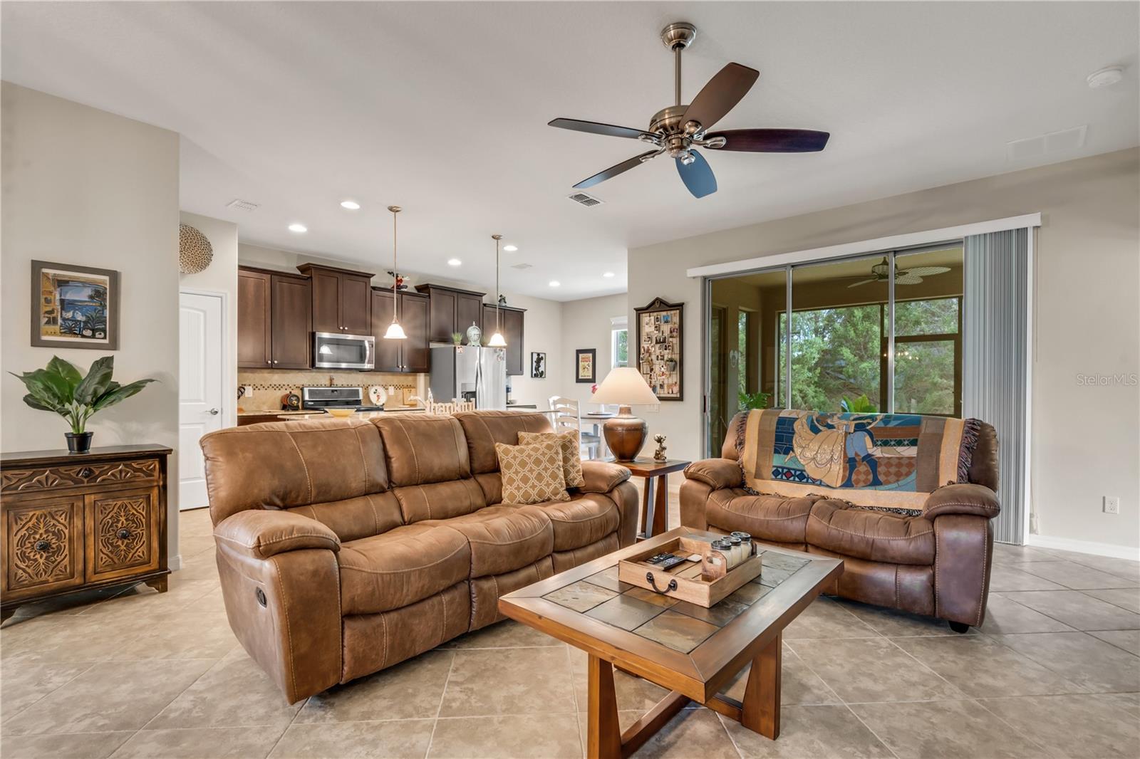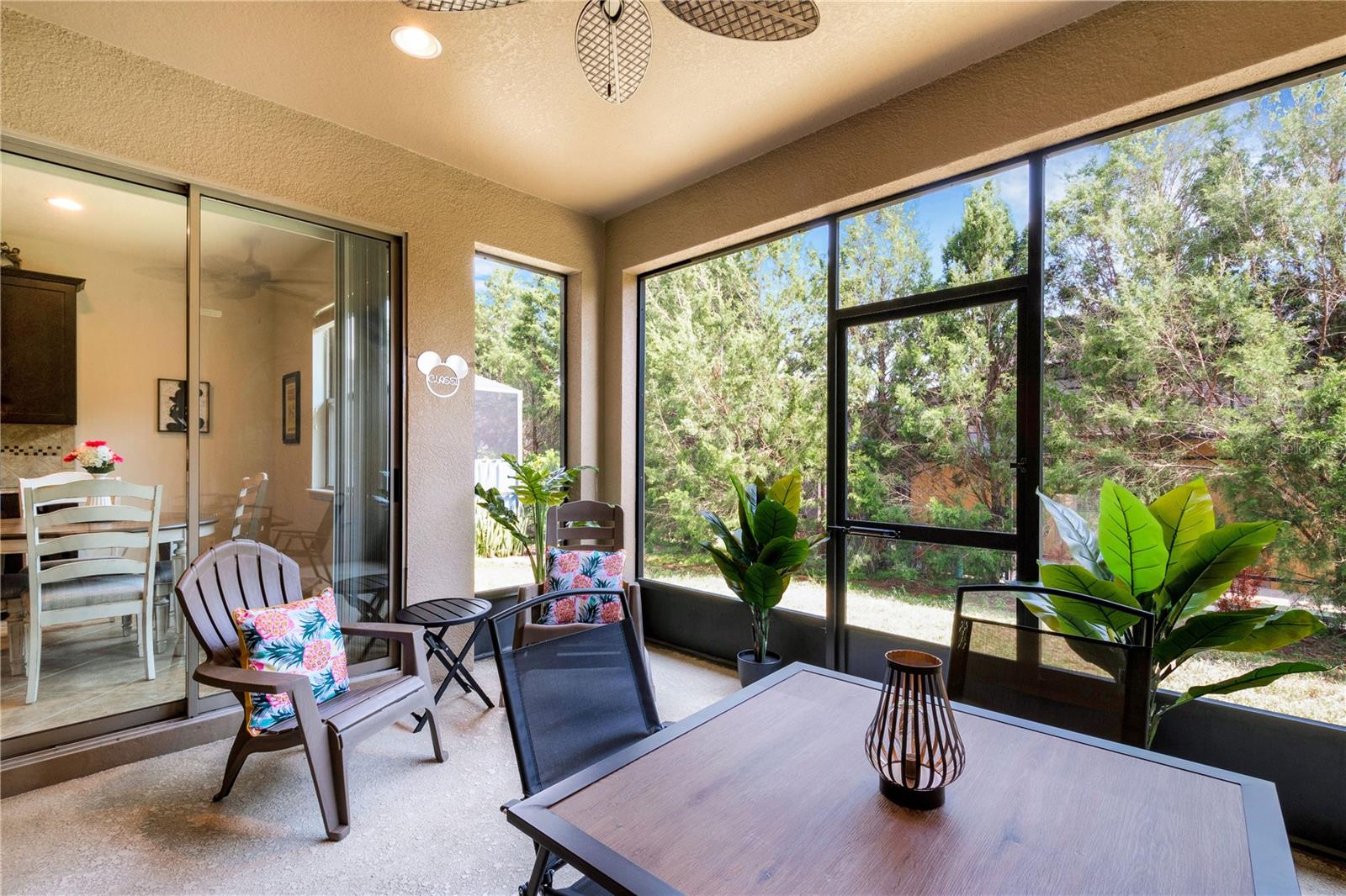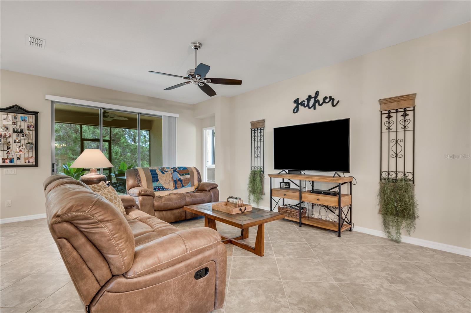 Welcome to Del Webb Orlando, a beautiful 55+ community inside the guard gates of Ridgewood Lakes. This home is the popular Vernon Hill floor plan with 3 bedrooms, 2 bathrooms, plus a den/office. The bedrooms all have ceiling fans for comfort. The open floor plan has the dining room, great room, and kitchen all adjacent to each other yet arranged comfortably. There is a kitchen nook for informal eating. The primary bedroom is towards the back and has a large bathroom and a large walk in closet attached. The room is large enough for a king bed. The primary bathroom has a shower and separate tub along with dual sinks. Out back is a screened in lanai for sitting and enjoying the sunsets. The hedges behind were recently planted and will continue to grow and provide privacy. The garage has the 4 ft extension providing extra room. This home is located very close to the clubhouse and all the amenities. Inside the clubhouse you'll find a library of books and movies, a full gym, indoor pool and spa, his and her locker rooms, craft rooms, ball rooms, and a tavern for enjoying food, drink, entertainment as well as visiting with friends. Outside you'll find pickleball, tennis, basketball, bocce ball, shuffleboard, a park for the little guests, another park for the 4 legged residents(dog park), and plenty of miles to walk, bike, or cruise in the golf cart. Speaking of golf, inside this gated community is the White Heron Golf course. Enjoy golf as much as you want without leaving the gates. All this and so close to shopping, Disney, Universal, Sea World, and medical facilities.