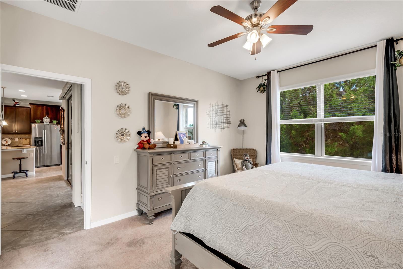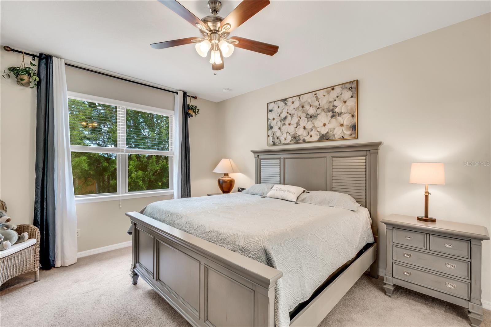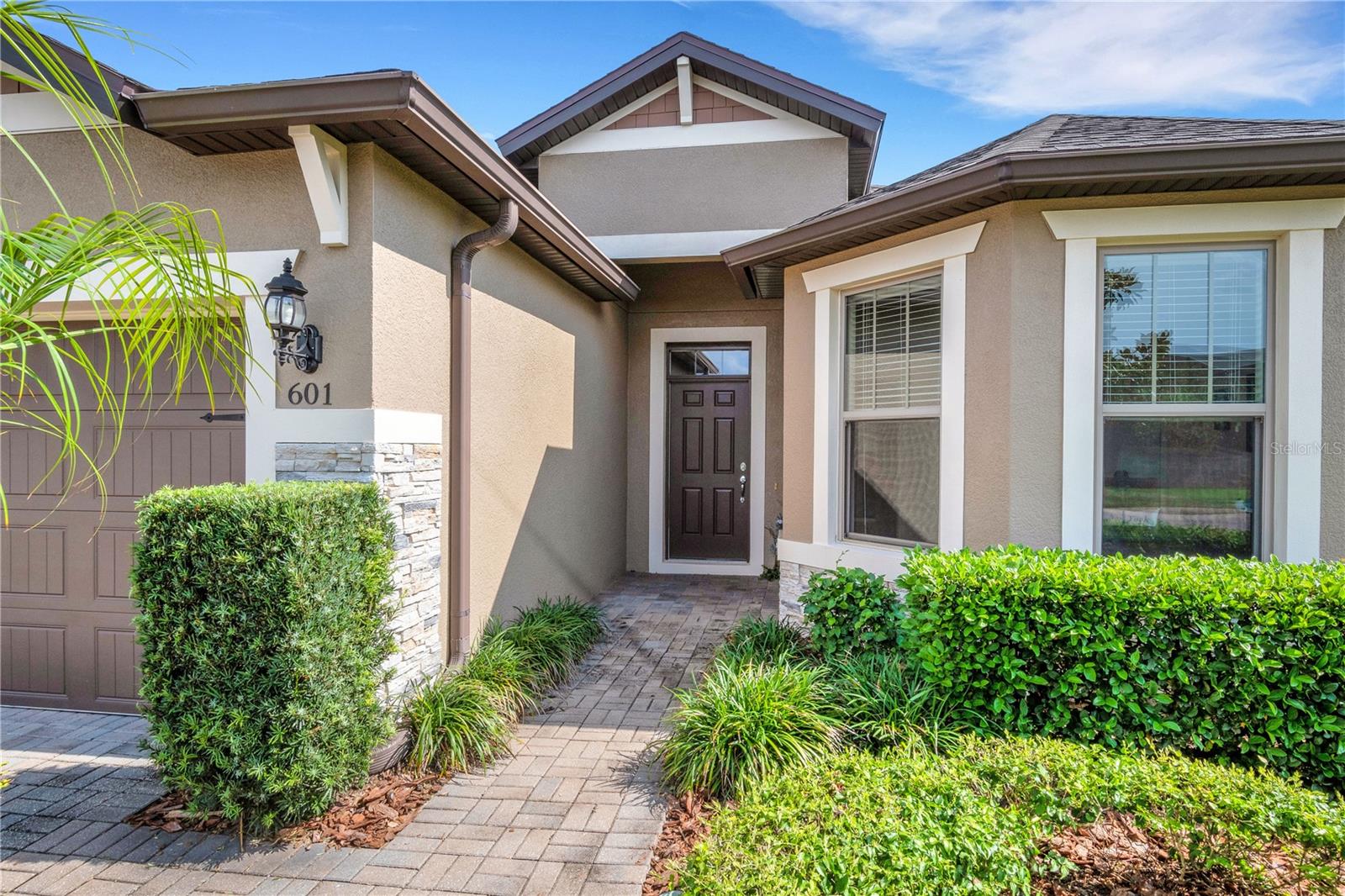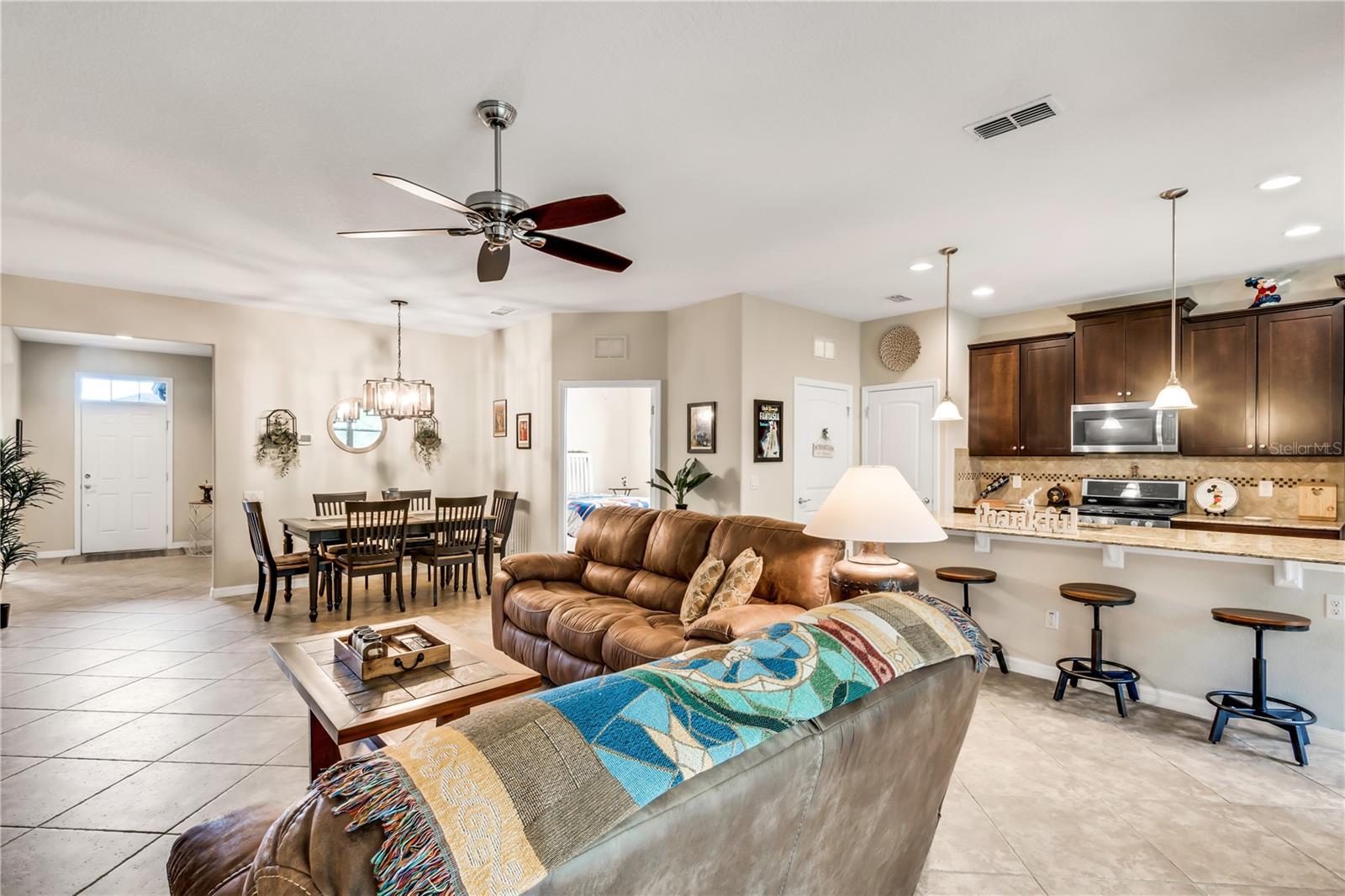 Welcome to Del Webb Orlando, a beautiful 55+ community inside the guard gates of Ridgewood Lakes. This home is the popular Vernon Hill floor plan with 3 bedrooms, 2 bathrooms, plus a den/office. The bedrooms all have ceiling fans for comfort. The open floor plan has the dining room, great room, and kitchen all adjacent to each other yet arranged comfortably. There is a kitchen nook for informal eating. The primary bedroom is towards the back and has a large bathroom and a large walk in closet attached. The room is large enough for a king bed. The primary bathroom has a shower and separate tub along with dual sinks. Out back is a screened in lanai for sitting and enjoying the sunsets. The hedges behind were recently planted and will continue to grow and provide privacy. The garage has the 4 ft extension providing extra room. This home is located very close to the clubhouse and all the amenities. Inside the clubhouse you'll find a library of books and movies, a full gym, indoor pool and spa, his and her locker rooms, craft rooms, ball rooms, and a tavern for enjoying food, drink, entertainment as well as visiting with friends. Outside you'll find pickleball, tennis, basketball, bocce ball, shuffleboard, a park for the little guests, another park for the 4 legged residents(dog park), and plenty of miles to walk, bike, or cruise in the golf cart. Speaking of golf, inside this gated community is the White Heron Golf course. Enjoy golf as much as you want without leaving the gates. All this and so close to shopping, Disney, Universal, Sea World, and medical facilities.