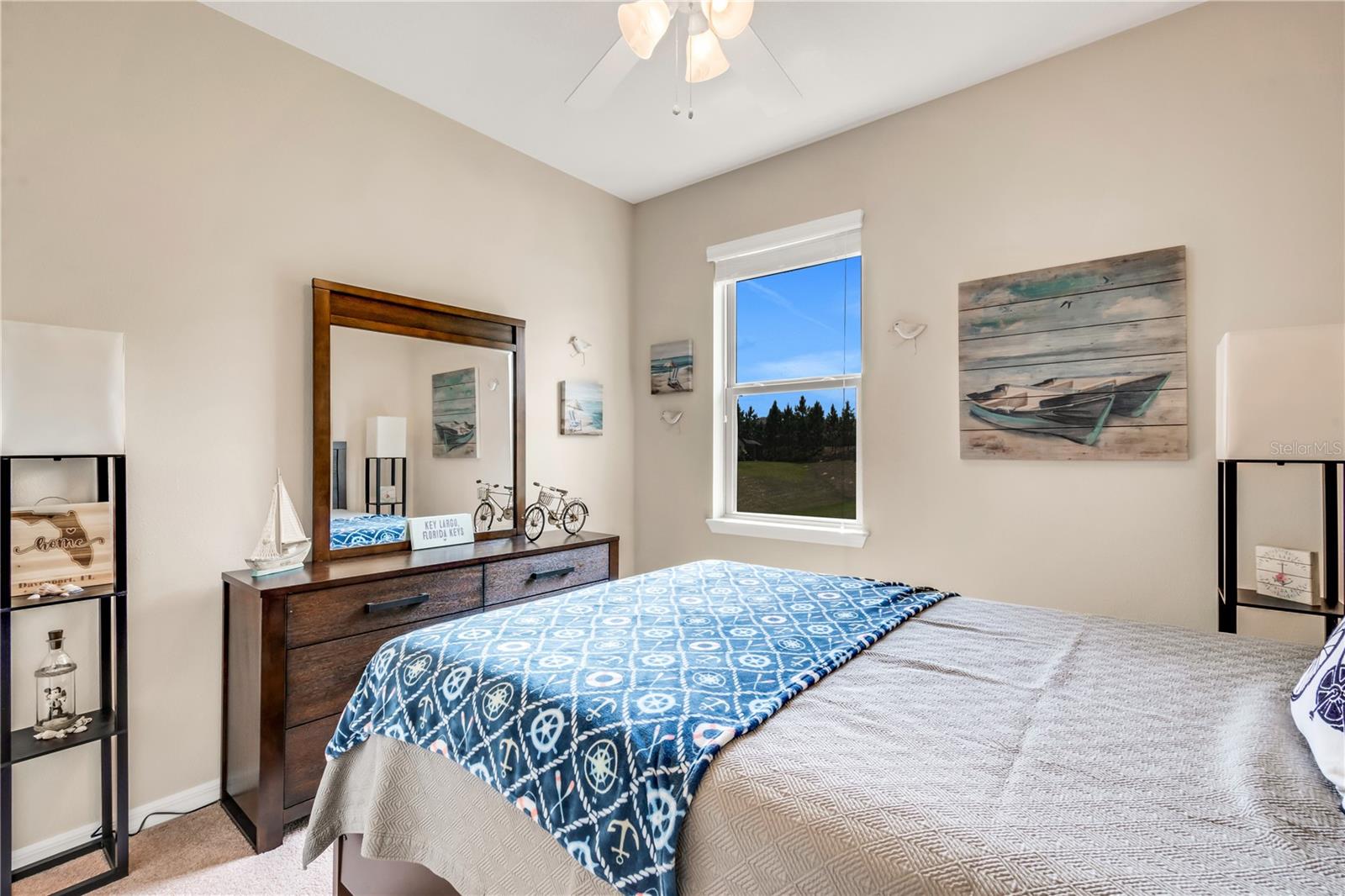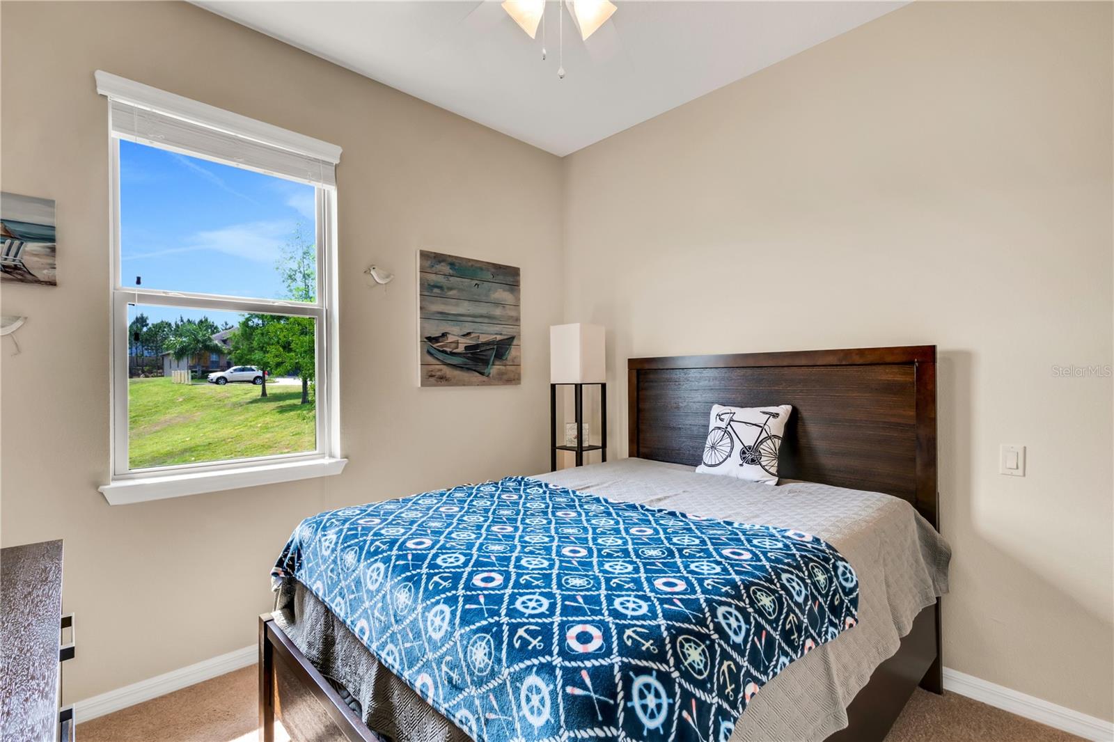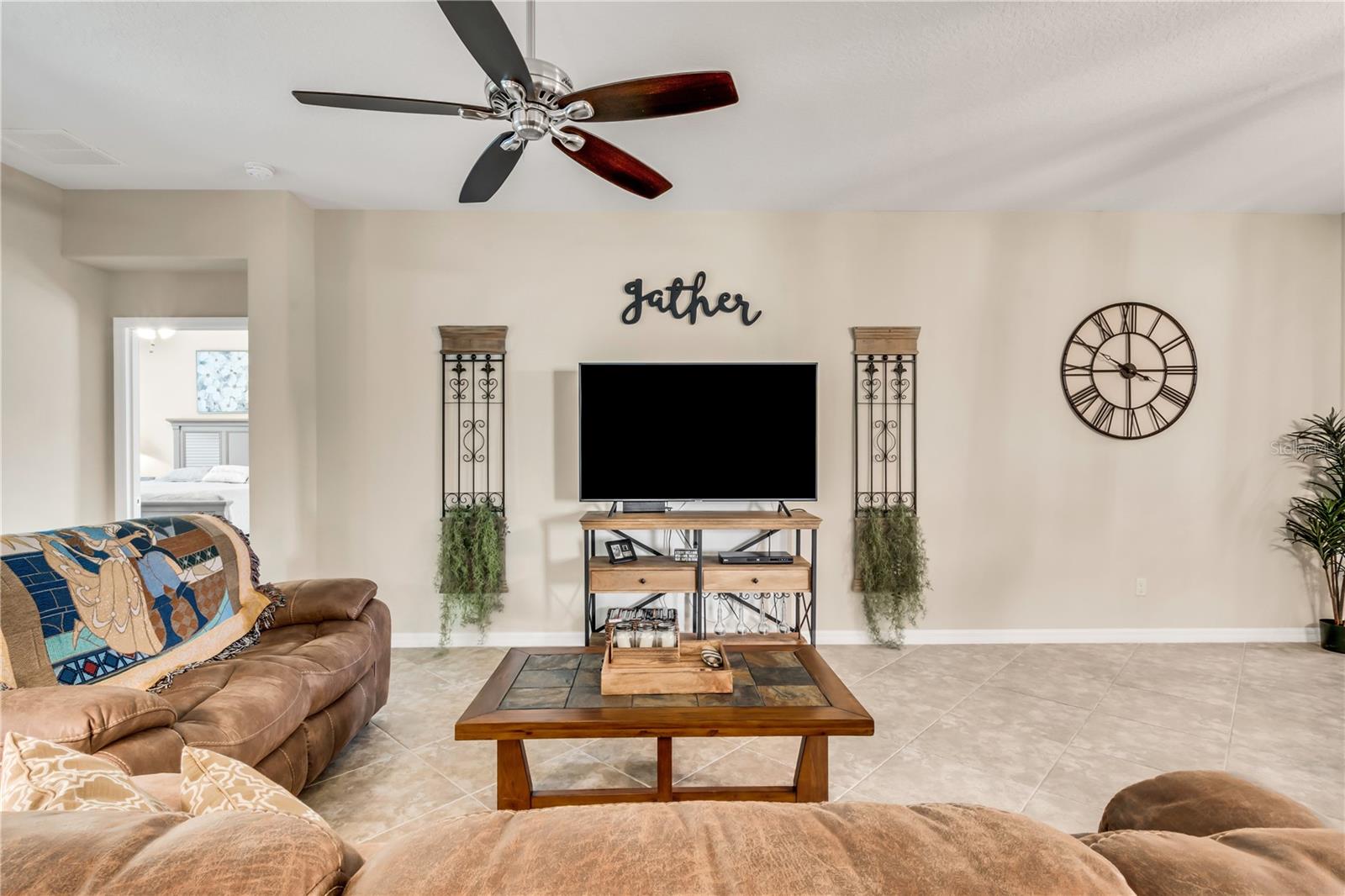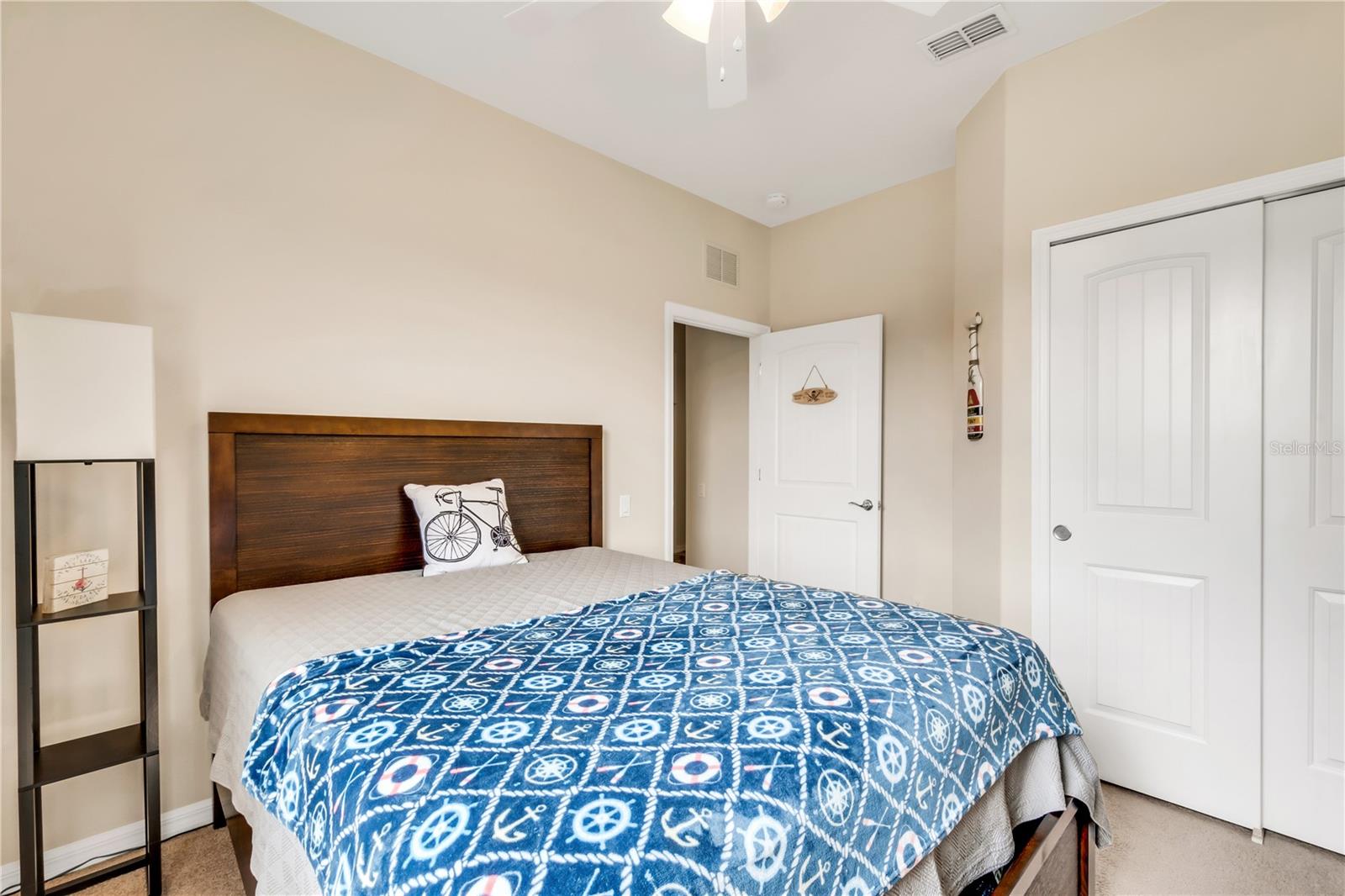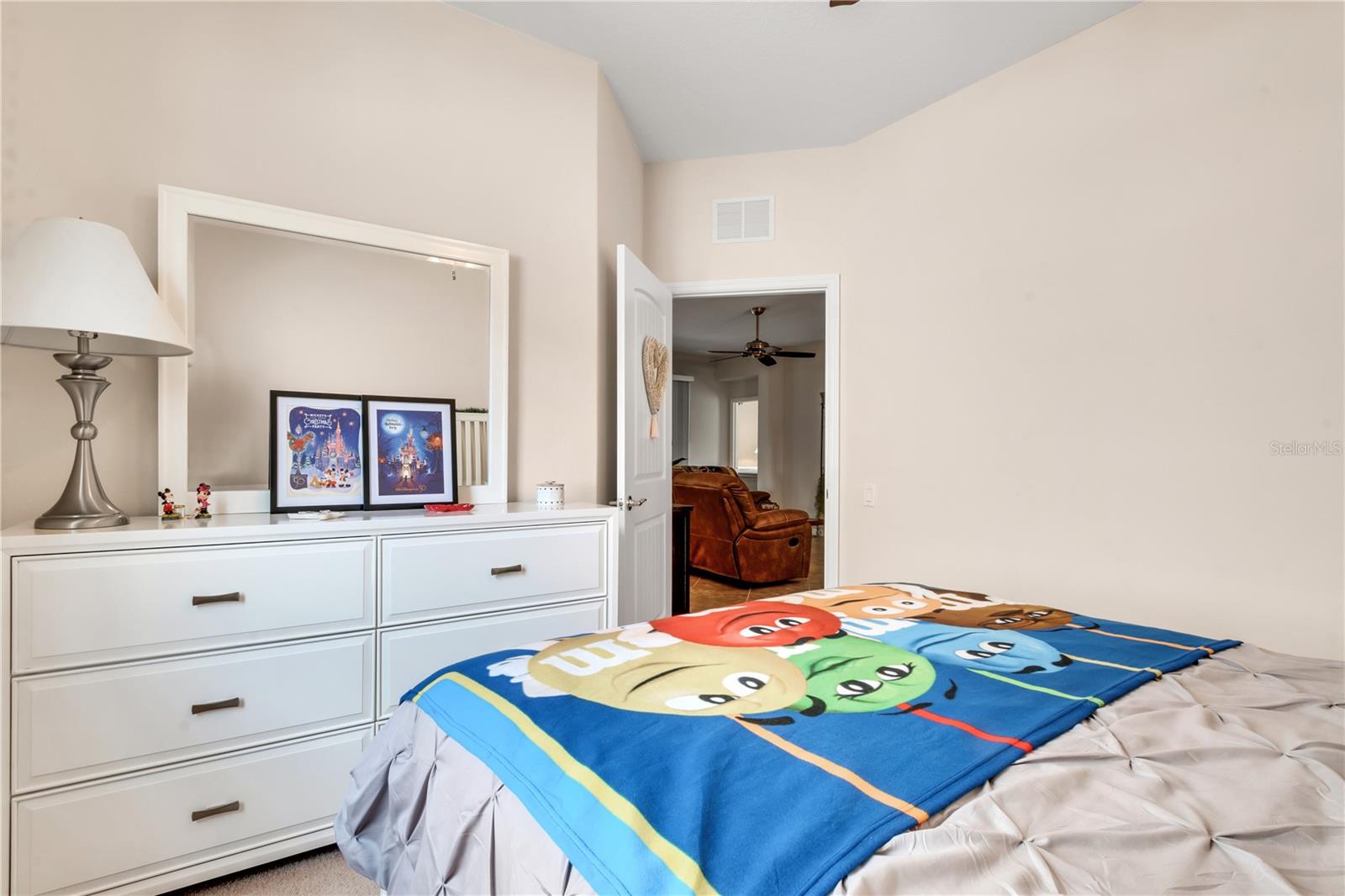 Welcome to Del Webb Orlando, a beautiful 55+ community inside the guard gates of Ridgewood Lakes. This home is the popular Vernon Hill floor plan with 3 bedrooms, 2 bathrooms, plus a den/office. The bedrooms all have ceiling fans for comfort. The open floor plan has the dining room, great room, and kitchen all adjacent to each other yet arranged comfortably. There is a kitchen nook for informal eating. The primary bedroom is towards the back and has a large bathroom and a large walk in closet attached. The room is large enough for a king bed. The primary bathroom has a shower and separate tub along with dual sinks. Out back is a screened in lanai for sitting and enjoying the sunsets. The hedges behind were recently planted and will continue to grow and provide privacy. The garage has the 4 ft extension providing extra room. This home is located very close to the clubhouse and all the amenities. Inside the clubhouse you'll find a library of books and movies, a full gym, indoor pool and spa, his and her locker rooms, craft rooms, ball rooms, and a tavern for enjoying food, drink, entertainment as well as visiting with friends. Outside you'll find pickleball, tennis, basketball, bocce ball, shuffleboard, a park for the little guests, another park for the 4 legged residents(dog park), and plenty of miles to walk, bike, or cruise in the golf cart. Speaking of golf, inside this gated community is the White Heron Golf course. Enjoy golf as much as you want without leaving the gates. All this and so close to shopping, Disney, Universal, Sea World, and medical facilities.