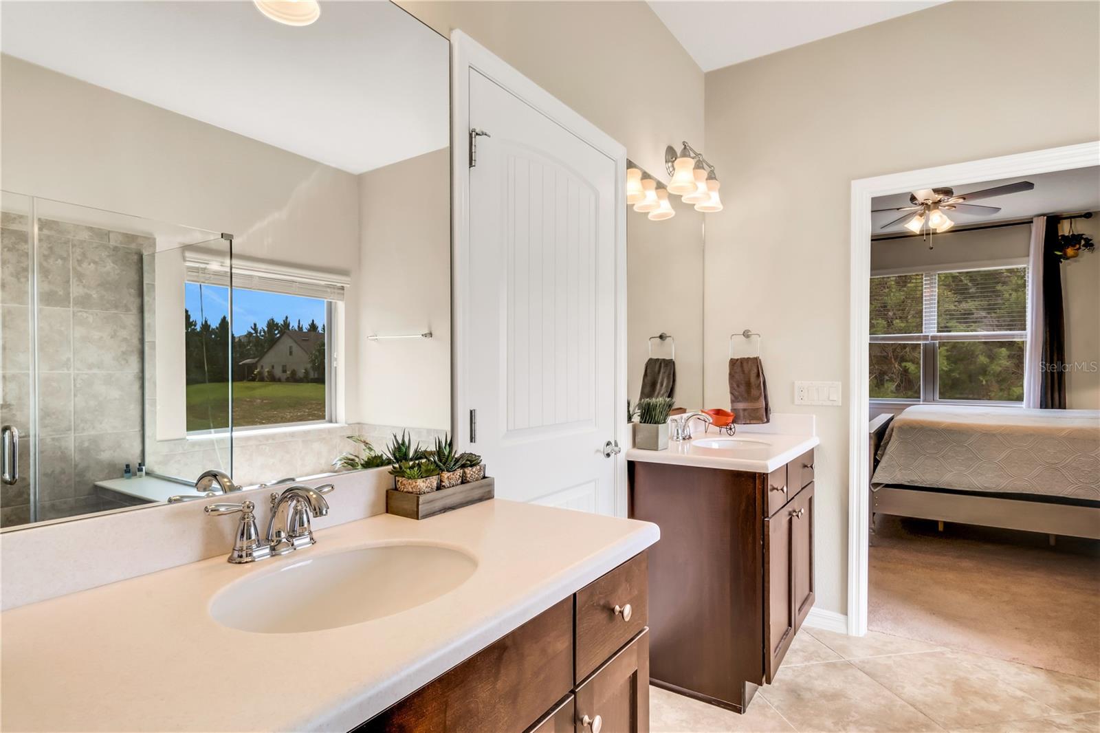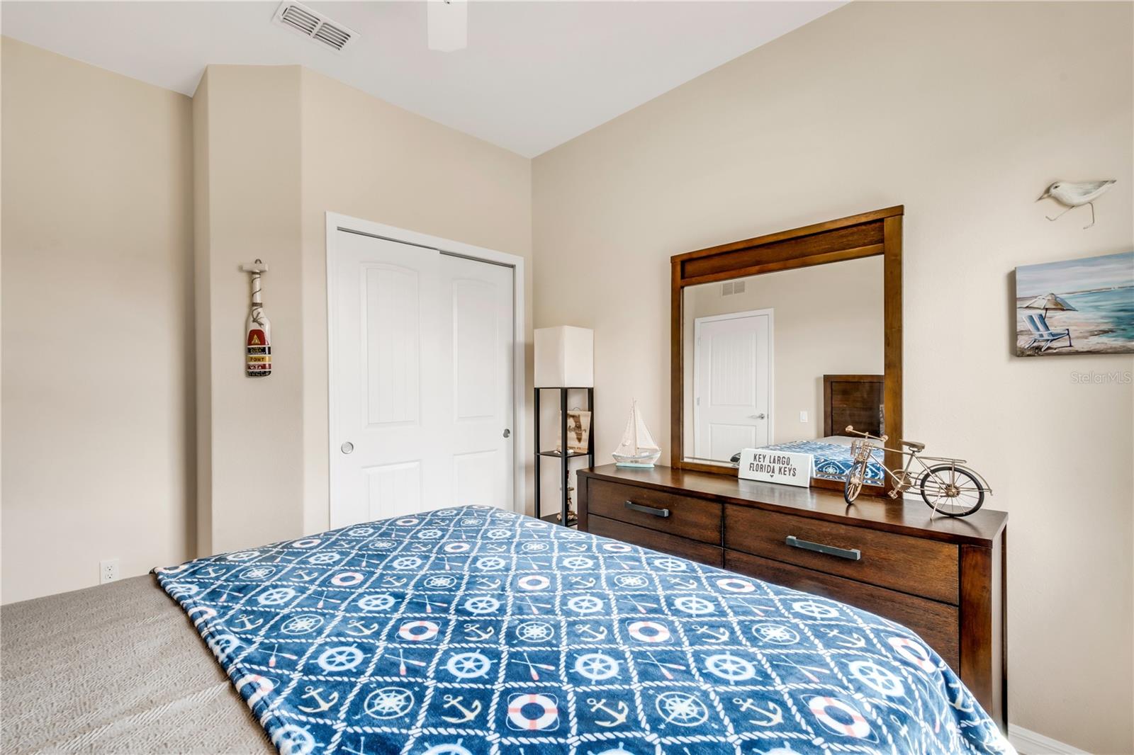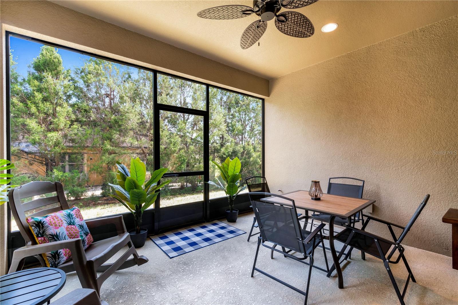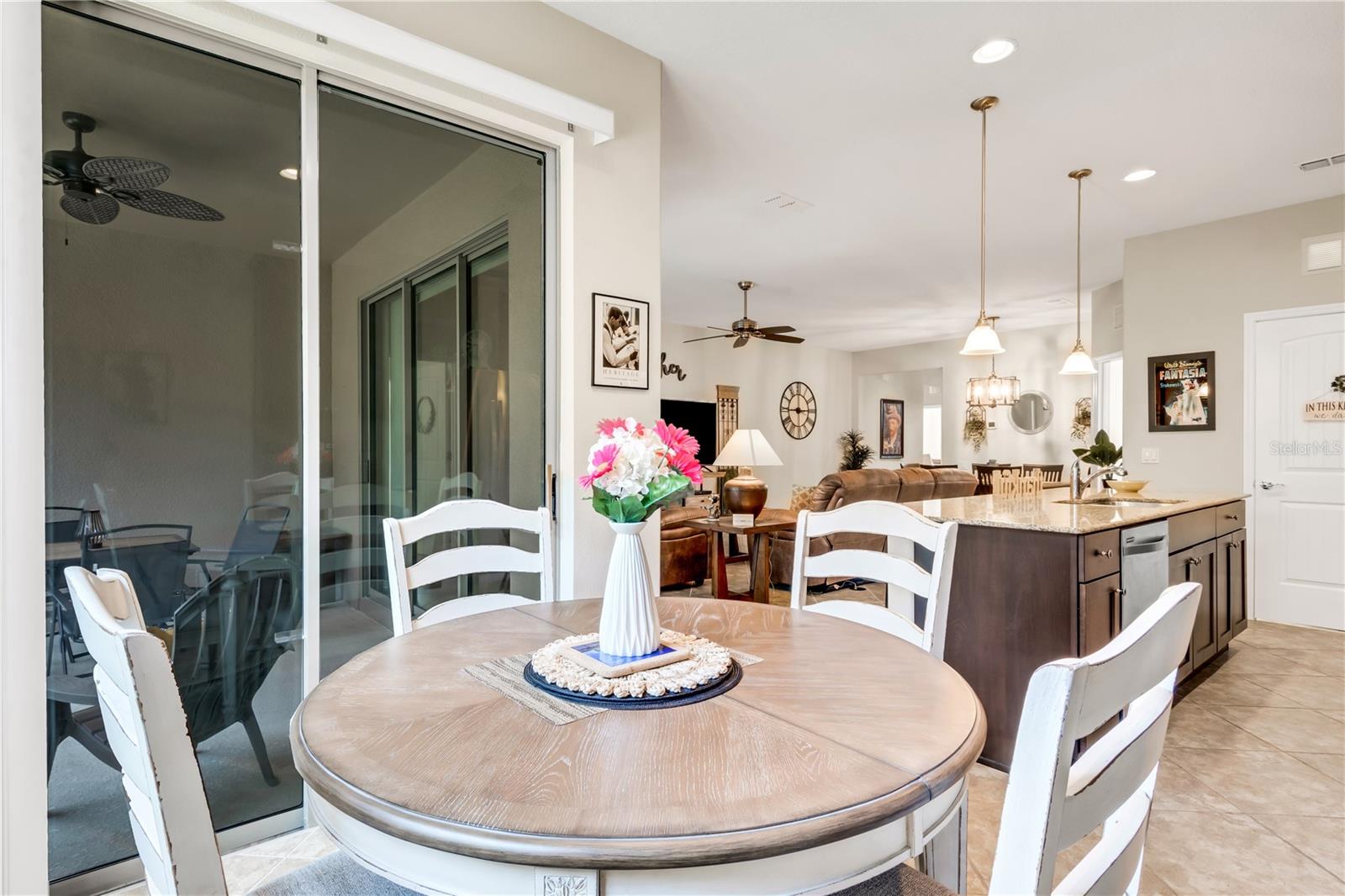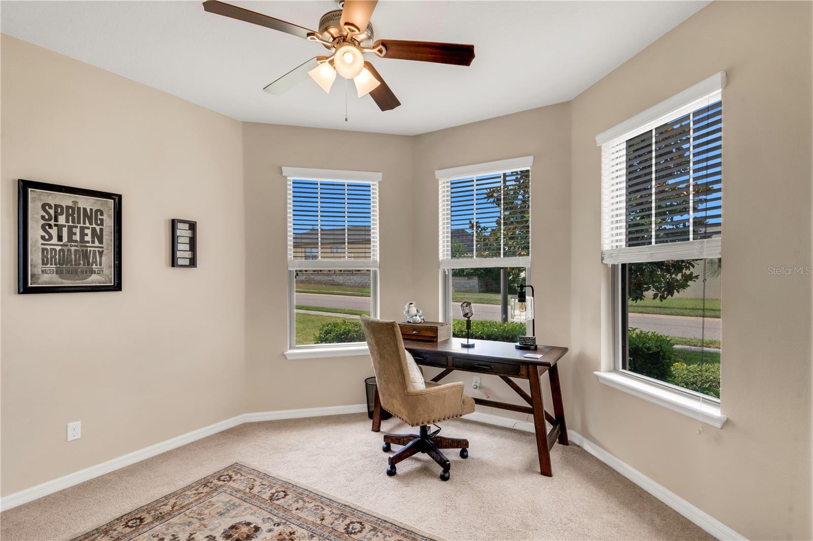 Welcome to Del Webb Orlando, a beautiful 55+ community inside the guard gates of Ridgewood Lakes. This home is the popular Vernon Hill floor plan with 3 bedrooms, 2 bathrooms, plus a den/office. The bedrooms all have ceiling fans for comfort. The open floor plan has the dining room, great room, and kitchen all adjacent to each other yet arranged comfortably. There is a kitchen nook for informal eating. The primary bedroom is towards the back and has a large bathroom and a large walk in closet attached. The room is large enough for a king bed. The primary bathroom has a shower and separate tub along with dual sinks. Out back is a screened in lanai for sitting and enjoying the sunsets. The hedges behind were recently planted and will continue to grow and provide privacy. The garage has the 4 ft extension providing extra room. This home is located very close to the clubhouse and all the amenities. Inside the clubhouse you'll find a library of books and movies, a full gym, indoor pool and spa, his and her locker rooms, craft rooms, ball rooms, and a tavern for enjoying food, drink, entertainment as well as visiting with friends. Outside you'll find pickleball, tennis, basketball, bocce ball, shuffleboard, a park for the little guests, another park for the 4 legged residents(dog park), and plenty of miles to walk, bike, or cruise in the golf cart. Speaking of golf, inside this gated community is the White Heron Golf course. Enjoy golf as much as you want without leaving the gates. All this and so close to shopping, Disney, Universal, Sea World, and medical facilities.