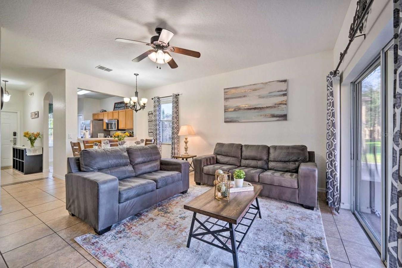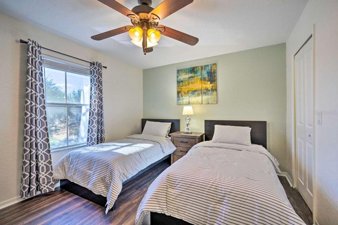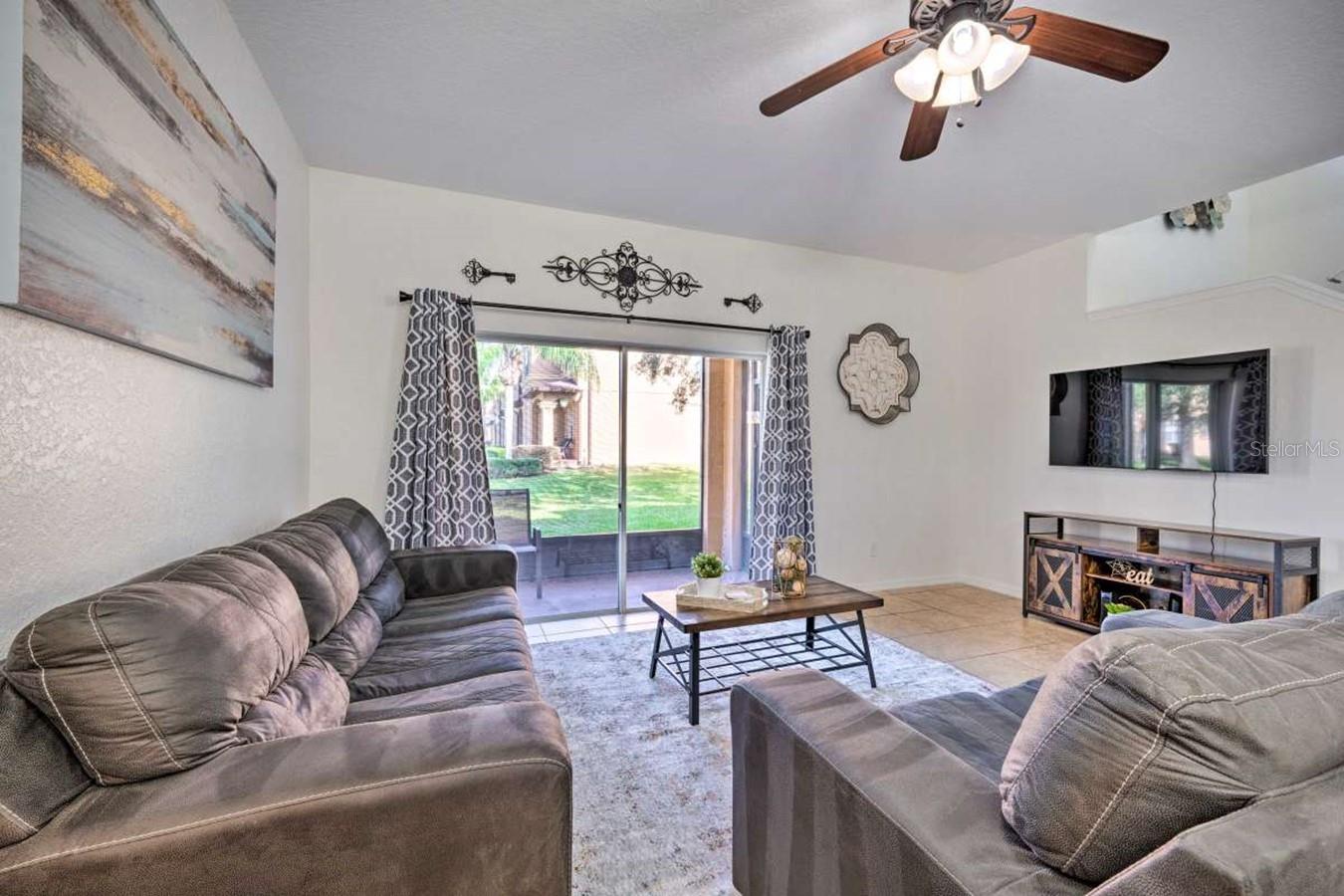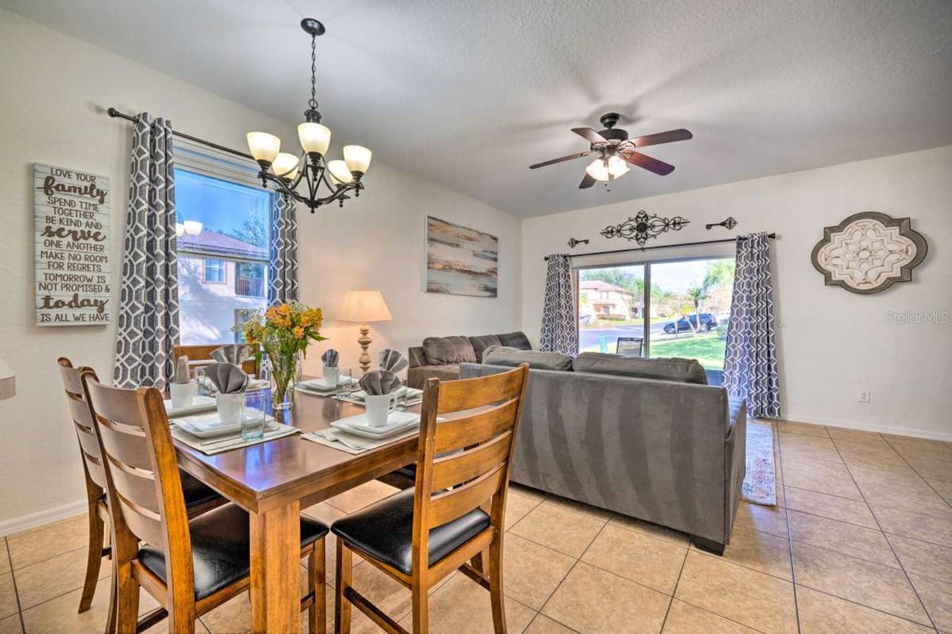 Outstanding fully furnished four-bedroom, three-and-a-half-bath corner lot townhome in the sought-after Regal Palms Resort, turnkey and ready for vacation guests or residential occupancy. This beautifully presented property features a separate lockout unit, an upstairs balcony off the master bedroom, a kitchen with stainless steel appliances, a new AC unit (2019), two new couches, new beds, and remodeled baths. Enjoy resort-style facilities including a 2.5-acre tropical swimming pool, lazy river, heated pools, water slide, cascading waterfalls, poolside bar, beach volleyball court, indoor and outdoor spa, steam room, sauna, fitness center, beauty salon, sports bar, restaurant, and play areas. It is located across from the popular Highlands Reserve Golf Club and just minutes from Walt Disney World, shopping plazas, and outlets, with a Publix supermarket and dining. HOA fees cover exterior/roof insurance, basic cable, phone, internet, and exterior/interior pest control.