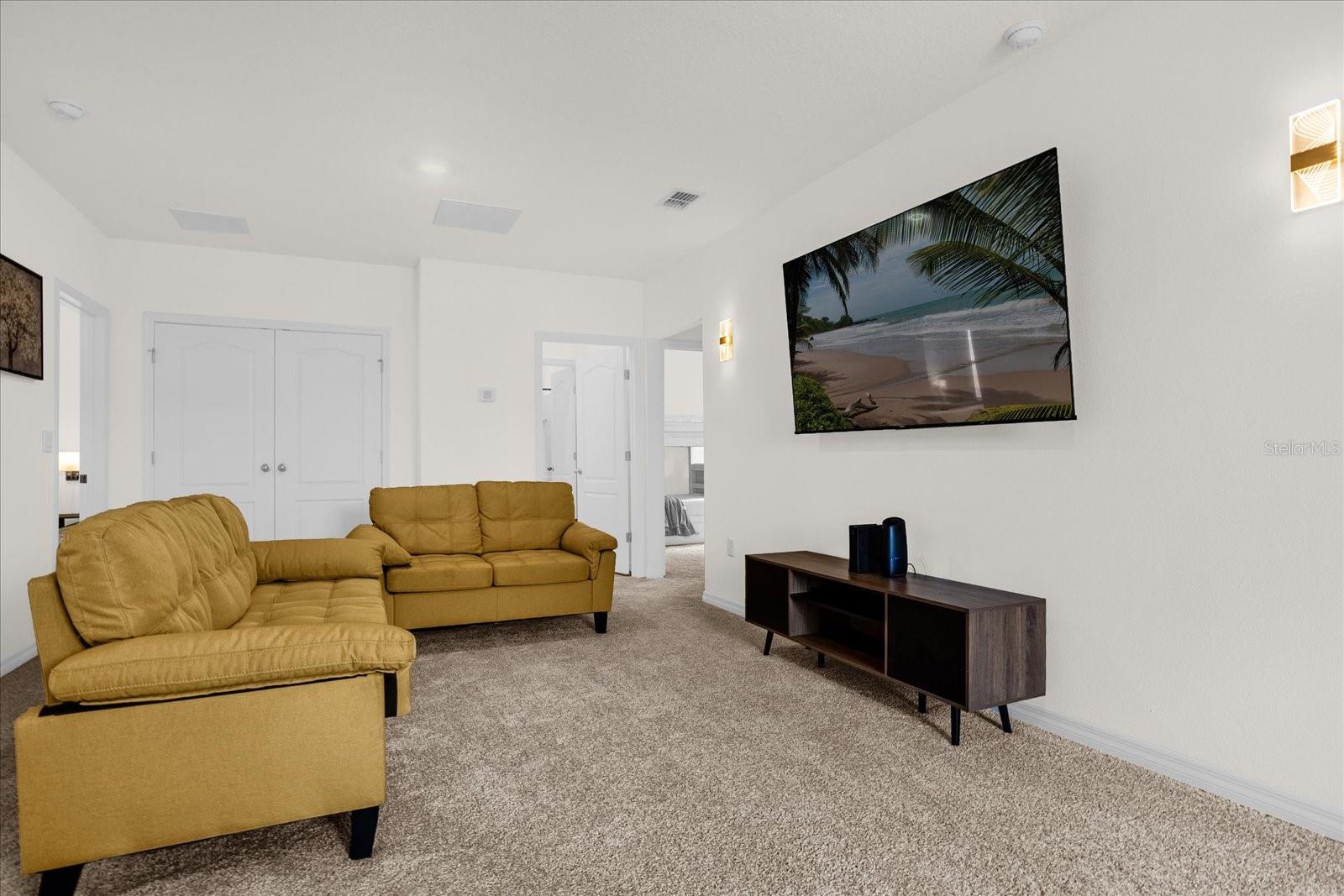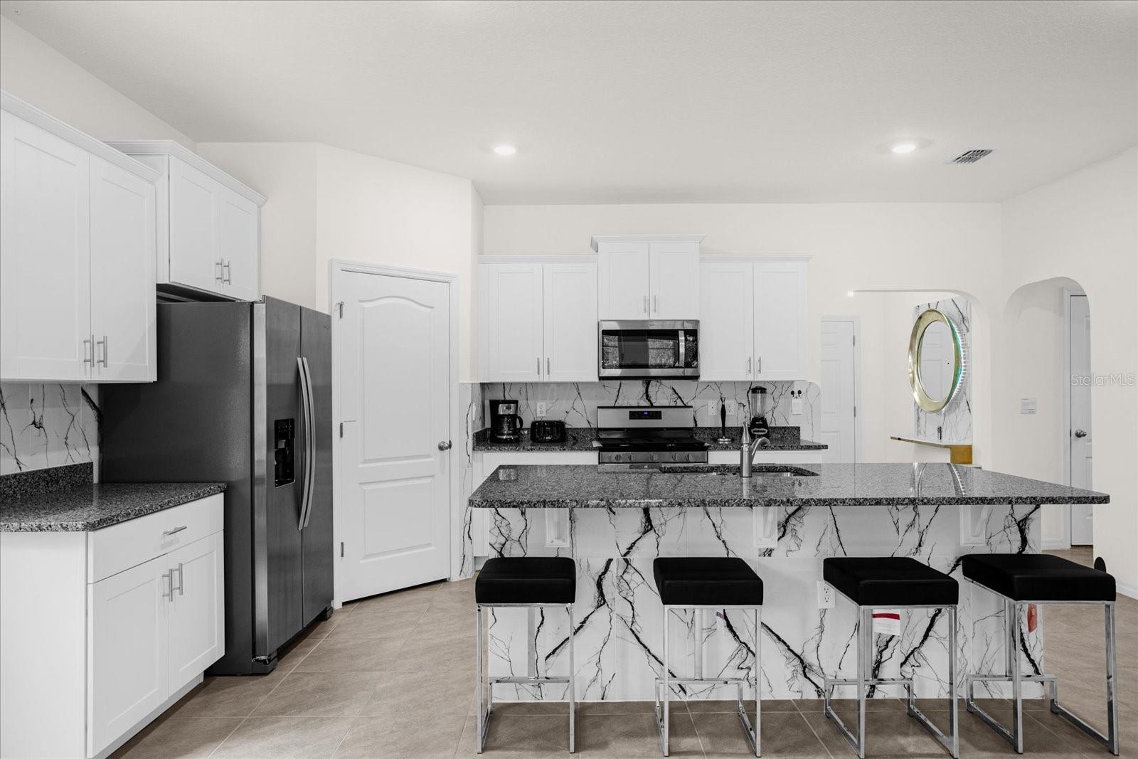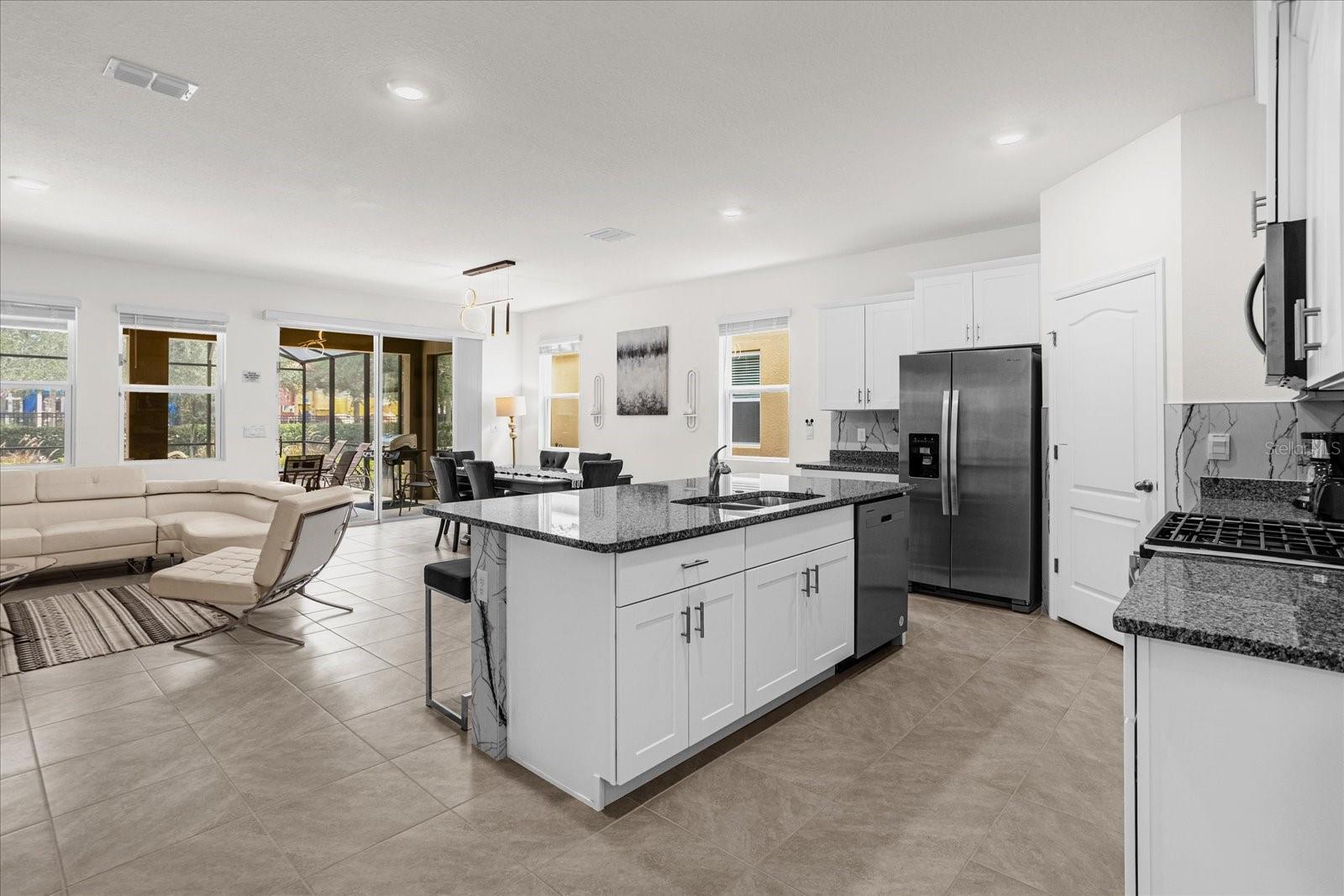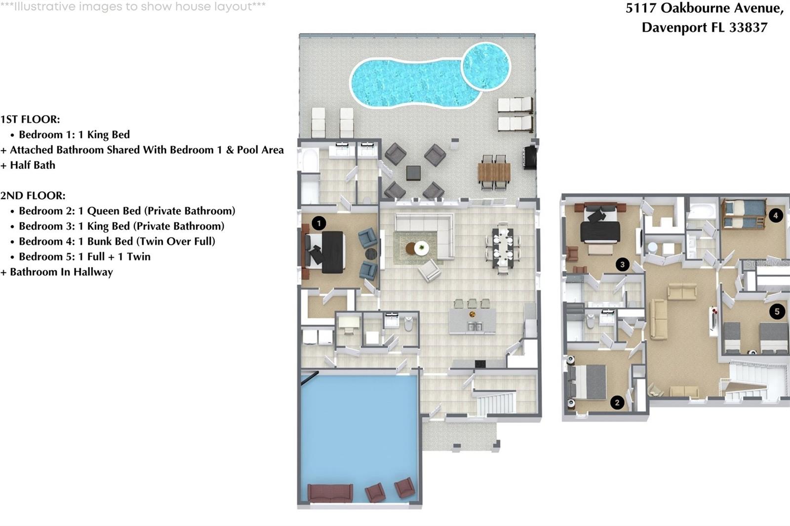 Price just reduced! Stunning 5 Bedroom Home in Solterra Resort. Welcome to your dream home in the luxurious Solterra Resort! This exquisite 5 bedroom, 4 1/2 bathroom single-family home, built in 2023, offers 2,942 sq ft of luxurious living space. Perfectly designed for both comfort and style, this home comes fully furnished, ideal for families or as a turnkey vacation rental investment. Enjoy the expansive open-plan living and dining areas, perfect for entertaining guests. A Modern Kitchen equipped with top-of-the-line stainless steel appliances, granite countertops, and a large island. A luxurious master bedroom with walk in closets and an en-suite bathroom. Plus four additional bedrooms provide ample space for family and guests. Step outside into your own personal oasis with a private pool and spa, perfect for relaxing and enjoying the Florida sunshine. Enjoy all the amazing community amenities: a clubhouse, state of the art fitness center, resort-style pool, lazy river (directly behind your home!), tennis courts, and more. Situated in the heart of Davenport, this home offers easy access to major highways, shopping centers, restaurants, and world-renowned theme parks like Walt Disney World and Universal Studios.! Call to schedule a showing today!
