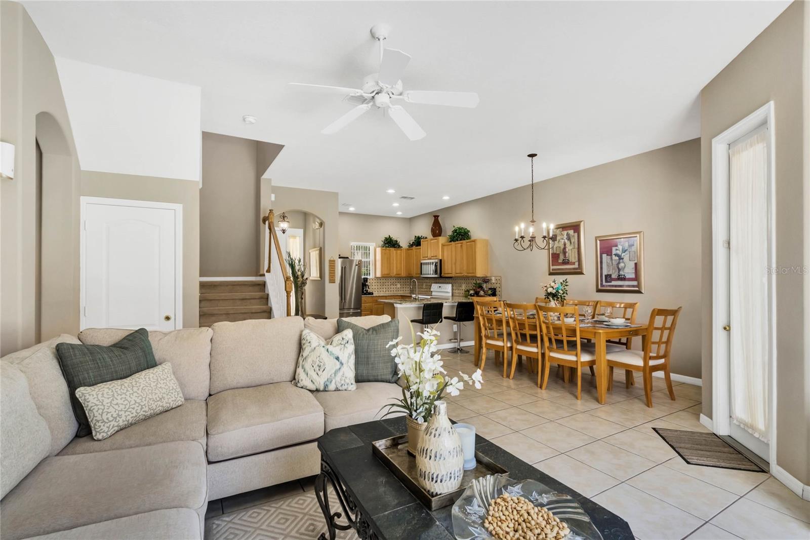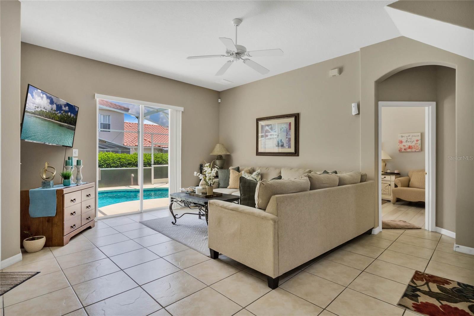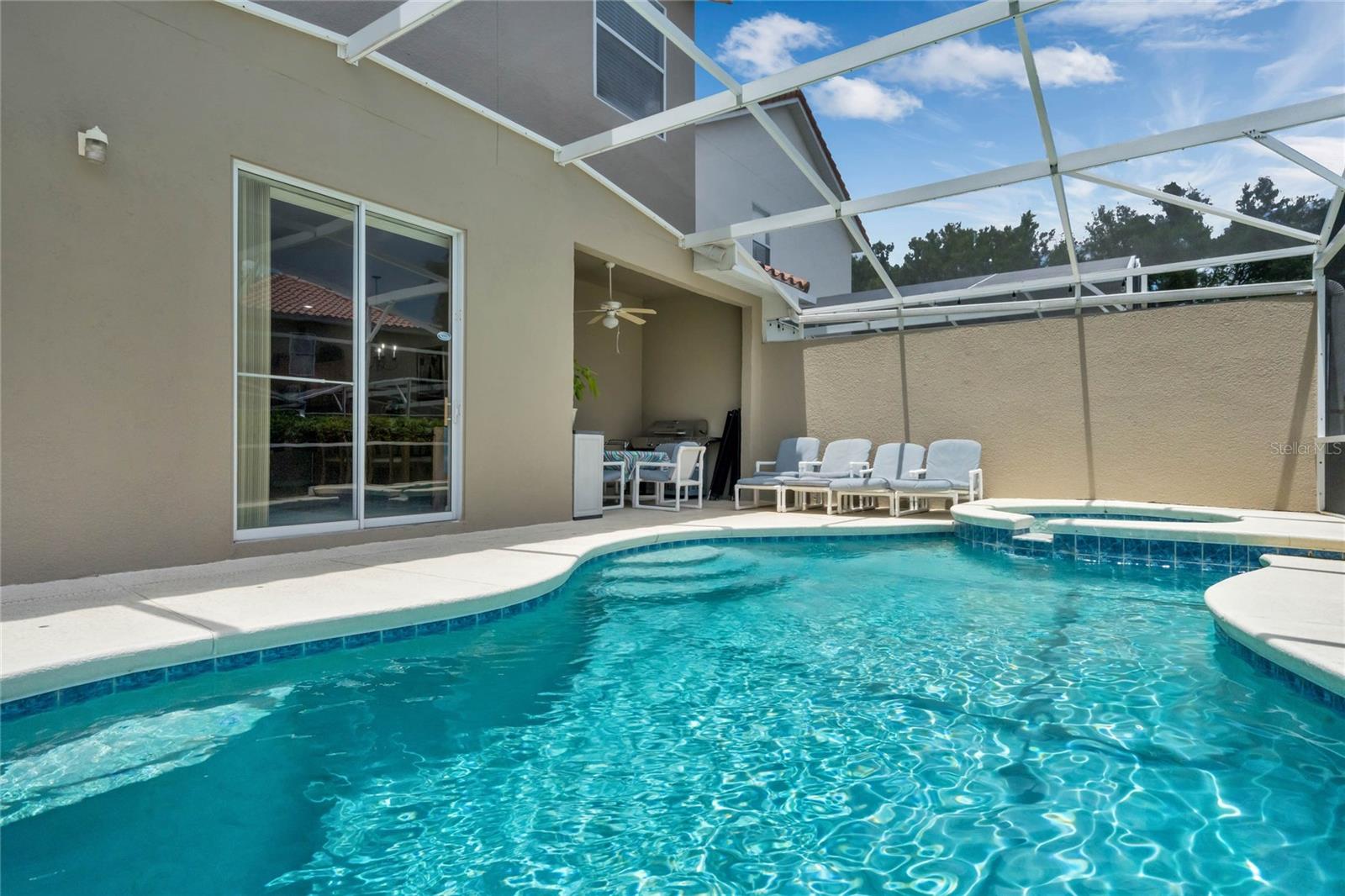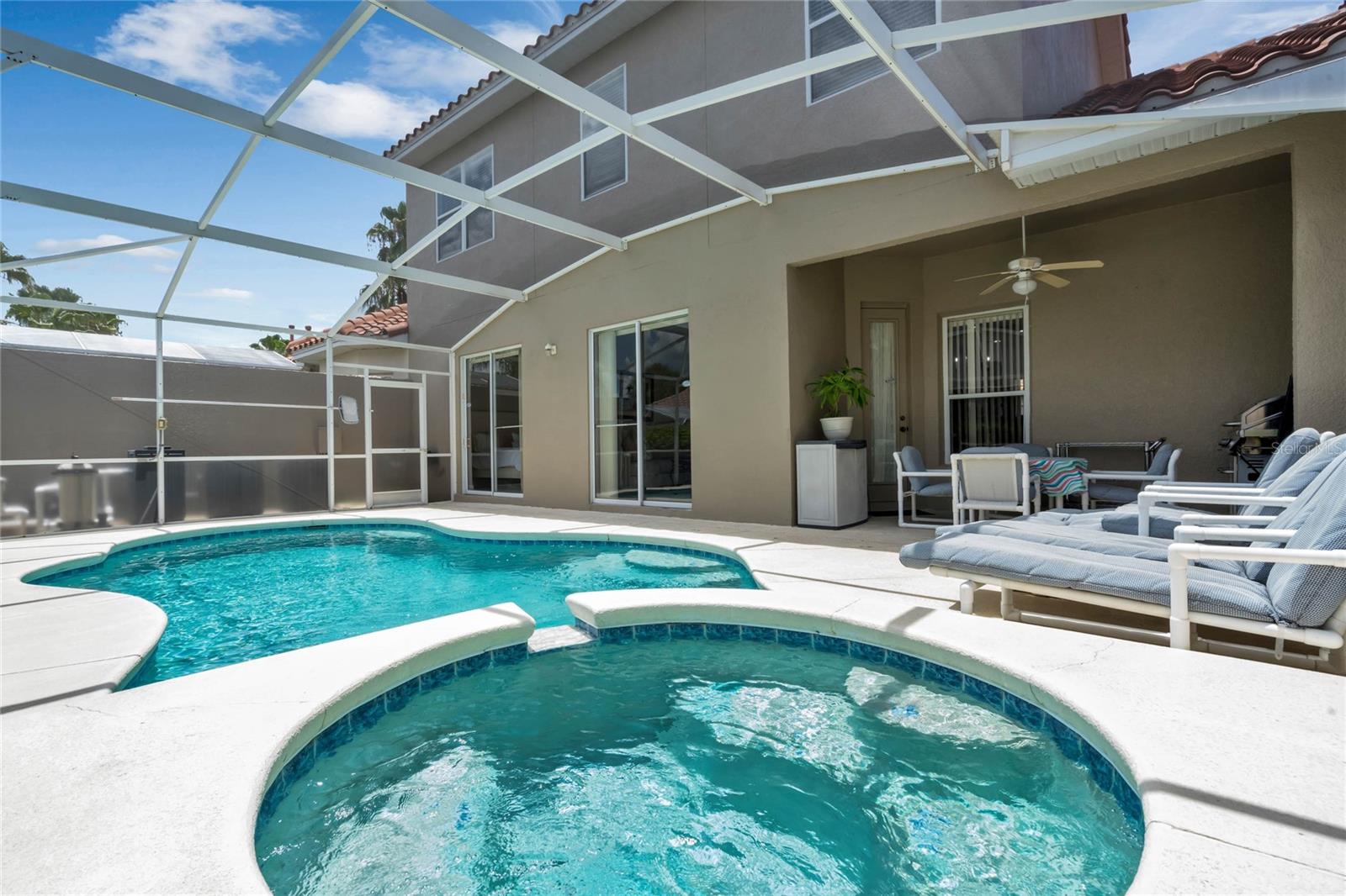 Seller may consider buyer concessions if made in an offer. Welcome to this stunning 1762 square foot home, boasting 4 bedrooms, 3.5 baths, and a refreshing pool and spa, all meticulously maintained to showcase the pride of ownership. This residence features two master bedrooms, one conveniently located on the main floor and the other on the second floor. As you walk in you will be welcomed by an open, light and airy floor plan is accentuated by elegant ceramic tile floors in the living room, kitchen and dining area, creating a welcoming atmosphere for both relaxation and entertainment. As you come up the spacious stairs you will find the second owner suite with its own tub and standup shower as well as double sink feature. Accompanied by two other specious guest bedrooms and its own shower/tub combination in that third bathroom. Stepping outside, you'll find a private pool and spa, complemented by screened enclosures and a covered lanai, offering a perfect setting for outdoor enjoyment and relaxation. Property has Newly installed granite counter tops, New water heater tank and freshly painted on the outside. The style of the tiled roof along with beautiful palm trees will give you a relaxing feeling as soon as you approach the property. Nestled in the gated community of Tuscan Hills in Davenport, this home provides access to fantastic amenities such as tennis courts, volleyball court, Clubhouse, Fitness Center, Gated Community, Playground, Sidewalk, Tennis Courts enhancing the lifestyle of its residents and or guests. Not to mention Cable TV, Internet, and Pest Control are covered by your HOA.This property is an ideal fit for a personal vacation home, as well as a lucrative short-term or long-term rental for those seeking an income-producing investment. Its prime location places it just minutes away from the renowned Disney Parks major highways that provide easy and fast access to other theme parks, shopping malls and all the exciting attractions Orlando has to offer. Whether you're looking for a private retreat or a savvy investment opportunity, this home offers the best of both worlds. Come see your very own PRIVATE OAISES. Dont miss the chance to live in a community where everyday feels like a vacation.