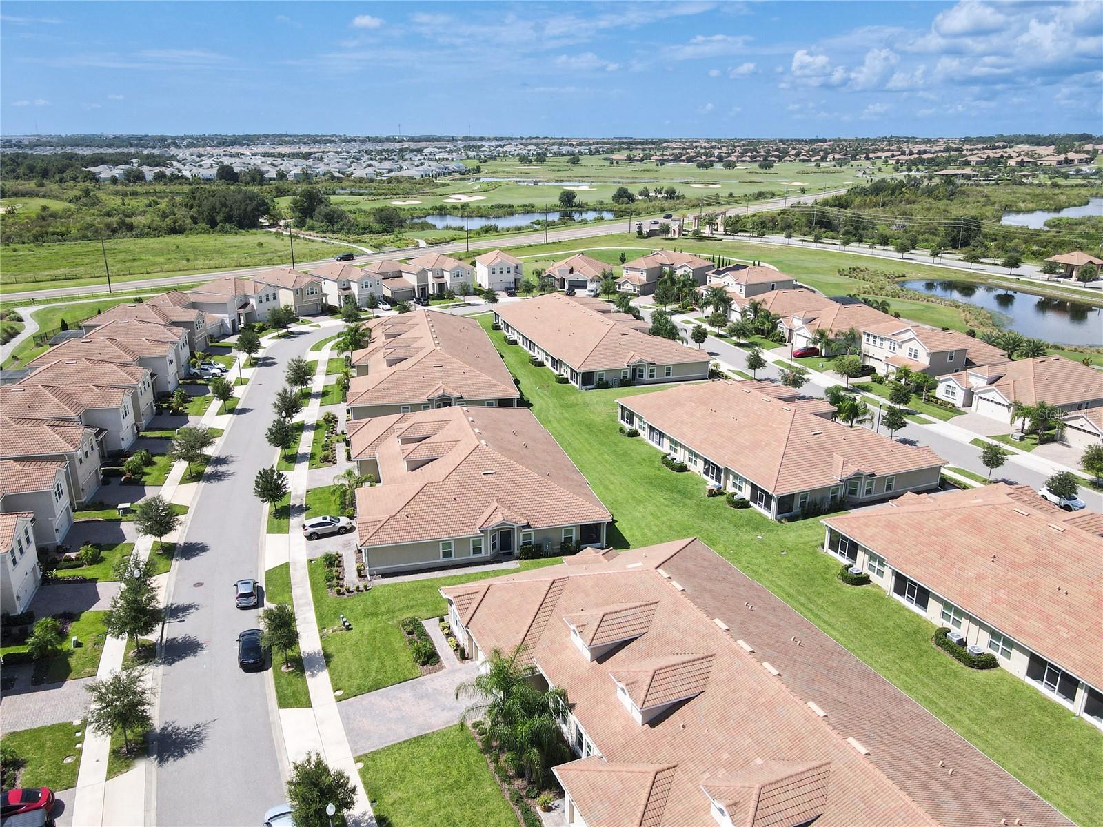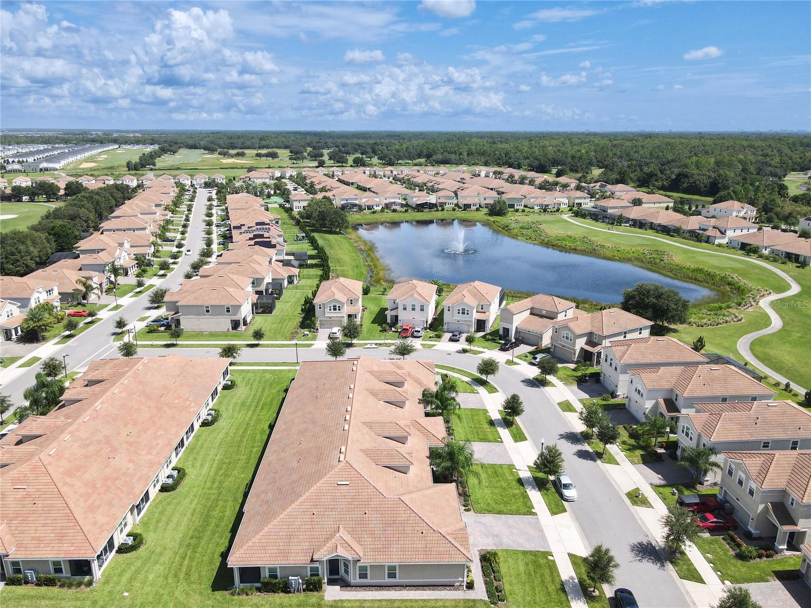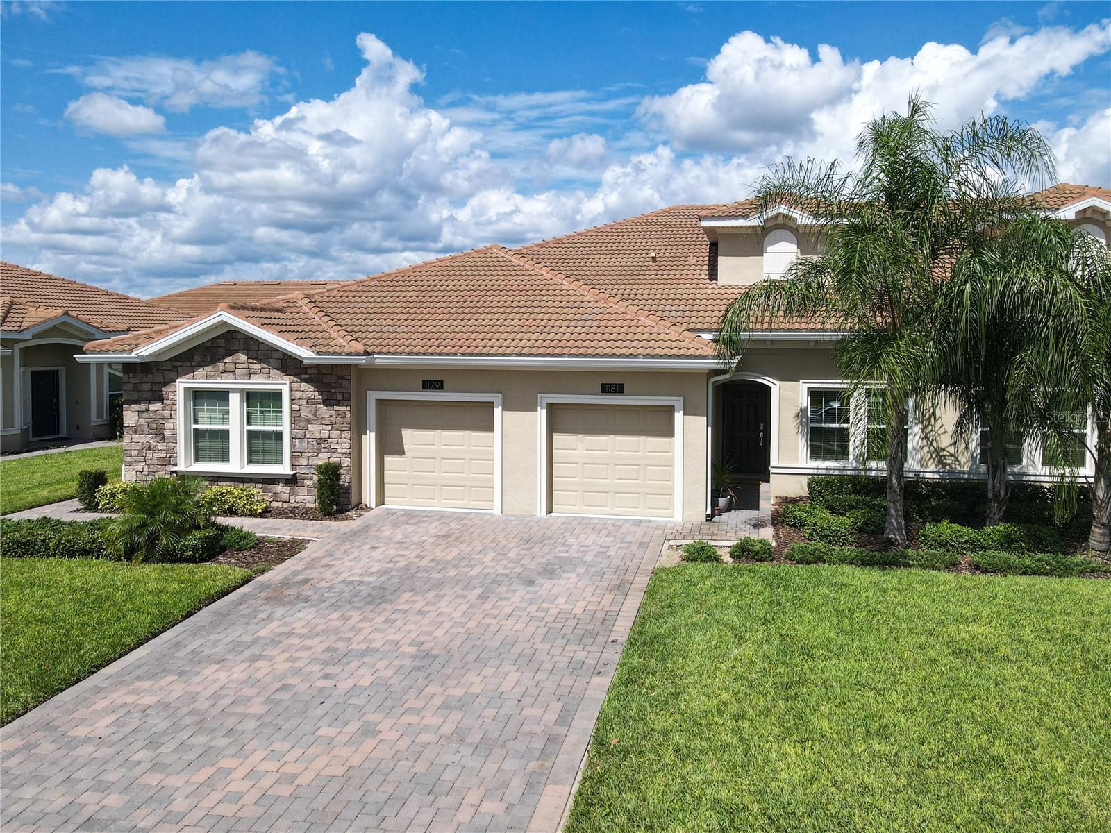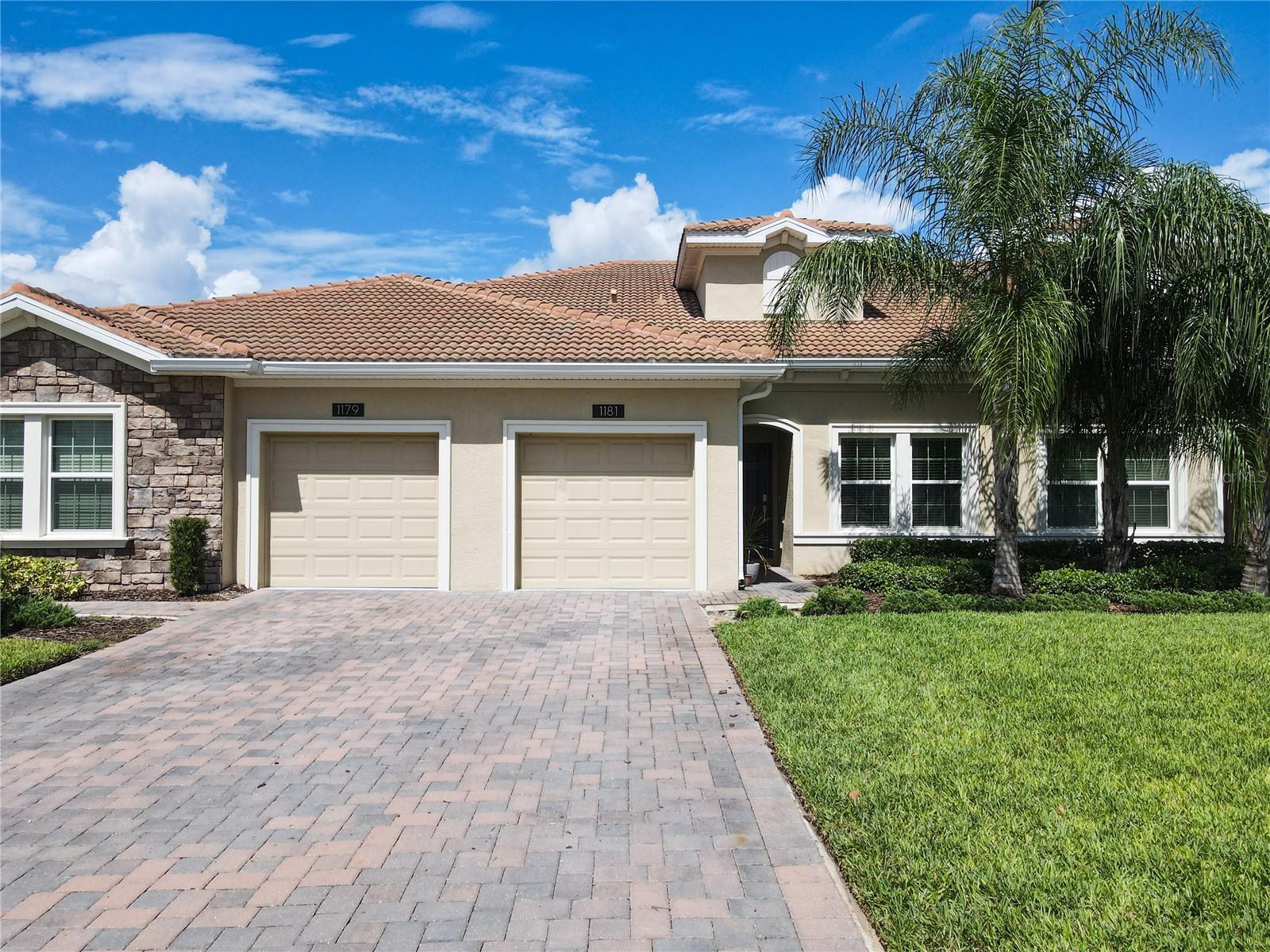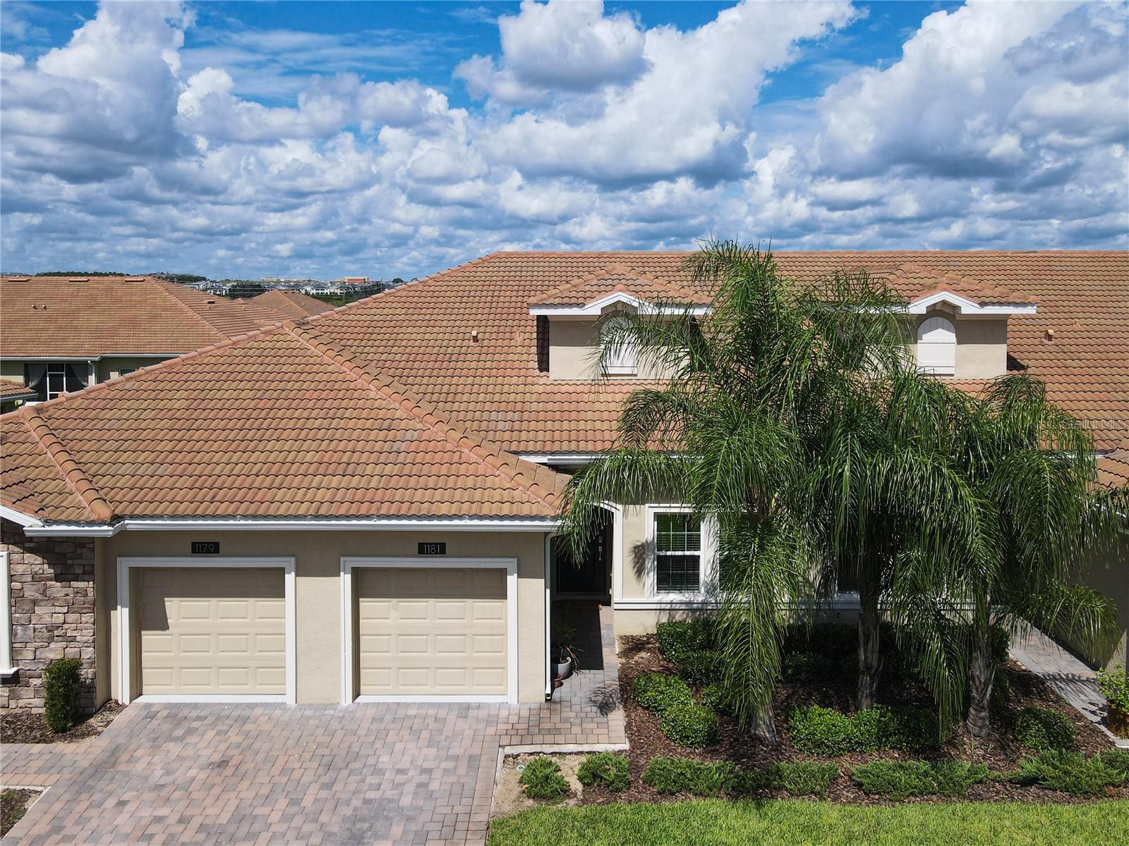 **Golf Membership Included** Welcome to the Villa's at the the Country Club North. Located in the Guard gated community of Champion's Gate is this beautiful 2 bed 2 bath villa, which also features a bonus office/den space which could be utilized as a third bedroom. Before you enter this home you will notice that the home has one of the longest driveways of any villa here, allowing you to park TWO cars instead of one. As you enter the home you will immediately notice the open concept living area and diamond pattern laid tile flooring, throughout the main living area. This home features a split floor plan, with both bedrooms having direct access to a bathroom. Making your way to the kitchen you will notice that Quartz countertops cover the entire kitchen countertop area, and the kitchen is complete with matte finish appliances, which will convey with the sale of the home. This kitchen also features a bar top area, making it a true eat in kitchen, perfect for entertaining. Across from the kitchen you will find the bonus room, currently being utilized as an office, this space could also be used as a formal dining/living room, or could even be turned into a third bedroom. This home features an open concept floor plan, and is perfect for entertaining. Located in the back of the home you will find the primary bedroom, complete with an oversized walk in closet and en-suite bathroom, featuring Quartz countertops and dual sinks. To the rear of the home, off the living room, you will find a wall to wall sliding glass door leading you into your screened in Lanai, allowing you you enjoy peaceful Florida days, bug free. Champion's Gate features an abundance of amenities including two water parks, two fitness centers, pickle ball/tennis courts, Golf, putting green, and also an owners only clubhouse called The Plaza. The Plaza clubhouse is resident only and features two pools, Hottub, gym, saunas, and a resident only bar/reataurant. There is so much to love about Champion's Gate, now is your time to call it home.