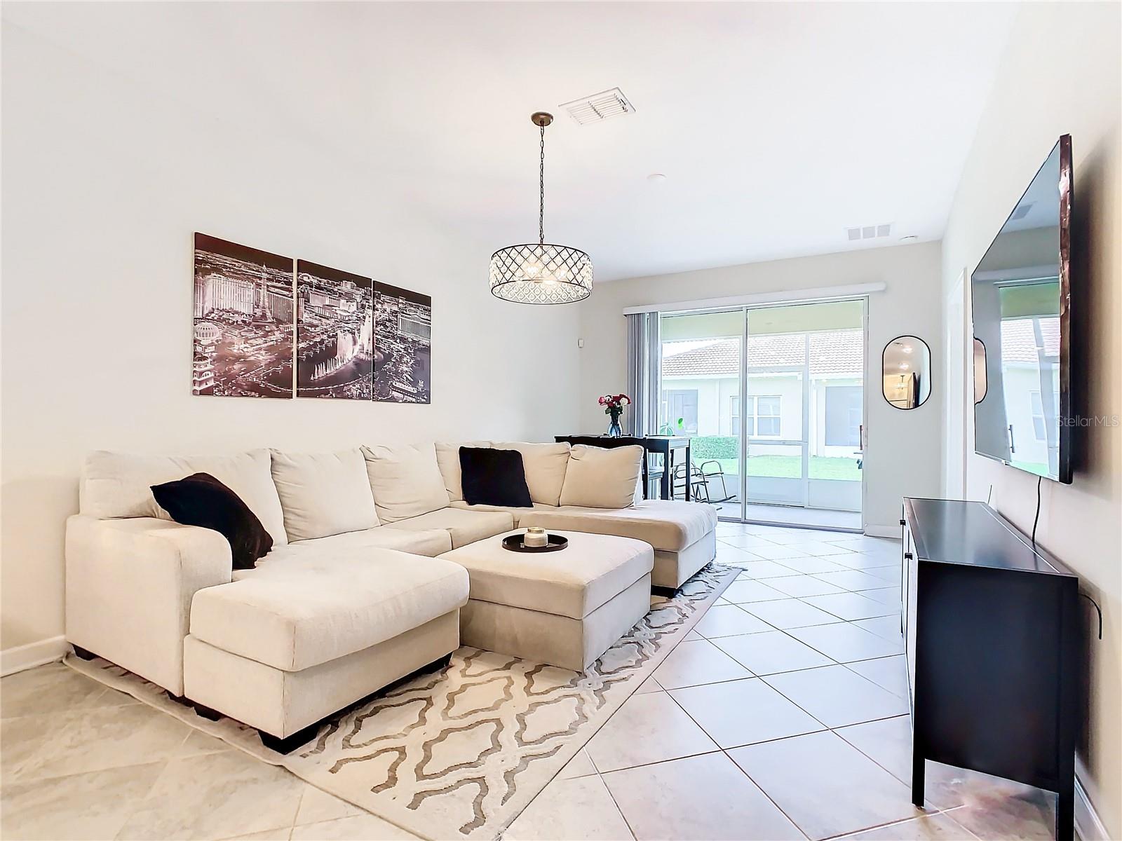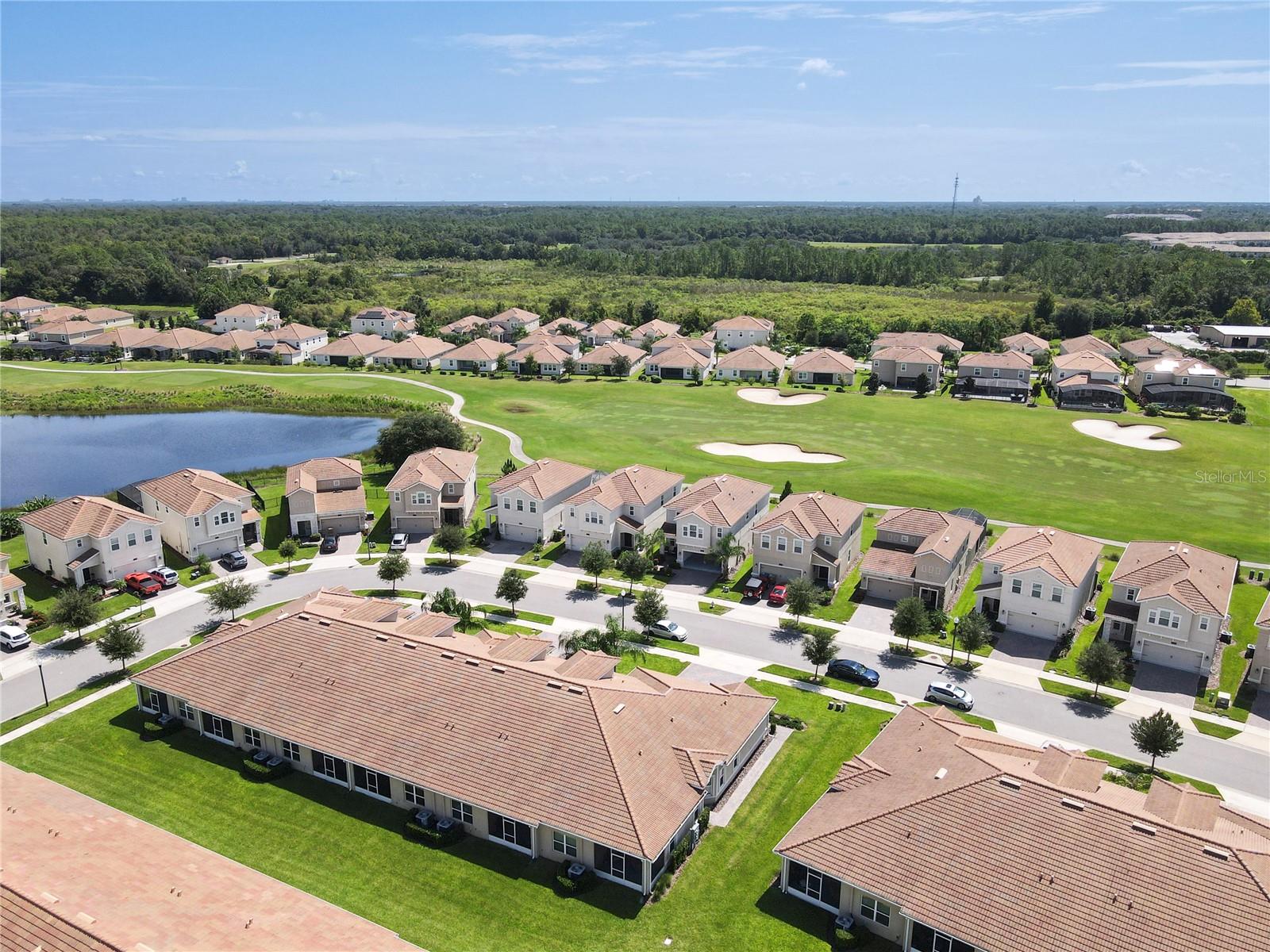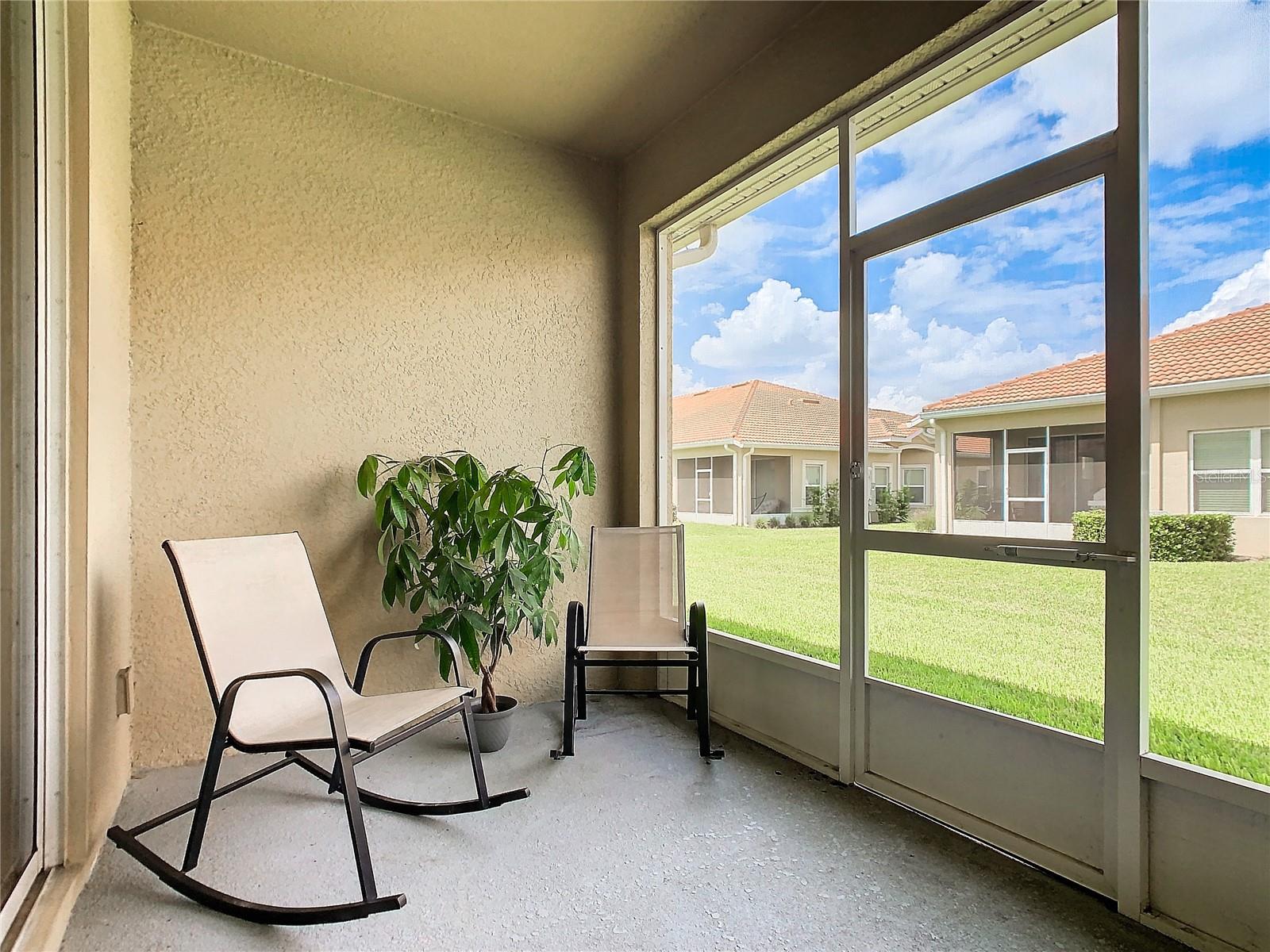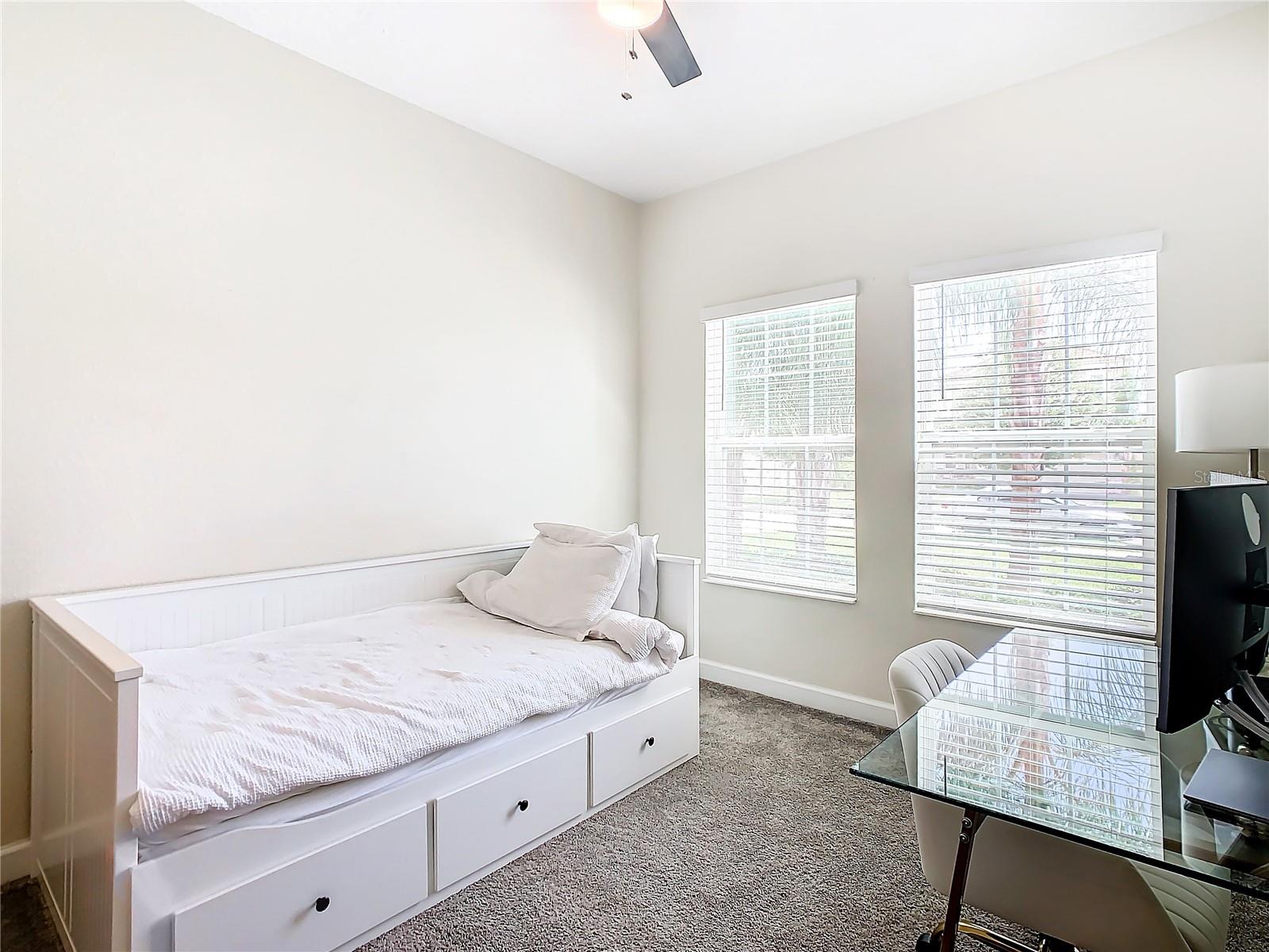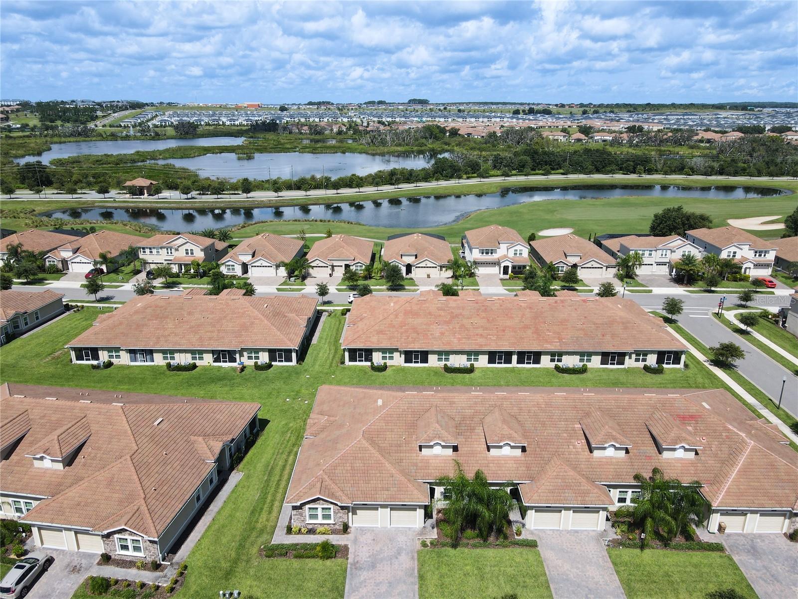 **Golf Membership Included** Welcome to the Villa's at the the Country Club North. Located in the Guard gated community of Champion's Gate is this beautiful 2 bed 2 bath villa, which also features a bonus office/den space which could be utilized as a third bedroom. Before you enter this home you will notice that the home has one of the longest driveways of any villa here, allowing you to park TWO cars instead of one. As you enter the home you will immediately notice the open concept living area and diamond pattern laid tile flooring, throughout the main living area. This home features a split floor plan, with both bedrooms having direct access to a bathroom. Making your way to the kitchen you will notice that Quartz countertops cover the entire kitchen countertop area, and the kitchen is complete with matte finish appliances, which will convey with the sale of the home. This kitchen also features a bar top area, making it a true eat in kitchen, perfect for entertaining. Across from the kitchen you will find the bonus room, currently being utilized as an office, this space could also be used as a formal dining/living room, or could even be turned into a third bedroom. This home features an open concept floor plan, and is perfect for entertaining. Located in the back of the home you will find the primary bedroom, complete with an oversized walk in closet and en-suite bathroom, featuring Quartz countertops and dual sinks. To the rear of the home, off the living room, you will find a wall to wall sliding glass door leading you into your screened in Lanai, allowing you you enjoy peaceful Florida days, bug free. Champion's Gate features an abundance of amenities including two water parks, two fitness centers, pickle ball/tennis courts, Golf, putting green, and also an owners only clubhouse called The Plaza. The Plaza clubhouse is resident only and features two pools, Hottub, gym, saunas, and a resident only bar/reataurant. There is so much to love about Champion's Gate, now is your time to call it home.