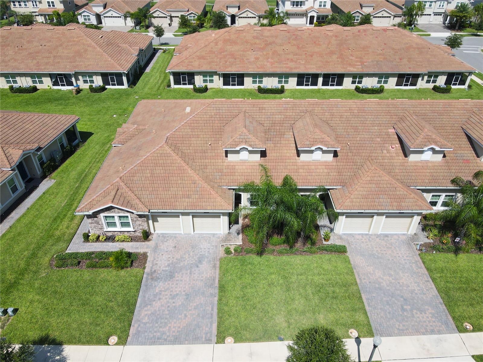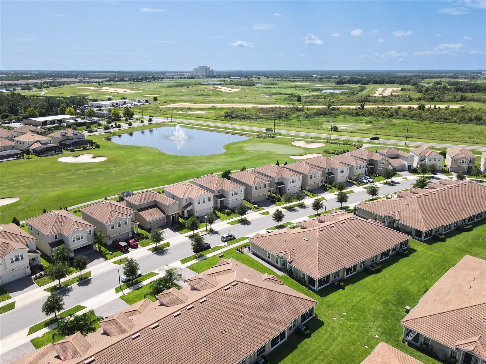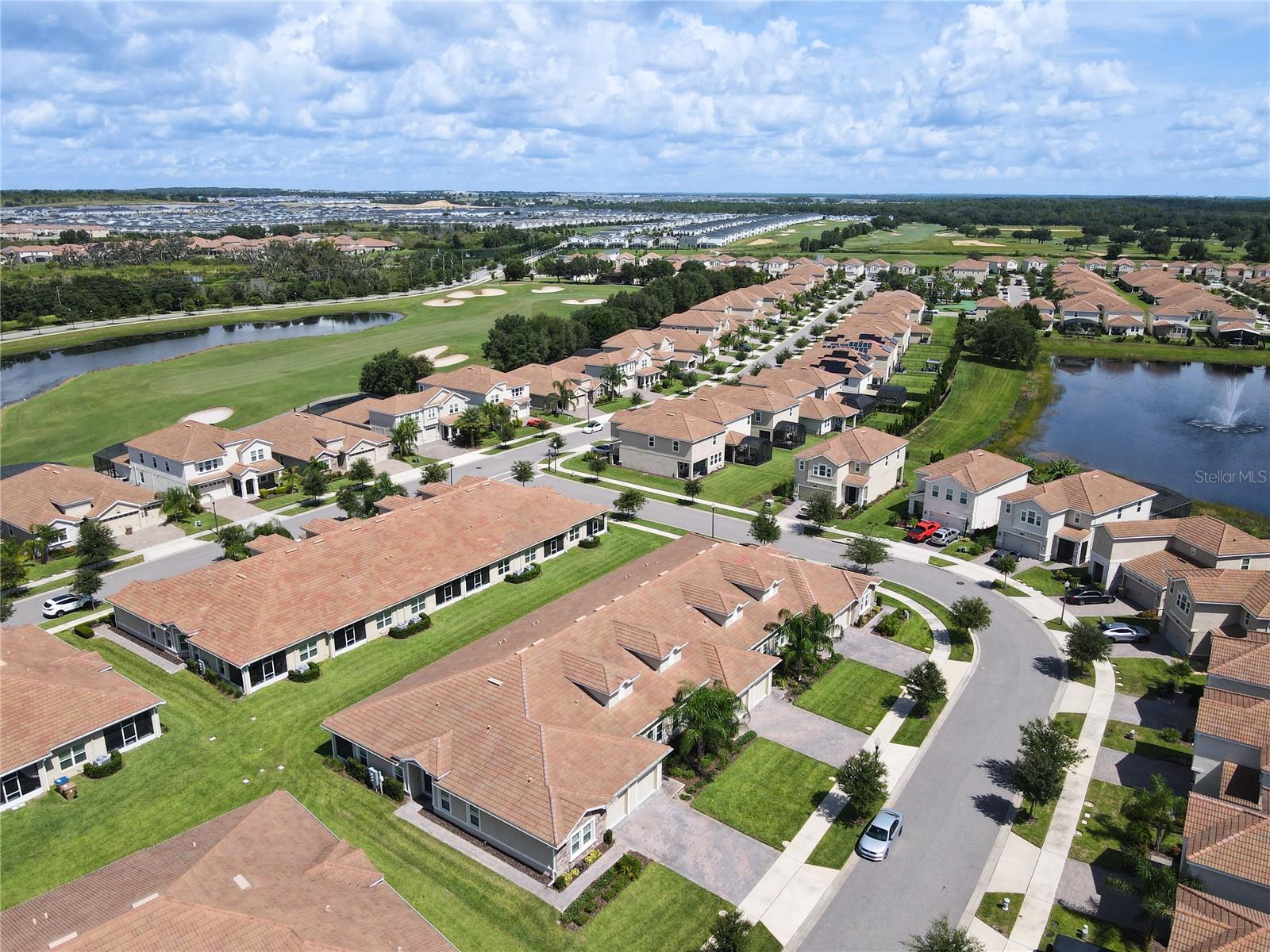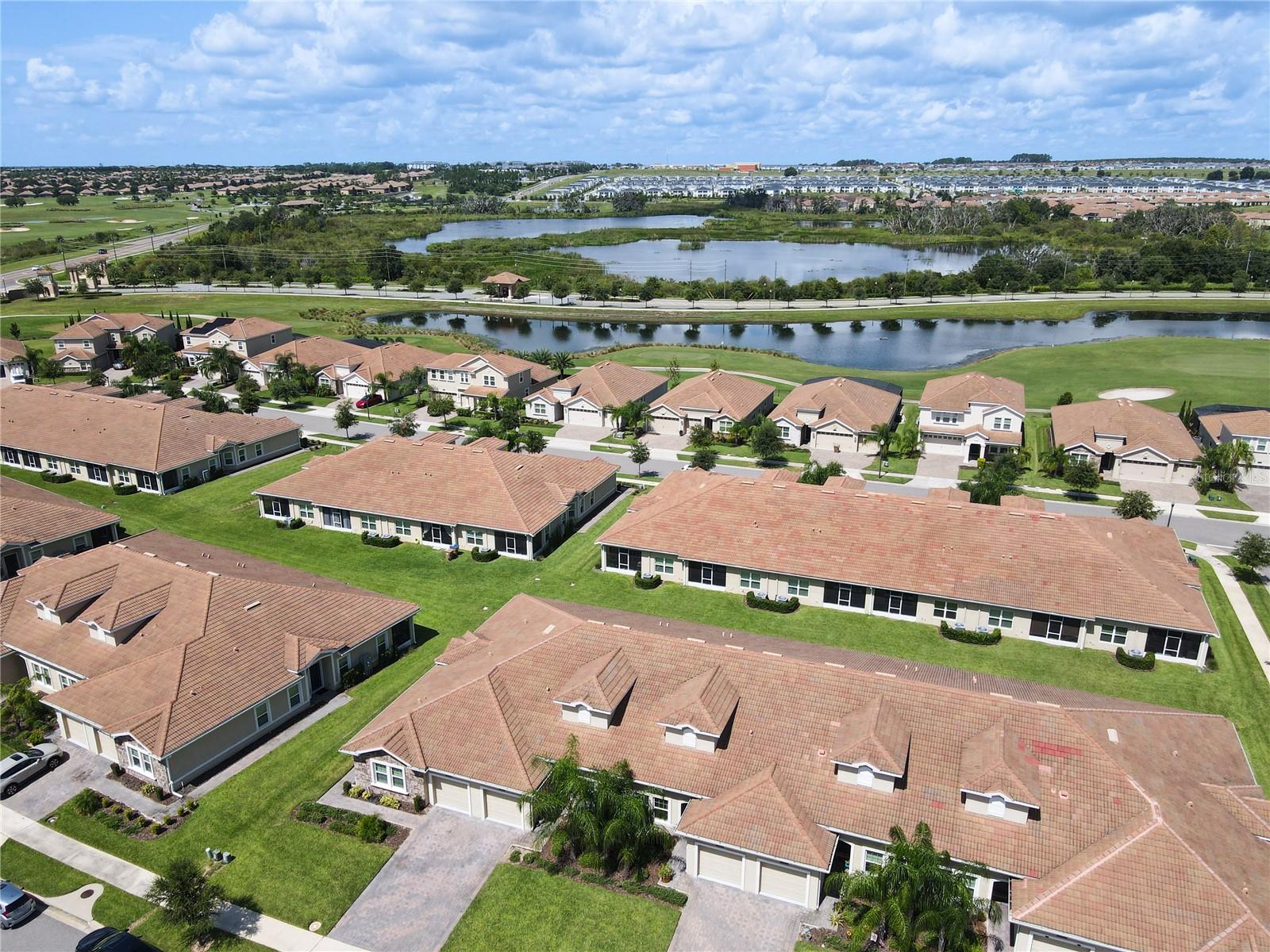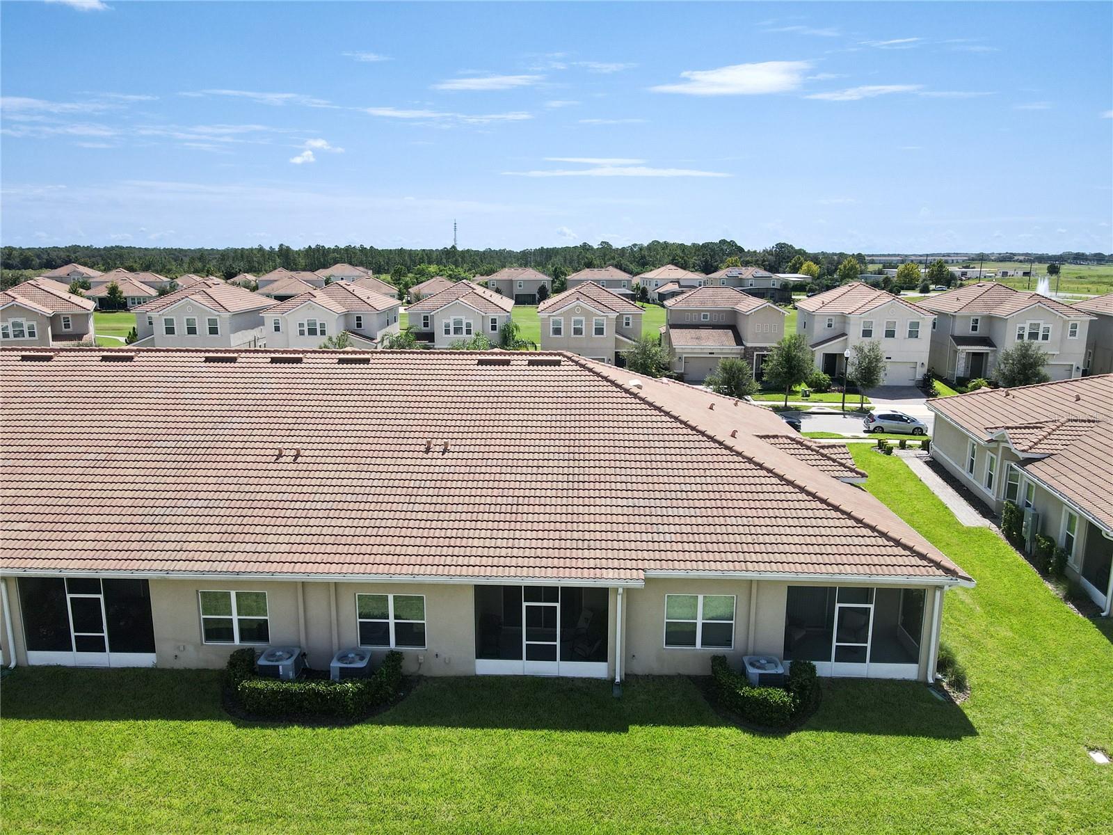 **Golf Membership Included** Welcome to the Villa's at the the Country Club North. Located in the Guard gated community of Champion's Gate is this beautiful 2 bed 2 bath villa, which also features a bonus office/den space which could be utilized as a third bedroom. Before you enter this home you will notice that the home has one of the longest driveways of any villa here, allowing you to park TWO cars instead of one. As you enter the home you will immediately notice the open concept living area and diamond pattern laid tile flooring, throughout the main living area. This home features a split floor plan, with both bedrooms having direct access to a bathroom. Making your way to the kitchen you will notice that Quartz countertops cover the entire kitchen countertop area, and the kitchen is complete with matte finish appliances, which will convey with the sale of the home. This kitchen also features a bar top area, making it a true eat in kitchen, perfect for entertaining. Across from the kitchen you will find the bonus room, currently being utilized as an office, this space could also be used as a formal dining/living room, or could even be turned into a third bedroom. This home features an open concept floor plan, and is perfect for entertaining. Located in the back of the home you will find the primary bedroom, complete with an oversized walk in closet and en-suite bathroom, featuring Quartz countertops and dual sinks. To the rear of the home, off the living room, you will find a wall to wall sliding glass door leading you into your screened in Lanai, allowing you you enjoy peaceful Florida days, bug free. Champion's Gate features an abundance of amenities including two water parks, two fitness centers, pickle ball/tennis courts, Golf, putting green, and also an owners only clubhouse called The Plaza. The Plaza clubhouse is resident only and features two pools, Hottub, gym, saunas, and a resident only bar/reataurant. There is so much to love about Champion's Gate, now is your time to call it home.