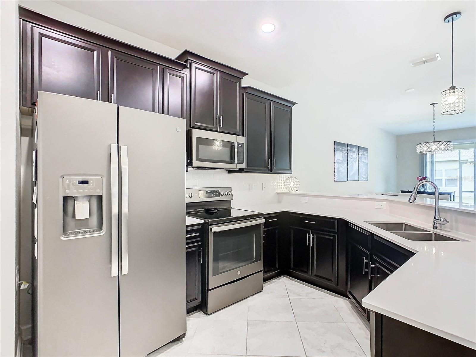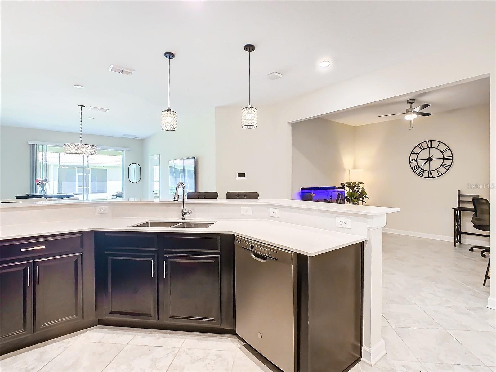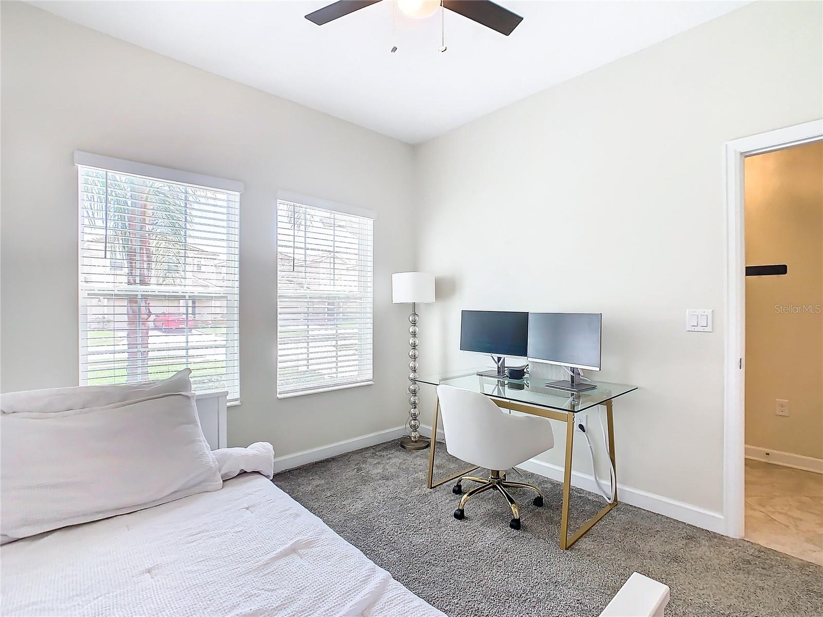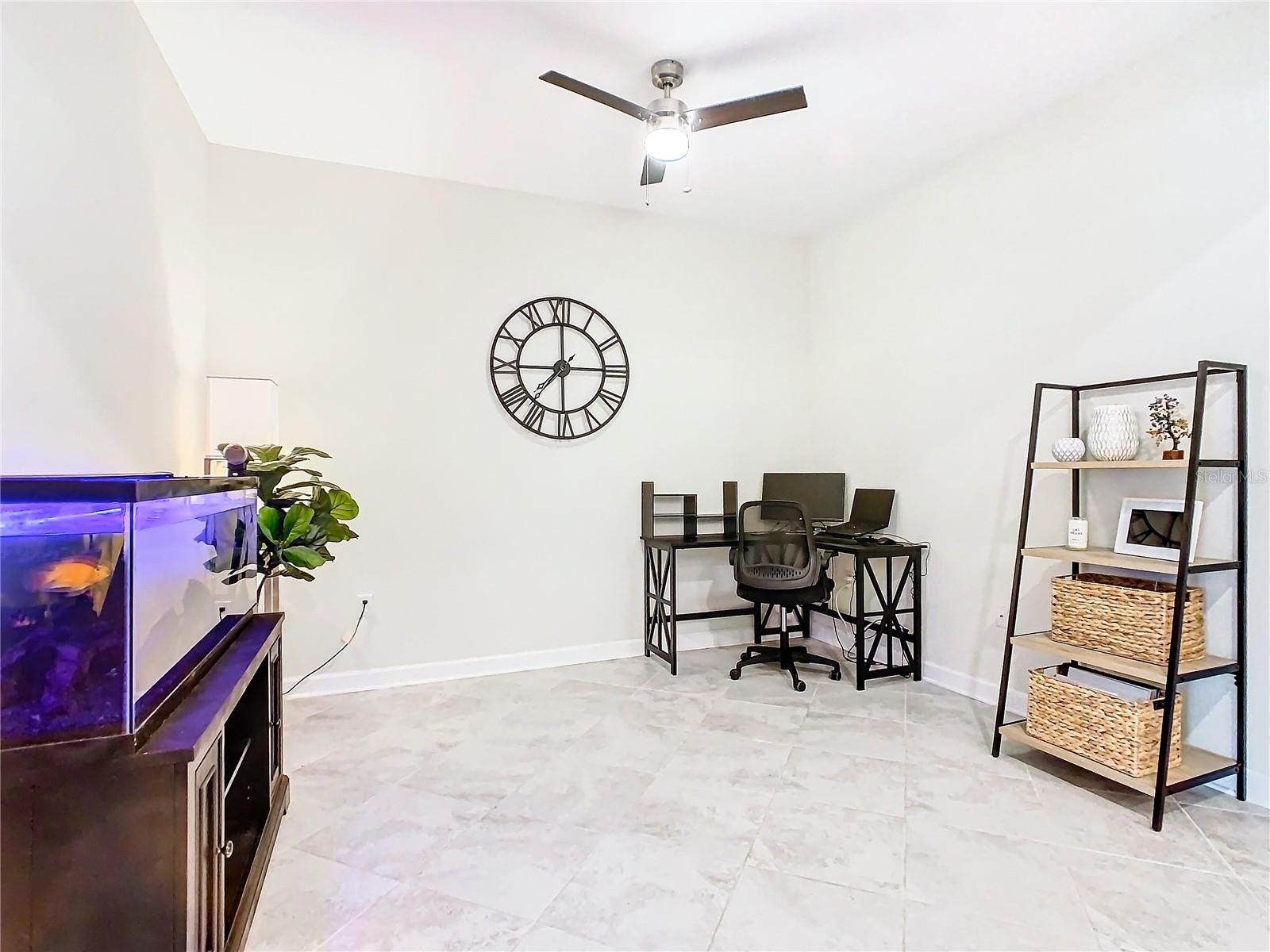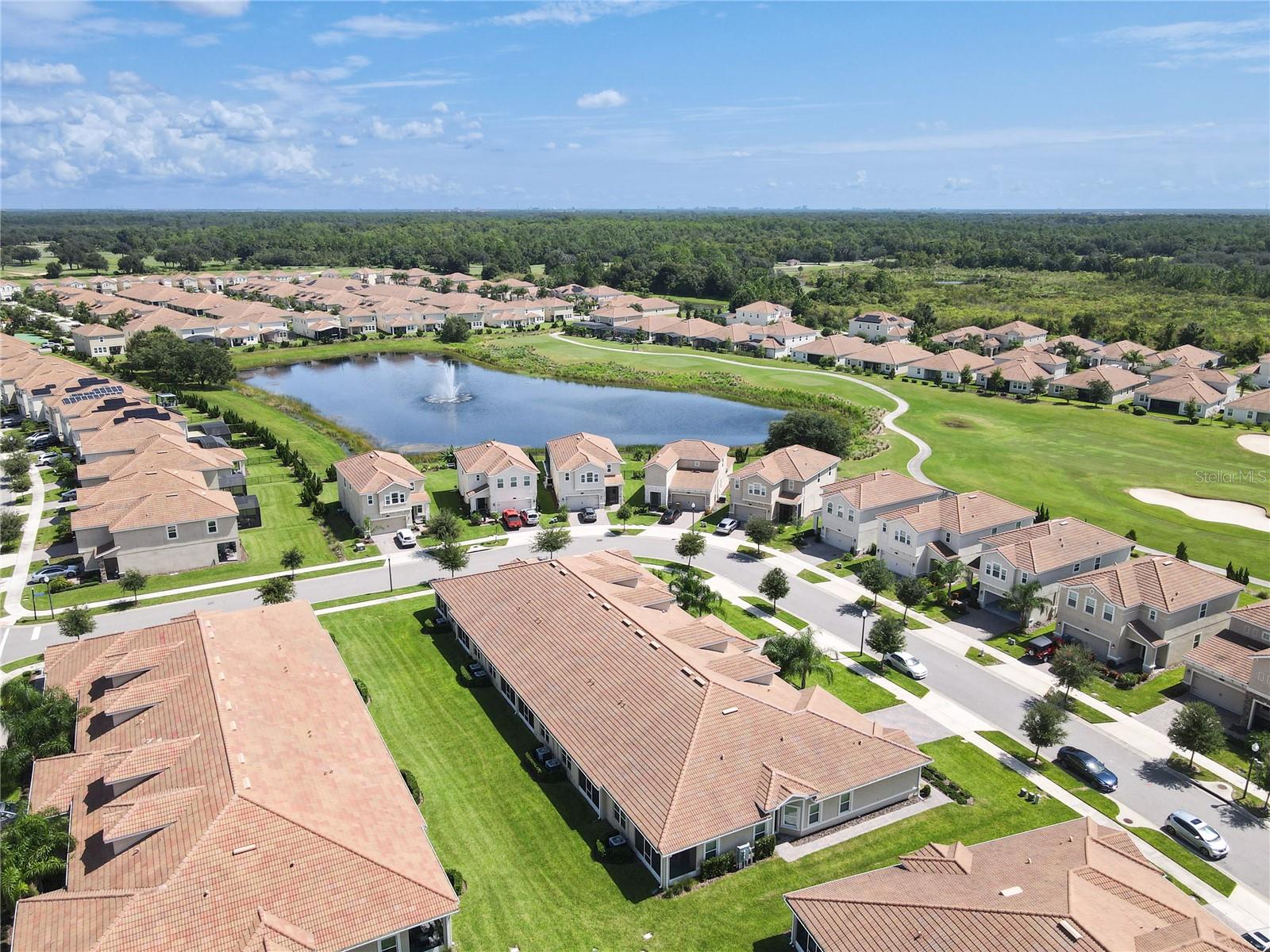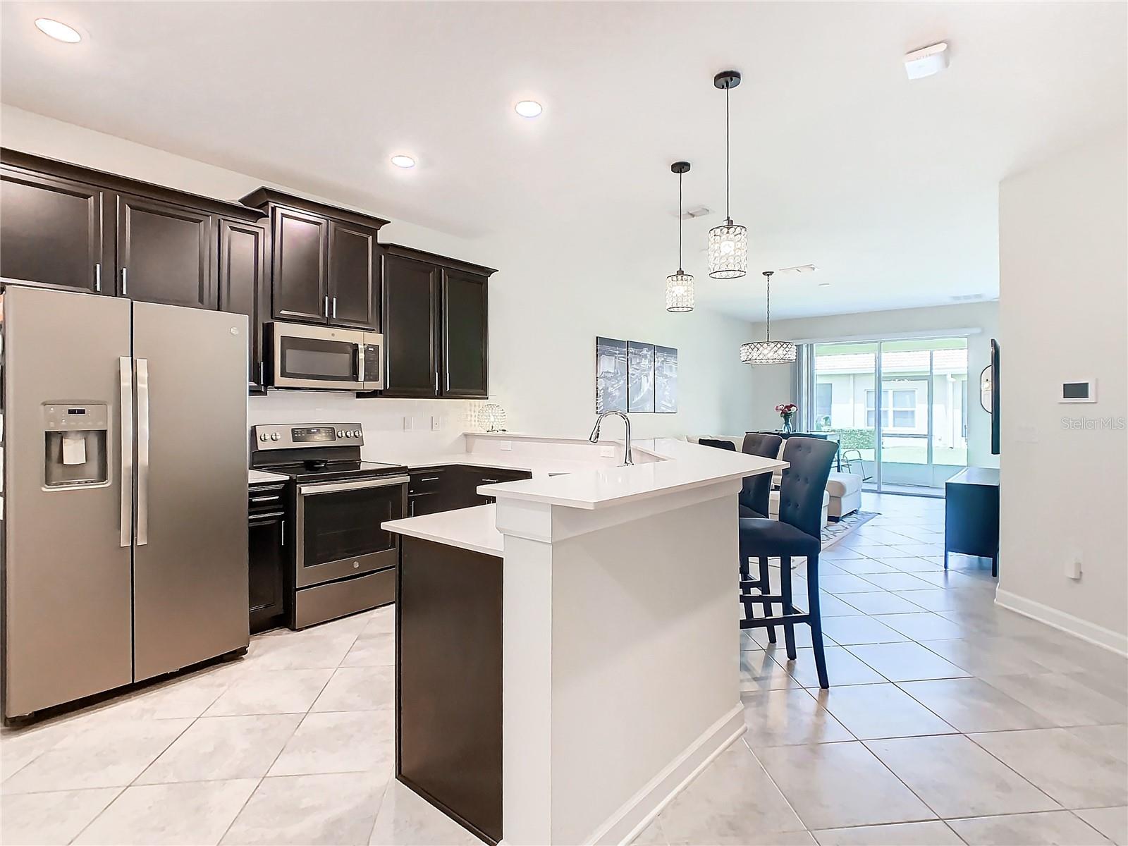 **Golf Membership Included** Welcome to the Villa's at the the Country Club North. Located in the Guard gated community of Champion's Gate is this beautiful 2 bed 2 bath villa, which also features a bonus office/den space which could be utilized as a third bedroom. Before you enter this home you will notice that the home has one of the longest driveways of any villa here, allowing you to park TWO cars instead of one. As you enter the home you will immediately notice the open concept living area and diamond pattern laid tile flooring, throughout the main living area. This home features a split floor plan, with both bedrooms having direct access to a bathroom. Making your way to the kitchen you will notice that Quartz countertops cover the entire kitchen countertop area, and the kitchen is complete with matte finish appliances, which will convey with the sale of the home. This kitchen also features a bar top area, making it a true eat in kitchen, perfect for entertaining. Across from the kitchen you will find the bonus room, currently being utilized as an office, this space could also be used as a formal dining/living room, or could even be turned into a third bedroom. This home features an open concept floor plan, and is perfect for entertaining. Located in the back of the home you will find the primary bedroom, complete with an oversized walk in closet and en-suite bathroom, featuring Quartz countertops and dual sinks. To the rear of the home, off the living room, you will find a wall to wall sliding glass door leading you into your screened in Lanai, allowing you you enjoy peaceful Florida days, bug free. Champion's Gate features an abundance of amenities including two water parks, two fitness centers, pickle ball/tennis courts, Golf, putting green, and also an owners only clubhouse called The Plaza. The Plaza clubhouse is resident only and features two pools, Hottub, gym, saunas, and a resident only bar/reataurant. There is so much to love about Champion's Gate, now is your time to call it home.