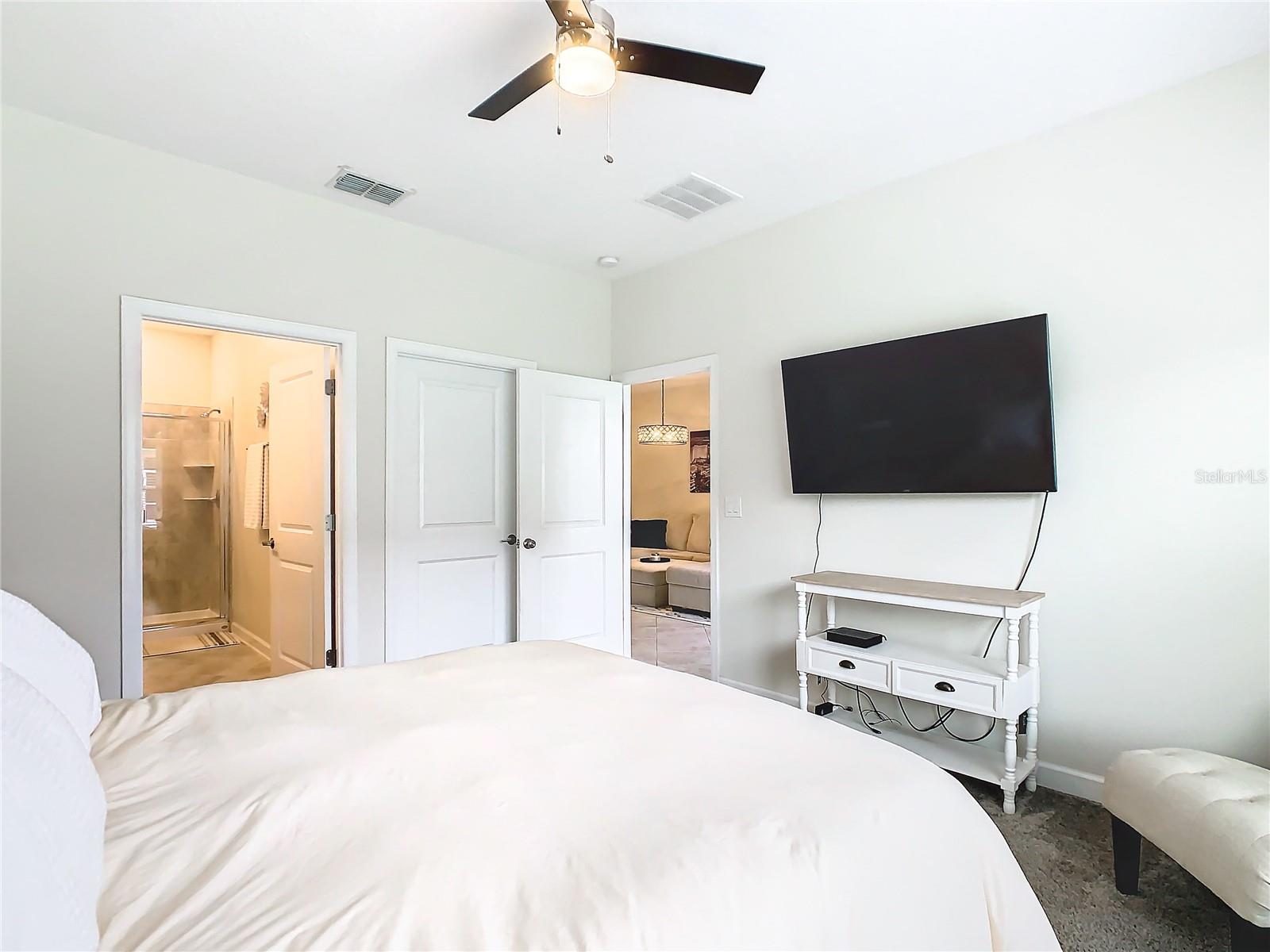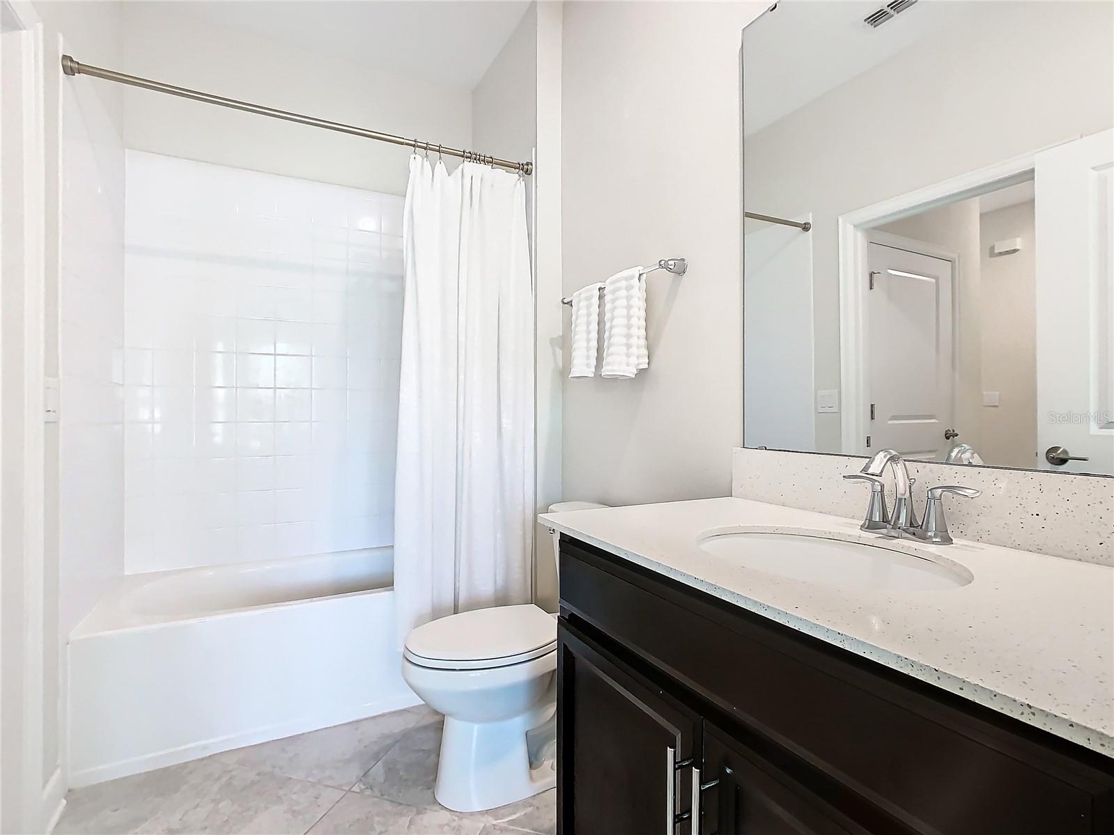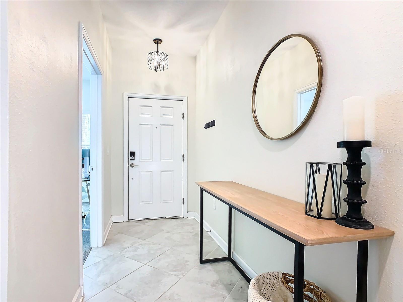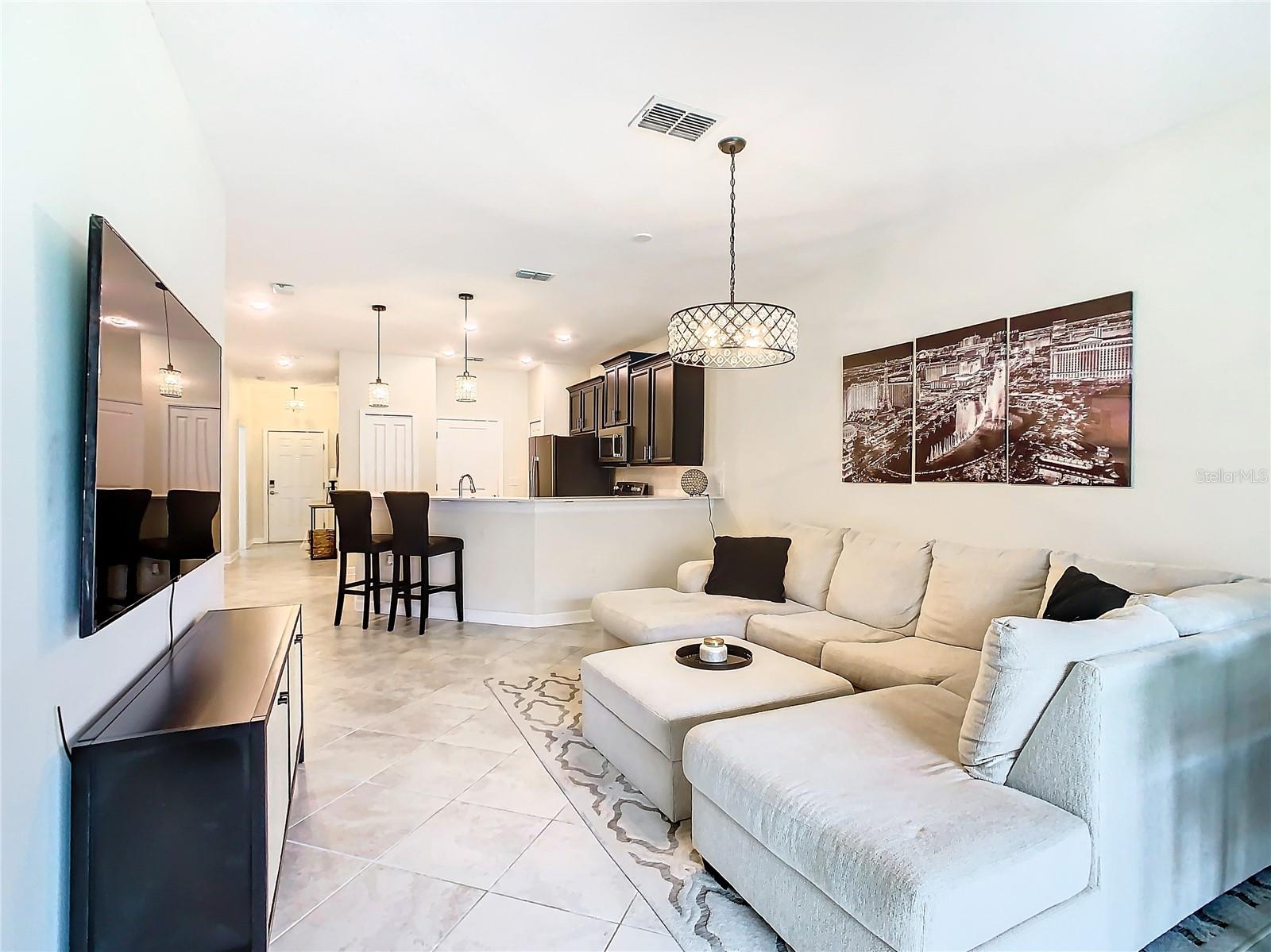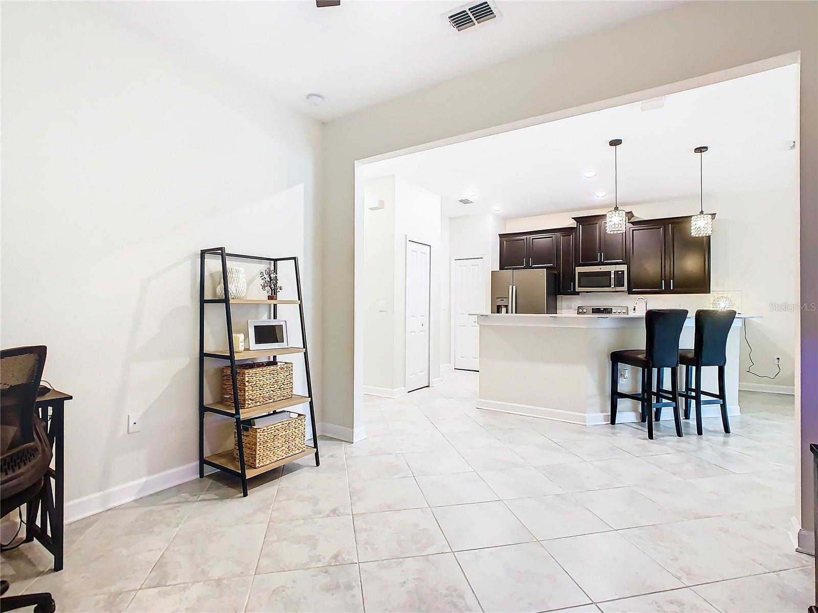 **Golf Membership Included** Welcome to the Villa's at the the Country Club North. Located in the Guard gated community of Champion's Gate is this beautiful 2 bed 2 bath villa, which also features a bonus office/den space which could be utilized as a third bedroom. Before you enter this home you will notice that the home has one of the longest driveways of any villa here, allowing you to park TWO cars instead of one. As you enter the home you will immediately notice the open concept living area and diamond pattern laid tile flooring, throughout the main living area. This home features a split floor plan, with both bedrooms having direct access to a bathroom. Making your way to the kitchen you will notice that Quartz countertops cover the entire kitchen countertop area, and the kitchen is complete with matte finish appliances, which will convey with the sale of the home. This kitchen also features a bar top area, making it a true eat in kitchen, perfect for entertaining. Across from the kitchen you will find the bonus room, currently being utilized as an office, this space could also be used as a formal dining/living room, or could even be turned into a third bedroom. This home features an open concept floor plan, and is perfect for entertaining. Located in the back of the home you will find the primary bedroom, complete with an oversized walk in closet and en-suite bathroom, featuring Quartz countertops and dual sinks. To the rear of the home, off the living room, you will find a wall to wall sliding glass door leading you into your screened in Lanai, allowing you you enjoy peaceful Florida days, bug free. Champion's Gate features an abundance of amenities including two water parks, two fitness centers, pickle ball/tennis courts, Golf, putting green, and also an owners only clubhouse called The Plaza. The Plaza clubhouse is resident only and features two pools, Hottub, gym, saunas, and a resident only bar/reataurant. There is so much to love about Champion's Gate, now is your time to call it home.
