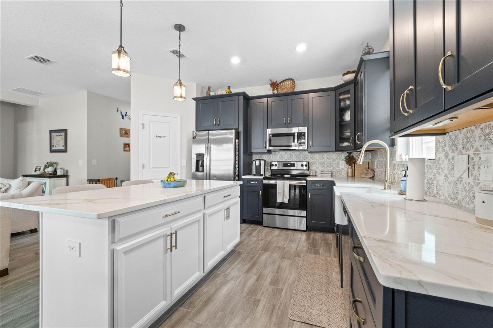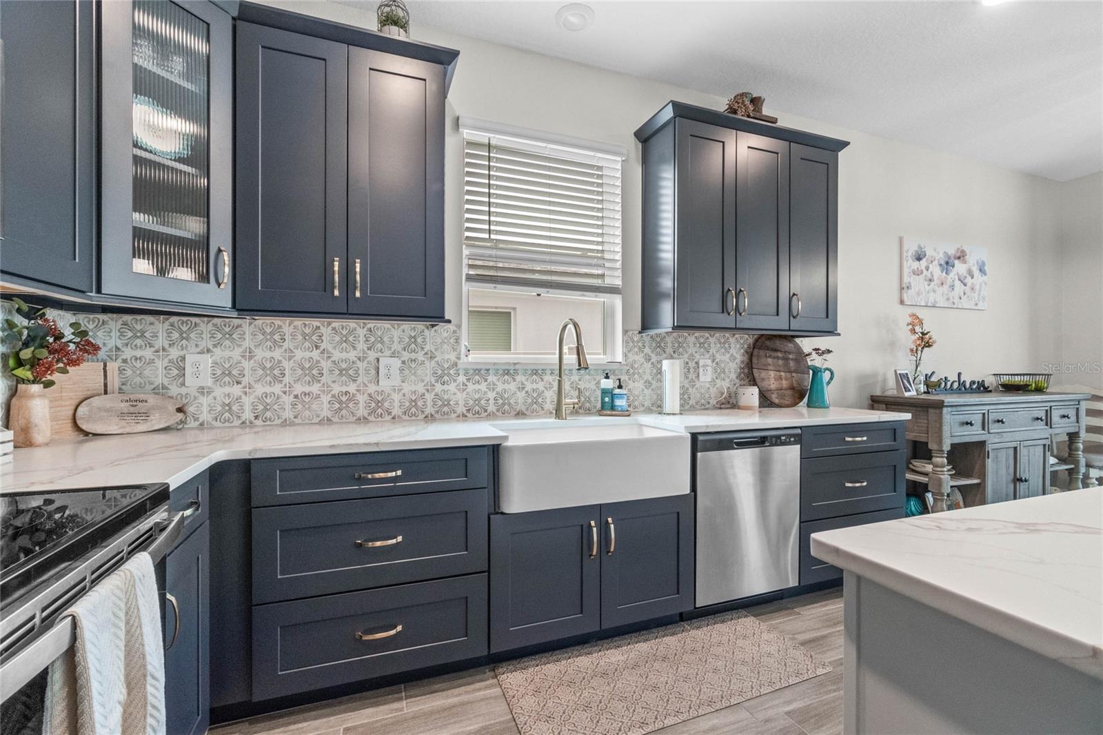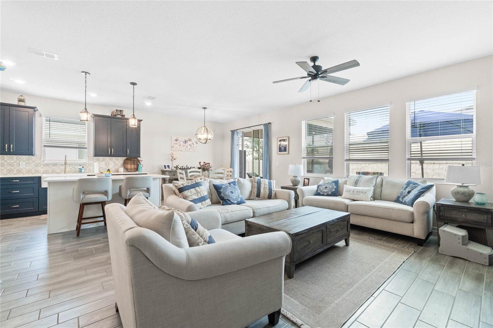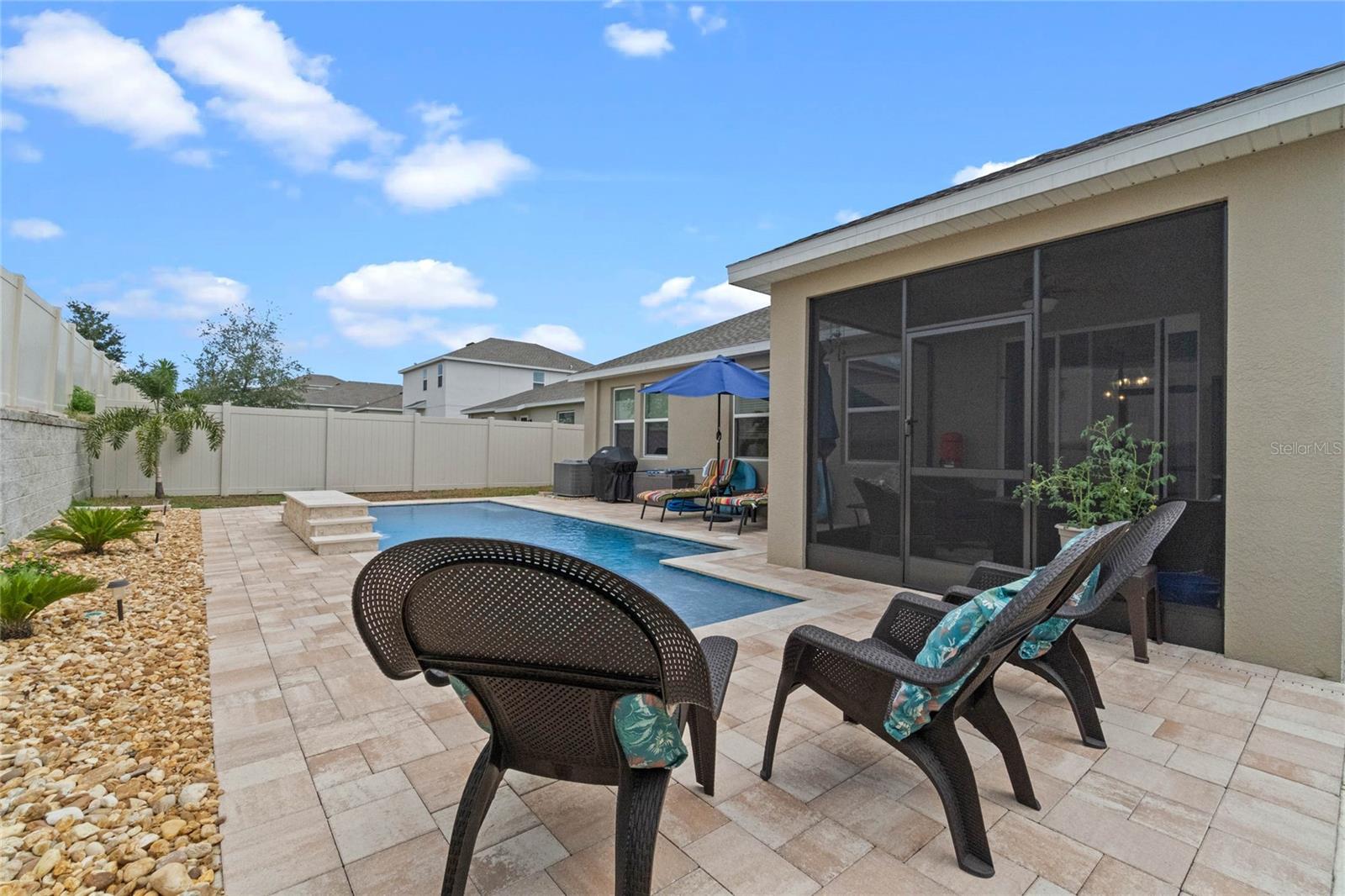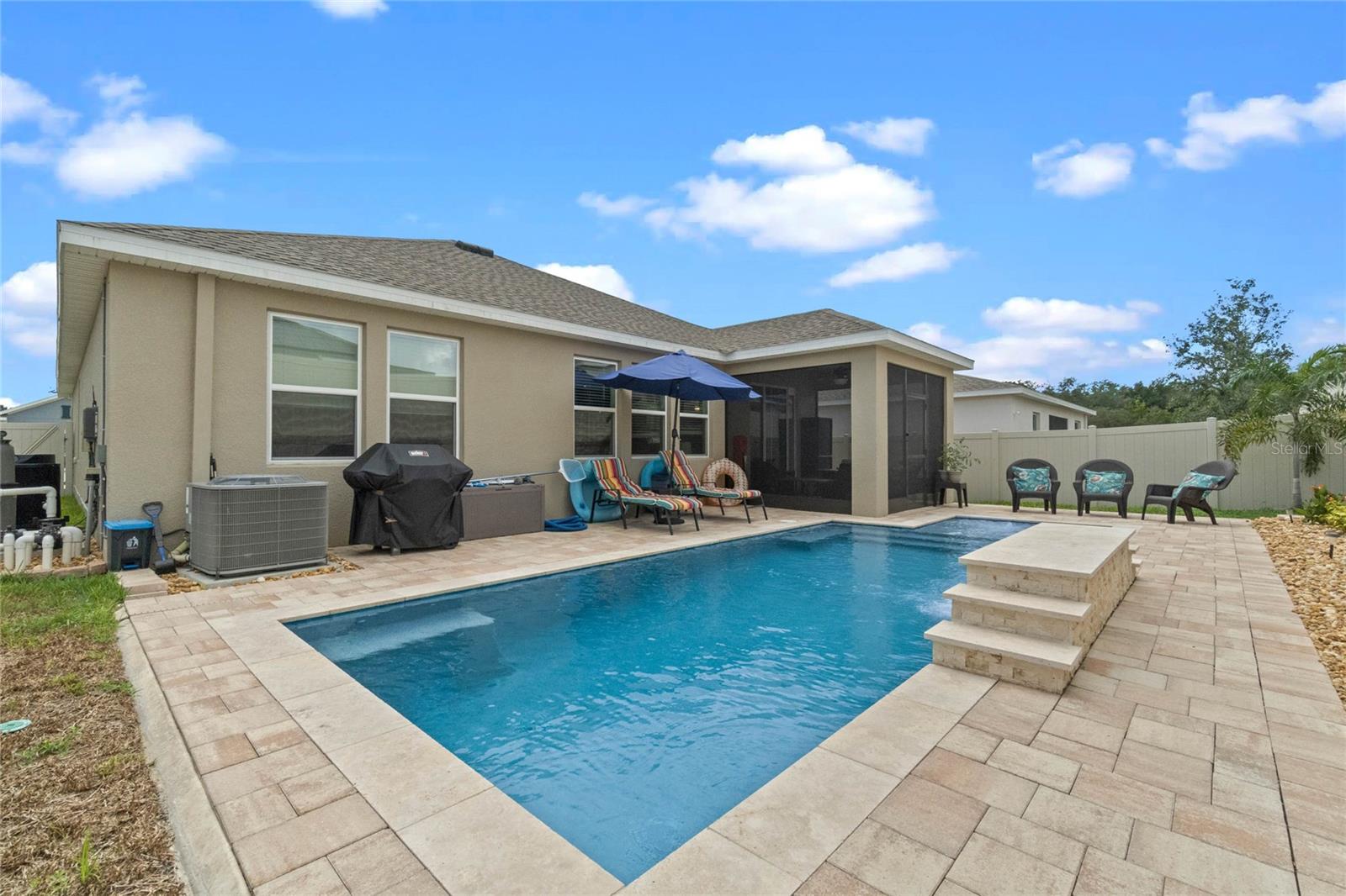 Welcome to 757 Citrus Reserve, a beautifully upgraded 4-bedroom, 2-bathroom home in the heart of Davenport. This property stands out with its thoughtful design choices, modern enhancements, and true Florida living atmosphere. Whether you're a growing family, someone who loves to entertain, or simply looking for a serene retreat, this home has it all. As you approach the property, the curb appeal immediately impresses. The upgraded landscaping creates a lush and inviting exterior, complemented by a striking glass front door that offers a modern touch while allowing natural light to flood the foyer. One of the standout features of this home is its open-concept design, which makes the space feel bright and airy. The kitchen is a chef’s dream, featuring brand-new cabinetry, a farmhouse sink, and stunning waterfall quartz countertops. The wood-look plank tile in the kitchen area adds both durability and elegance, perfect for easy maintenance while delivering a warm, modern aesthetic. For those who appreciate a sleek, organized space, under-cabinet automatic lighting offers an added touch of luxury, ensuring that every corner of the kitchen is well-lit. Adjacent to the kitchen, the dining and living areas flow seamlessly, providing ample room for gatherings. The master suite offers a peaceful retreat with a spacious walk-in closet and plenty of storage space, perfect for keeping your belongings organized. The additional bedrooms are equally well-appointed, offering comfortable spaces for family members or guests. With three full bathrooms, including tastefully upgraded finishes, every family member or visitor will enjoy their own private space. The functional layout makes this home ideal for hosting friends and family. The upgrades continue outside, where you'll find an extended screened-in patio that offers additional living space for relaxing or entertaining year-round. The backyard is a true oasis, featuring a sparkling saltwater pool surrounded by pavers and elegant travertine. The electric pool heater allows for year-round enjoyment, making this outdoor area the perfect spot to unwind after a long day. The fully fenced yard provides privacy and security, making it a great space for pets, children, or simply enjoying the beautiful Florida weather. Additional features of the home include pull-down attic steps with the attic lined in plywood for extra storage space, garage cabinets and shelving for optimal organization, and laundry cabinets for added convenience. The washer and dryer are included, making this home truly move-in ready. Every detail has been carefully considered to maximize storage and functionality. 757 Citrus Reserve is part of a community that offers additional amenities such as a pool, and dog park, making it the perfect environment for family living. The prime location in Davenport provides easy access to nearby schools, shopping centers, restaurants, and major highways, ensuring that everything you need is just a short drive away. This home has been meticulously upgraded and is ready for its next owner to enjoy all the luxury and comfort that it provides. With its modern design, thoughtful upgrades, and unbeatable location, 757 Citrus Reserve is a true Florida oasis waiting to welcome you home. Don't miss the opportunity to make this exceptional property yours!