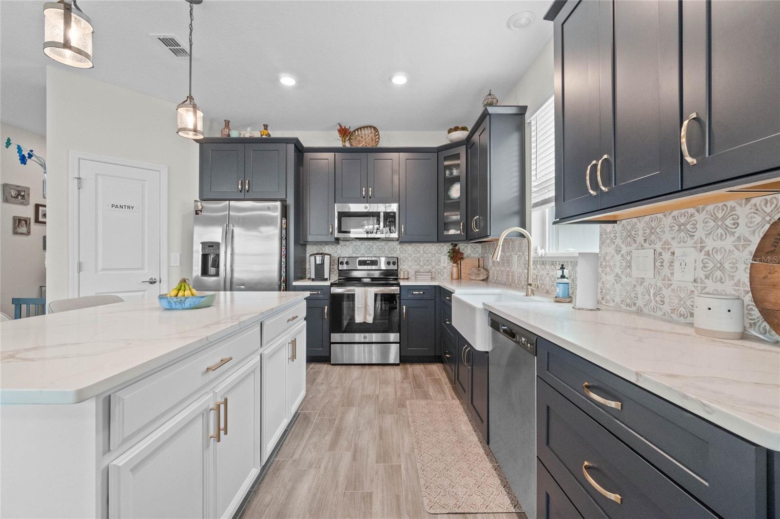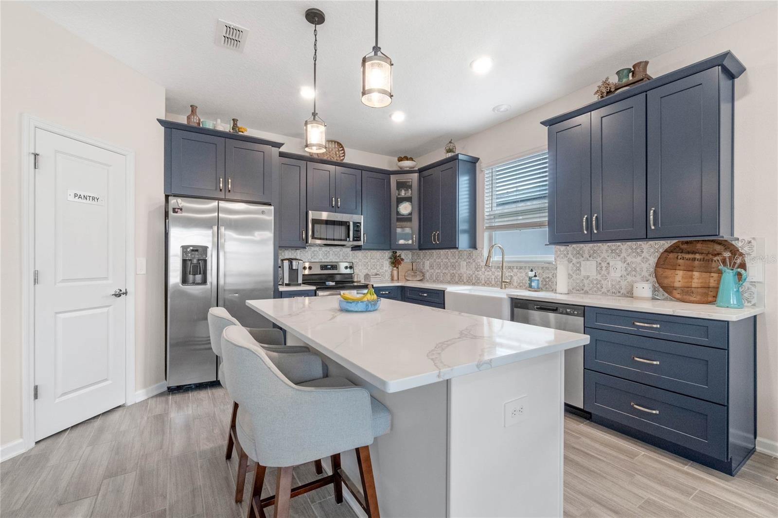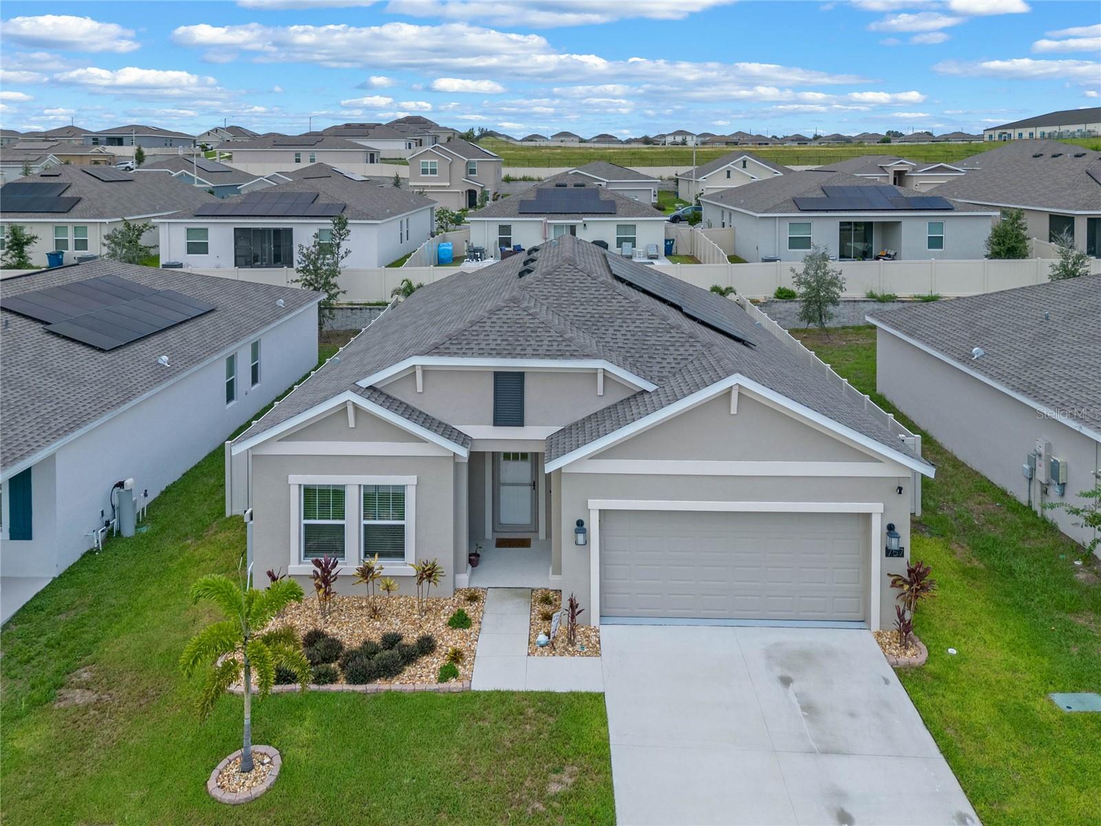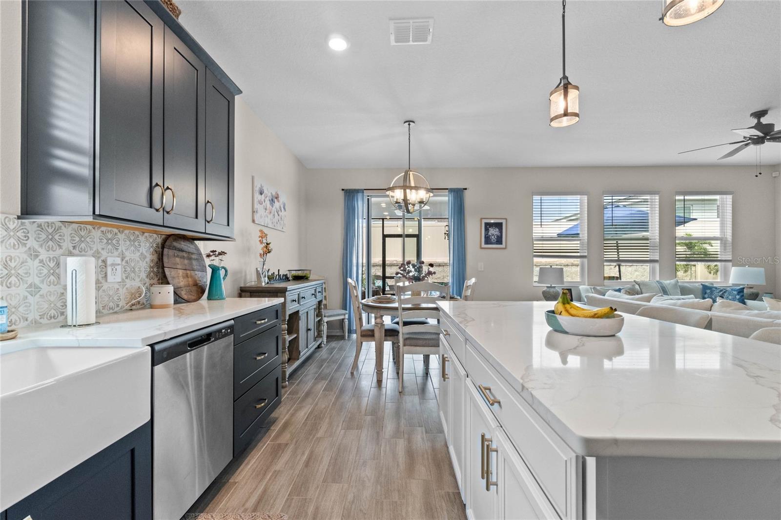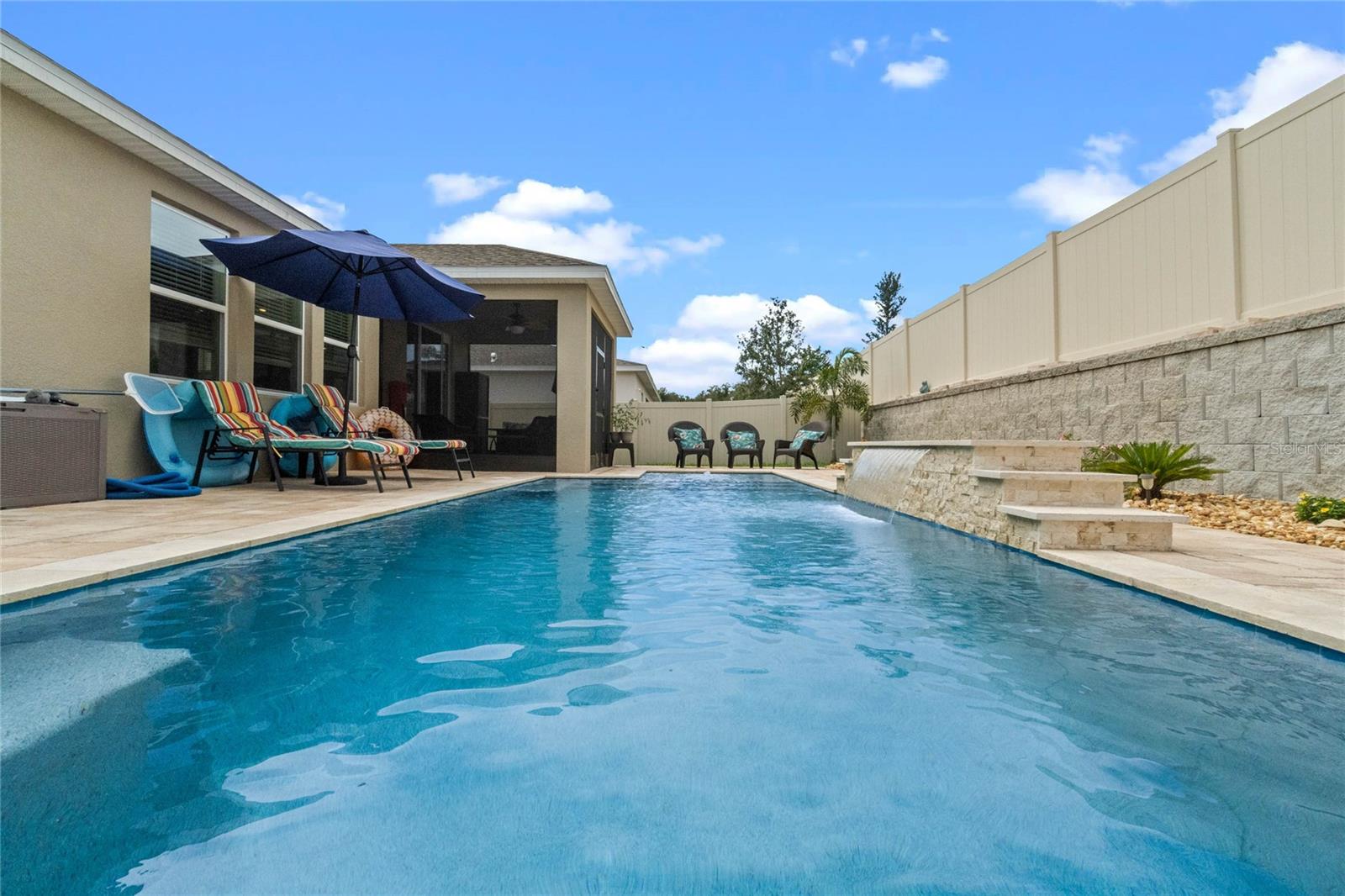 Welcome to 757 Citrus Reserve, a beautifully upgraded 4-bedroom, 2-bathroom home in the heart of Davenport. This property stands out with its thoughtful design choices, modern enhancements, and true Florida living atmosphere. Whether you're a growing family, someone who loves to entertain, or simply looking for a serene retreat, this home has it all. As you approach the property, the curb appeal immediately impresses. The upgraded landscaping creates a lush and inviting exterior, complemented by a striking glass front door that offers a modern touch while allowing natural light to flood the foyer. One of the standout features of this home is its open-concept design, which makes the space feel bright and airy. The kitchen is a chef’s dream, featuring brand-new cabinetry, a farmhouse sink, and stunning waterfall quartz countertops. The wood-look plank tile in the kitchen area adds both durability and elegance, perfect for easy maintenance while delivering a warm, modern aesthetic. For those who appreciate a sleek, organized space, under-cabinet automatic lighting offers an added touch of luxury, ensuring that every corner of the kitchen is well-lit. Adjacent to the kitchen, the dining and living areas flow seamlessly, providing ample room for gatherings. The master suite offers a peaceful retreat with a spacious walk-in closet and plenty of storage space, perfect for keeping your belongings organized. The additional bedrooms are equally well-appointed, offering comfortable spaces for family members or guests. With three full bathrooms, including tastefully upgraded finishes, every family member or visitor will enjoy their own private space. The functional layout makes this home ideal for hosting friends and family. The upgrades continue outside, where you'll find an extended screened-in patio that offers additional living space for relaxing or entertaining year-round. The backyard is a true oasis, featuring a sparkling saltwater pool surrounded by pavers and elegant travertine. The electric pool heater allows for year-round enjoyment, making this outdoor area the perfect spot to unwind after a long day. The fully fenced yard provides privacy and security, making it a great space for pets, children, or simply enjoying the beautiful Florida weather. Additional features of the home include pull-down attic steps with the attic lined in plywood for extra storage space, garage cabinets and shelving for optimal organization, and laundry cabinets for added convenience. The washer and dryer are included, making this home truly move-in ready. Every detail has been carefully considered to maximize storage and functionality. 757 Citrus Reserve is part of a community that offers additional amenities such as a pool, and dog park, making it the perfect environment for family living. The prime location in Davenport provides easy access to nearby schools, shopping centers, restaurants, and major highways, ensuring that everything you need is just a short drive away. This home has been meticulously upgraded and is ready for its next owner to enjoy all the luxury and comfort that it provides. With its modern design, thoughtful upgrades, and unbeatable location, 757 Citrus Reserve is a true Florida oasis waiting to welcome you home. Don't miss the opportunity to make this exceptional property yours!