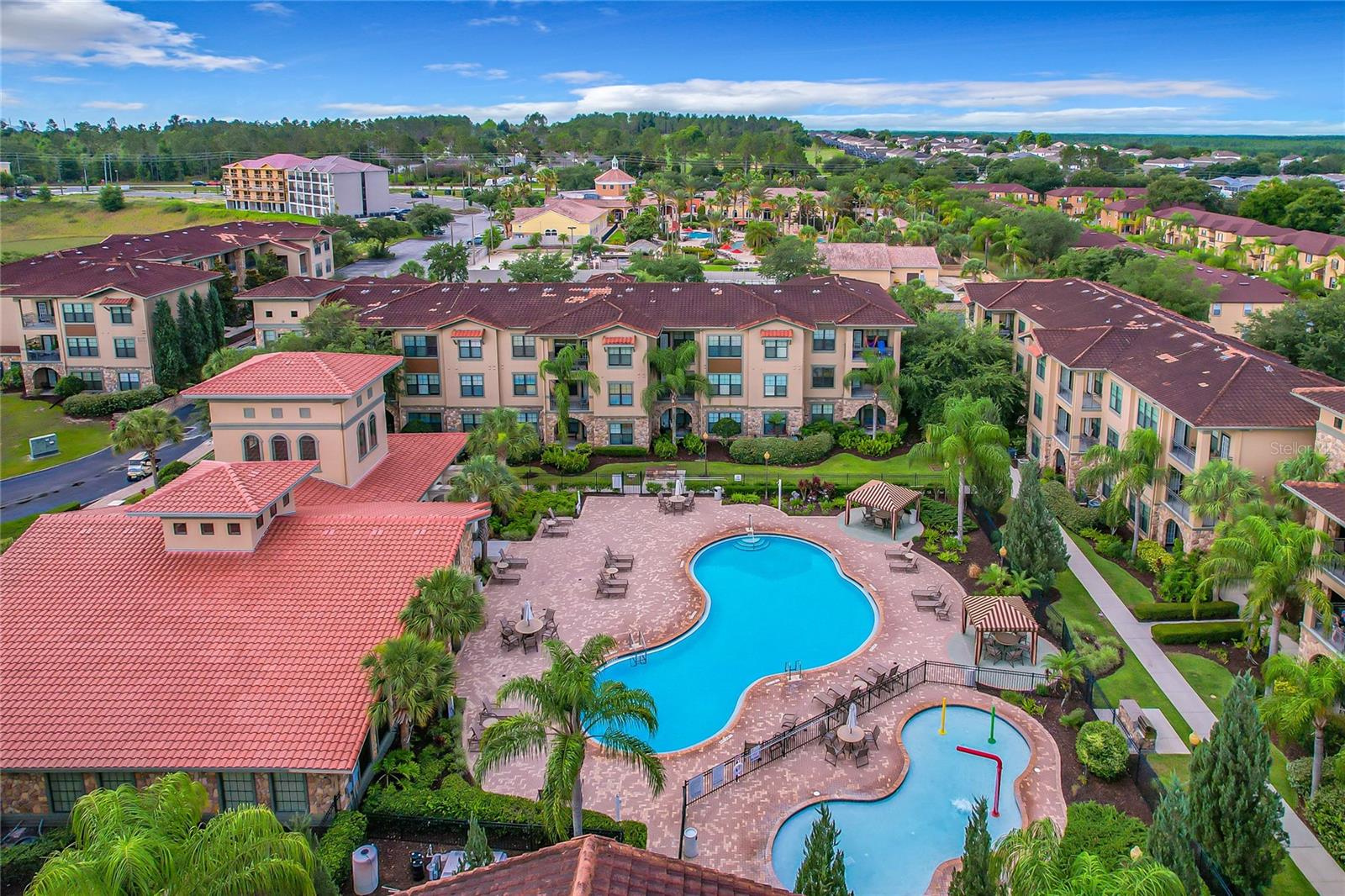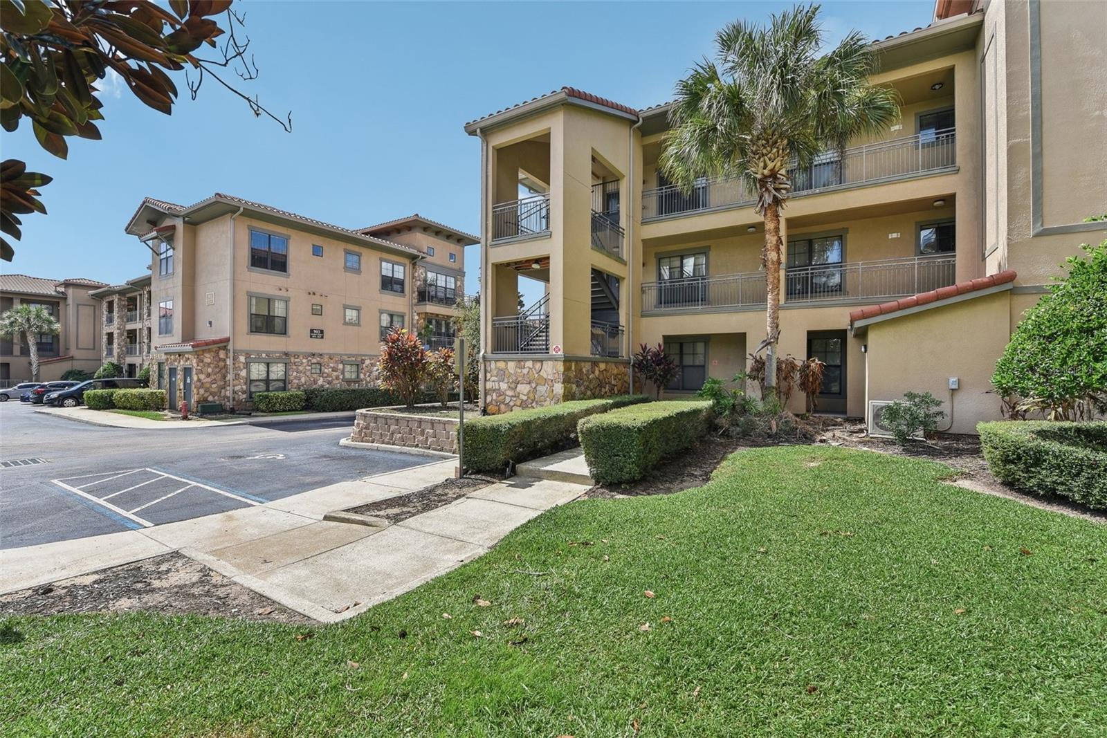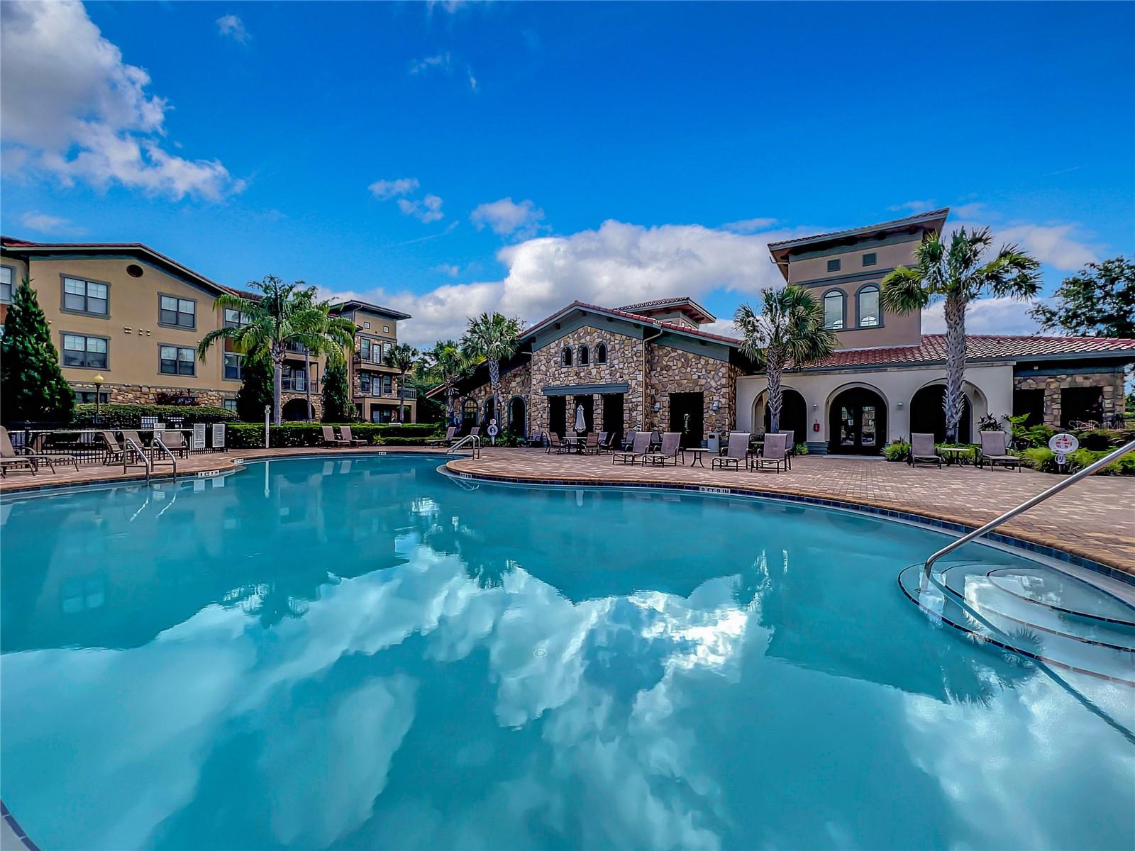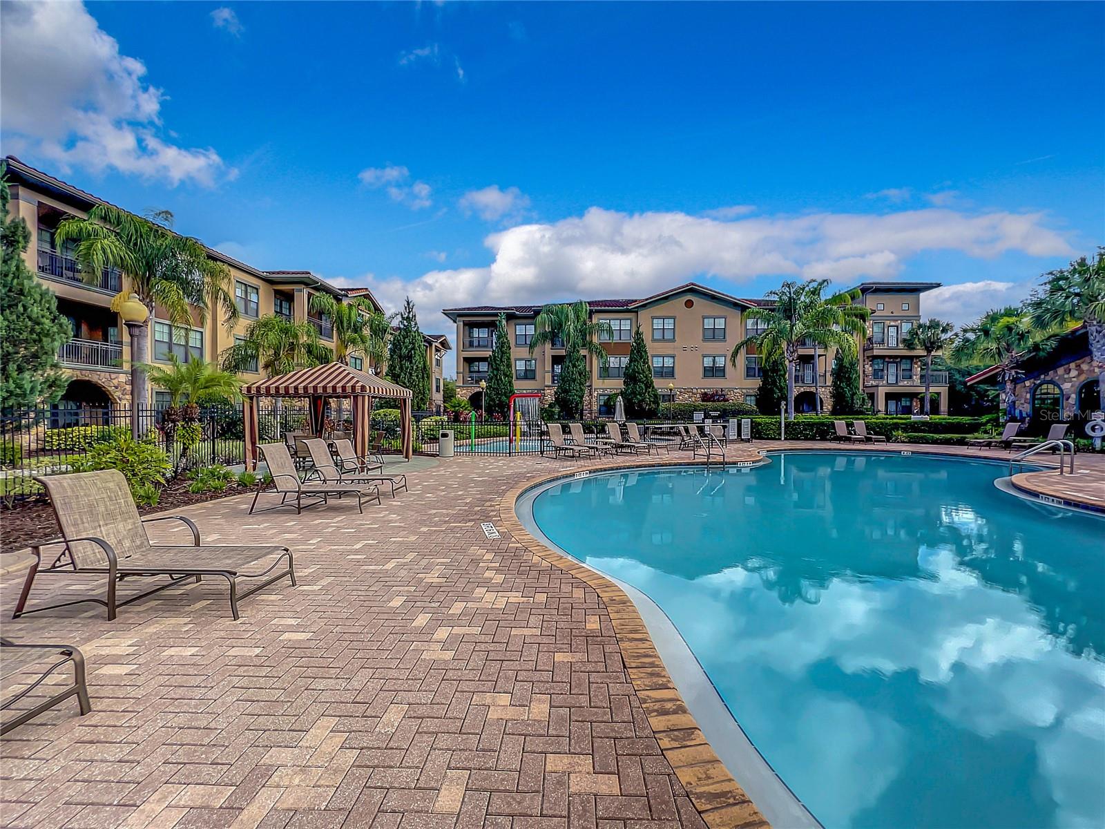 Welcome to Bella Piazza, a Tuscan-style resort and is great for short term vacation leasing, long term tenants, or make it your permanent residence! This is a 2 bedroom / 2 bathroom end unit on the 3rd floor (top floor) of a building close to the main exit, allowing for easy in and out for the community! And yes, the building does have an elevator, so no need to worry about carrying groceries or luggage up the stairs! Step in through the front door into the main living space. This floor plan is split, with the left side of the condo being the living space, and the right side the bedrooms and bathrooms. The kitchen, dining area, and living room all flow together. You will notice the high-end touches in this condo include crown molding, granite countertops, and solid wood cabinets. In addition to the dining room table, there is additional seating in the breakfast bar as well! And through the living room, you also have access to the covered balcony. If you turn right, you will find the 2nd bedroom as well as the 2nd bathroom. This bathroom is not ensuite, but rather right next to the bedroom, meaning easy access for those staying in the 2nd bedroom but also the convenience of not going through a bedroom during the day! Between the two bedrooms is a closet that houses the stackable washer and dryer. The master suite is at the back of the unit and features a large closet and an ensuite bathroom, with garden tub and separate tile shower. You can also access the balcony through this bedroom as well! The owners recently replaced the carpets in the home with luxury vinyl plank, and the home has a BRAND NEW hot water heater! This condo is being sold fully furnished and turnkey! The community features two separate pools, one in the main clubhouse area, and another the next building over. The clubhouse requires key access, and has a business center, fitness center, large patio space, and pools. Monthly condo fee includes cable, internet, trash, and water! Schedule your showing today!