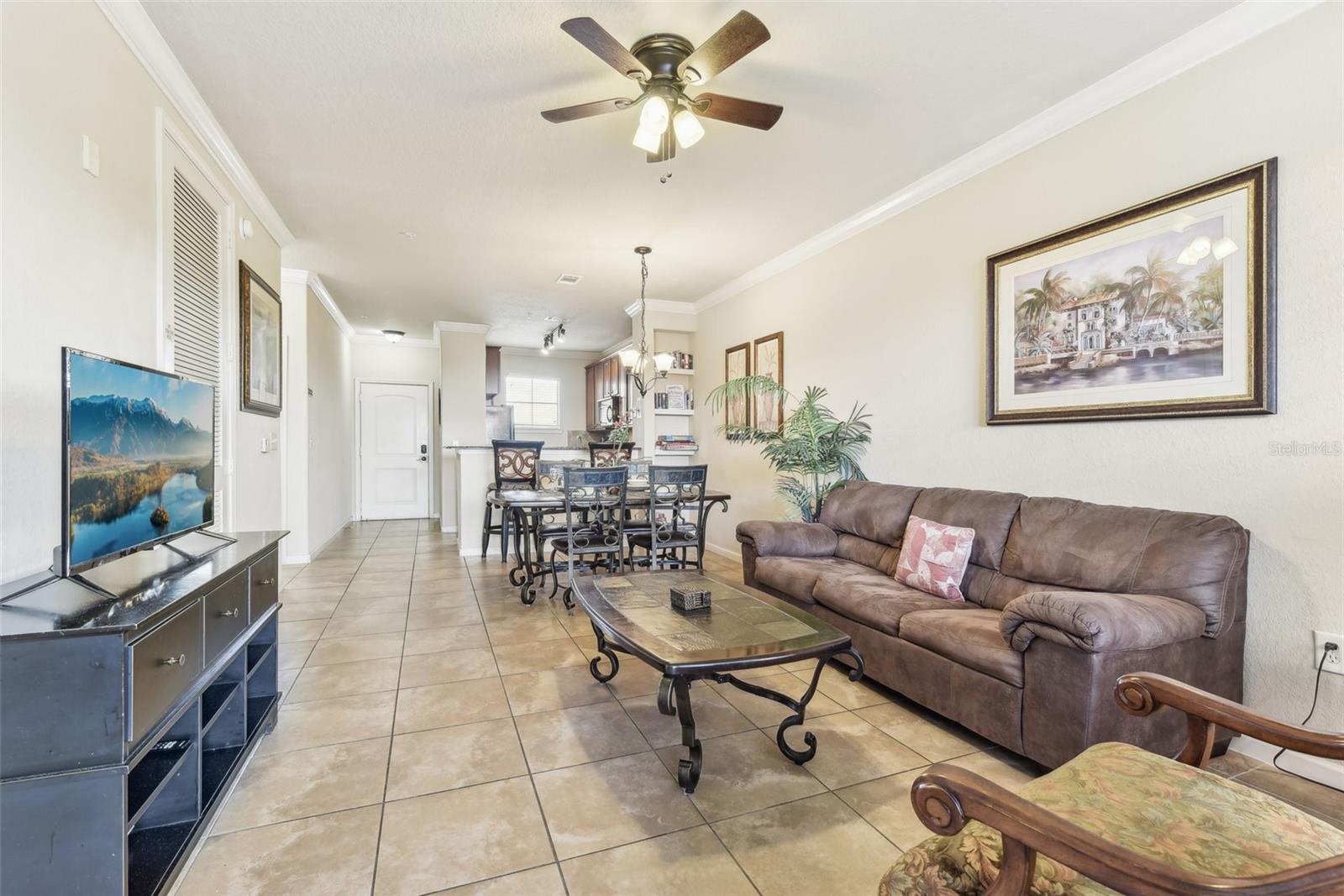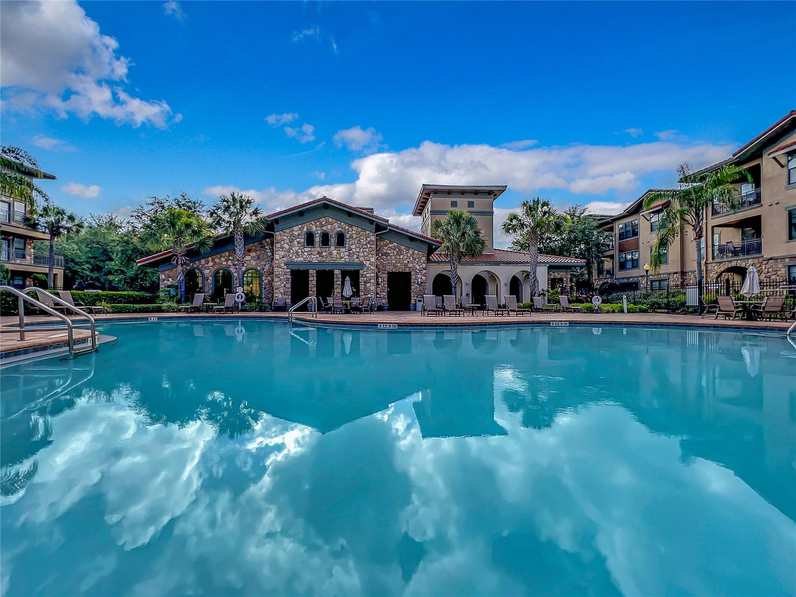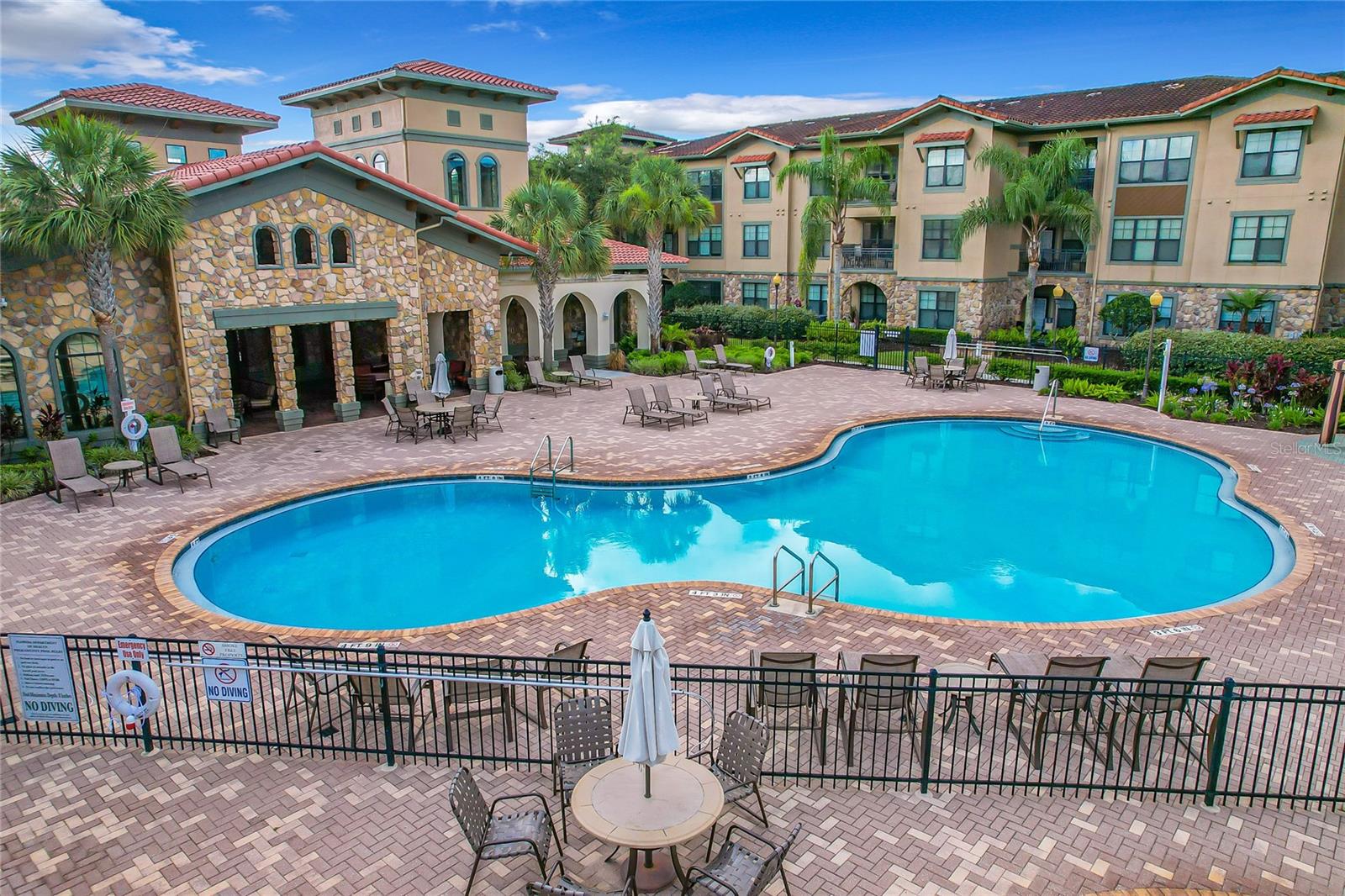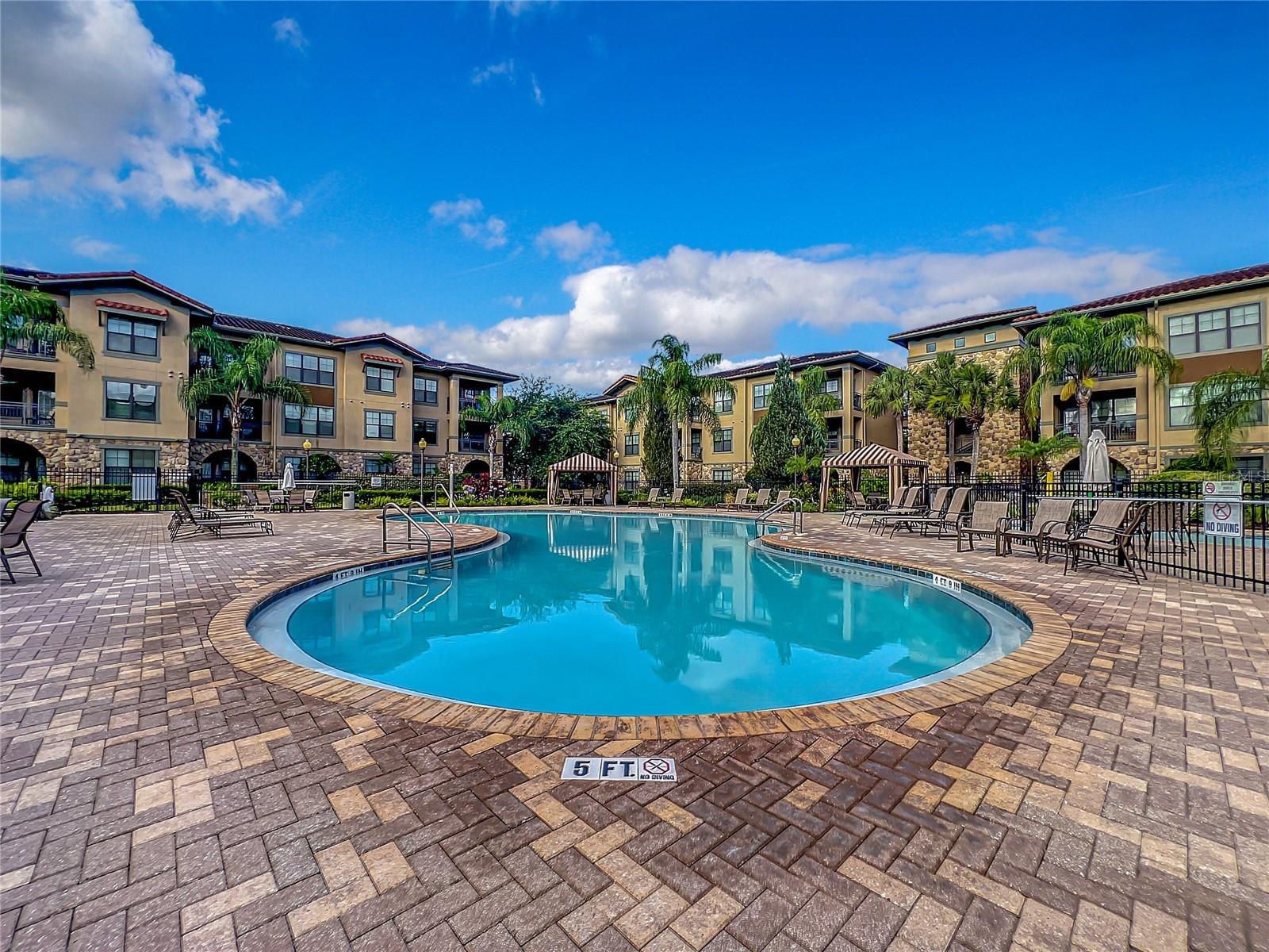 Welcome to Bella Piazza, a Tuscan-style resort and is great for short term vacation leasing, long term tenants, or make it your permanent residence! This is a 2 bedroom / 2 bathroom end unit on the 3rd floor (top floor) of a building close to the main exit, allowing for easy in and out for the community! And yes, the building does have an elevator, so no need to worry about carrying groceries or luggage up the stairs! Step in through the front door into the main living space. This floor plan is split, with the left side of the condo being the living space, and the right side the bedrooms and bathrooms. The kitchen, dining area, and living room all flow together. You will notice the high-end touches in this condo include crown molding, granite countertops, and solid wood cabinets. In addition to the dining room table, there is additional seating in the breakfast bar as well! And through the living room, you also have access to the covered balcony. If you turn right, you will find the 2nd bedroom as well as the 2nd bathroom. This bathroom is not ensuite, but rather right next to the bedroom, meaning easy access for those staying in the 2nd bedroom but also the convenience of not going through a bedroom during the day! Between the two bedrooms is a closet that houses the stackable washer and dryer. The master suite is at the back of the unit and features a large closet and an ensuite bathroom, with garden tub and separate tile shower. You can also access the balcony through this bedroom as well! The owners recently replaced the carpets in the home with luxury vinyl plank, and the home has a BRAND NEW hot water heater! This condo is being sold fully furnished and turnkey! The community features two separate pools, one in the main clubhouse area, and another the next building over. The clubhouse requires key access, and has a business center, fitness center, large patio space, and pools. Monthly condo fee includes cable, internet, trash, and water! Schedule your showing today!