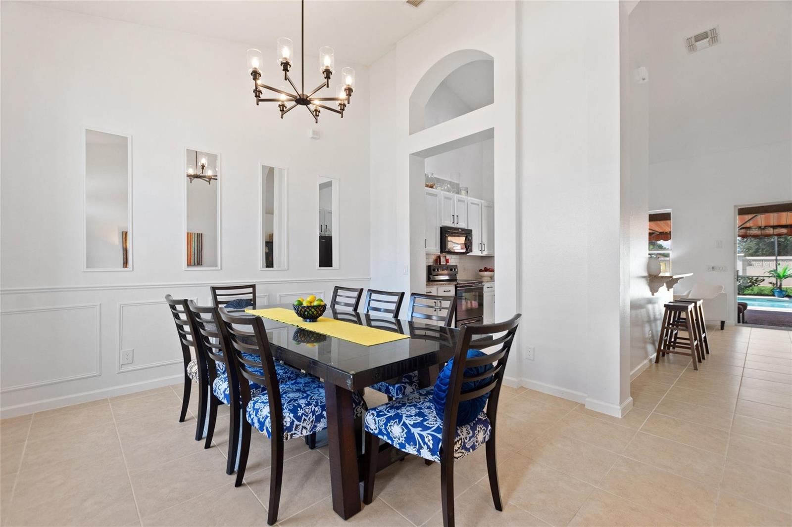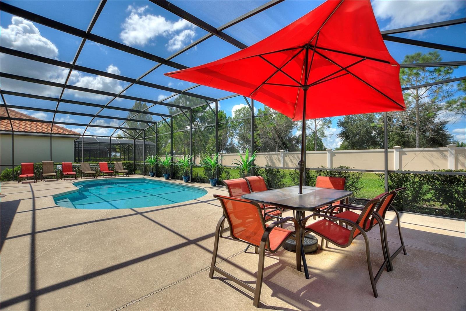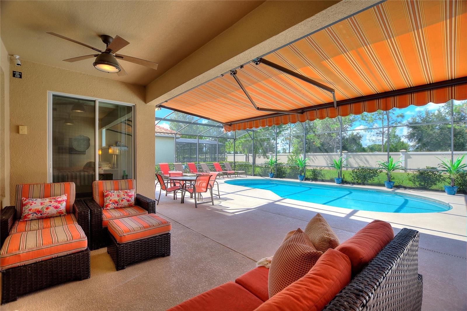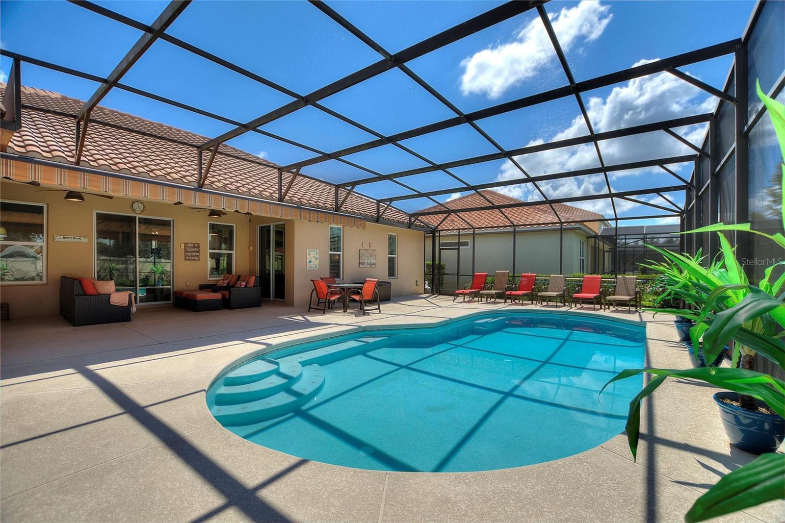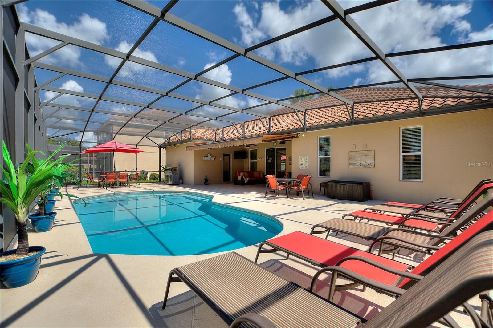 Welcome to this stunning, single-level 5-bedroom home, where every detail is crafted for both comfort and style. The moment you step inside, vaulted ceilings and an open, airy layout invite you into a space perfect for both relaxation and lively gatherings. The formal dining room, which seats eight, flows seamlessly into a spacious living area designed for entertaining, while the sparkling, fully equipped kitchen and chic bar area ensure you’re always at the heart of the action. Outside, an expansive pool deck surrounds the oversized 15’x30’ pool, offering space for six lounge chairs, two dining tables for ten, and a cozy outdoor living room under roof, complete with a wall-mounted TV. A sleek, remote-controlled retractable Venetian-style awning adds a touch of luxury to your outdoor experience, making this home ideal for enjoying both quiet mornings and fun-filled afternoons with family and friends. Perfectly maintained and filled with flawless, timeless furnishings, this home offers a sleek yet laid-back vibe, creating the perfect retreat for both residents and guests. Impeccable care has been given to every aspect of this home, making it truly one of a kind. Beyond the home, you’ll find yourself in a vibrant community known for its fun, resort-style amenities. Whether you’re floating along the Lazy River, zipping down the Resort Slide, playing volleyball in the pool, or enjoying a match on the tennis courts, the options for recreation are endless. The clubhouse offers a fitness center and an on-site café, making it easy to embrace an active, social lifestyle. And just minutes away, you’ll find championship golf courses, fabulous restaurants, and shopping, providing the ultimate in convenience and entertainment. This home and community strike the perfect balance between sophistication and fun, making it an ideal place to live, relax, and entertain.