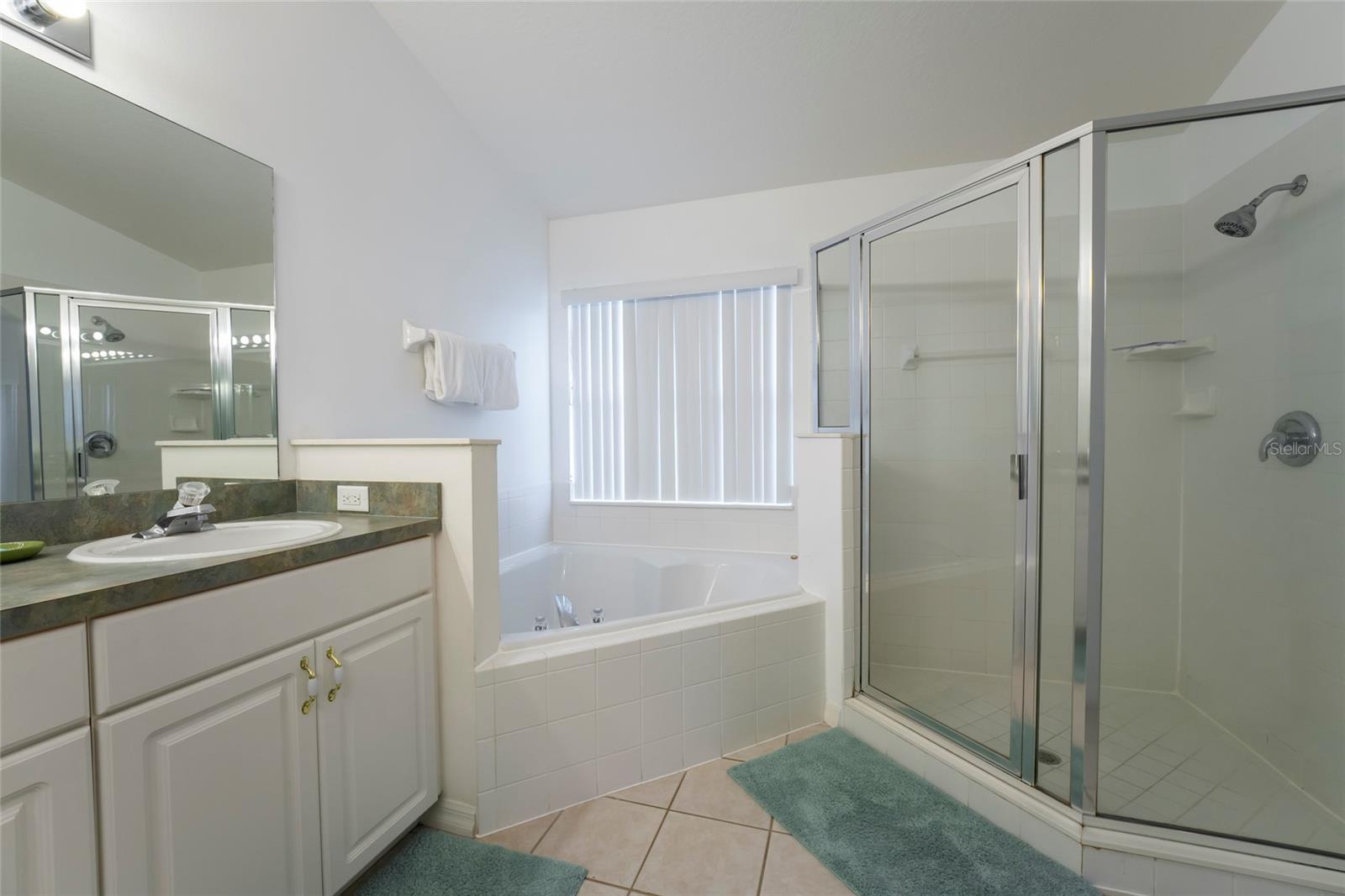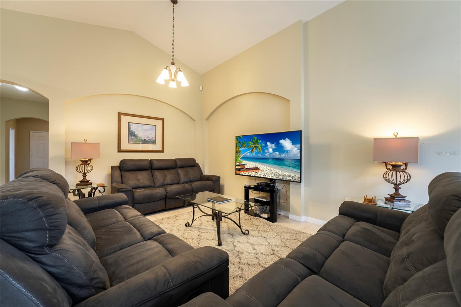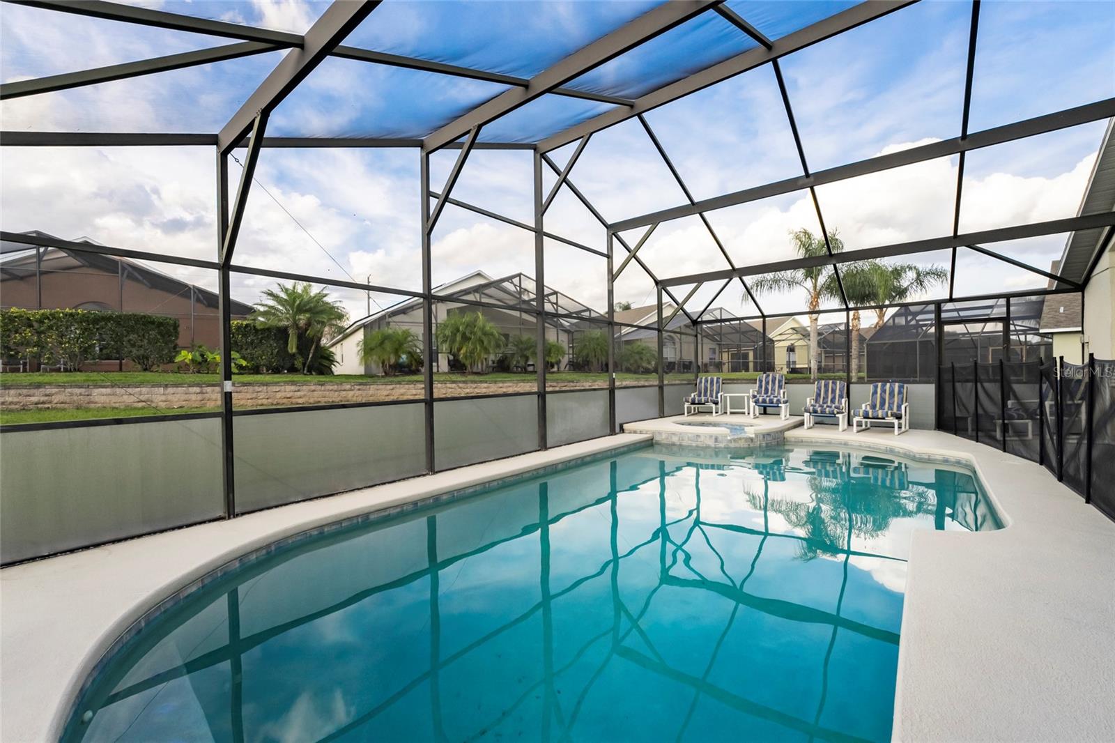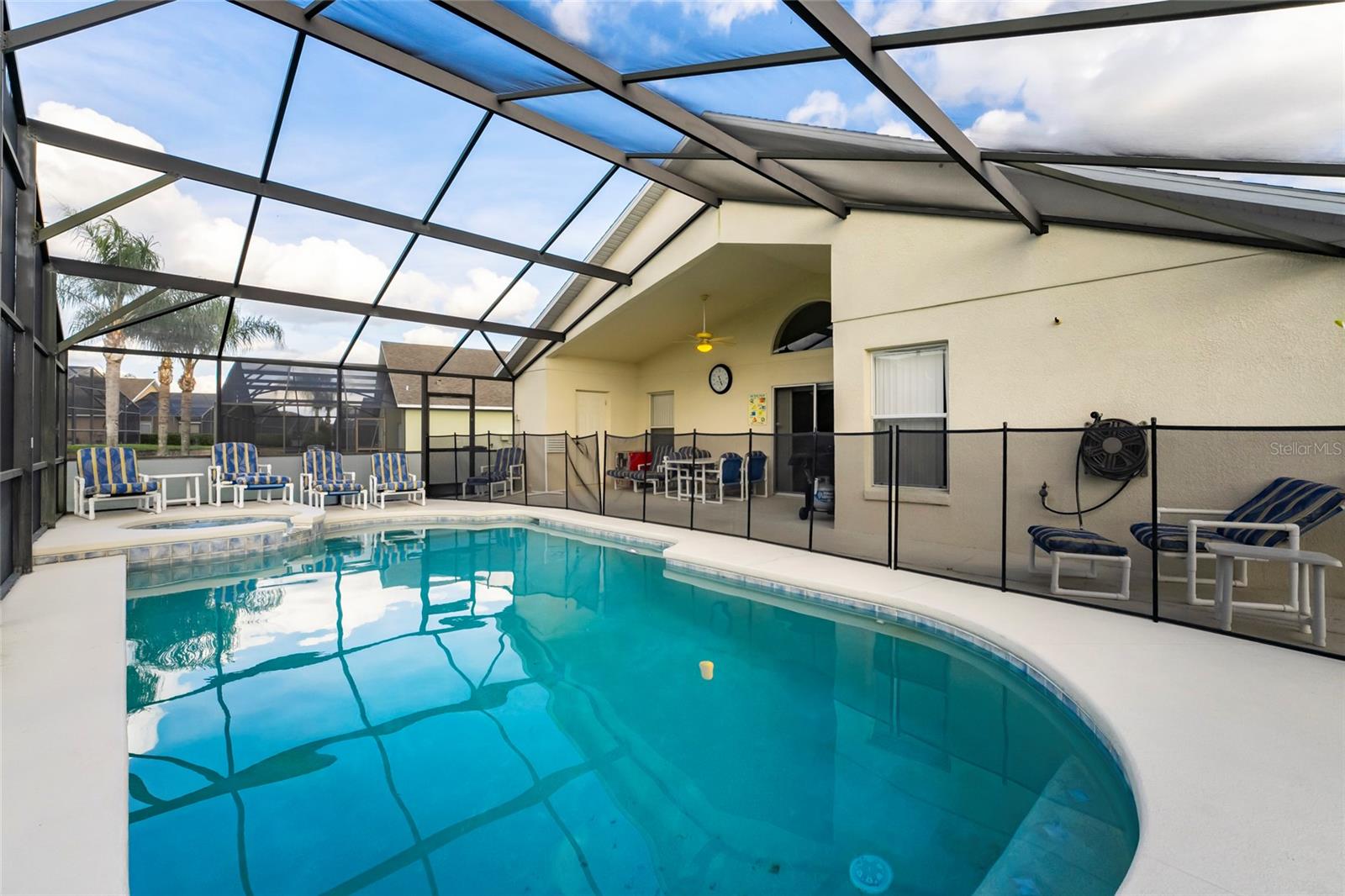 Great location for your vacation home purchase or residence. 4-bedrooms and 3 baths on a single level in a gated community, located just moments from popular theme parks. This property comes fully furnished with rentals in place that may convey with sale. The spacious layout features a distinct dining area separate from the kitchen, complemented by a cozy breakfast nook for casual meals. A conveniently located bathroom serves the pool area, enhancing the indoor-outdoor living experience. The thoughtful split floorplan ensures privacy for all guests, while the primary bedroom boasts an en-suite bathroom with double vanities, a garden tub, and a walk-in shower. Outdoors, you can unwind in both the community pool and your own private, heated, and enclosed pool and spa, perfect for year-round relaxation. New roof 09/2024