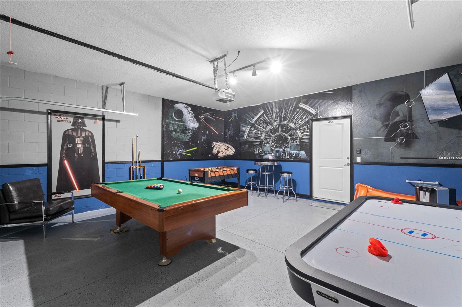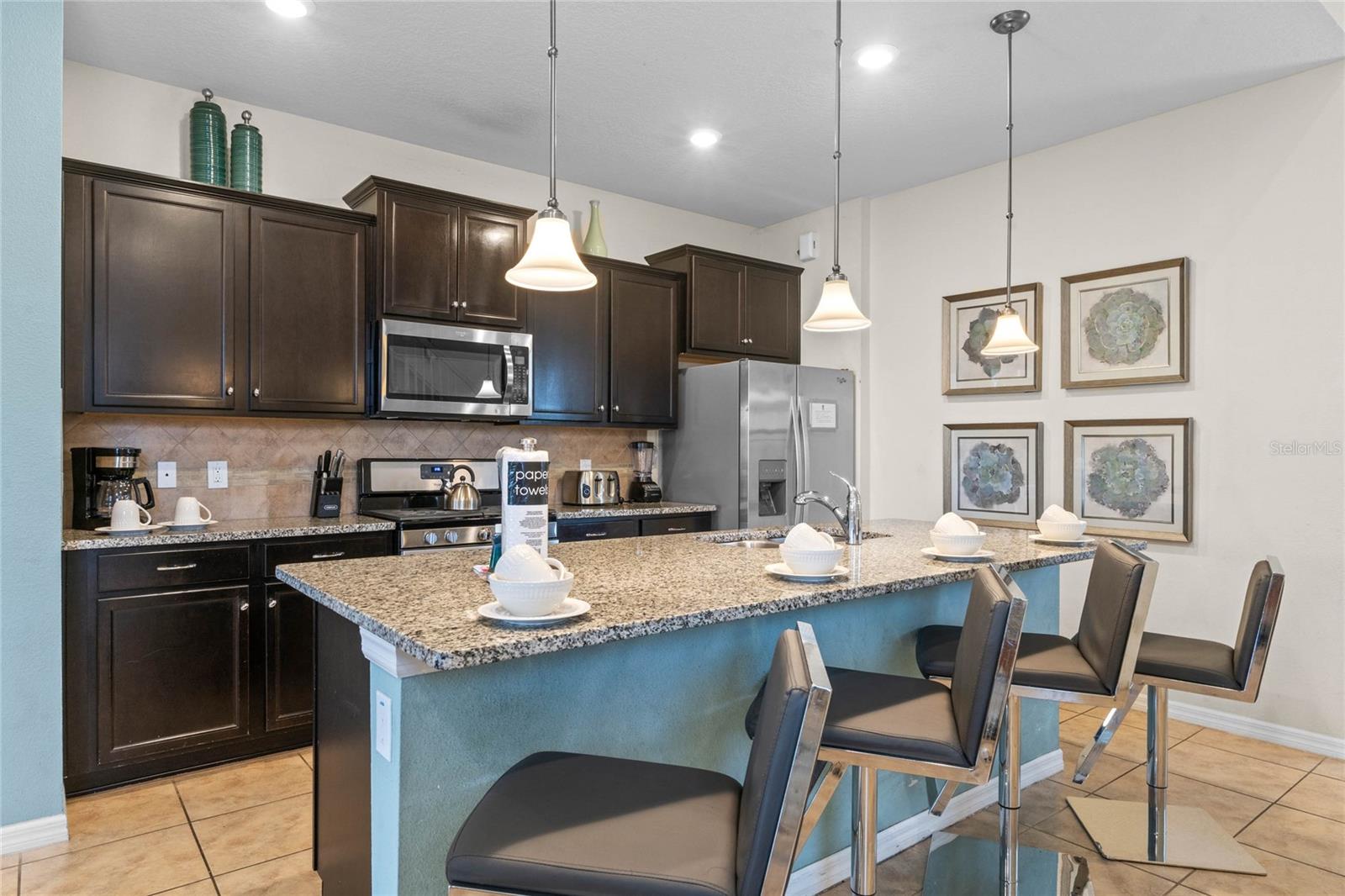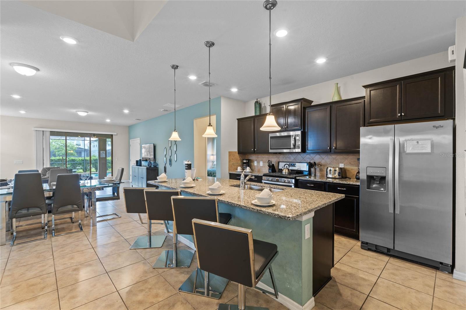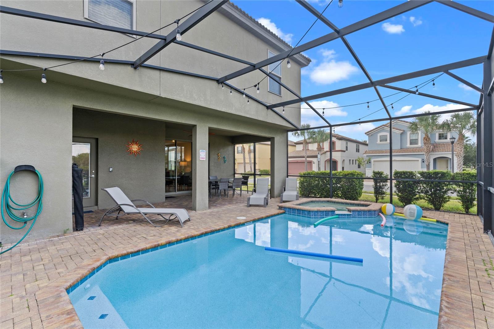 You have found it!!!!! This is an amazing 7 bed, 5.5 bath home in the exclusive Solterra resort. Currently being used as a vacation home, this wonderful home has been professionally decorated and no expense has been spared to make it a very special place to stay. With a wonderful floor plan...the home has a lovely flow.... as you enter through the lobby, there is a bright and airy kitchen with stainless steel appliances and granite worktops, the large island/ breakfast bar is a great place to sit with a cup of coffee in the morning and plan the day, the dining area leads into the large open plan living area that overlooks the sunny pool deck. This home has two master suites, one downstairs and one upstairs, the large master suite downstairs has an ensuite bathroom, with dual vanities and also access to the pool deck. Upstairs the primary bedroom also has a large spa like bathroom; Bedroom 3 is also ensuite, Bedroom 4 & 5 share a bathroom. All the bedrooms are stylishly decorated and a good size, the two themed twin bedrooms will delight the younger visitors and these twin rooms also share a bathroom. The large loft upstairs is spacious and comfortable and is a great extra living space. Back downstairs, the sunny pool deck has a lanai that allows for al fresco dining and the sparkling blue pool and spa is a great place to cool off after topping up your tan. The garage has been converted into a fabulous games room with a Star Wars theme, the perfect place for all ages!! Solterra is an exclusive community close to shops, restaurants and the world-famous Florida theme parks. HOA fees include Internet, Yard maintenance, Trash, 24-hour guard & use of the facilities/ amenities. The amenities in this guard gated community include a 5600 sq.ft. clubhouse, Beach entry resort-style pool complete with a waterslide, lazy river, and water playground. The poolside bar & grill lounge serves food for poolside dining as you relax, there is also a fitness center, tennis courts, and the Solterra Club Trail. If you are looking for a short term rental home then you can't miss this one!!! This is a fabulous home, it is being sold as you see it…. fully furnished. Call for a showing today.