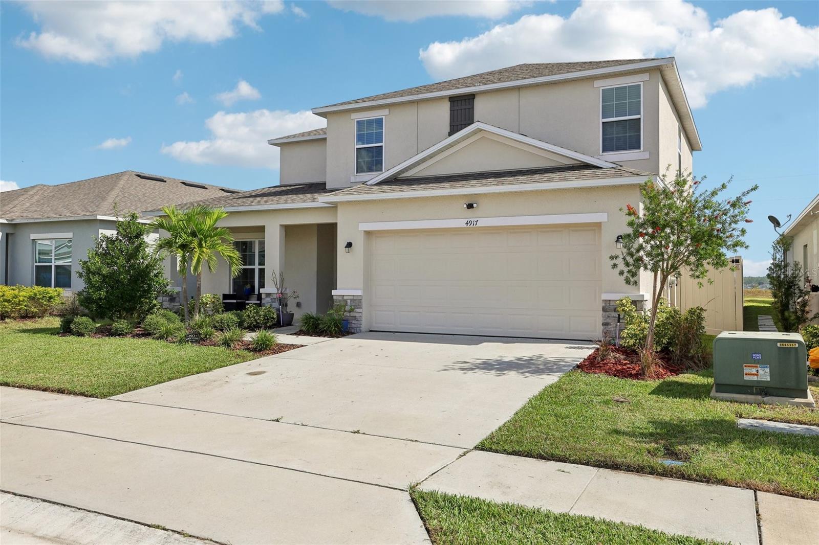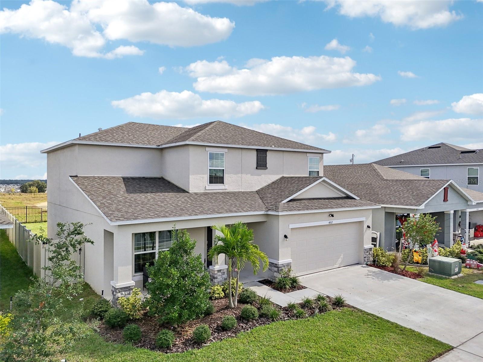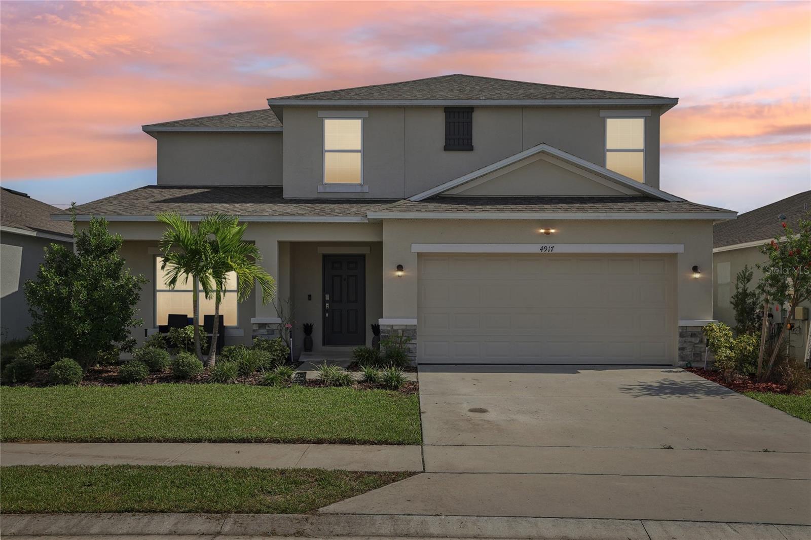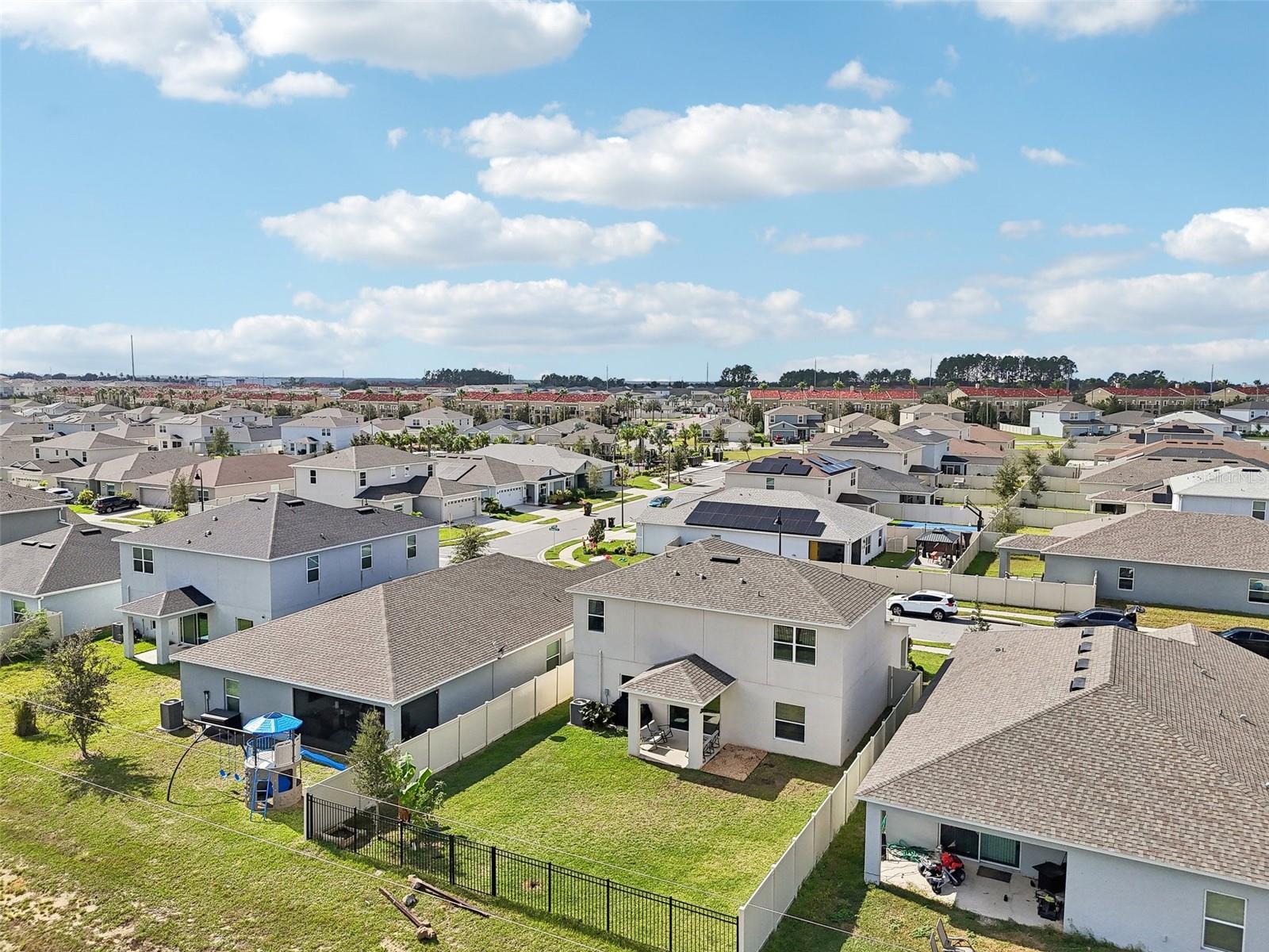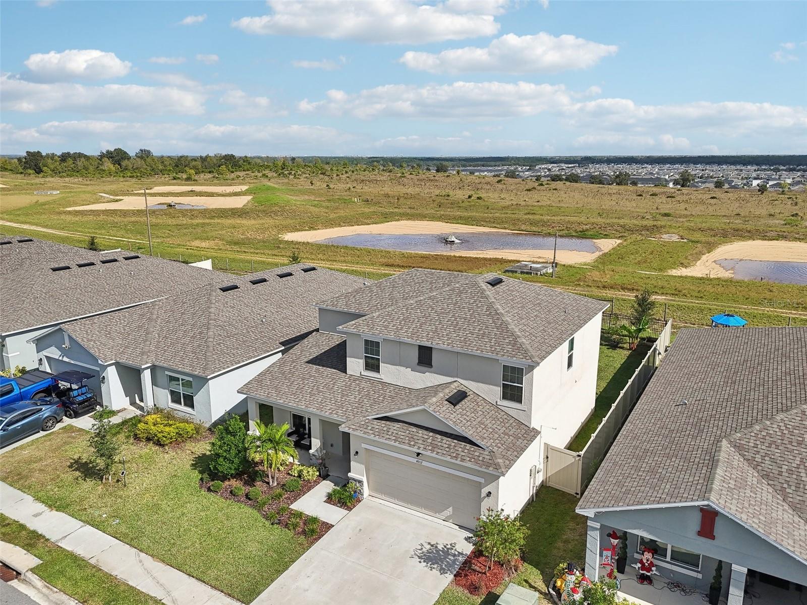 Welcome to this beautifully maintained 5-bedroom, 3- full bathroom home with a two car garage, offering both comfort and style located in Tierra Del Sol. The open floor plan seamlessly connects the spacious living areas, providing the perfect setting for family gatherings and entertaining. The kitchen is a true highlight, featuring stunning cabinets, sleek quartz countertops, and stainless steel appliances. This home boasts a versatile flex room that can easily serve as an office, den, or playroom, offering added flexibility to suit your needs. The downstairs bedroom offers both privacy and convenience, making it ideal for guests, in-laws, or anyone who prefers easy access to a full bathroom without the need to go upstairs. The master bedroom located upstairs along with the other three bedrooms is a true retreat, offering plenty of space to unwind and relax. Featuring a generously sized closet, there’s no shortage of storage for your wardrobe and personal items. The adjoining master bathroom is equally impressive, with elegant finishes and a thoughtful layout. Enjoy privacy with a separate toilet area, and indulge in the luxurious feel of this beautifully appointed bathroom. It’s the perfect place to start and end your day in comfort. With no rear neighbors, you’ll enjoy privacy in your backyard, which is watered by an irrigation system using reclaimed water—an eco-friendly feature you’ll appreciate. Relax and unwind on your covered front porch or rear lanai if you desire more privacy, both perfect for enjoying the beautiful Florida weather. This home features Florida-friendly landscaping in the front yard, enhancing curb appeal while being low maintenance. Enjoy sunny Florida days by taking a dip in the community pool, perfect for cooling off and relaxing. For families, the neighborhood playground provides a great space to play and explore. Pet owners will love the dog park, offering a safe and spacious area for your furry friends to run and socialize. Conveniently located just a short drive from major highways and interstates, this home also offers easy access to nearby shopping, restaurants, fitness centers, theme parks and other amenities, making it an ideal location to live, work and play. Don’t miss out on this amazing home—schedule your home tour today!