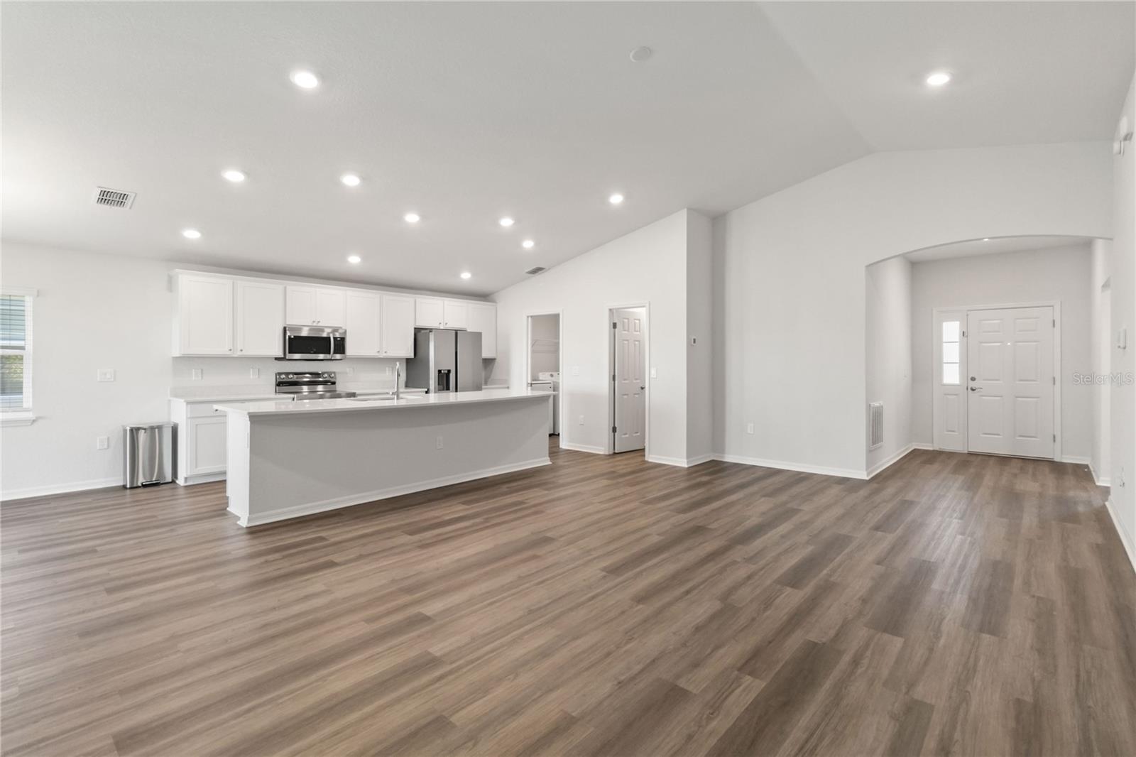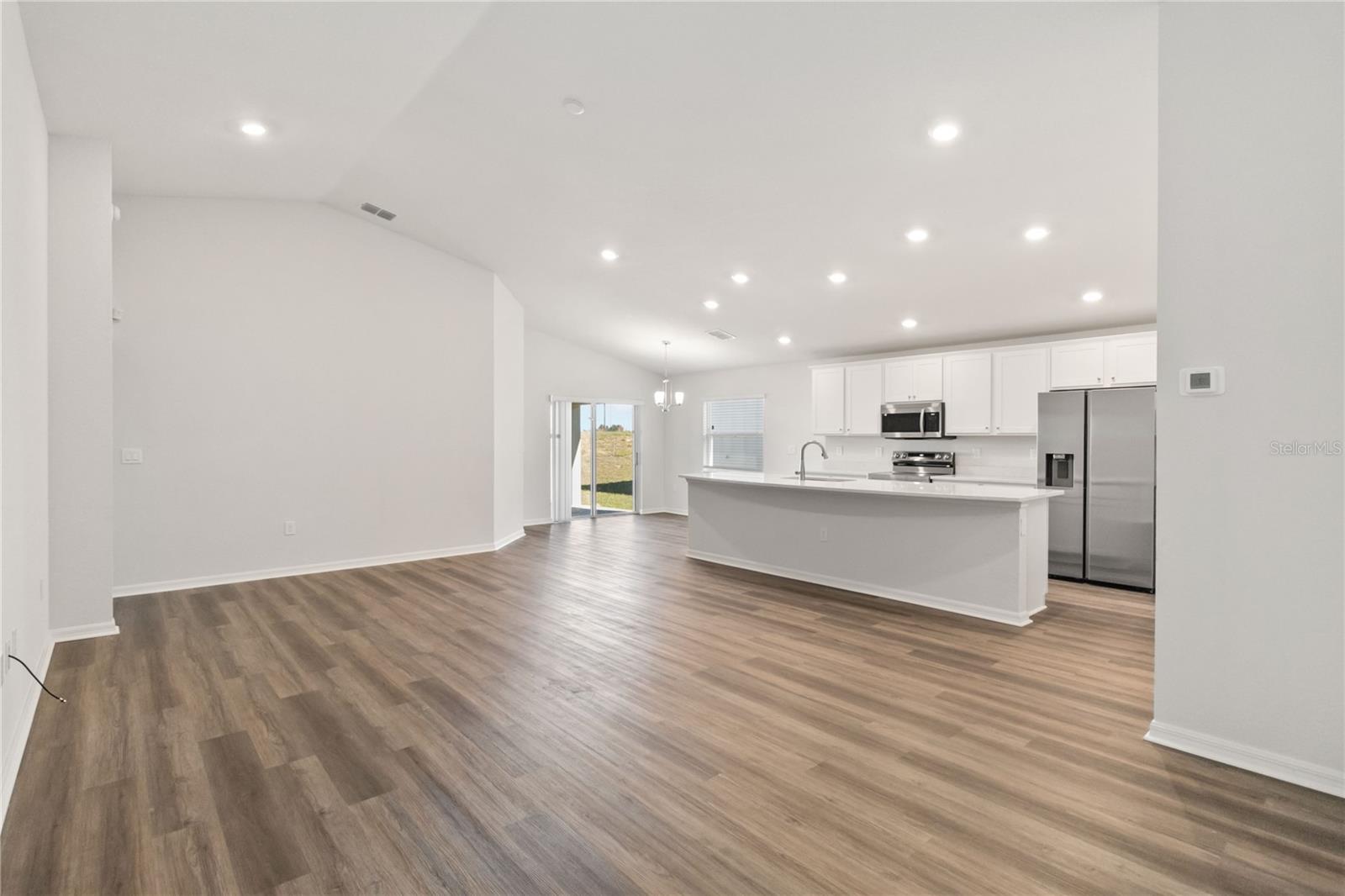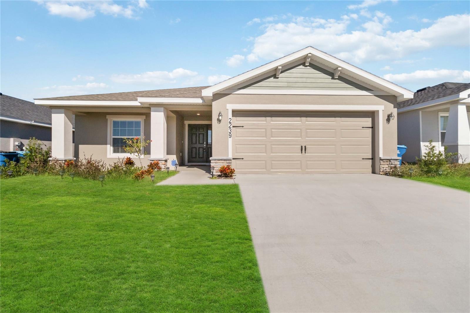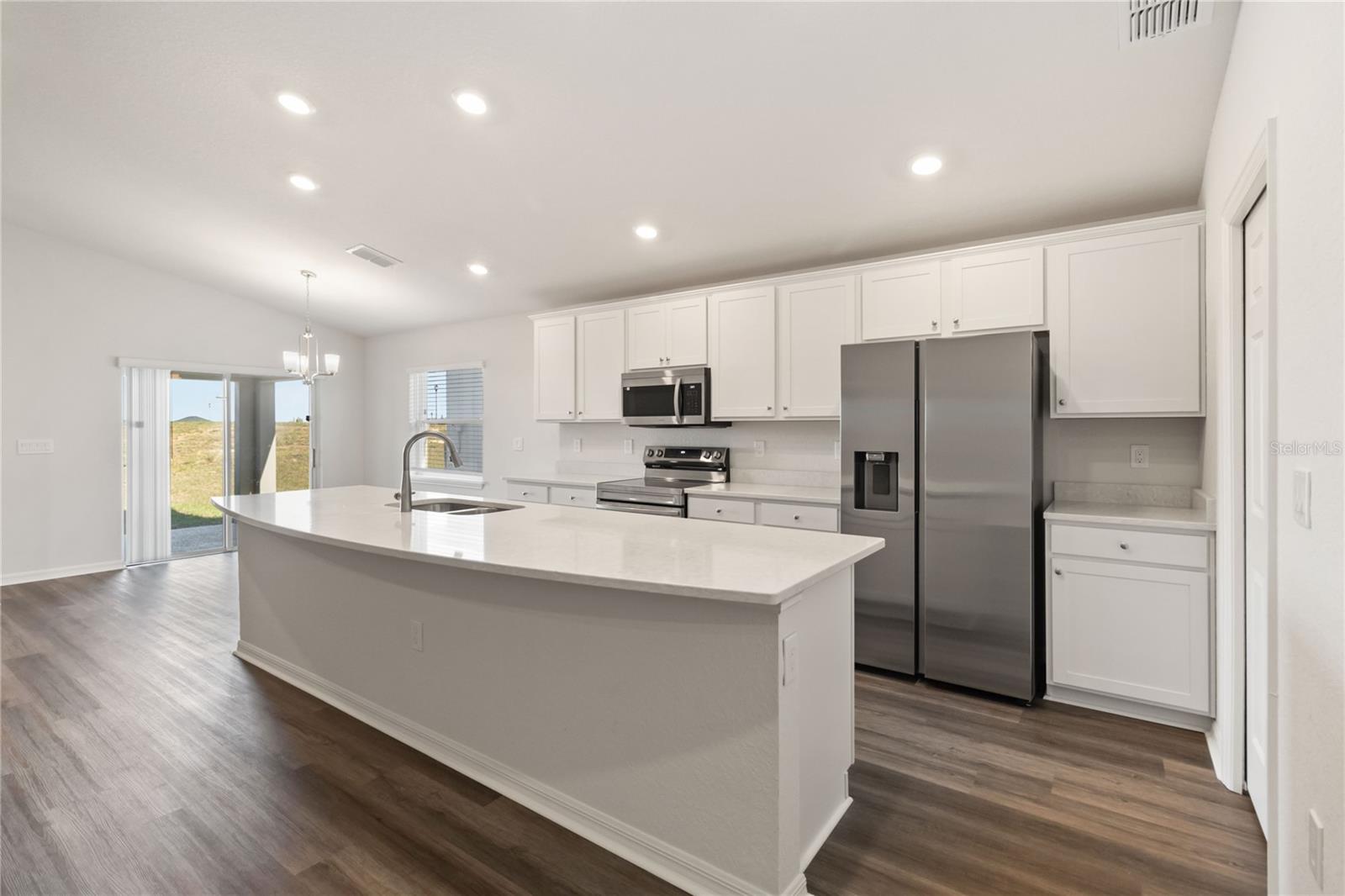 Introducing a beautiful new construction home offering 1,819 square feet of thoughtfully designed living space all on one level. This home features 4 spacious bedrooms, 2 bathrooms, and an open-concept living area, perfect for modern living. The chef-inspired kitchen boasts stunning Cambria countertops, Samsung stainless steel appliances, a walk-in pantry, and a large island, all seamlessly connected to the dining café and gathering room. Throughout the home, you'll find luxury wood vinyl plank flooring in the living areas, laundry room, and bathrooms, with stain-resistant carpet in the bedrooms for added comfort. The owner's suite is a true retreat, complete with a walk-in wardrobe and a private en-suite bath featuring dual vanities, a tiled shower, and a closeted toilet for added privacy. Enjoy outdoor living with a covered lanai, a 2-car garage, custom-fit window blinds, and durable architectural shingles. Energy-efficient insulation and windows ensure comfort year-round, while a full builder warranty provides peace of mind.