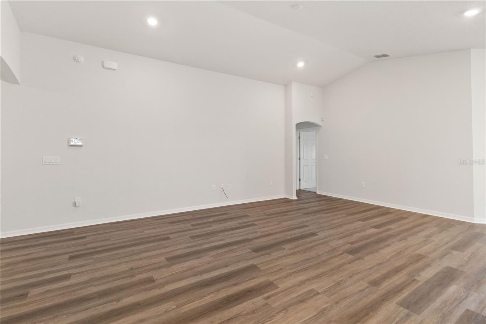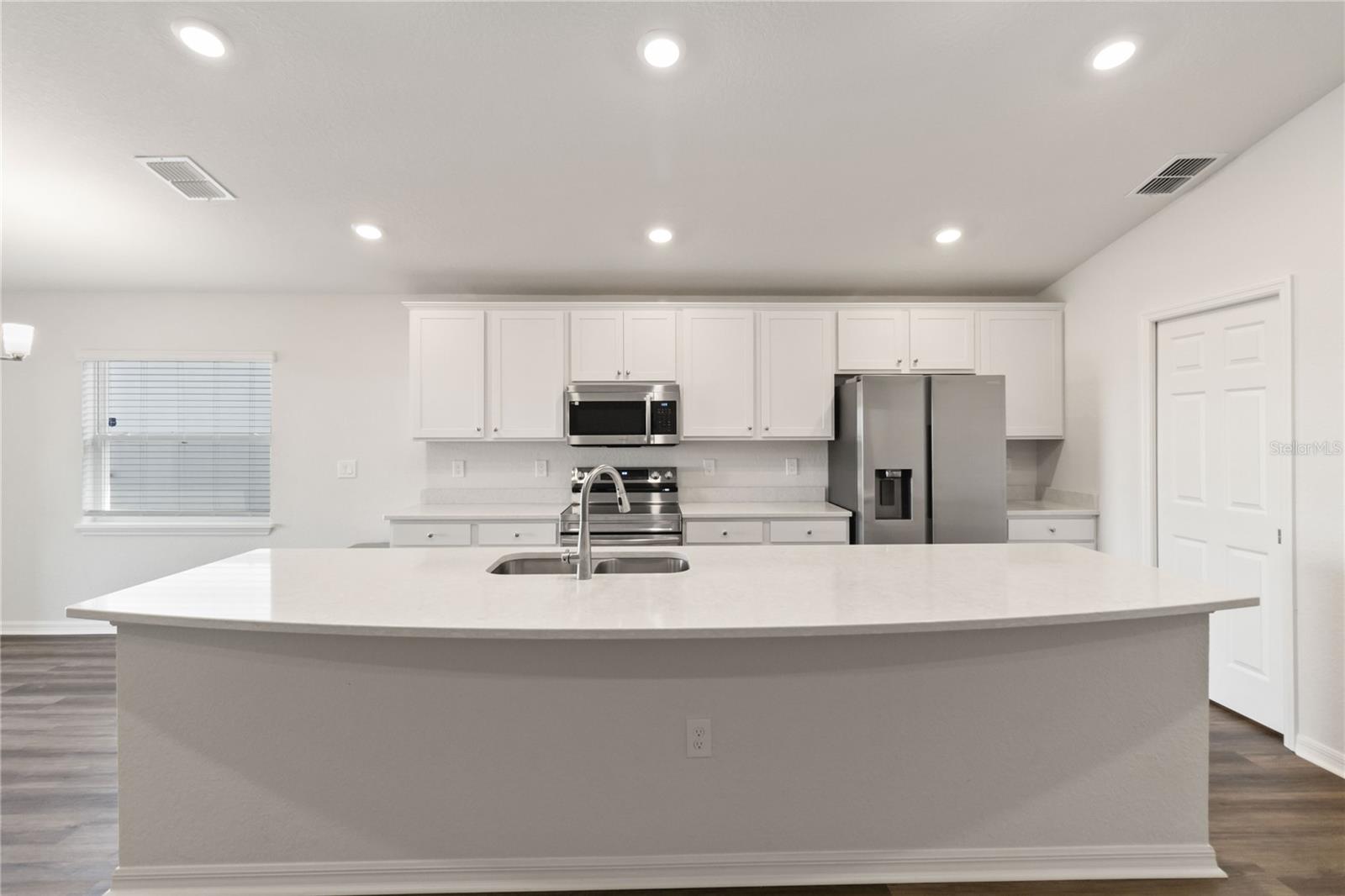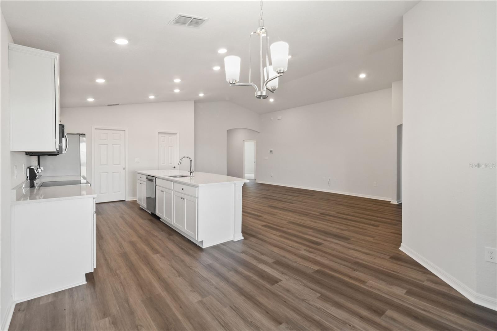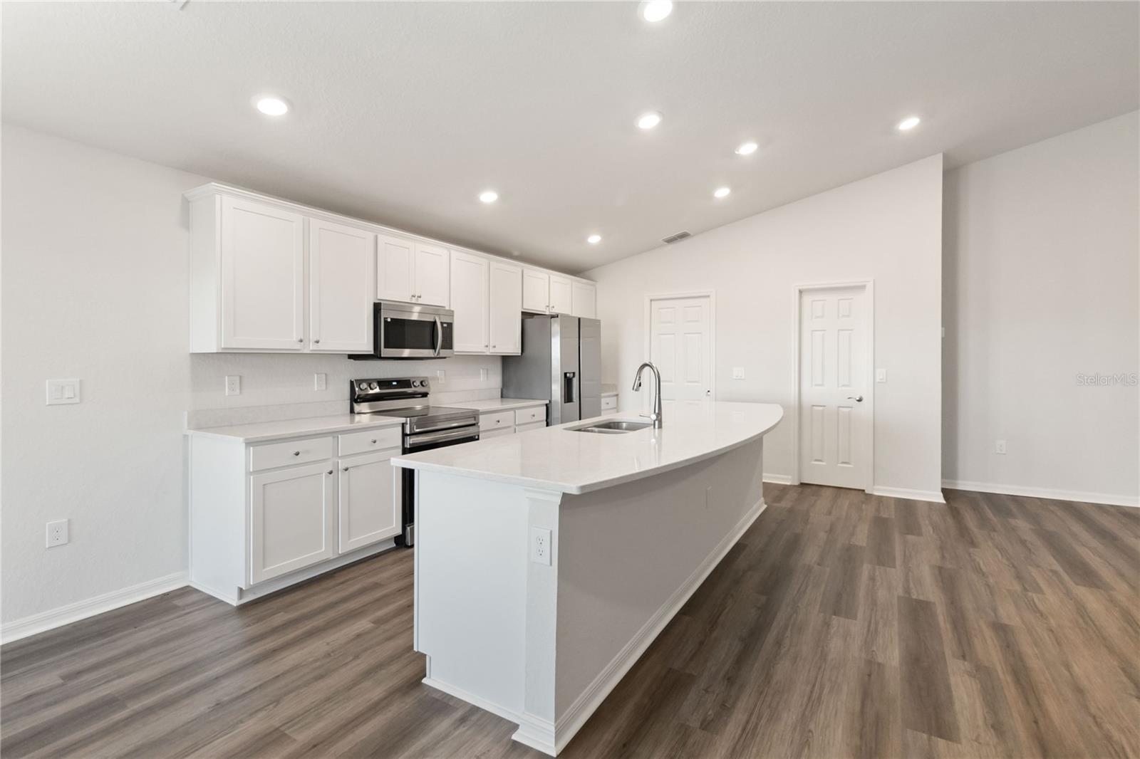 Introducing a beautiful new construction home offering 1,819 square feet of thoughtfully designed living space all on one level. This home features 4 spacious bedrooms, 2 bathrooms, and an open-concept living area, perfect for modern living. The chef-inspired kitchen boasts stunning Cambria countertops, Samsung stainless steel appliances, a walk-in pantry, and a large island, all seamlessly connected to the dining café and gathering room. Throughout the home, you'll find luxury wood vinyl plank flooring in the living areas, laundry room, and bathrooms, with stain-resistant carpet in the bedrooms for added comfort. The owner's suite is a true retreat, complete with a walk-in wardrobe and a private en-suite bath featuring dual vanities, a tiled shower, and a closeted toilet for added privacy. Enjoy outdoor living with a covered lanai, a 2-car garage, custom-fit window blinds, and durable architectural shingles. Energy-efficient insulation and windows ensure comfort year-round, while a full builder warranty provides peace of mind.