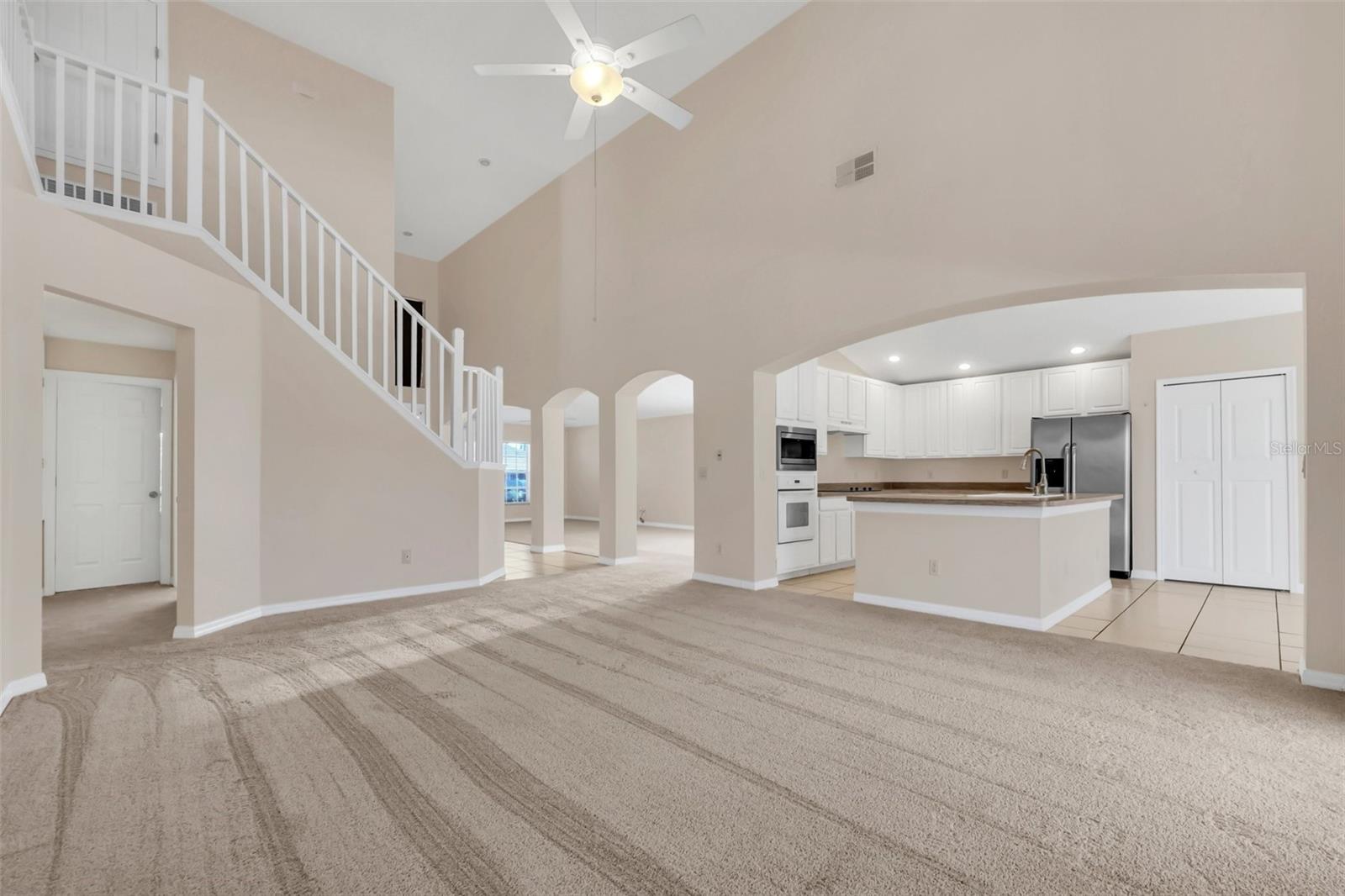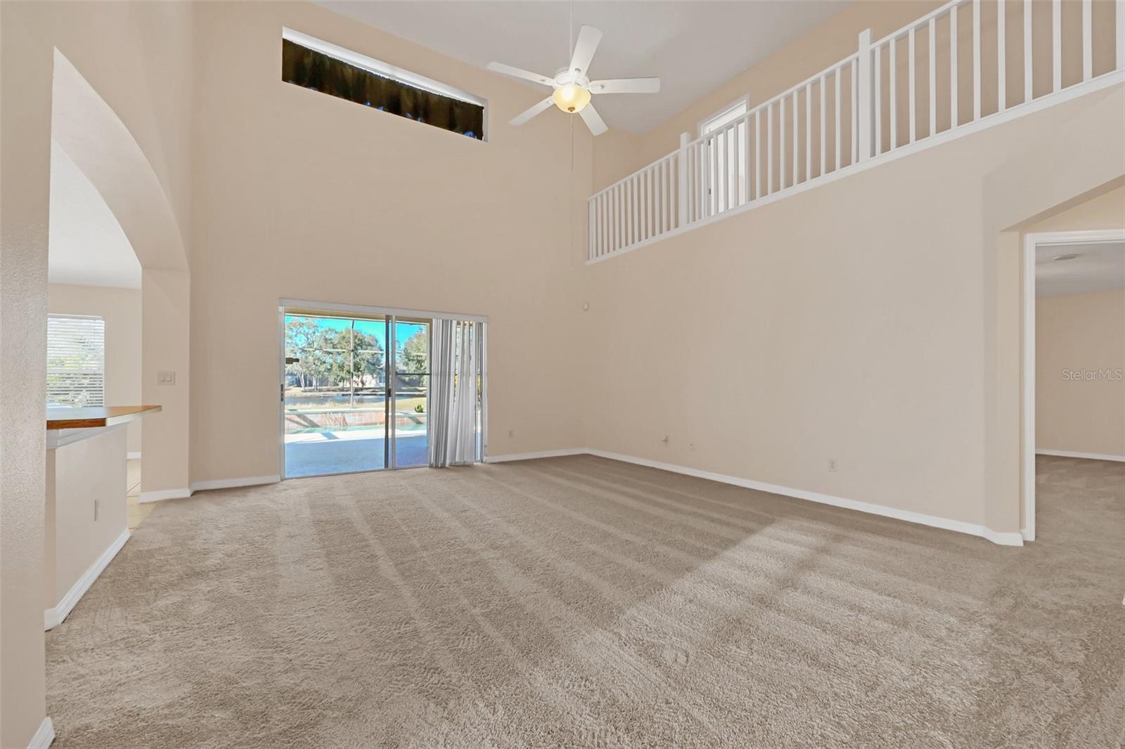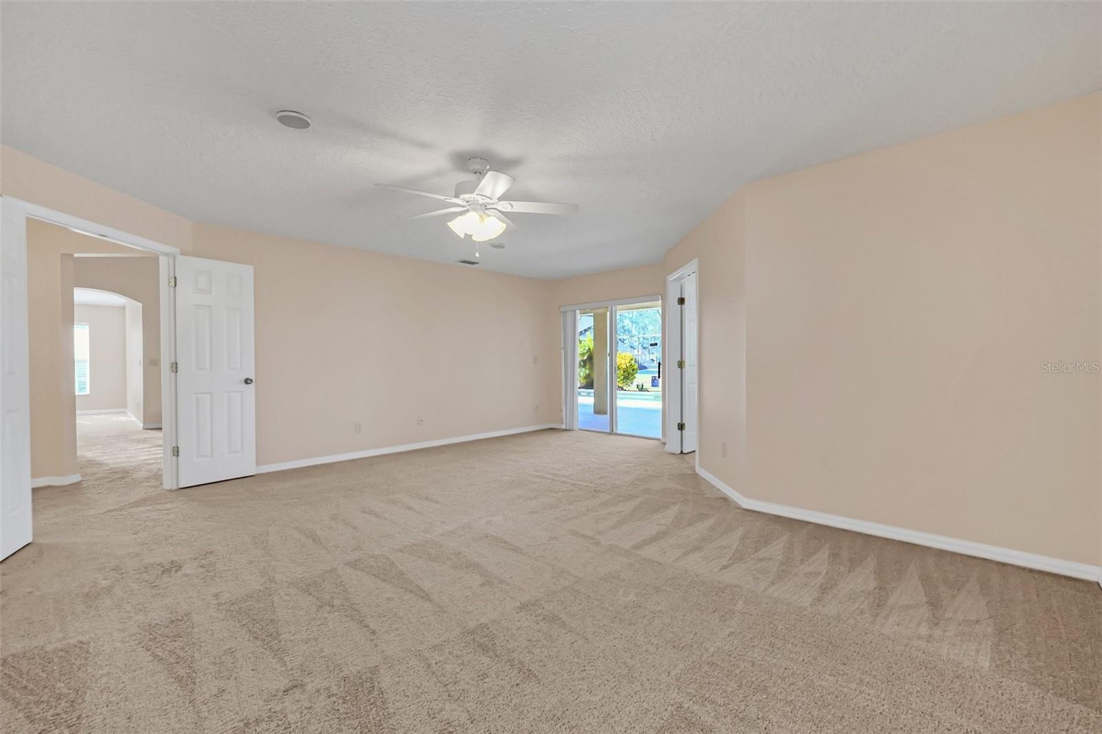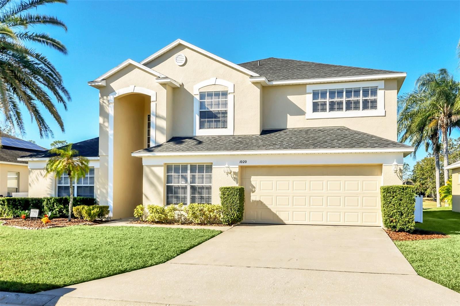 This large house is one of only a handful of 5 bedroom 3 1/2 bathroom homes located in the gated Forest of Ridgewood Lake of Dell Webb. Two story with an oversized Master Bedroom/Bath with pool access on first floor, large family room overlooking the protected lanai and golf course tee and lake. Large living room, dining room area, family room, eat in kitchen, home or den and 2 car garage. New paint inside and out, new carpeting up and down, two year old roof, and a separate laundry room with washer and dryer. Great house for large family, lots of guests or in laws and just 20 miles from Disney and minutes Posner Shopping just off highway 27. What a find, motivated seller, move in ready, needs nothing but you. Best view on the street All ages welcome!