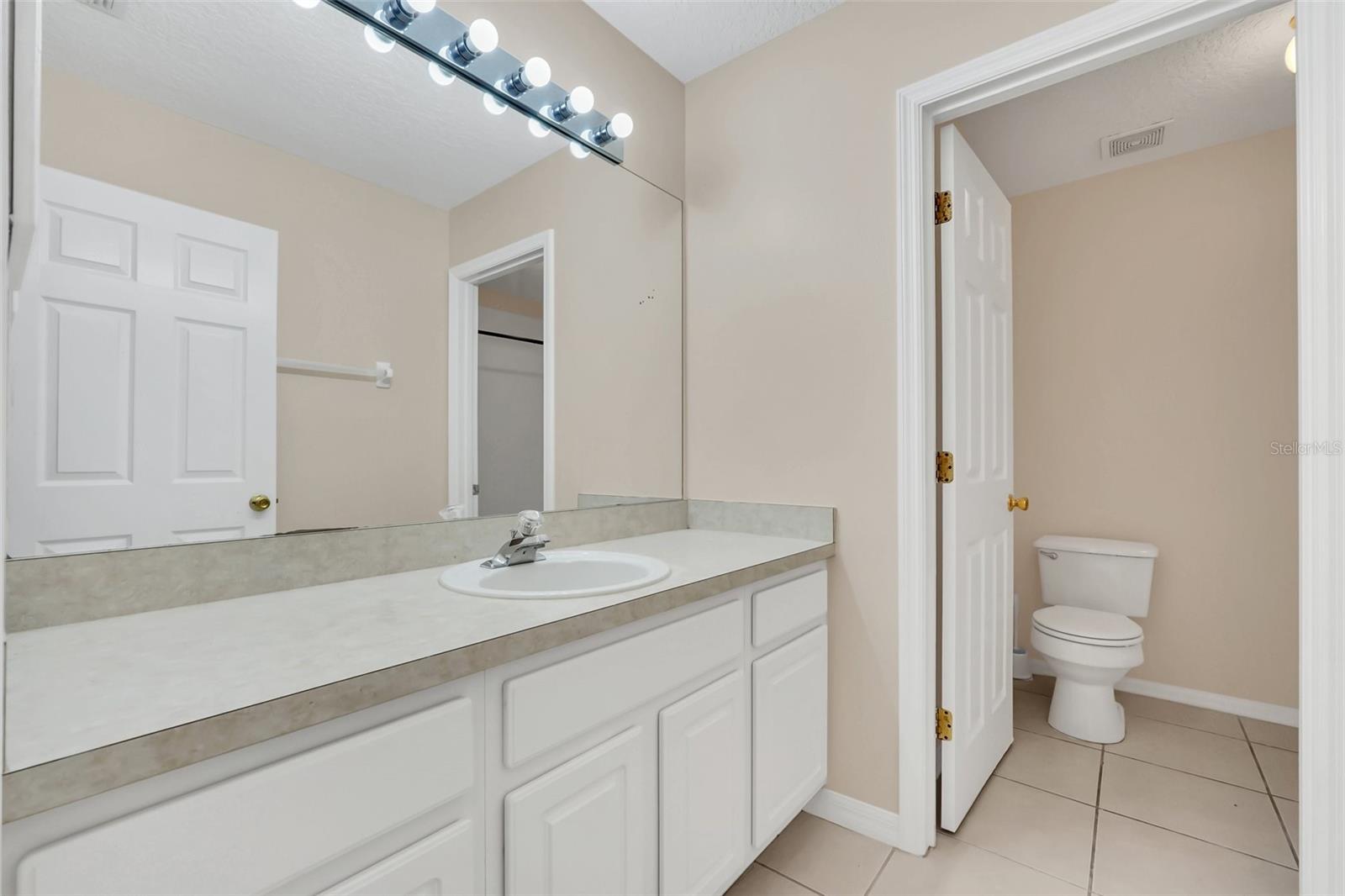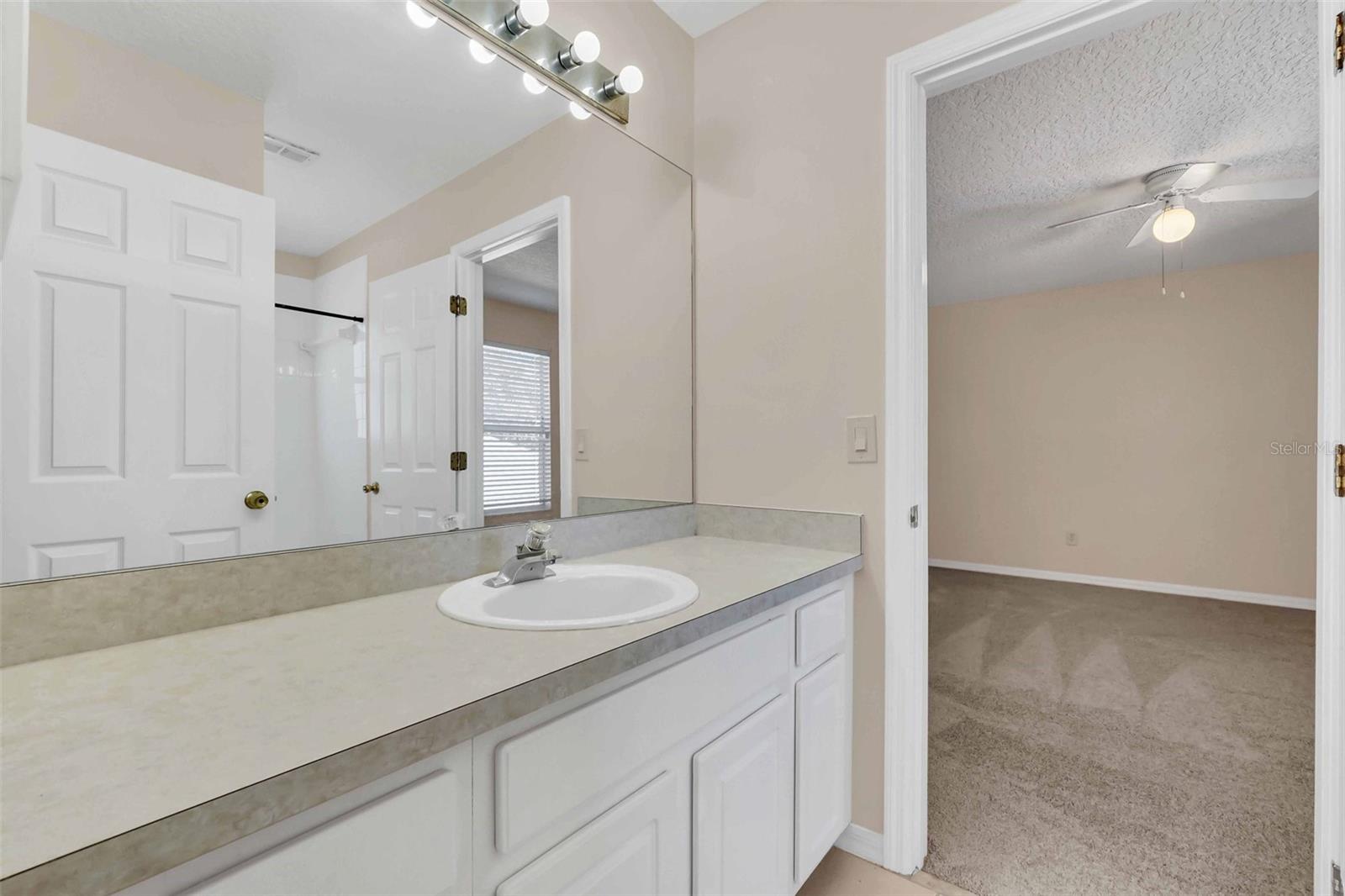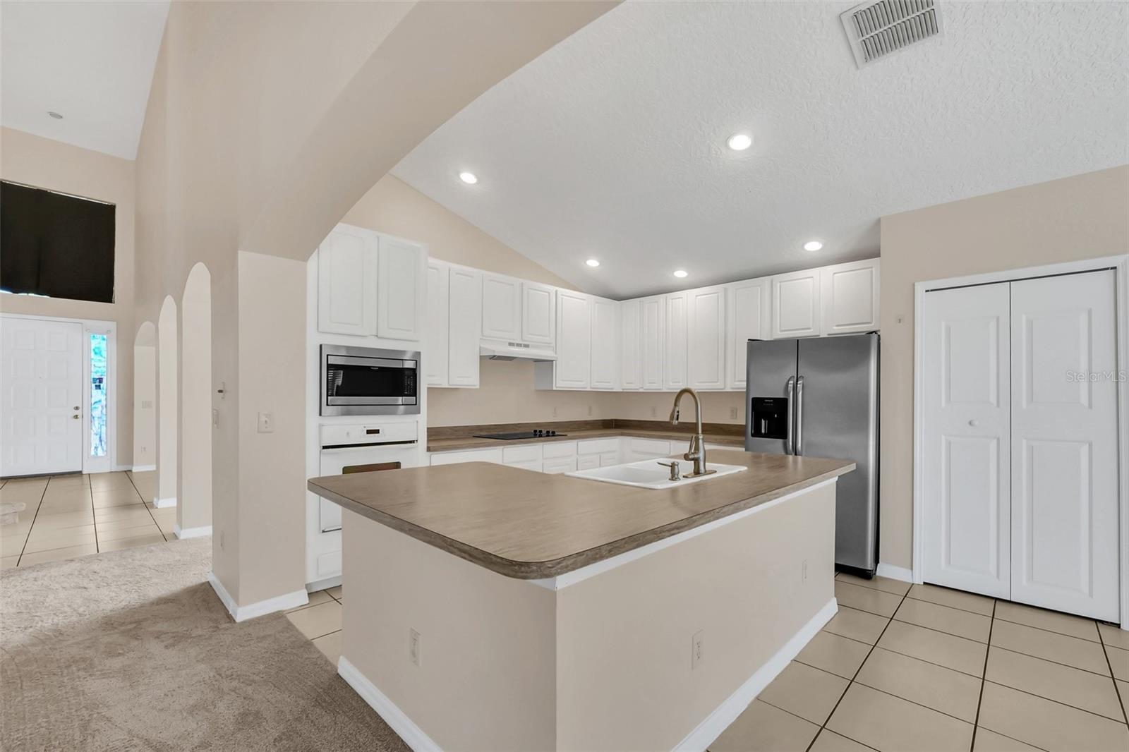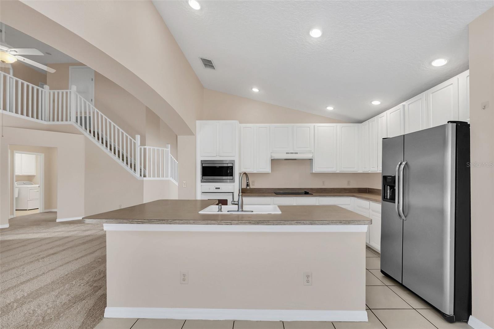 This large house is one of only a handful of 5 bedroom 3 1/2 bathroom homes located in the gated Forest of Ridgewood Lake of Dell Webb. Two story with an oversized Master Bedroom/Bath with pool access on first floor, large family room overlooking the protected lanai and golf course tee and lake. Large living room, dining room area, family room, eat in kitchen, home or den and 2 car garage. New paint inside and out, new carpeting up and down, two year old roof, and a separate laundry room with washer and dryer. Great house for large family, lots of guests or in laws and just 20 miles from Disney and minutes Posner Shopping just off highway 27. What a find, motivated seller, move in ready, needs nothing but you. Best view on the street All ages welcome!