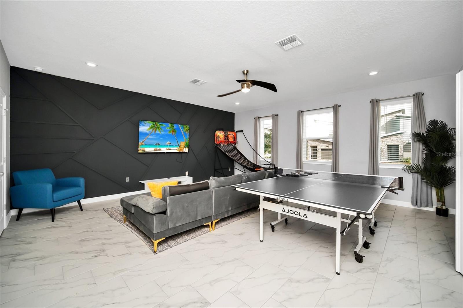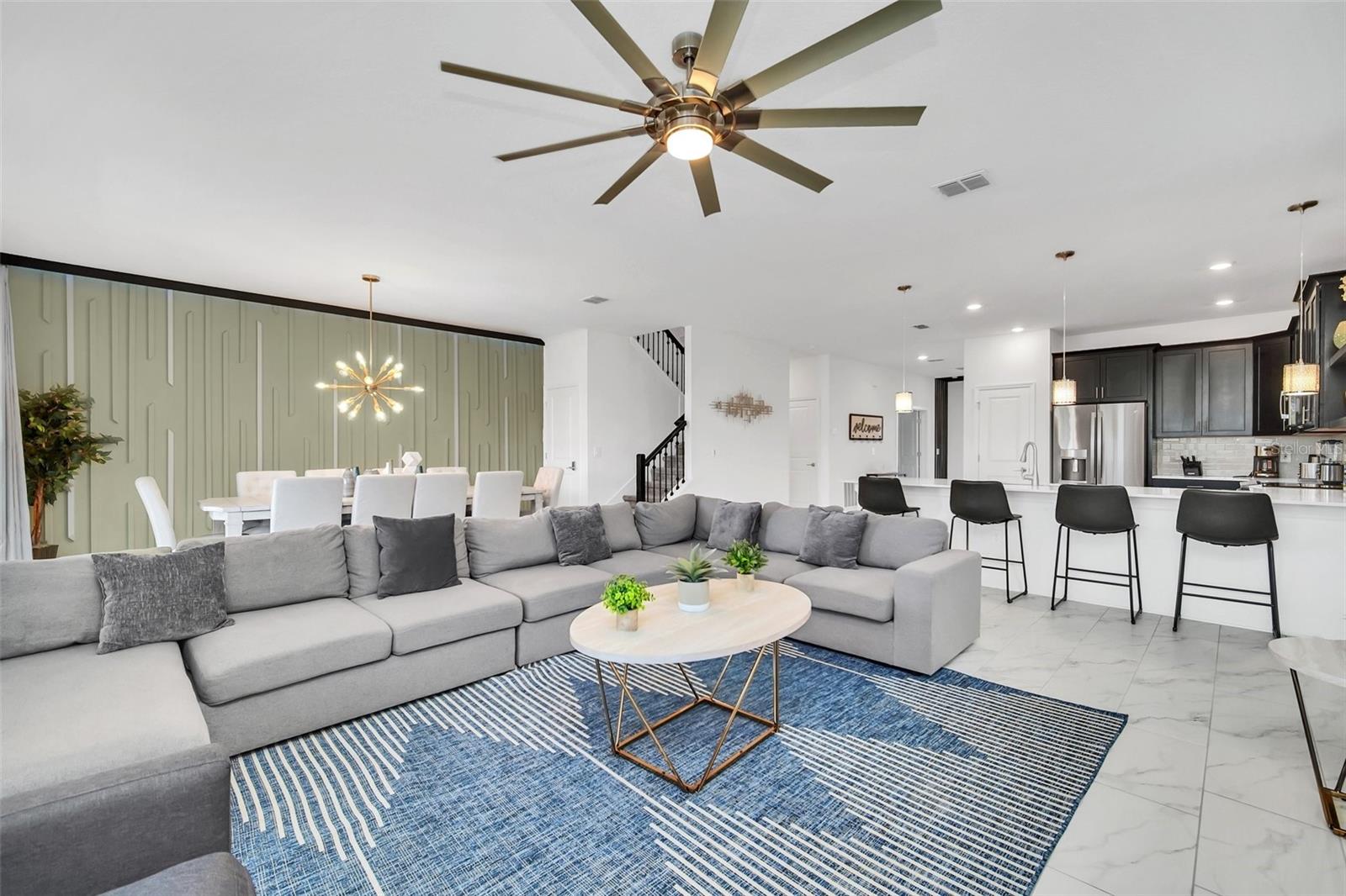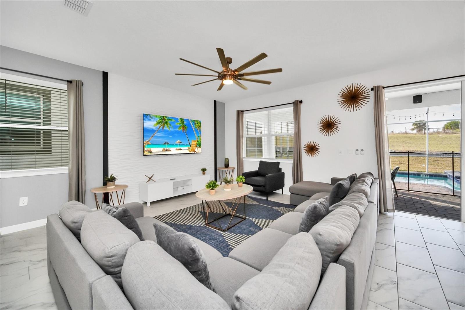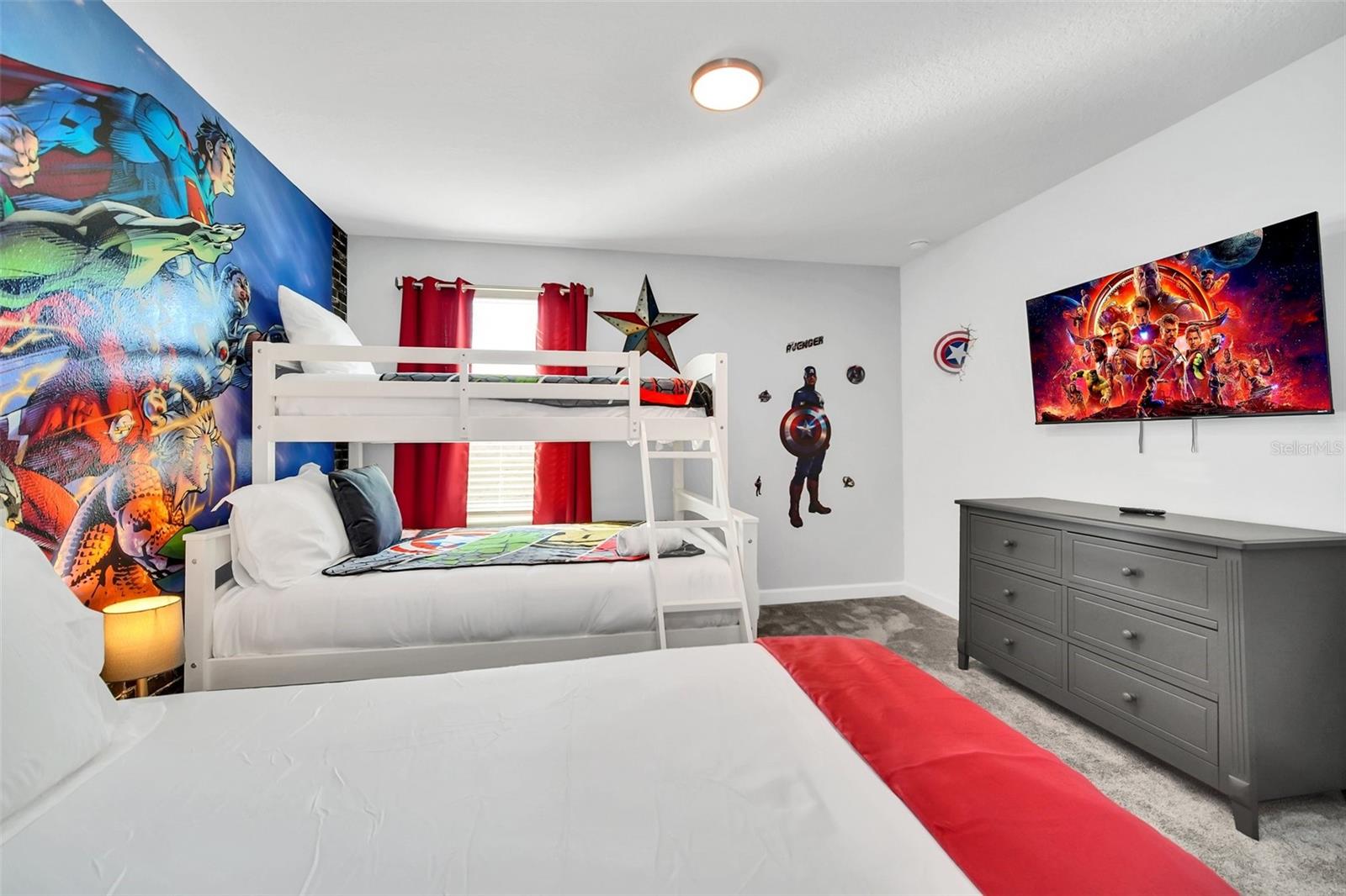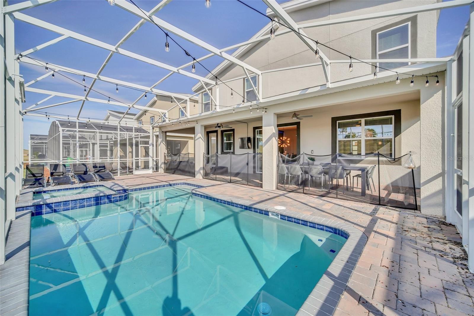 Stunning home with over $100,000 of furnishings. Welcome to your dream vacation home! This extraordinary opportunity presents itself in the form of a luxurious 9-bedroom property, fully furnished and ready for you to move in. Situated in the highly sought-after gated resort community of Champions Gate, this turnkey home offers not only a perfect getaway for you but also a fantastic investment opportunity to generate income. As you step through the front door, leave your worries behind and immerse yourself in the ultimate vacation experience. Unwind in the heated pool and spa, enjoying privacy without any neighbors at the rear. Take pleasure in savoring your favorite drink while preparing delicious meals for your loved ones on the BBQ or in the stunning kitchen, complete with quartz countertops, 42" cabinets and stainless steel appliances. The open concept design allows for effortless entertaining while you cook, catch up on your favorite TV shows, or simply relax after a long day. Whether you're gathering around the breakfast bar or the spacious dining table, there's plenty of seating for all your guests. For additional entertainment, indulge in the media room, where you can engage in lively games of foosball, ping pong, or basketball. Alternatively, unwind in the loft area on the second floor, watching your favorite movies. After an eventful day, retire to one of the nine beautifully appointed bedrooms. Conveniently located on the first floor, both the primary suite and an additional guest suite offer easy access (with one providing direct access to the private pool). The little ones will be enchanted by the themed rooms available, with options like Mickey Mouse, Avengers, or a Princess room to choose from. The Champions Gate community boasts an array of outstanding amenities, including The Oasis Club—a magnificent 16,000 sq ft Clubhouse featuring a full-service restaurant and bar, a movie theater, an arcade/game room, a business center, a yoga room, and Camp Oasis for the younger ones. Stay active at the full fitness center, take a dip in one of the two community pools or the thrilling water park, float along the lazy river, or relax at the tiki bar. Outdoor enthusiasts can enjoy the sand volleyball courts, basketball courts, dog park, and air-conditioned cabanas. Tennis enthusiasts can take advantage of the tennis courts, and golfers can tee off at the 18-hole championship golf courses. An additional clubhouse, pool, and water park offer even more opportunities for recreation. Security and peace of mind are paramount at Champions Gate, with 24-hour surveillance and included security provided by the gated community. HOA fees cover essential services such as basic cable TV, internet, yard maintenance, and trash pickup. Don't miss out on this extraordinary opportunity to own your ideal vacation home. Simply unpack, relax, and enjoy the unparalleled luxury and convenience of Champions Gate.