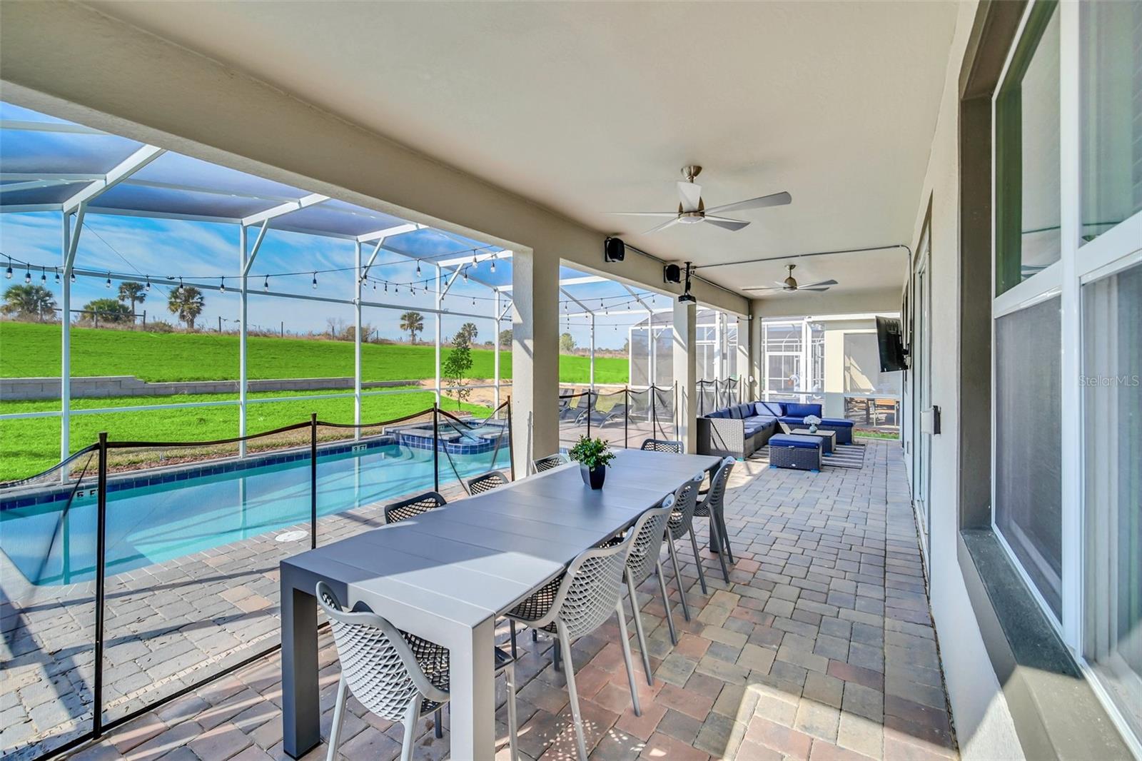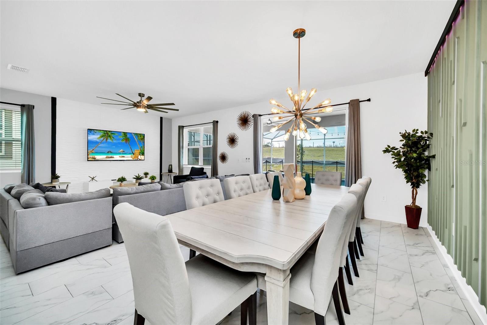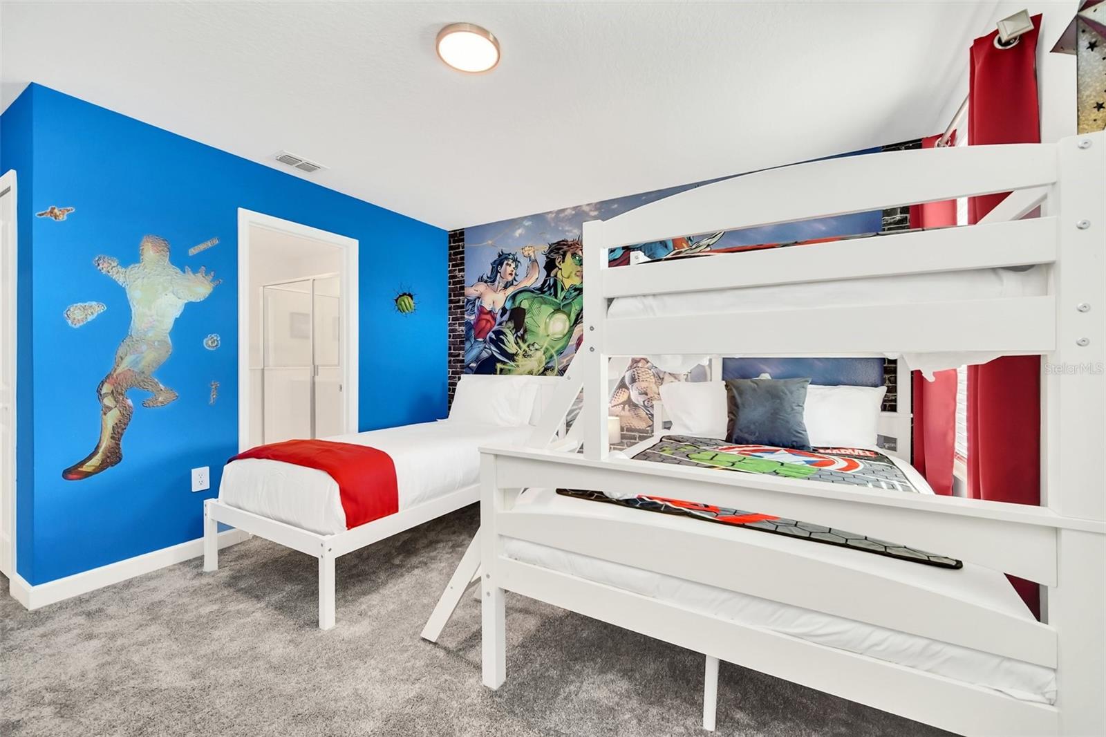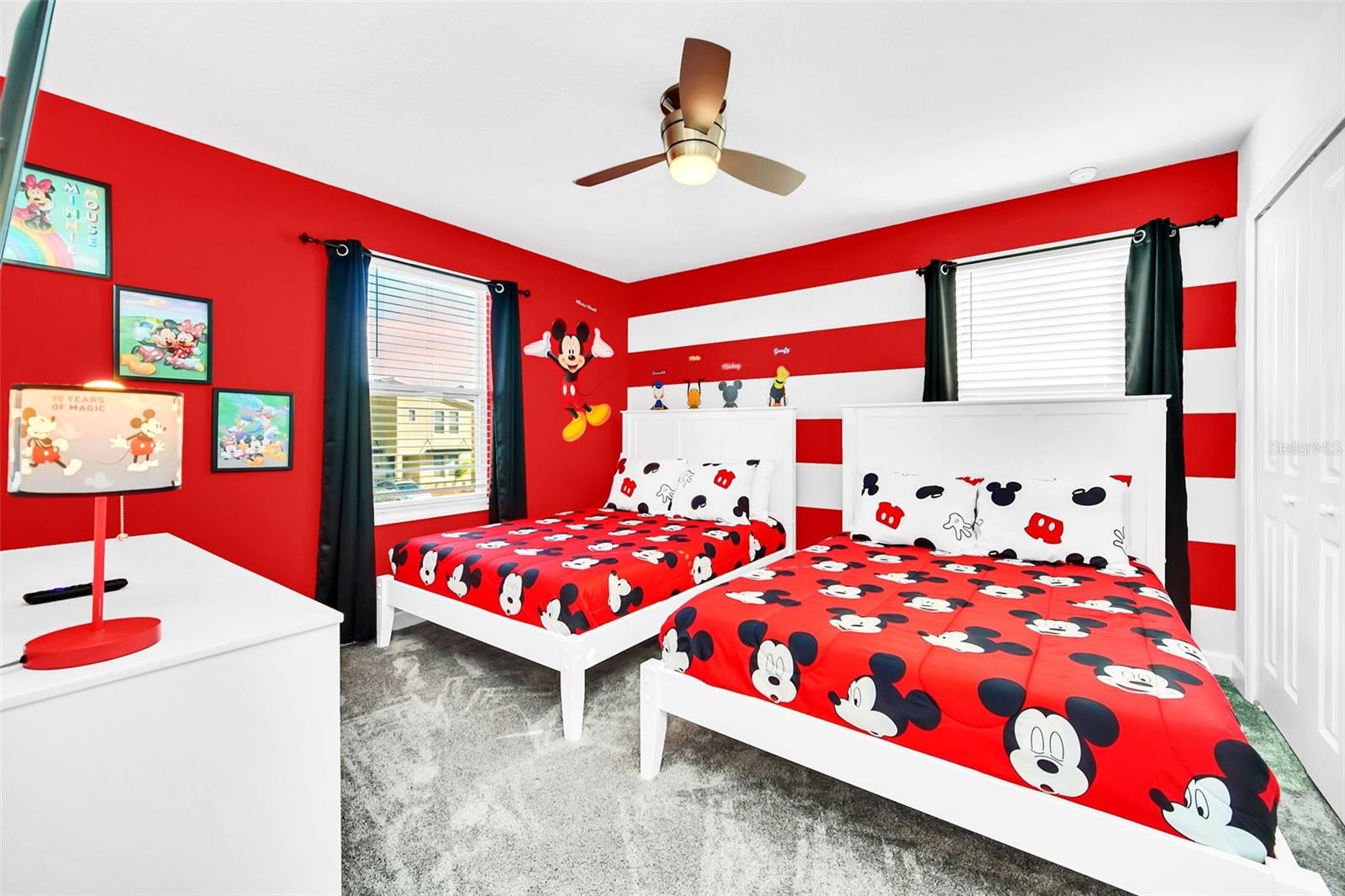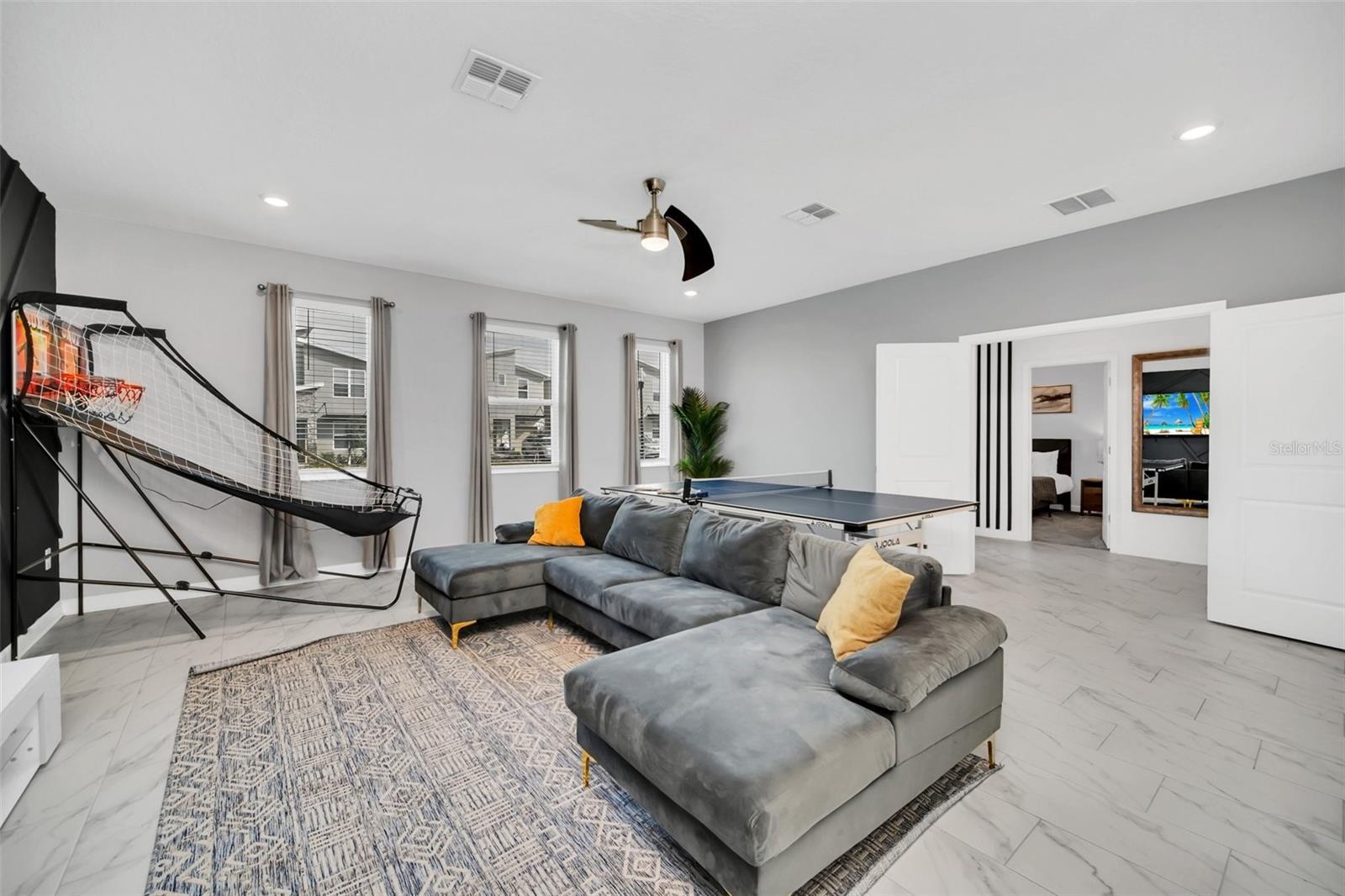 Stunning home with over $100,000 of furnishings. Welcome to your dream vacation home! This extraordinary opportunity presents itself in the form of a luxurious 9-bedroom property, fully furnished and ready for you to move in. Situated in the highly sought-after gated resort community of Champions Gate, this turnkey home offers not only a perfect getaway for you but also a fantastic investment opportunity to generate income. As you step through the front door, leave your worries behind and immerse yourself in the ultimate vacation experience. Unwind in the heated pool and spa, enjoying privacy without any neighbors at the rear. Take pleasure in savoring your favorite drink while preparing delicious meals for your loved ones on the BBQ or in the stunning kitchen, complete with quartz countertops, 42" cabinets and stainless steel appliances. The open concept design allows for effortless entertaining while you cook, catch up on your favorite TV shows, or simply relax after a long day. Whether you're gathering around the breakfast bar or the spacious dining table, there's plenty of seating for all your guests. For additional entertainment, indulge in the media room, where you can engage in lively games of foosball, ping pong, or basketball. Alternatively, unwind in the loft area on the second floor, watching your favorite movies. After an eventful day, retire to one of the nine beautifully appointed bedrooms. Conveniently located on the first floor, both the primary suite and an additional guest suite offer easy access (with one providing direct access to the private pool). The little ones will be enchanted by the themed rooms available, with options like Mickey Mouse, Avengers, or a Princess room to choose from. The Champions Gate community boasts an array of outstanding amenities, including The Oasis Club—a magnificent 16,000 sq ft Clubhouse featuring a full-service restaurant and bar, a movie theater, an arcade/game room, a business center, a yoga room, and Camp Oasis for the younger ones. Stay active at the full fitness center, take a dip in one of the two community pools or the thrilling water park, float along the lazy river, or relax at the tiki bar. Outdoor enthusiasts can enjoy the sand volleyball courts, basketball courts, dog park, and air-conditioned cabanas. Tennis enthusiasts can take advantage of the tennis courts, and golfers can tee off at the 18-hole championship golf courses. An additional clubhouse, pool, and water park offer even more opportunities for recreation. Security and peace of mind are paramount at Champions Gate, with 24-hour surveillance and included security provided by the gated community. HOA fees cover essential services such as basic cable TV, internet, yard maintenance, and trash pickup. Don't miss out on this extraordinary opportunity to own your ideal vacation home. Simply unpack, relax, and enjoy the unparalleled luxury and convenience of Champions Gate.