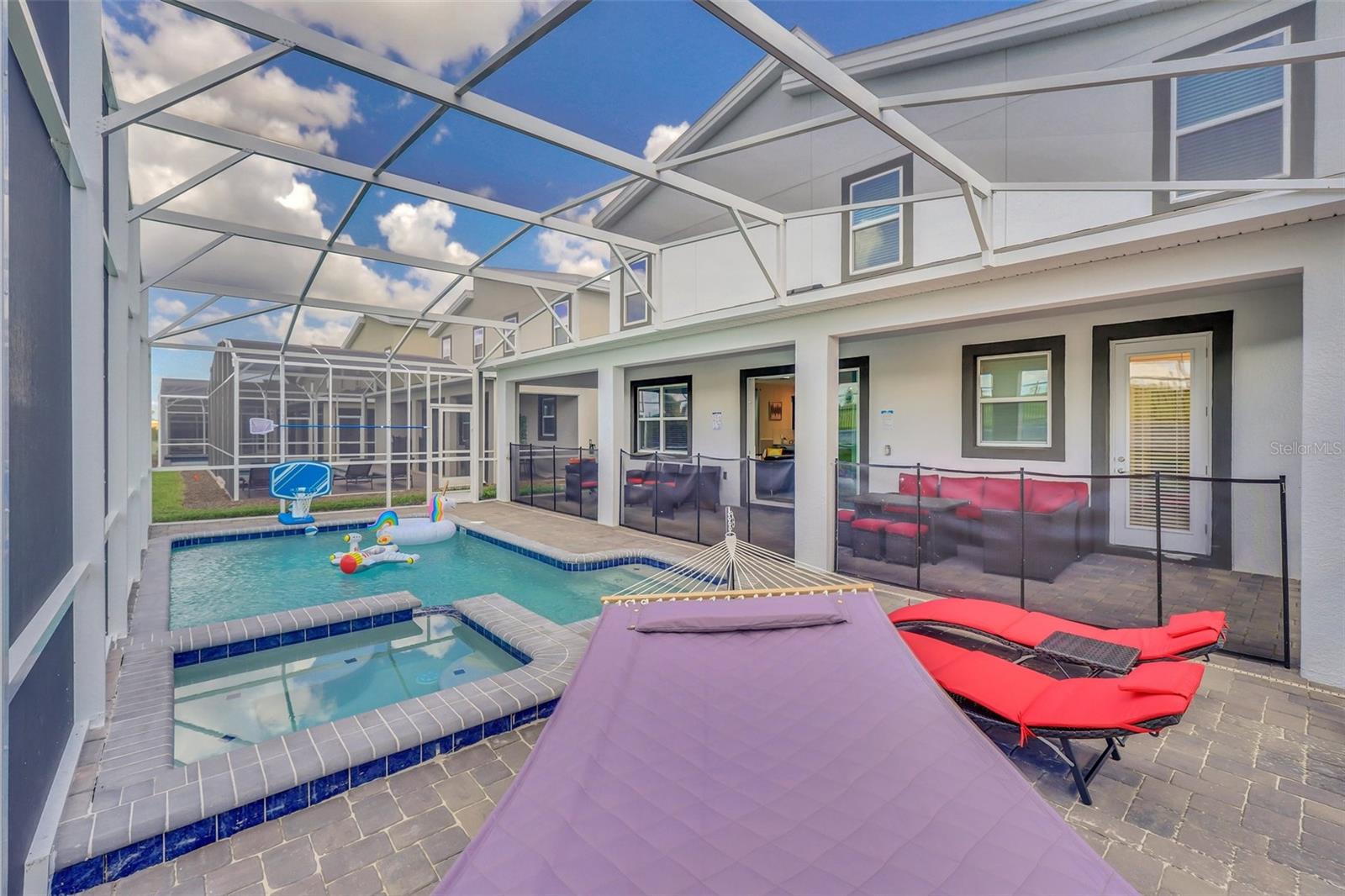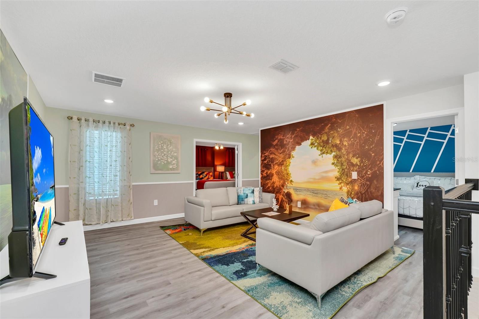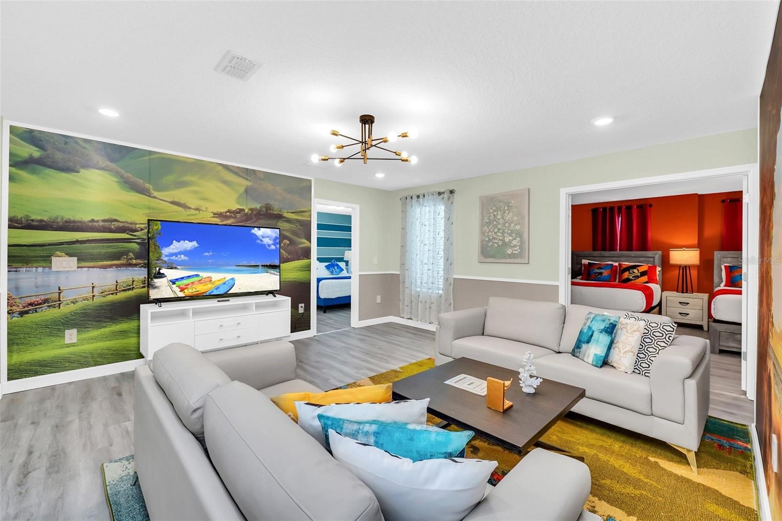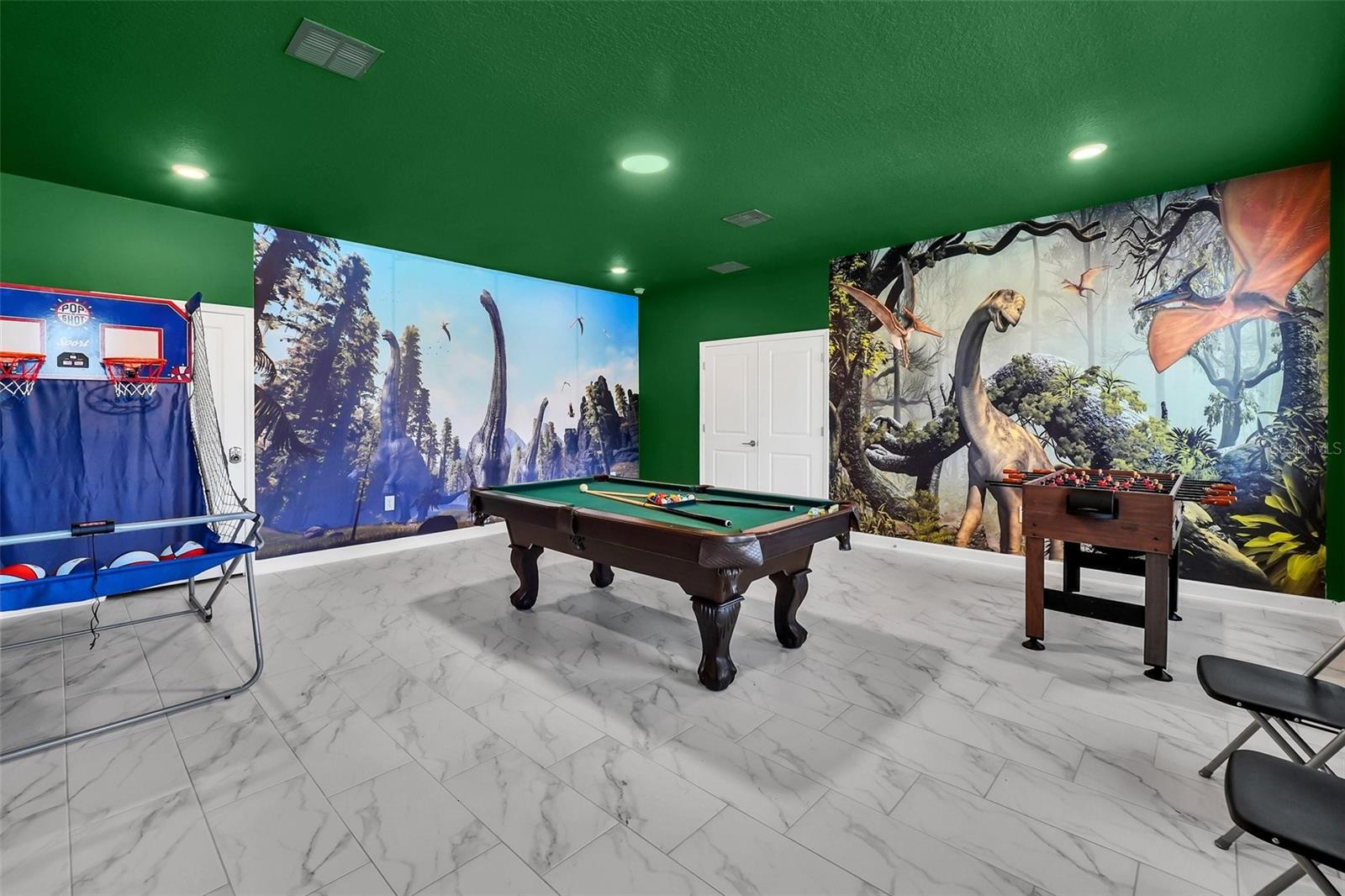 PROFESSIONAL Designed FULLY-FURNISHED SHORT-RETNAL HOUSE! LEASED ENERGY-SAVING SOLAR PANELS IN PLACE!VYNLE FLOORING IN ALL BEDROOMS AND LOFT!TURN KEY READY to start making money! Welcome to this luxurious 9-bedroom property Situated in the highly sought-after gated resort community of Champions Gate. Featuring a spacious open floor plan, this professionally decorated home boasts a stylish gourmet kitchen, complete with stainless steel appliances and an oversized island, seamlessly connects to the dining and living areas. The space naturally flows into a large screened in pool area, where you can enjoy the ultimate Florida lifestyle, ideal for relaxation and entertainment. With no rear neighbors, you’ll also enjoy added privacy. The main floor also features two beautifully decorated bedrooms, each with en-suite bathrooms, including the spacious primary suite for easy access to the pool. The game room at this home is an entertainment haven, designed to provide endless fun for guests of all ages. Whether you’re shooting hoops on the indoor basketball court, testing your skills with a game of foosball, or enjoying the nostalgia of classic arcade games, there’s something for everyone. The pool table offers the perfect setting for friendly competition, while the extra fridge ensures plenty of cold drinks and snacks are always within reach, making it ideal for longer gaming sessions. The living room and loft of this home are perfect for movie nights, sports games, or binge-watching your favorite shows, thanks to the stunning 75” TV in each space. The large screens provide a cinematic viewing experience, creating the ultimate entertainment zones for family and friends to gather. The second floor is designed with fun, themed bedrooms that bring excitement to every stay. From Disney and Star Wars to Avengers and Harry Potter, each room is professionally decorated to create a magical atmosphere that will captivate guests of all ages. This 9 bedroom has even more to offer: The solar panels on this vacation home are an outstanding feature that not only enhance sustainability but also provide significant cost savings. By harnessing the power of the sun, these leased and assumable solar panels help reduce electricity costs, saving up to $500/month during the summer and $300-$400/month during the winter. Vinyl flooring, ideal for high-traffic areas and easier to clean between guests, offers a sleek, modern aesthetic without the need for frequent deep cleaning, making it a practical choice for vacation homes. For additional enjoyment, residents and guests enjoy easy access to multiple resort-style clubhouses, fitness centers, pools, a lazy river, waterslide, tennis and volleyball courts, a tiki bar, and so much more. The strong rental potential and consistent popularity with vacationers offer great opportunities for consistent income and long-term investment appreciation. Whether you’re seeking a vacation retreat or an income-generating property, this property is a must-see. Schedule your showing today and make this dream home yours!